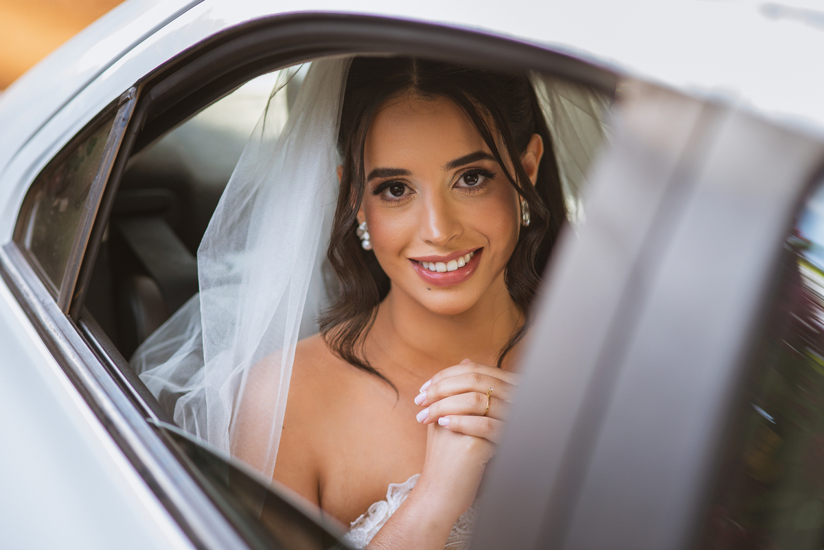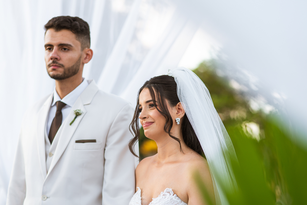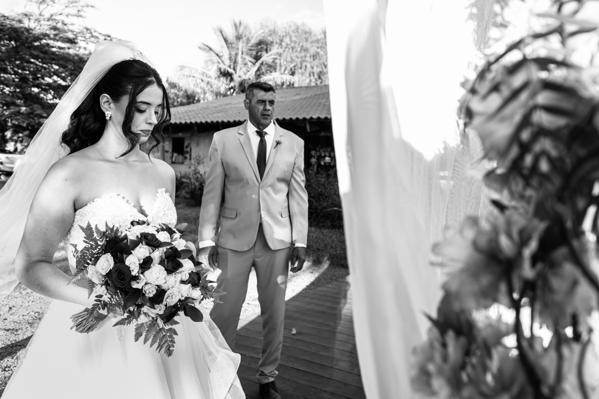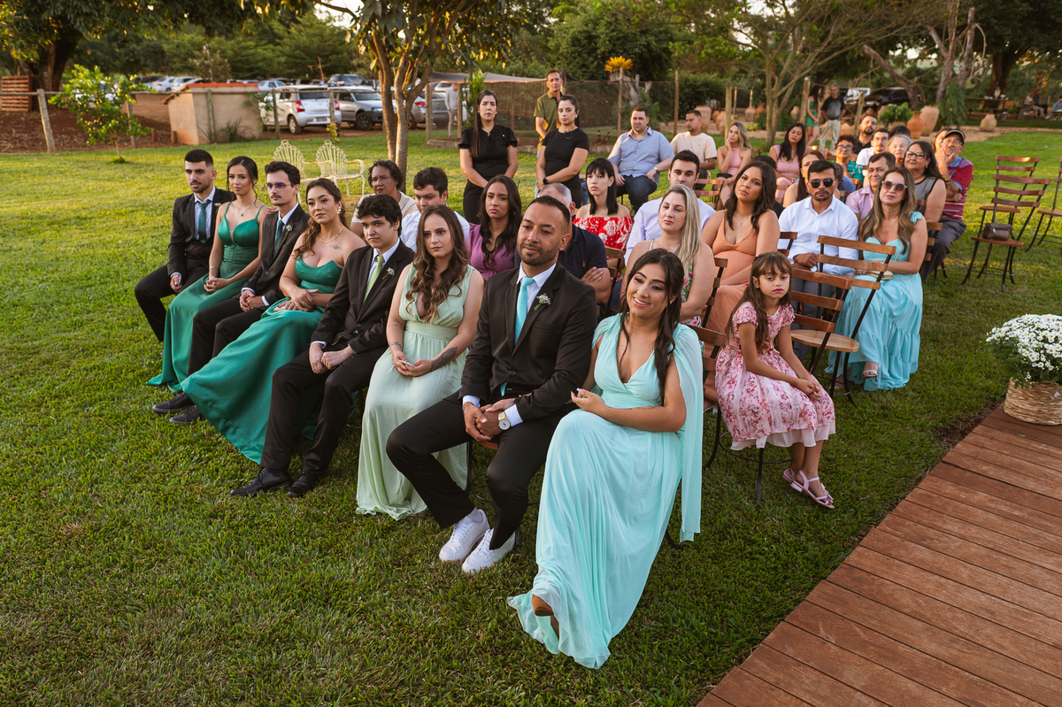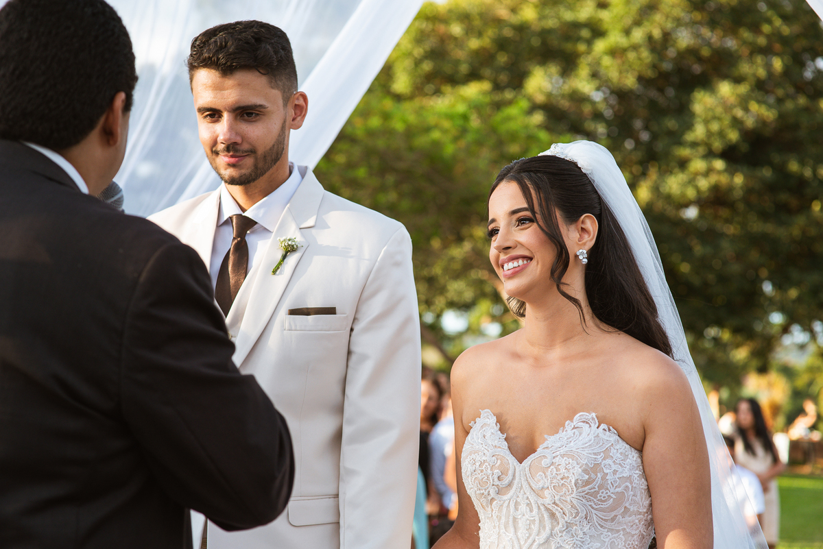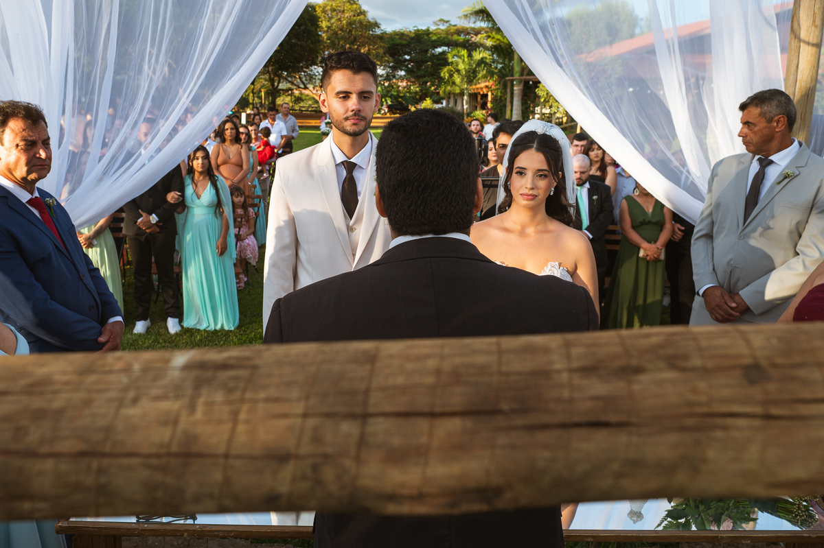 Os padrinhos todos já estavam alinhados e prontos para que a cerimônia começasse. Os músicos do Som do Coração já estavam entoando suas lindíssimas canções e embalavam o andamento da organização. O celebrante já se posicionou em frente ao altar e aguardou que tudo ficasse pronto para iniciar. Fizemos as fotografias da noiva no carro, com toda a calma do mundo. Ela estava lindíssima, com seu buquê nas mãos e o sorriso característico dela no rosto. Deixamos ela por lá e fomos para o altar aguardar o início. O cerimonial deu inicio à celebração. Os músicos começaram a tocar as músicas escolhidas pela noiva e os padrinhos começaram a entrar, casal por casal. Foi um verdadeiro desfile de beleza.