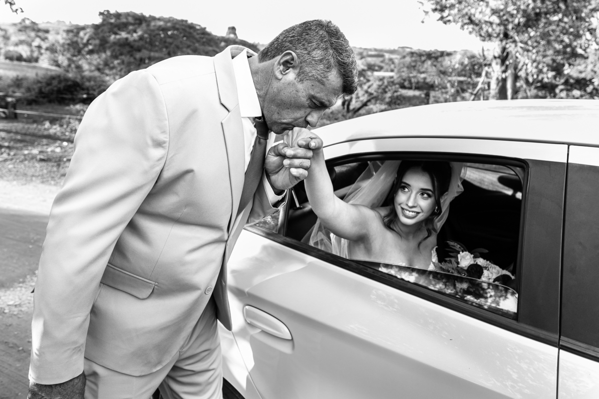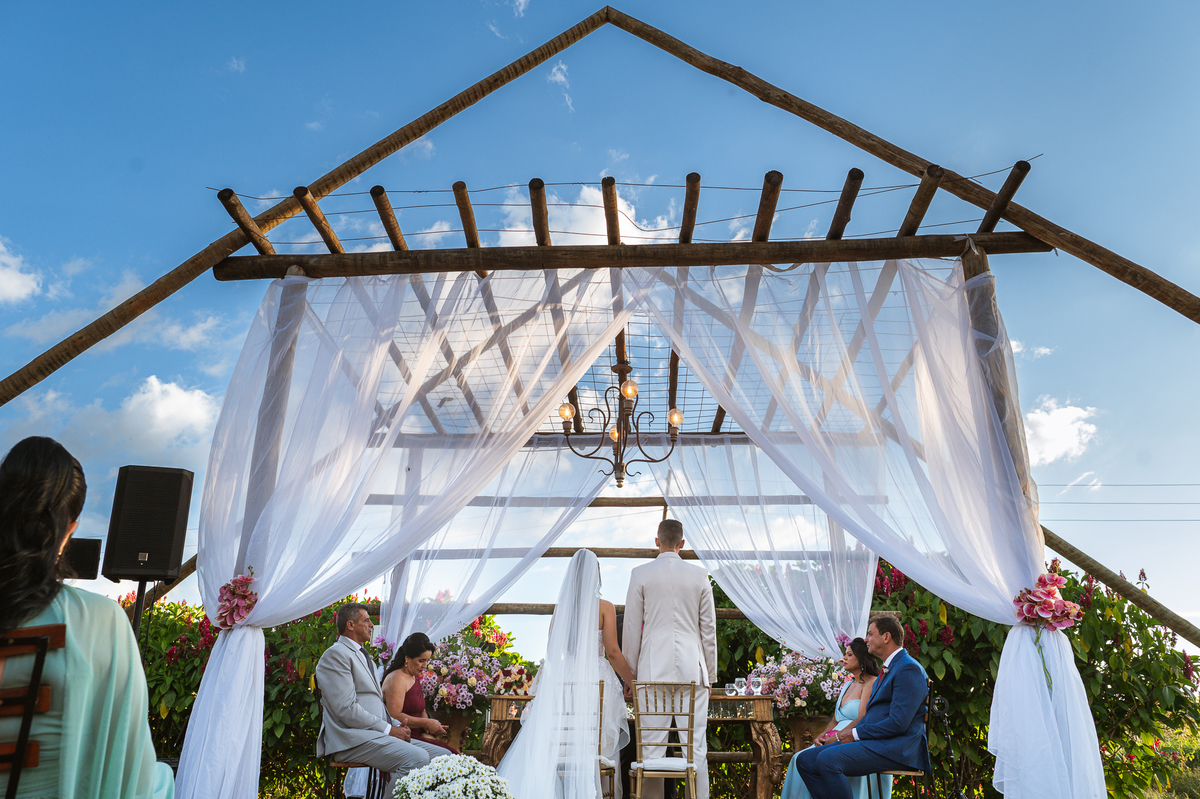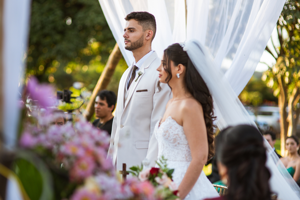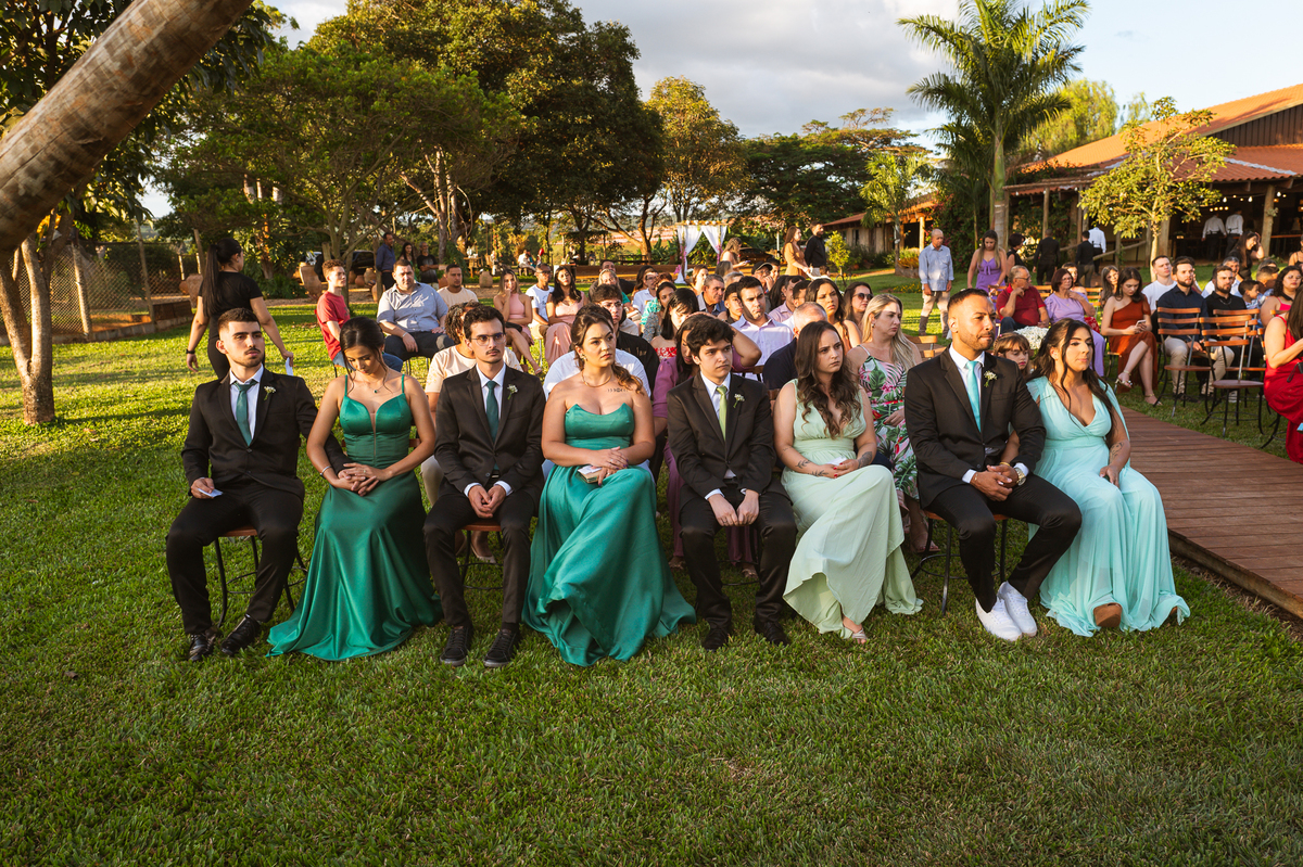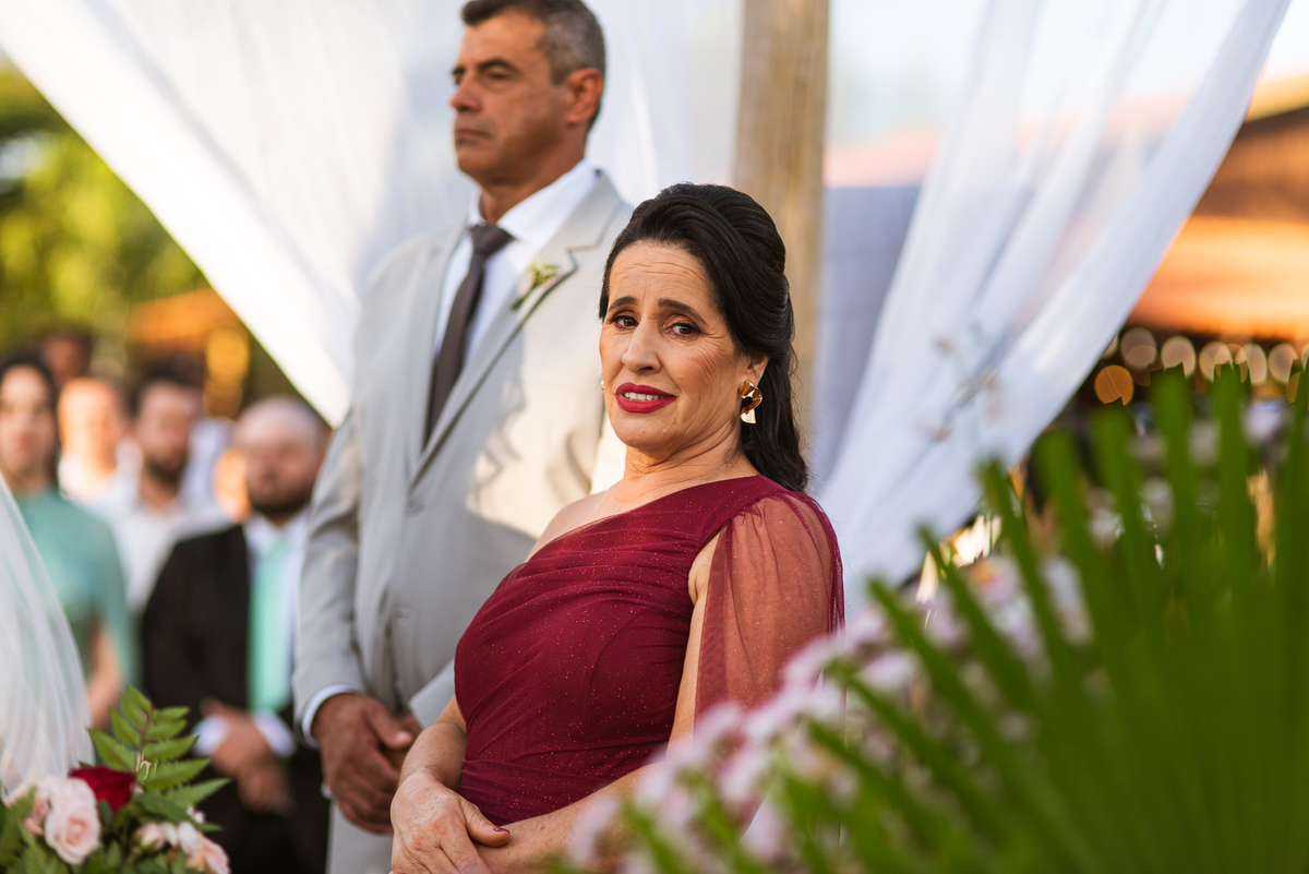 Os padrinhos todos já estavam alinhados e prontos para que a cerimônia começasse. Os músicos do Som do Coração já estavam entoando suas lindíssimas canções e embalavam o andamento da organização. O celebrante já se posicionou em frente ao altar e aguardou que tudo ficasse pronto para iniciar. Fizemos as fotografias da noiva no carro, com toda a calma do mundo. Ela estava lindíssima, com seu buquê nas mãos e o sorriso característico dela no rosto. Deixamos ela por lá e fomos para o altar aguardar o início. O cerimonial deu inicio à celebração. Os músicos começaram a tocar as músicas escolhidas pela noiva e os padrinhos começaram a entrar, casal por casal. Foi um verdadeiro desfile de beleza.