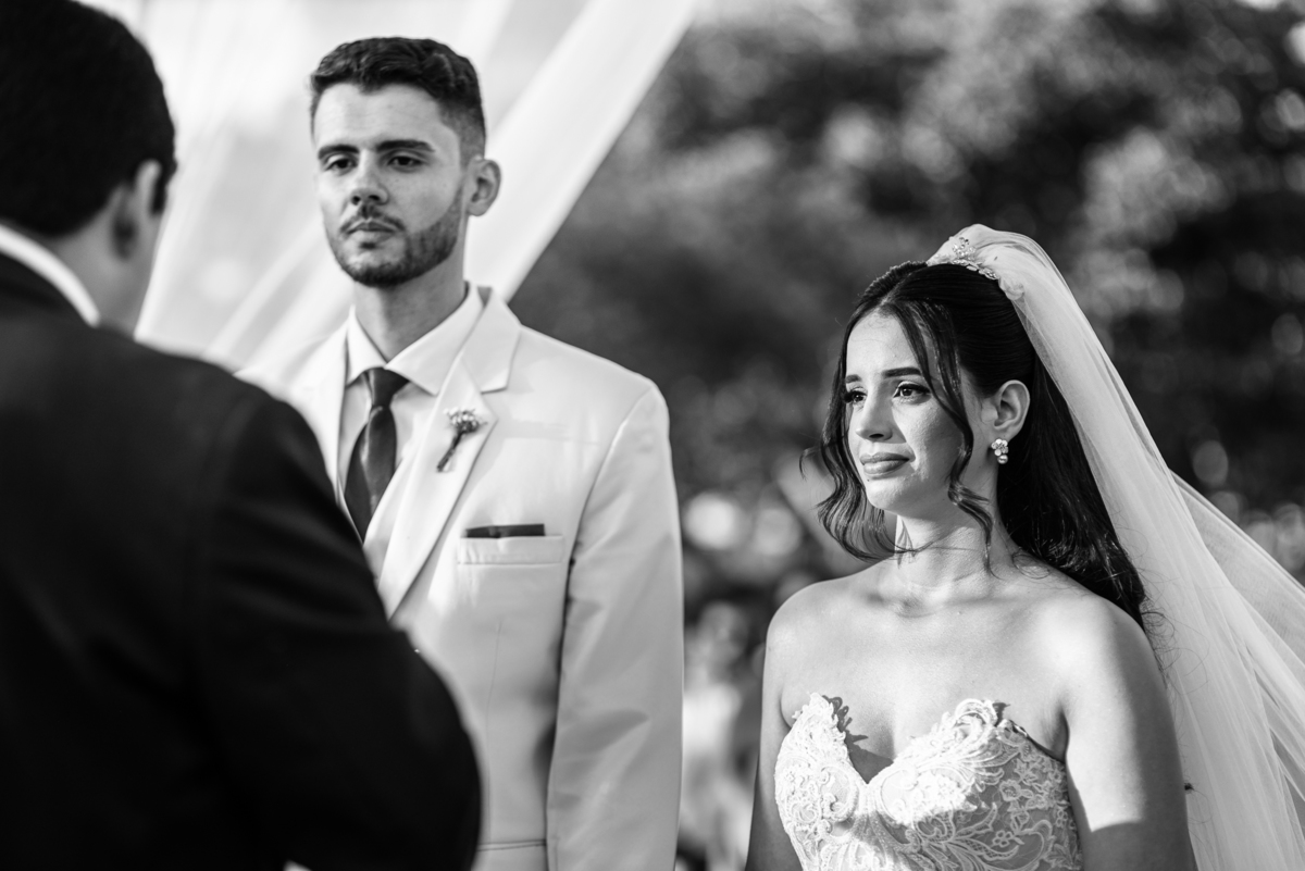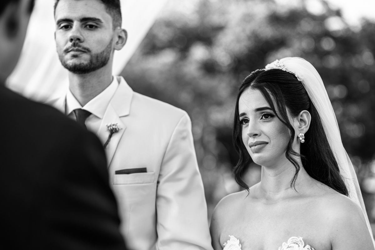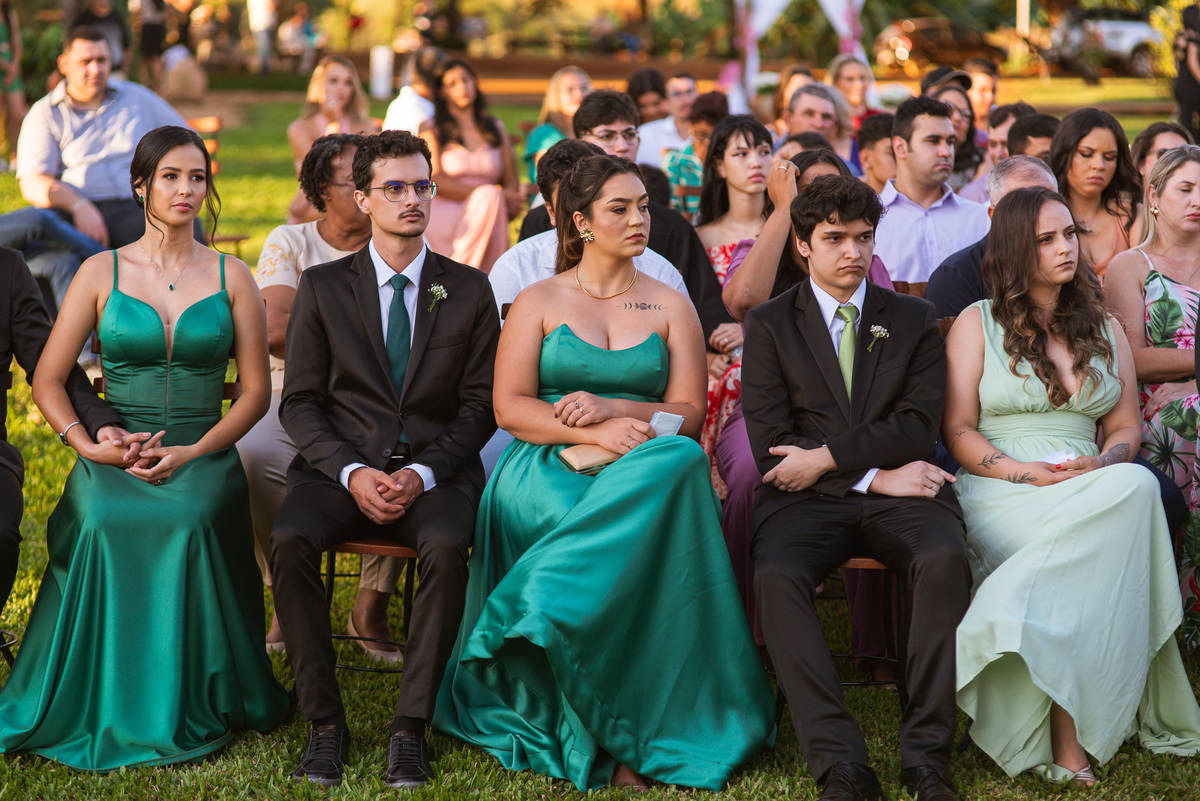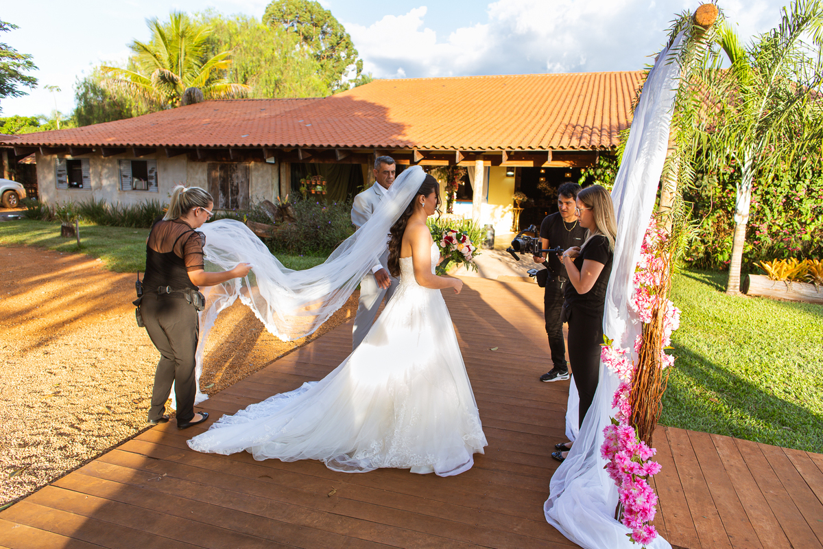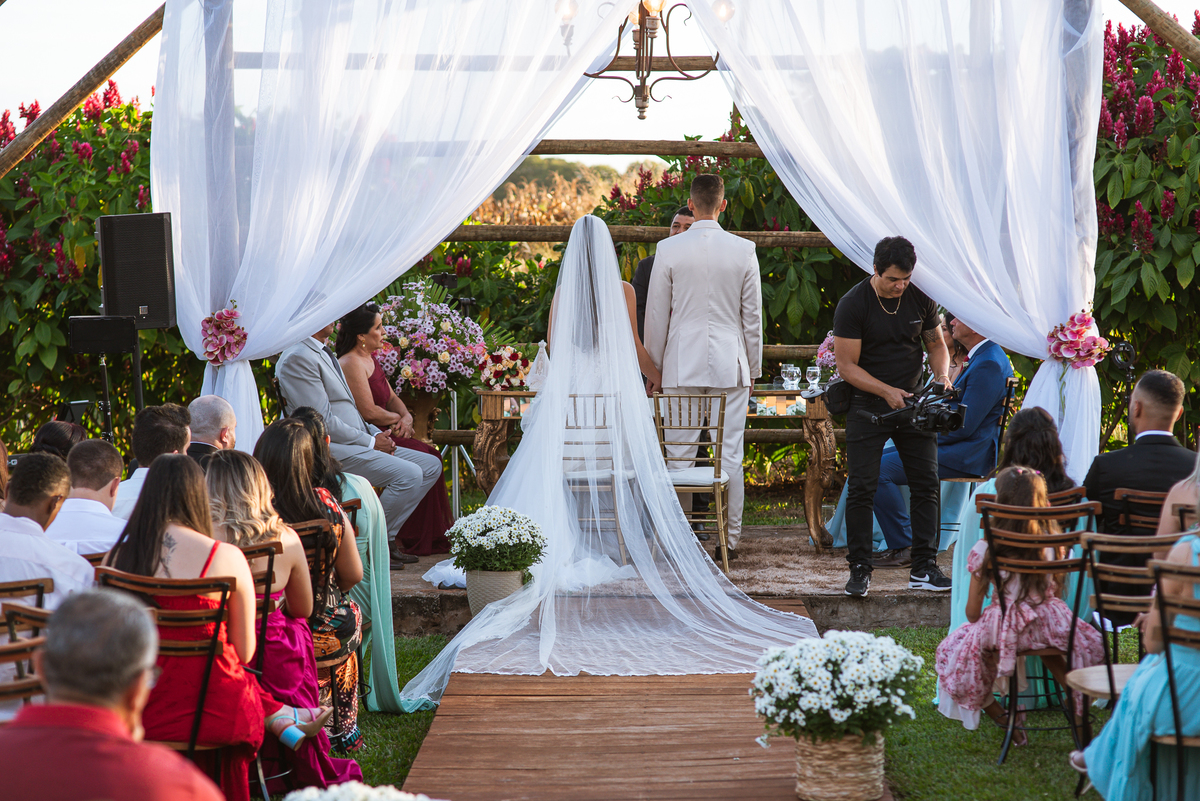 Os padrinhos todos já estavam alinhados e prontos para que a cerimônia começasse. Os músicos do Som do Coração já estavam entoando suas lindíssimas canções e embalavam o andamento da organização. O celebrante já se posicionou em frente ao altar e aguardou que tudo ficasse pronto para iniciar. Fizemos as fotografias da noiva no carro, com toda a calma do mundo. Ela estava lindíssima, com seu buquê nas mãos e o sorriso característico dela no rosto. Deixamos ela por lá e fomos para o altar aguardar o início. O cerimonial deu inicio à celebração. Os músicos começaram a tocar as músicas escolhidas pela noiva e os padrinhos começaram a entrar, casal por casal. Foi um verdadeiro desfile de beleza.