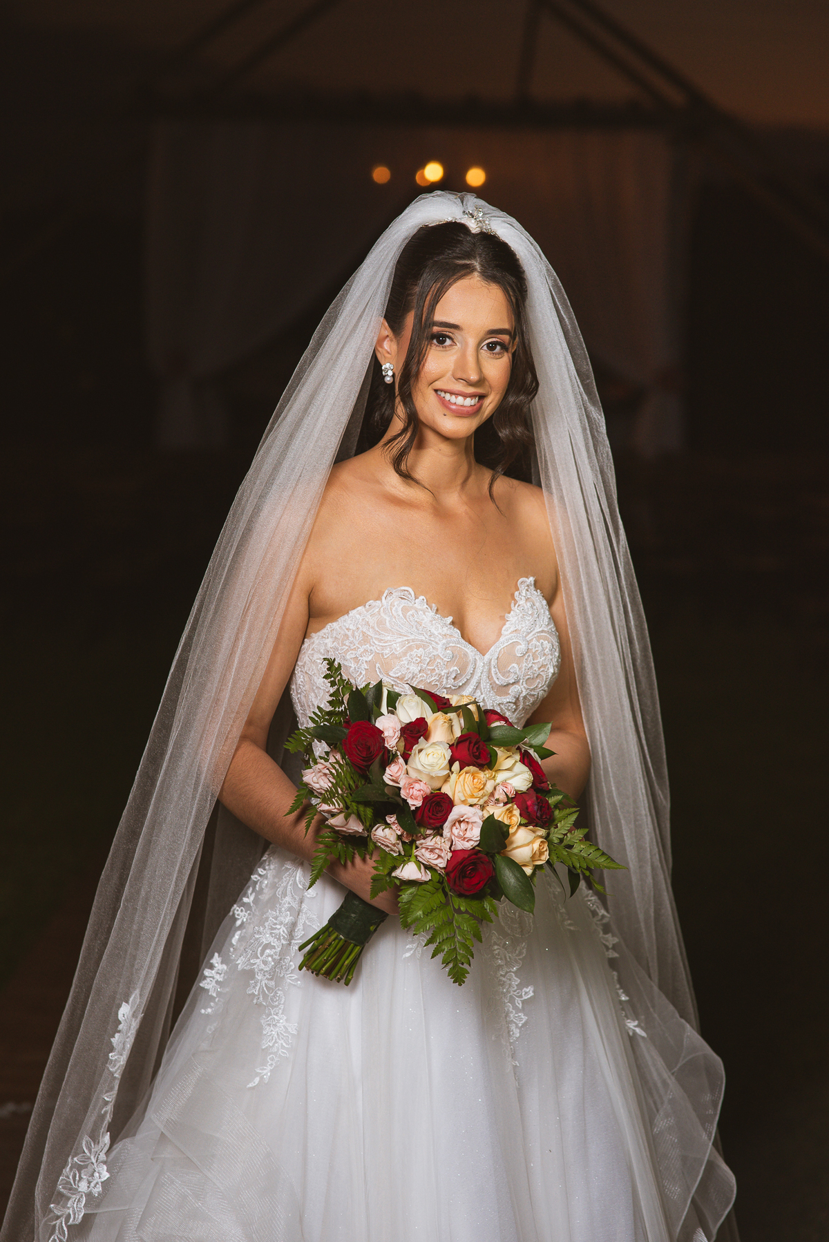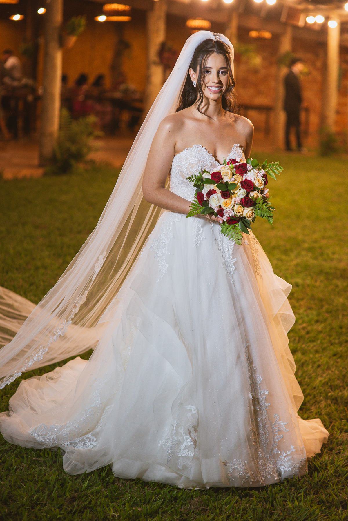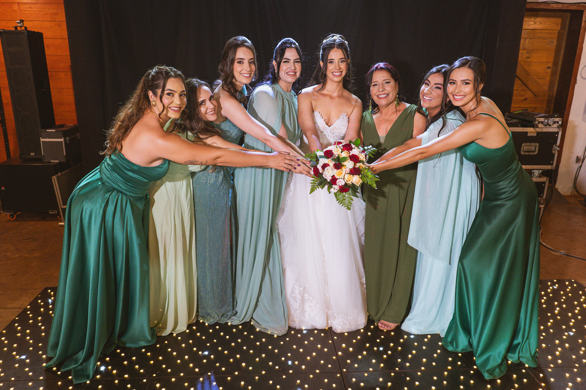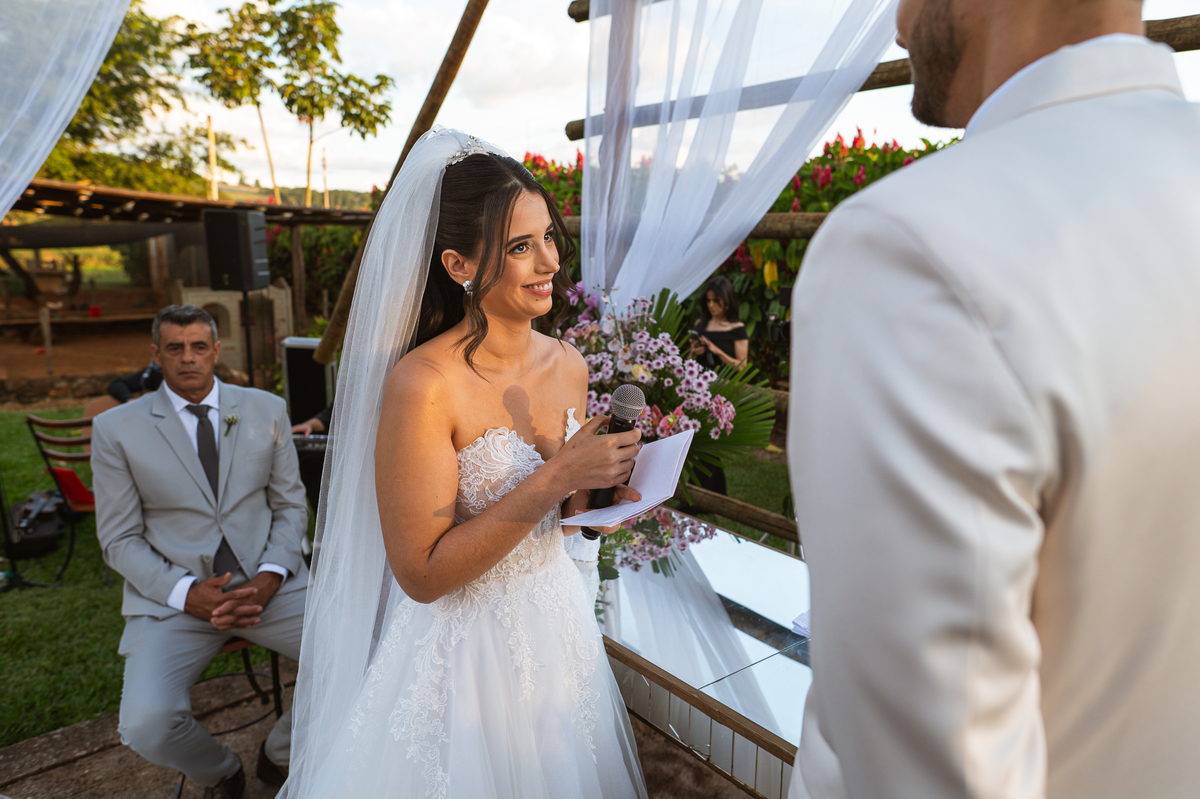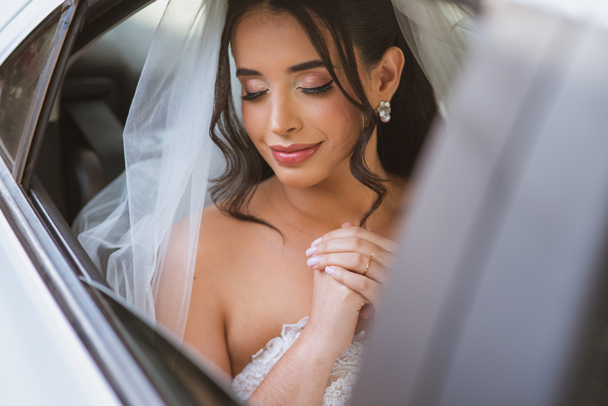 Os padrinhos todos já estavam alinhados e prontos para que a cerimônia começasse. Os músicos do Som do Coração já estavam entoando suas lindíssimas canções e embalavam o andamento da organização. O celebrante já se posicionou em frente ao altar e aguardou que tudo ficasse pronto para iniciar. Fizemos as fotografias da noiva no carro, com toda a calma do mundo. Ela estava lindíssima, com seu buquê nas mãos e o sorriso característico dela no rosto. Deixamos ela por lá e fomos para o altar aguardar o início. O cerimonial deu inicio à celebração. Os músicos começaram a tocar as músicas escolhidas pela noiva e os padrinhos começaram a entrar, casal por casal. Foi um verdadeiro desfile de beleza.