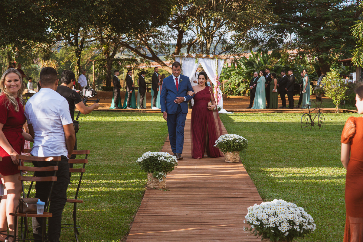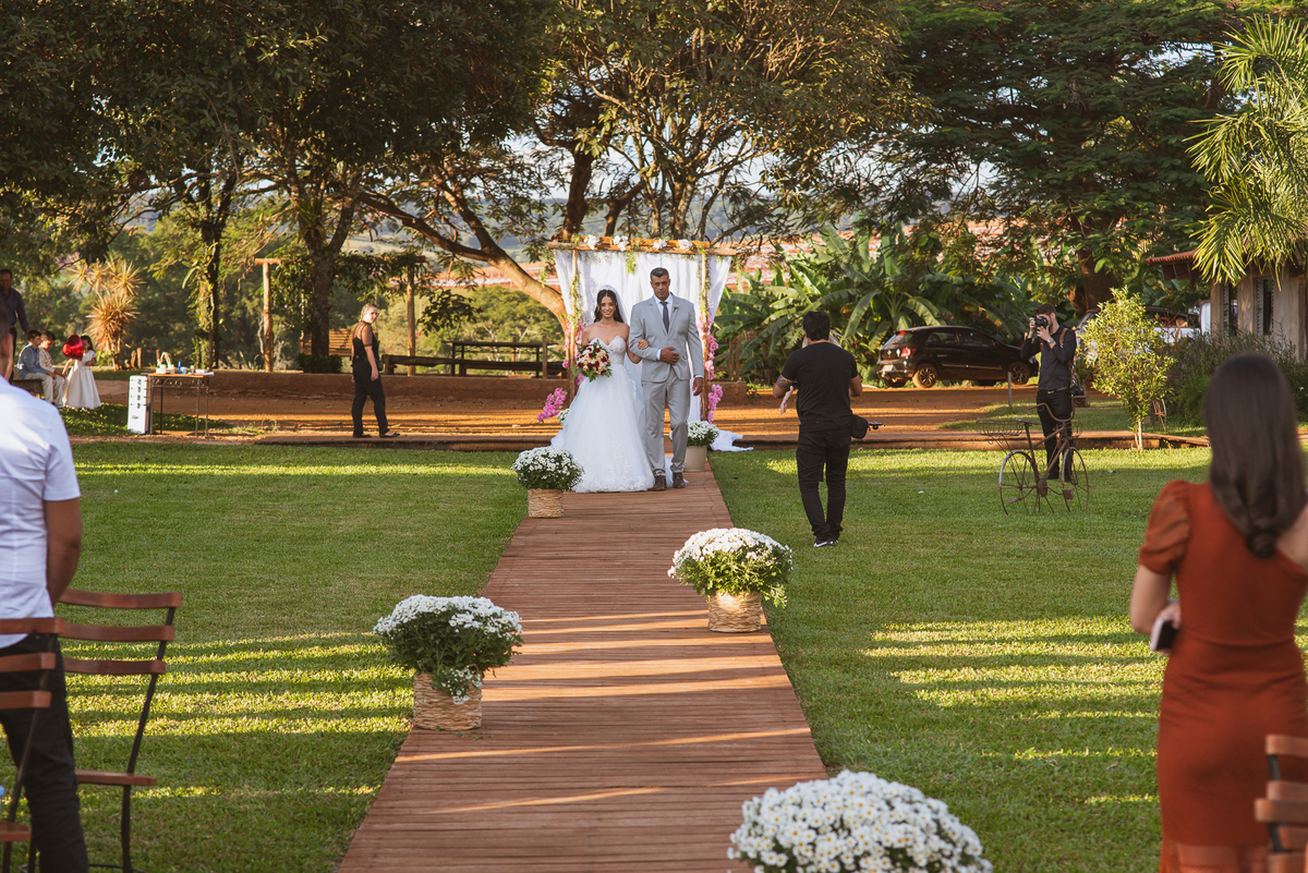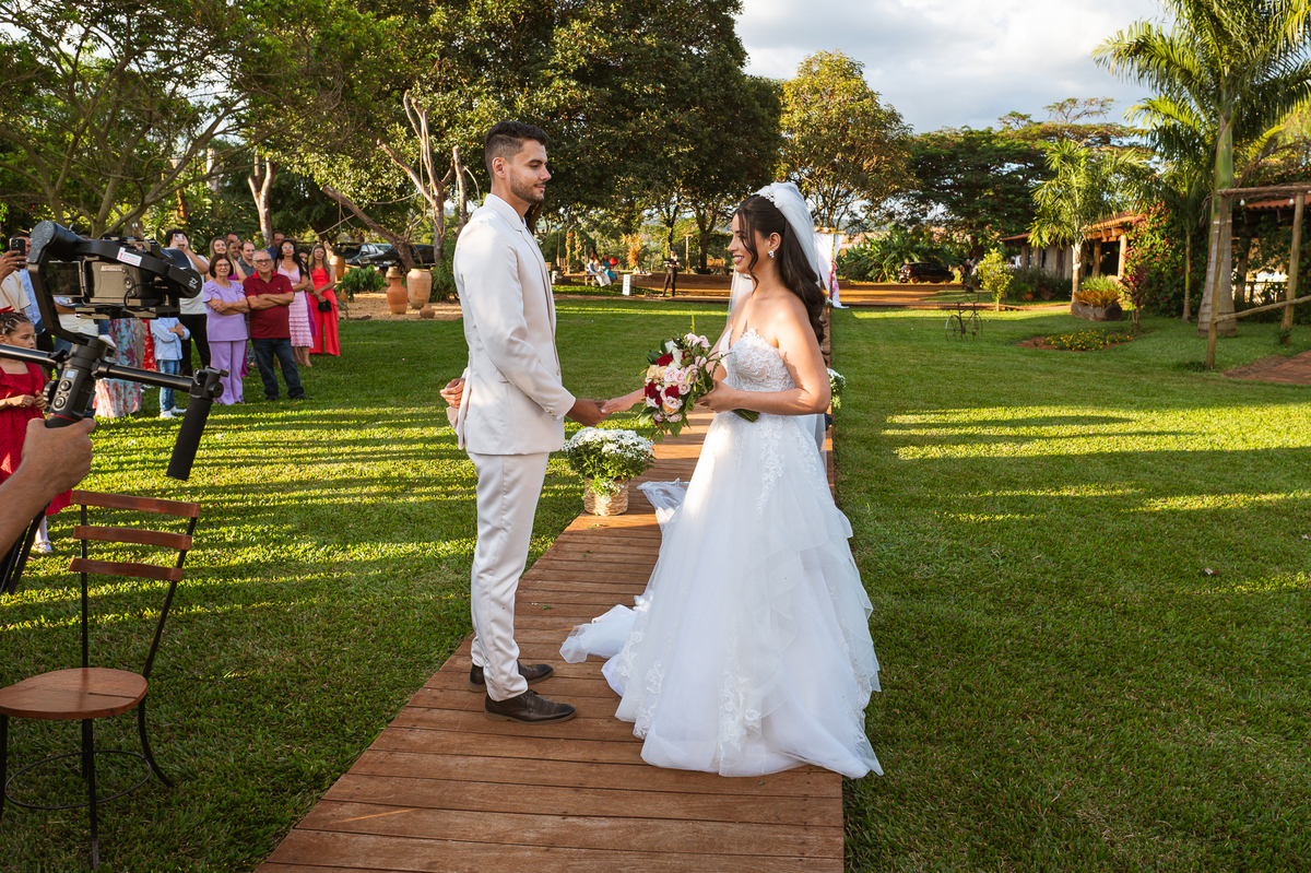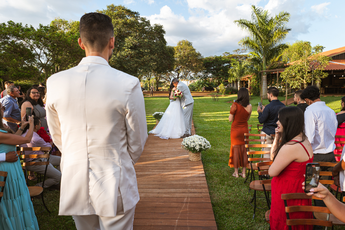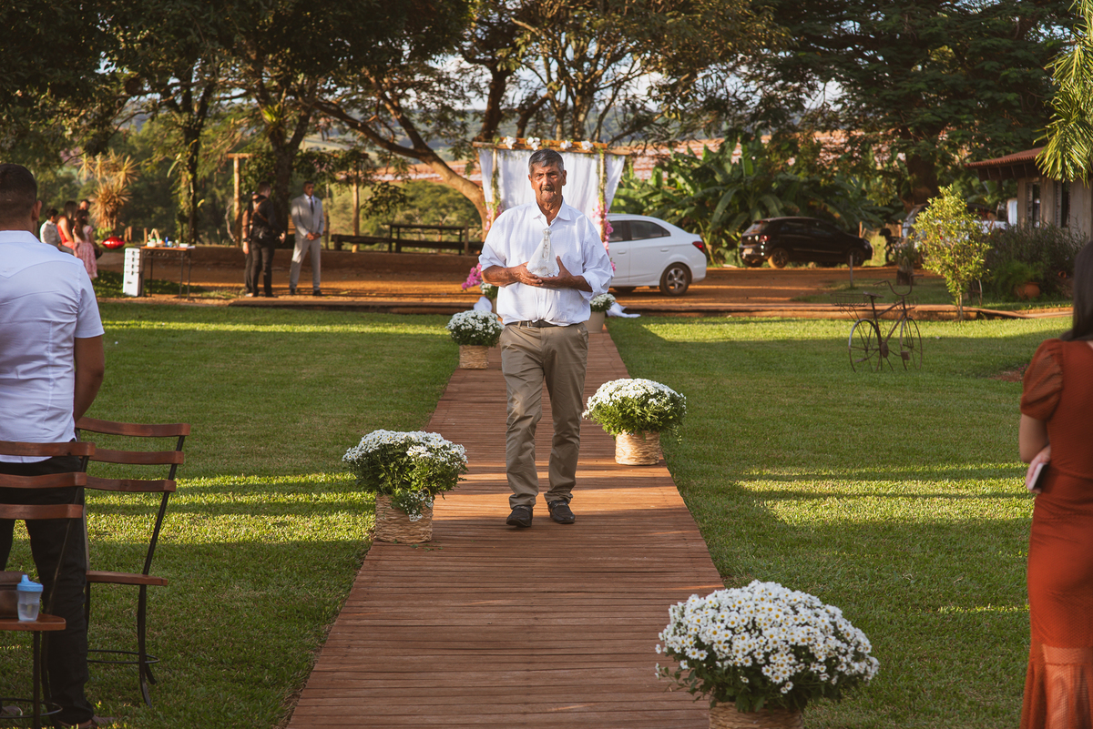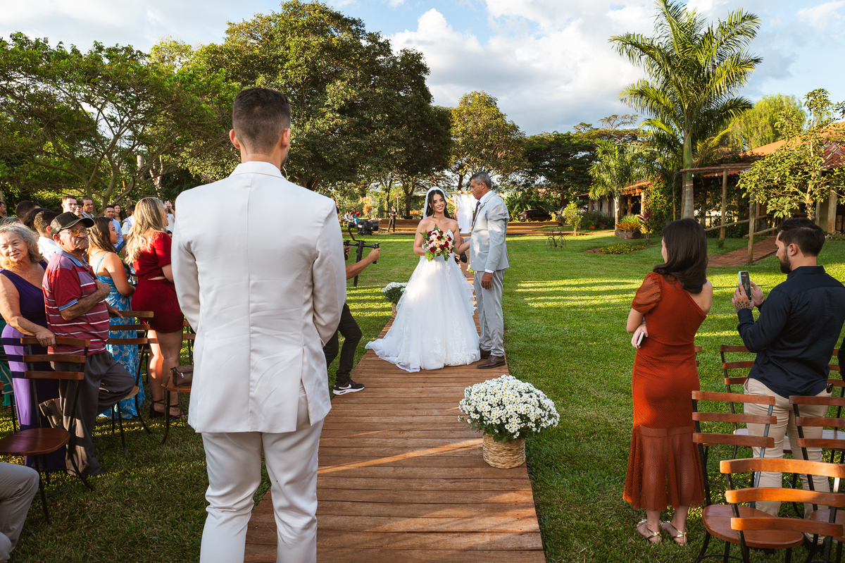 Agora, era a vez de Nathan enfrentar o corredor mais longo de sua vida até aquele momento. Com um beijo na testa de sua mãe, ele respeitosamente agradeceu pelos anos de cuidado e amor que os trouxeram até ali. De braços dados com ela, caminhou passo a passo até o altar. De lá, novamente beijou sua mãe e despediu-se dela. Agora, era aguardar sua amada se encontrar com ele. Por detrás da cortina que tampava a visão dos convidados, Rosiane se posicionou de braços dados com seu pai. Faltavam poucos segundos para todos se encantarem com aquela cena. A marcha nupcial foi tocada mas a noiva ainda não entrou. Assim que finalizaram, começou a música que ela sempre sonhou entrar em seu casamento. As cortinas foram abertas e os olhares se voltaram todos para lá. O dia estava muito bonito. O céu azul compunha a cena e embelezava ainda mais aquele momento.