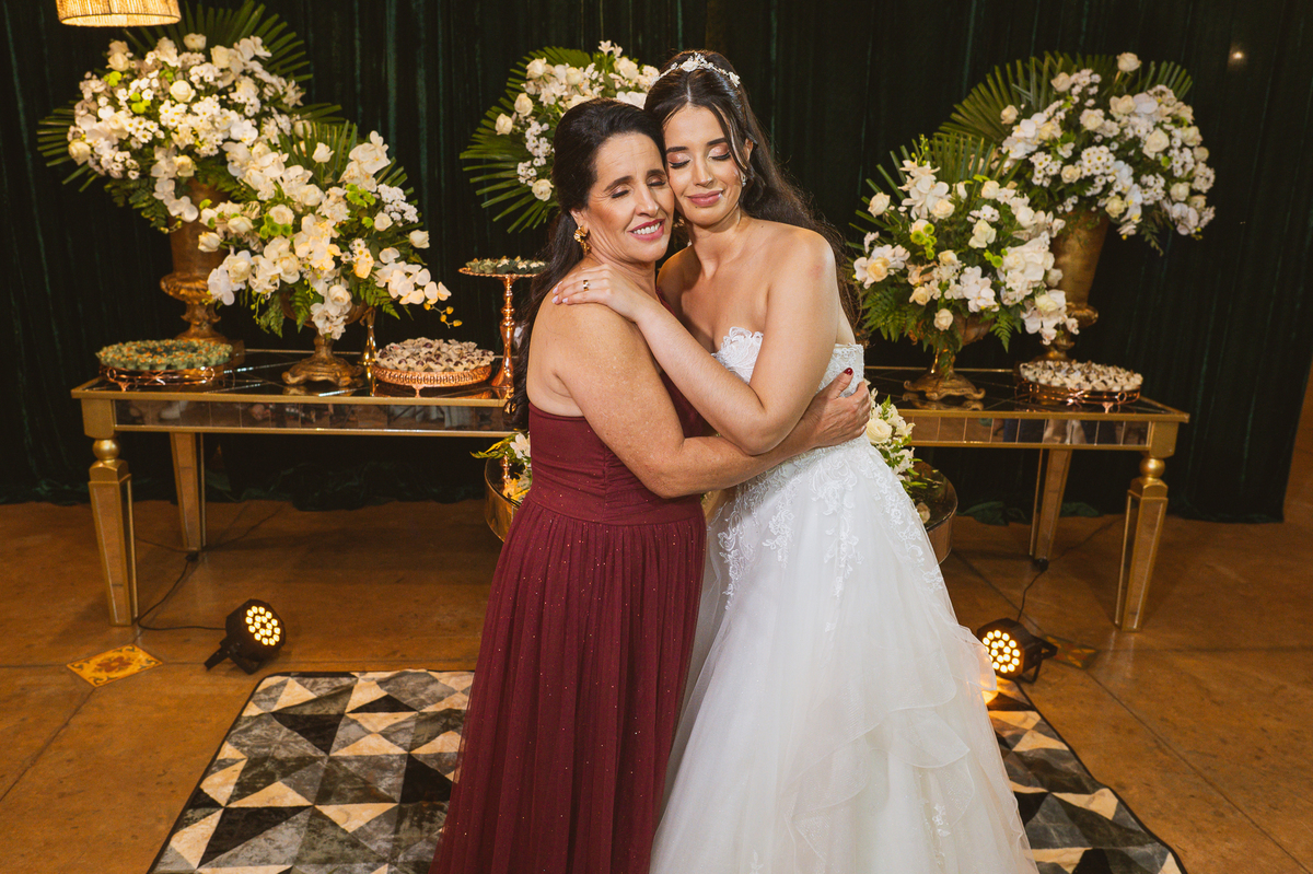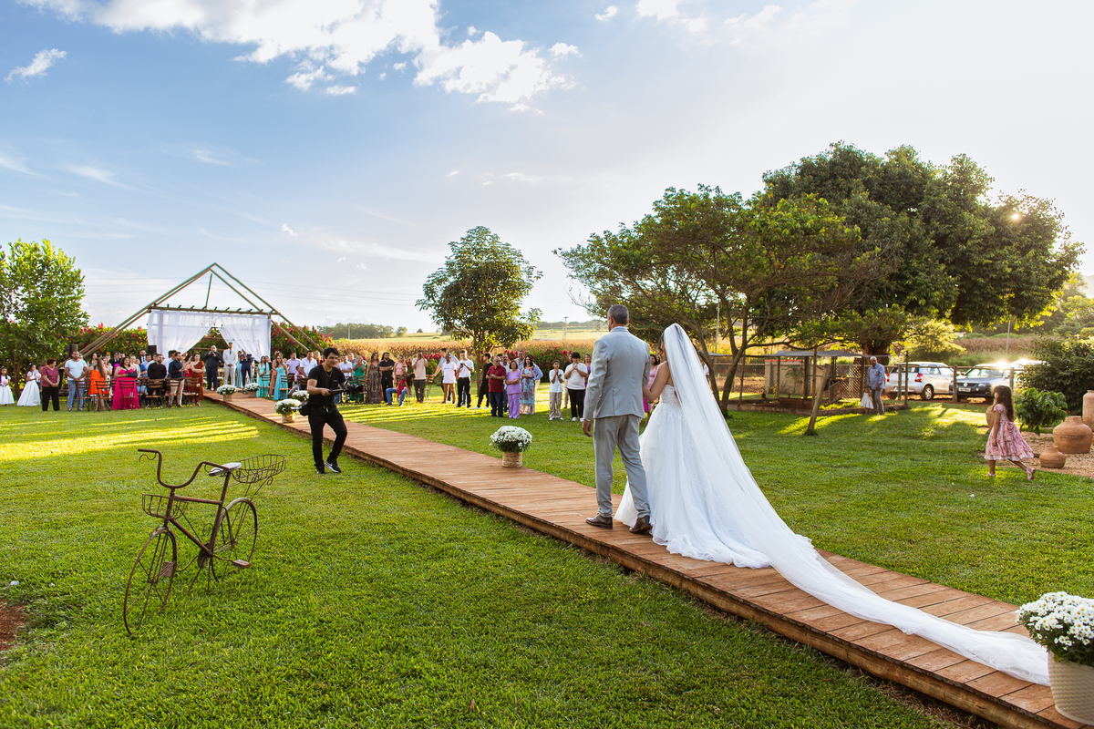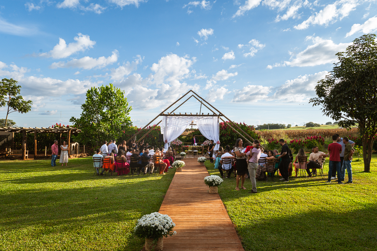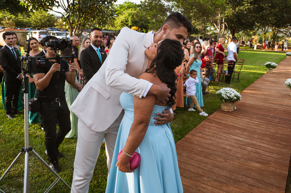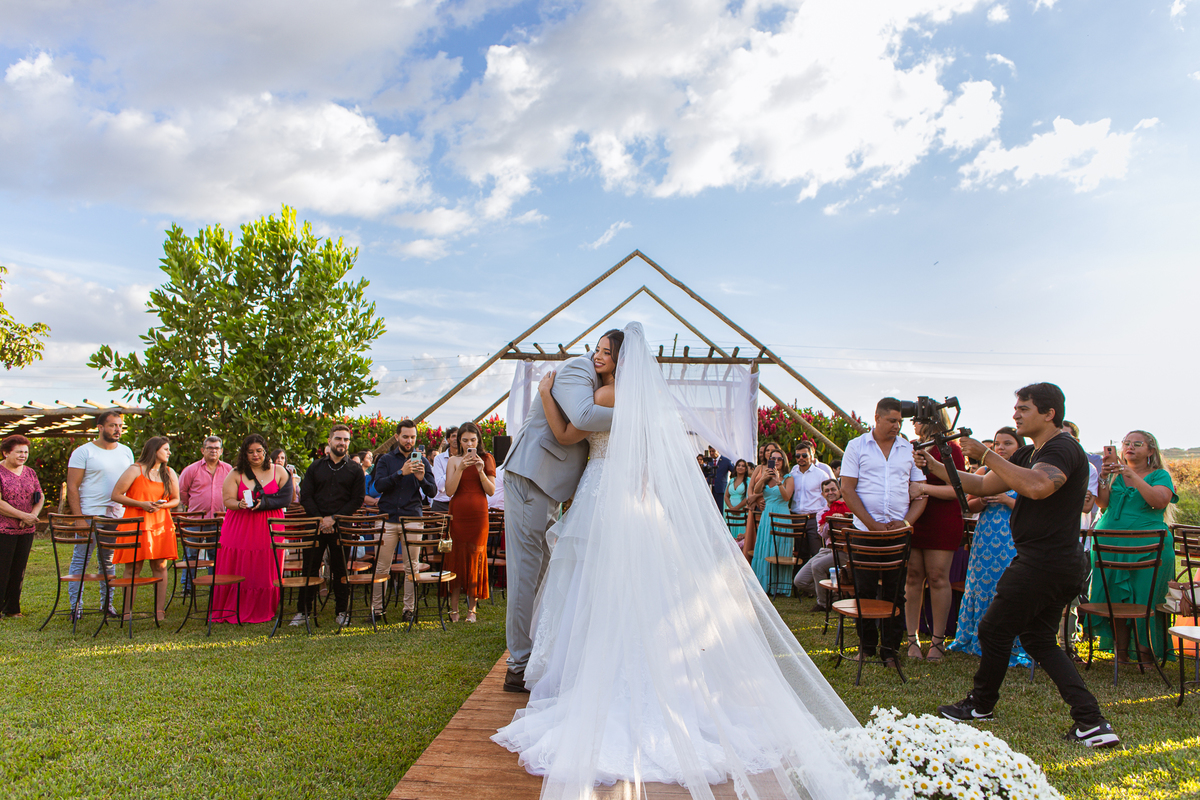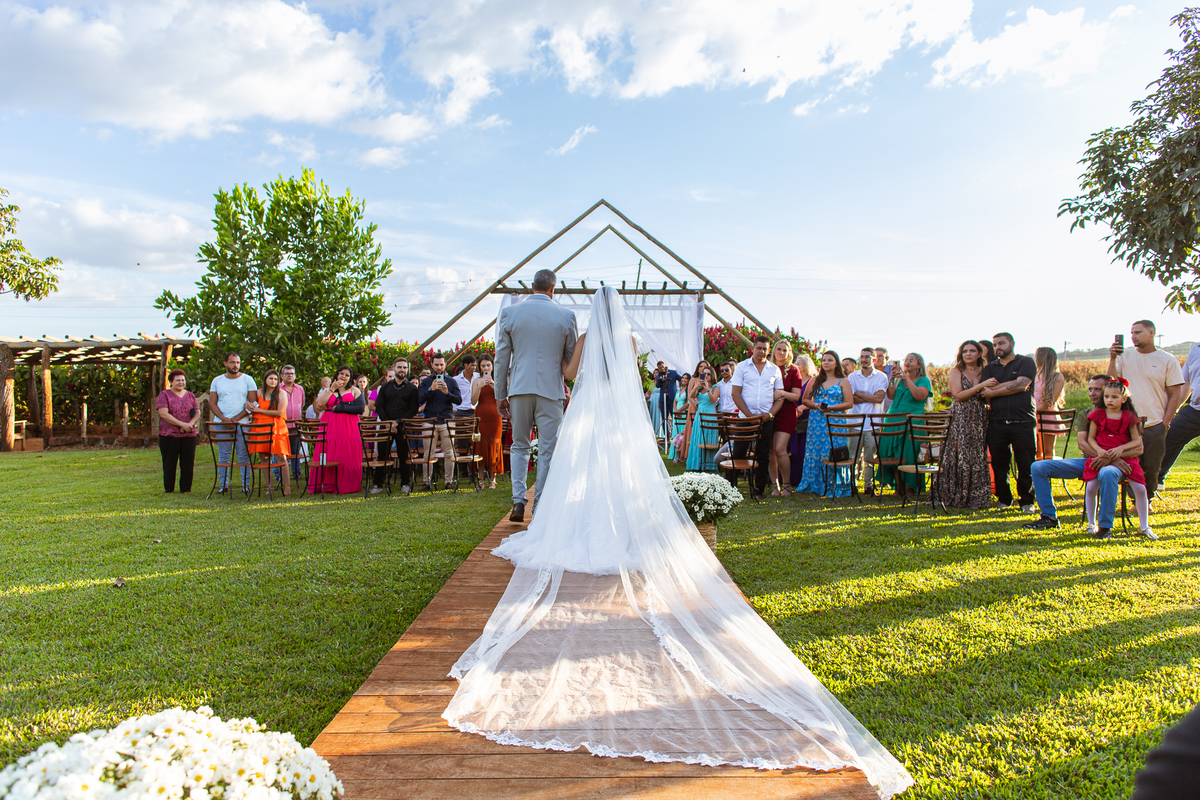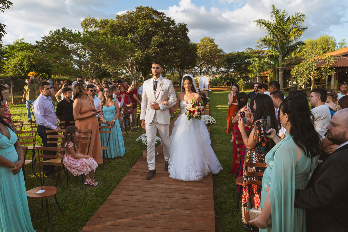 Agora, era a vez de Nathan enfrentar o corredor mais longo de sua vida até aquele momento. Com um beijo na testa de sua mãe, ele respeitosamente agradeceu pelos anos de cuidado e amor que os trouxeram até ali. De braços dados com ela, caminhou passo a passo até o altar. De lá, novamente beijou sua mãe e despediu-se dela. Agora, era aguardar sua amada se encontrar com ele. Por detrás da cortina que tampava a visão dos convidados, Rosiane se posicionou de braços dados com seu pai. Faltavam poucos segundos para todos se encantarem com aquela cena. A marcha nupcial foi tocada mas a noiva ainda não entrou. Assim que finalizaram, começou a música que ela sempre sonhou entrar em seu casamento. As cortinas foram abertas e os olhares se voltaram todos para lá. O dia estava muito bonito. O céu azul compunha a cena e embelezava ainda mais aquele momento.