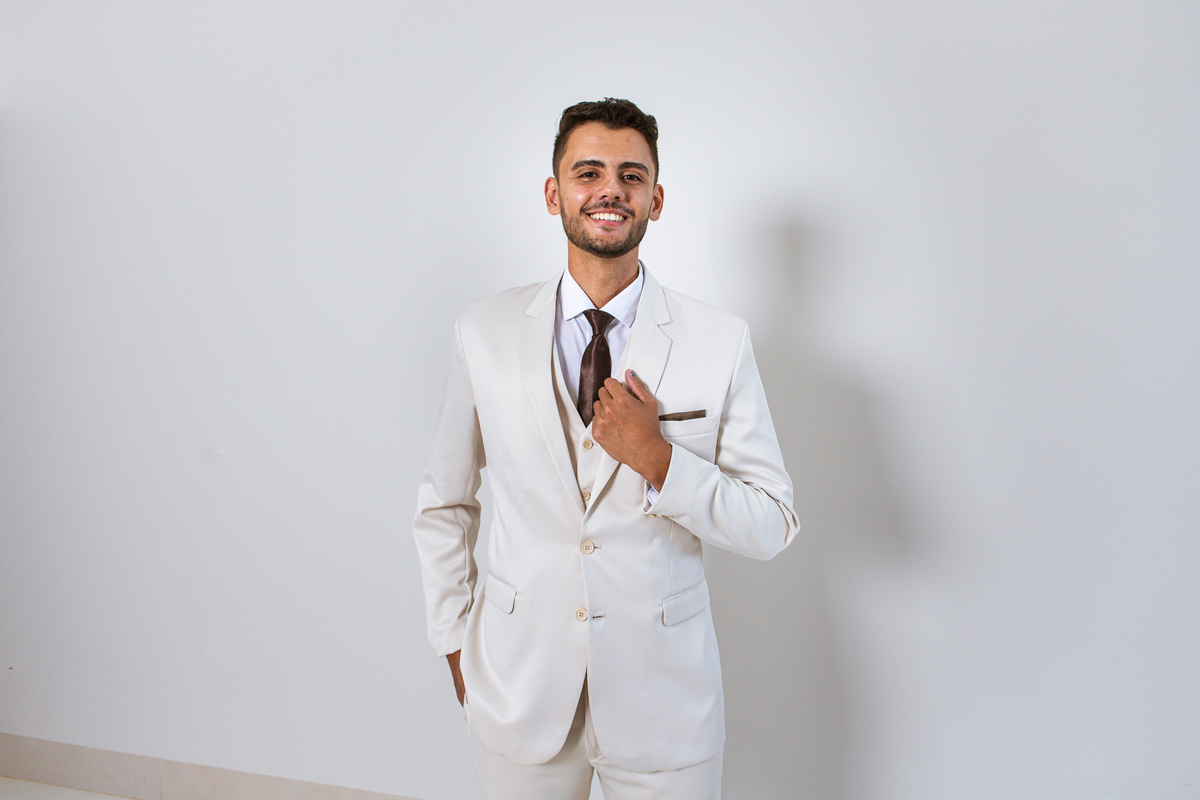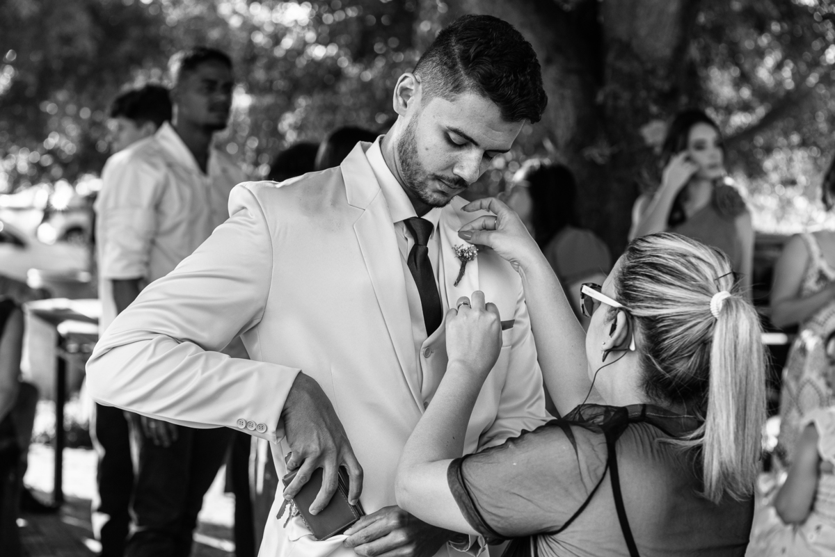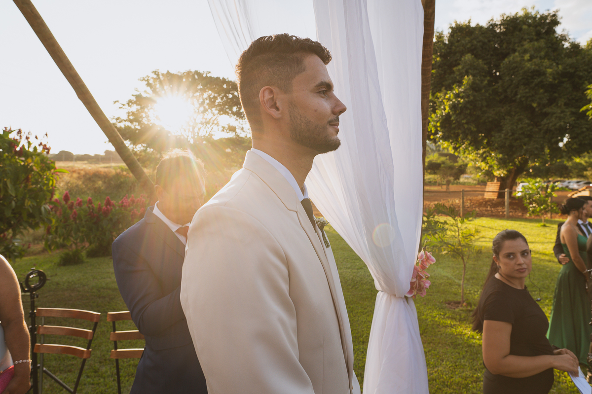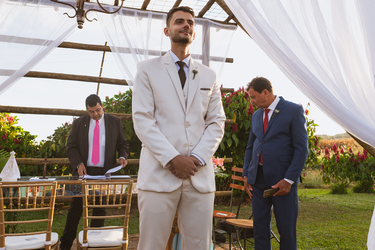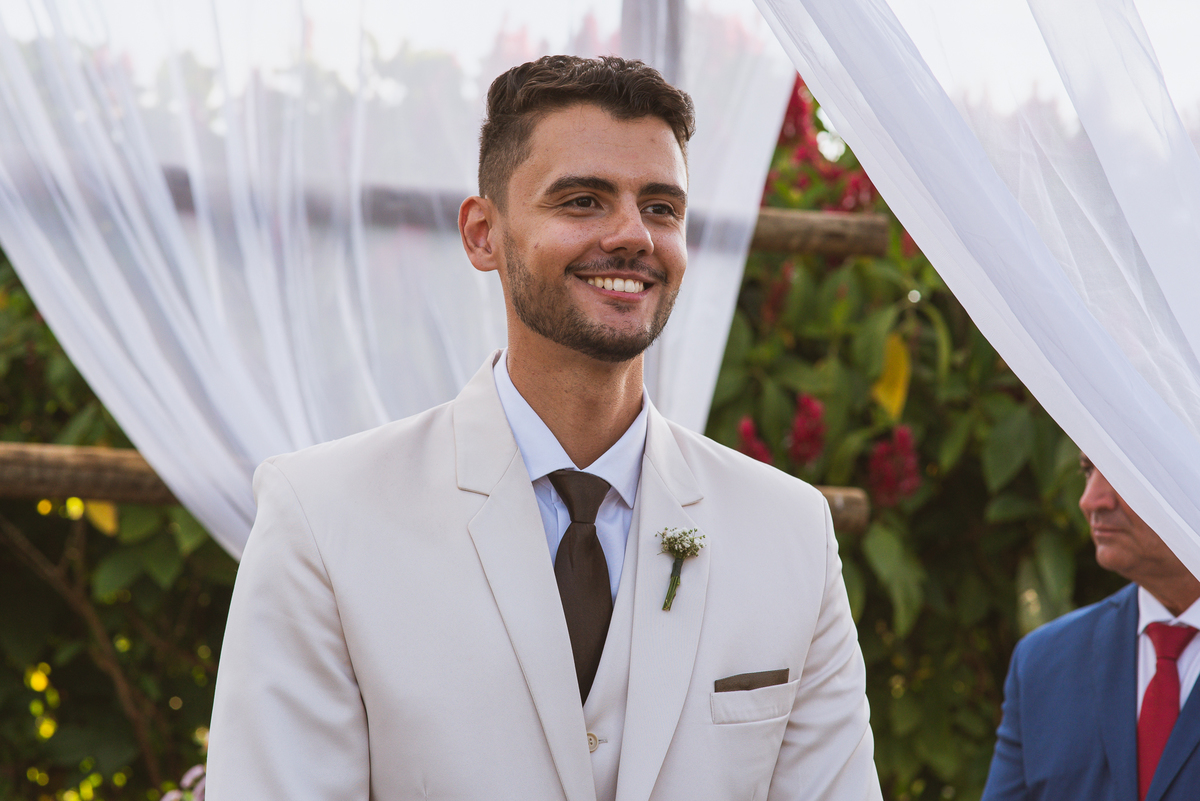 Lá chegando, bem antes de começar tudo, haviam poucos convidados presentes. Tive tempo de fotografar a decoração, que normalmente fica a cargo do fotógrafo assistente. A super equipe do Cerimonial Elo estava completa. A cada padrinho que chegava, já era posicionado em seu devido lugar e informado do que precisaria fazer. As lapelas iam sendo colocadas em um por um. De onde eu estava, avistei um homem alto e que destacava em meio à luz do dia que o emoldurava enquanto caminhava. Com um terno branco muito bonito, Nathan chegou e foi logo conferir os detalhes do que precisaria fazer também. Os detalhes foram passados para ele e sua mãe. Enquanto isso, a noiva também chegou.