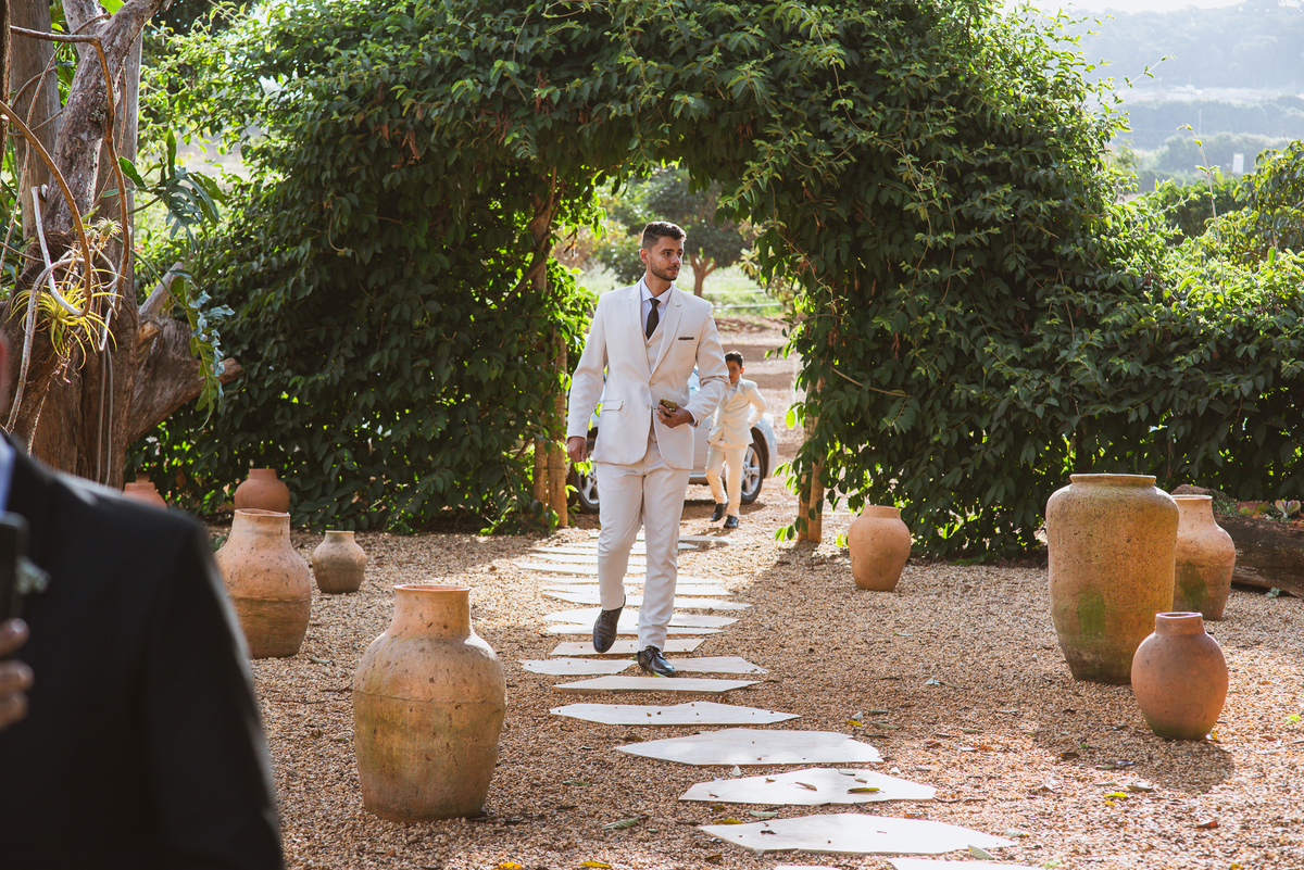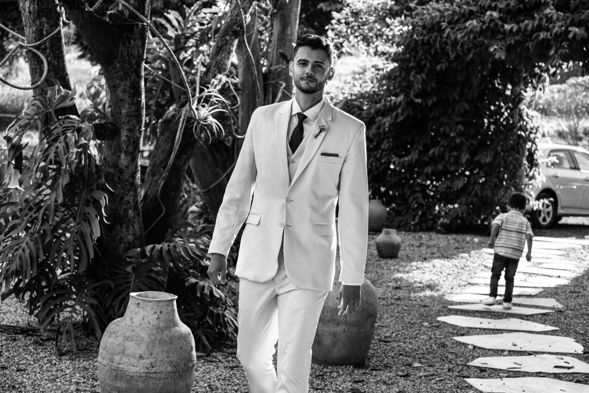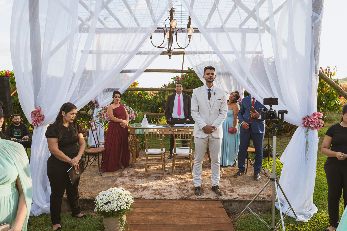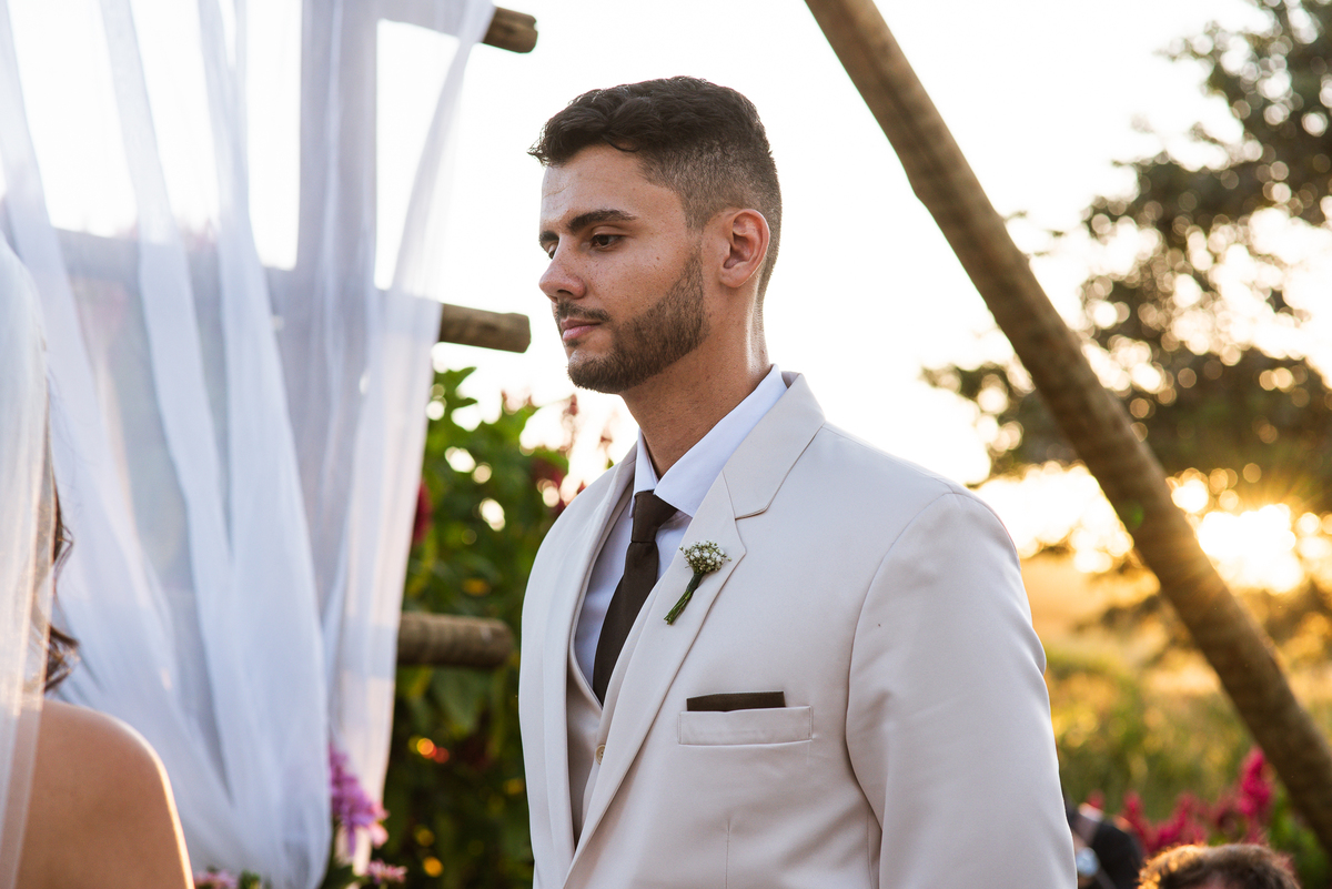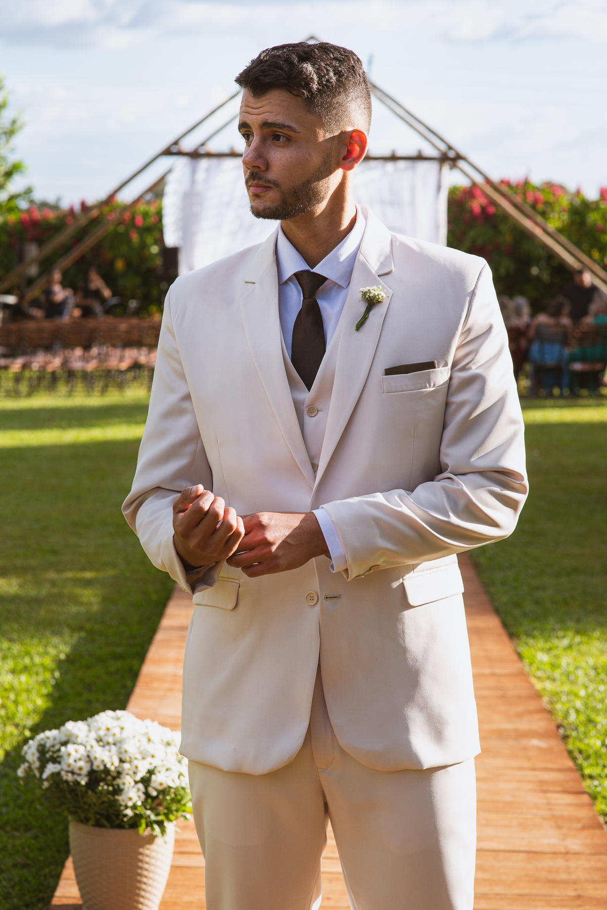 Lá chegando, bem antes de começar tudo, haviam poucos convidados presentes. Tive tempo de fotografar a decoração, que normalmente fica a cargo do fotógrafo assistente. A super equipe do Cerimonial Elo estava completa. A cada padrinho que chegava, já era posicionado em seu devido lugar e informado do que precisaria fazer. As lapelas iam sendo colocadas em um por um. De onde eu estava, avistei um homem alto e que destacava em meio à luz do dia que o emoldurava enquanto caminhava. Com um terno branco muito bonito, Nathan chegou e foi logo conferir os detalhes do que precisaria fazer também. Os detalhes foram passados para ele e sua mãe. Enquanto isso, a noiva também chegou.
