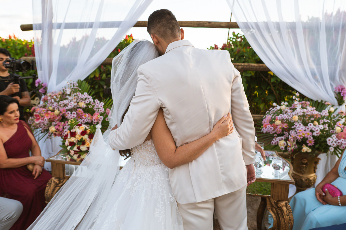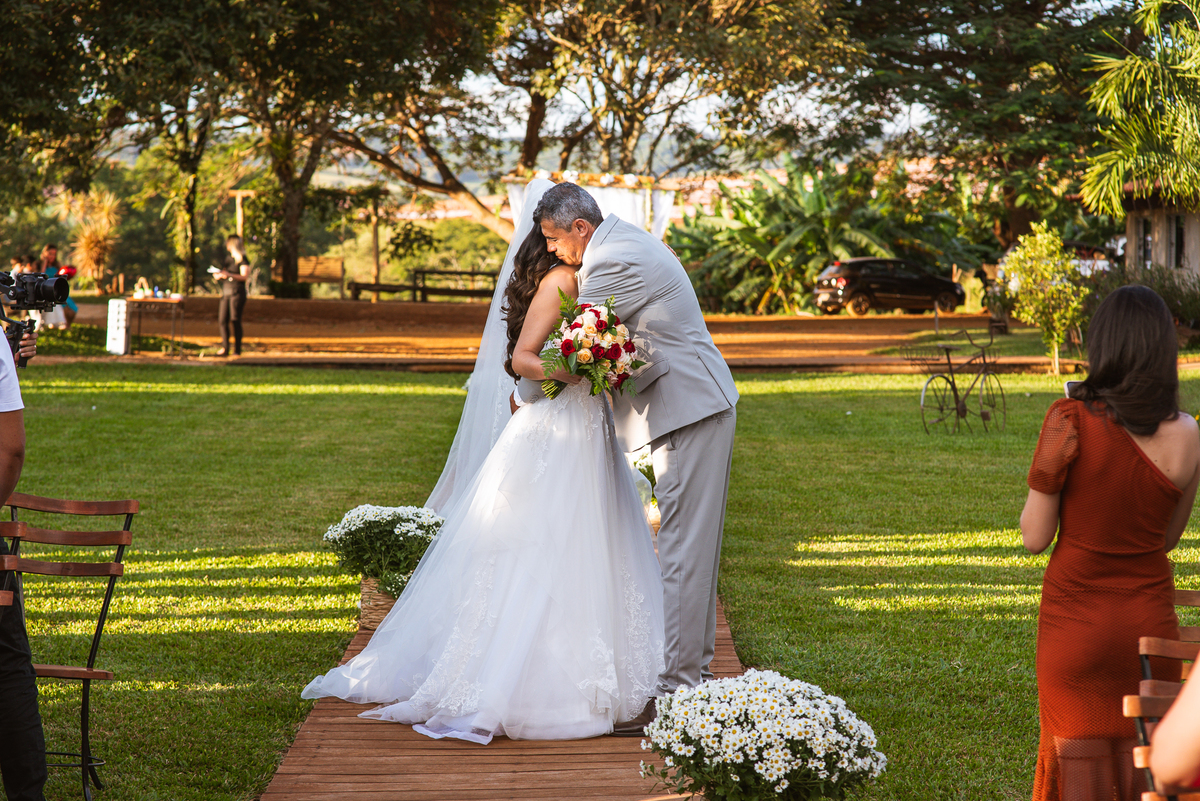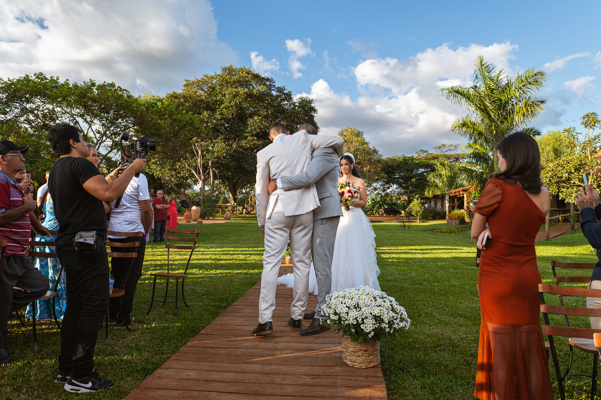 Nathan segurou forte a emoção. Olhava para ela como quem dissesse: Que mulher linda! Ao passo que mal podia se mexer. Os olhos ficaram fitos nela e em seu pai. Os passos iam sendo dados e o espaço diminuía. A noiva parou, virou de frente para seu pai e o abraçou fortemente. Ele também retribuiu como se abraçasse sua menininha. Imagino eu que nessa hora, passa um imenso filme na cabeça de cada pai e mãe. Todas as lembranças, desde o nascimento, os primeiros passos, as primeiras palavras ditas, até chegar ao evento máximo e entregar a mão de sua filha em casamento. Eles despediram-se e Nathan se aproximou encontrando com seu sogro. Abraçou-o e despediu-se dele também.