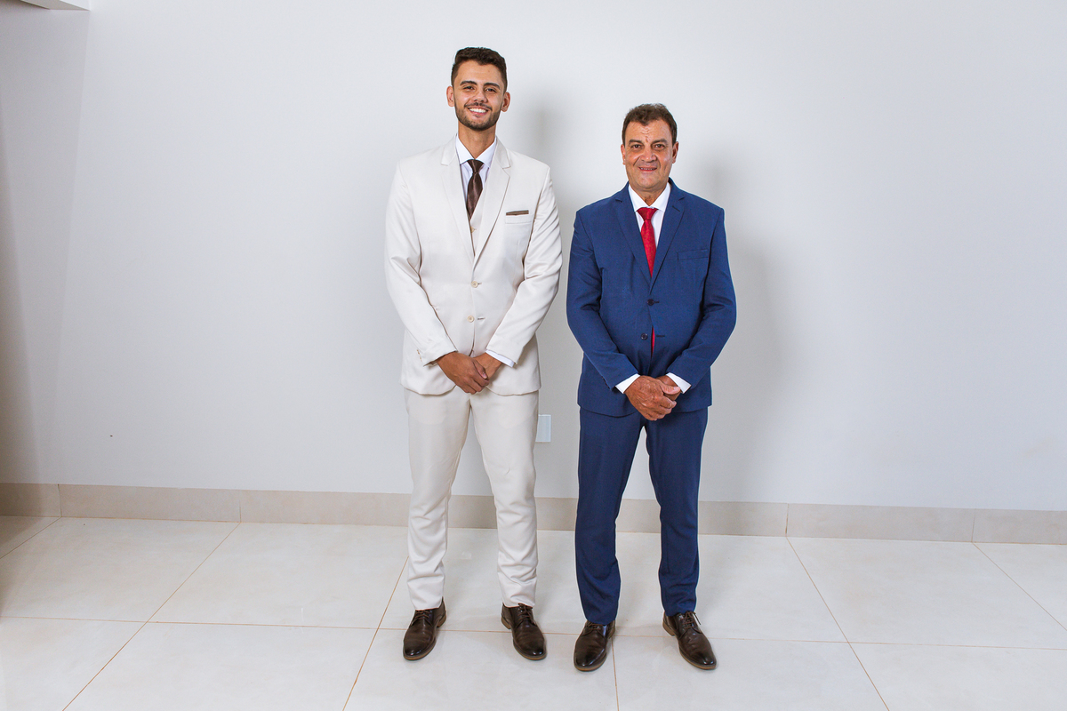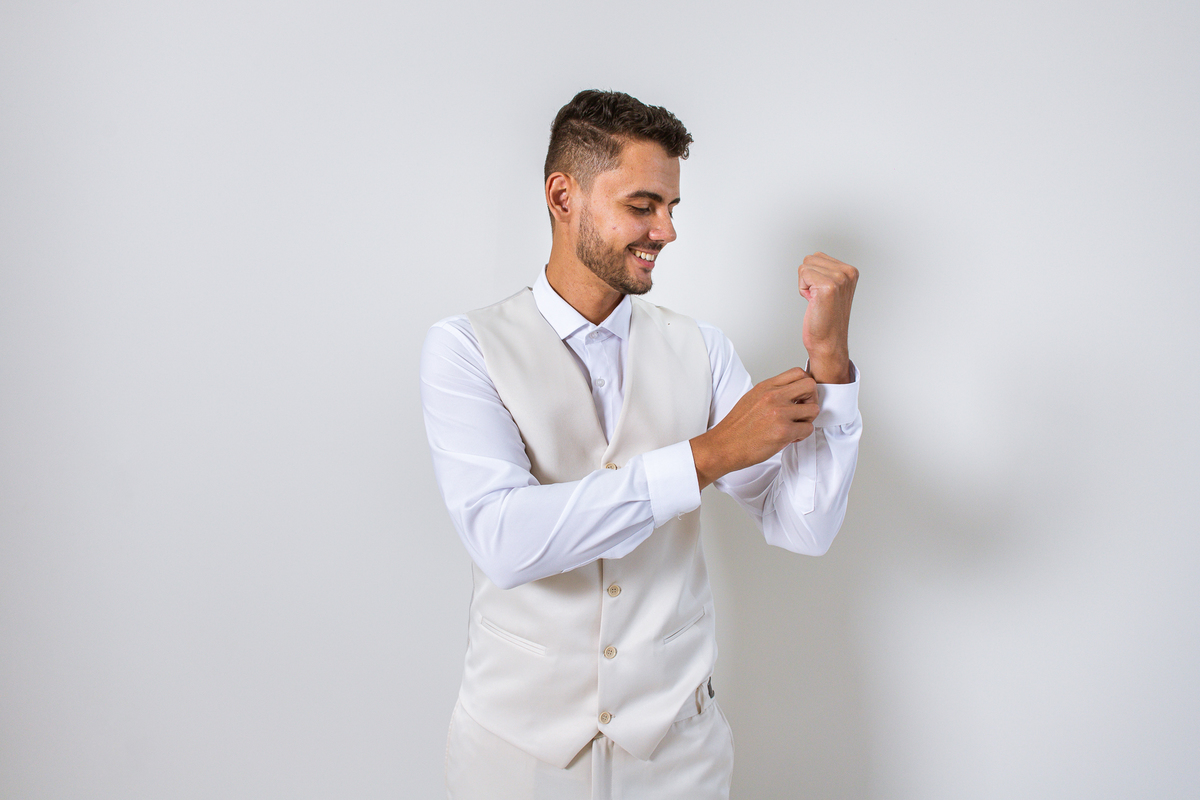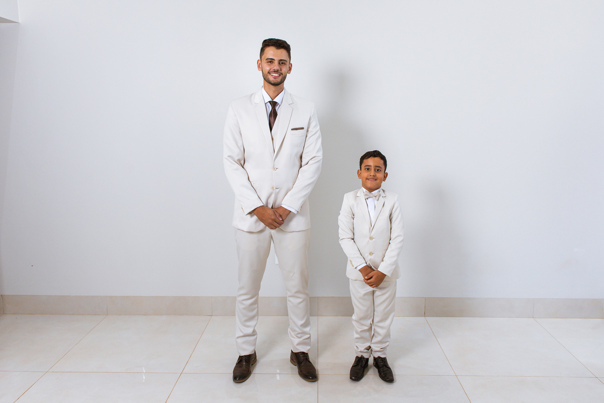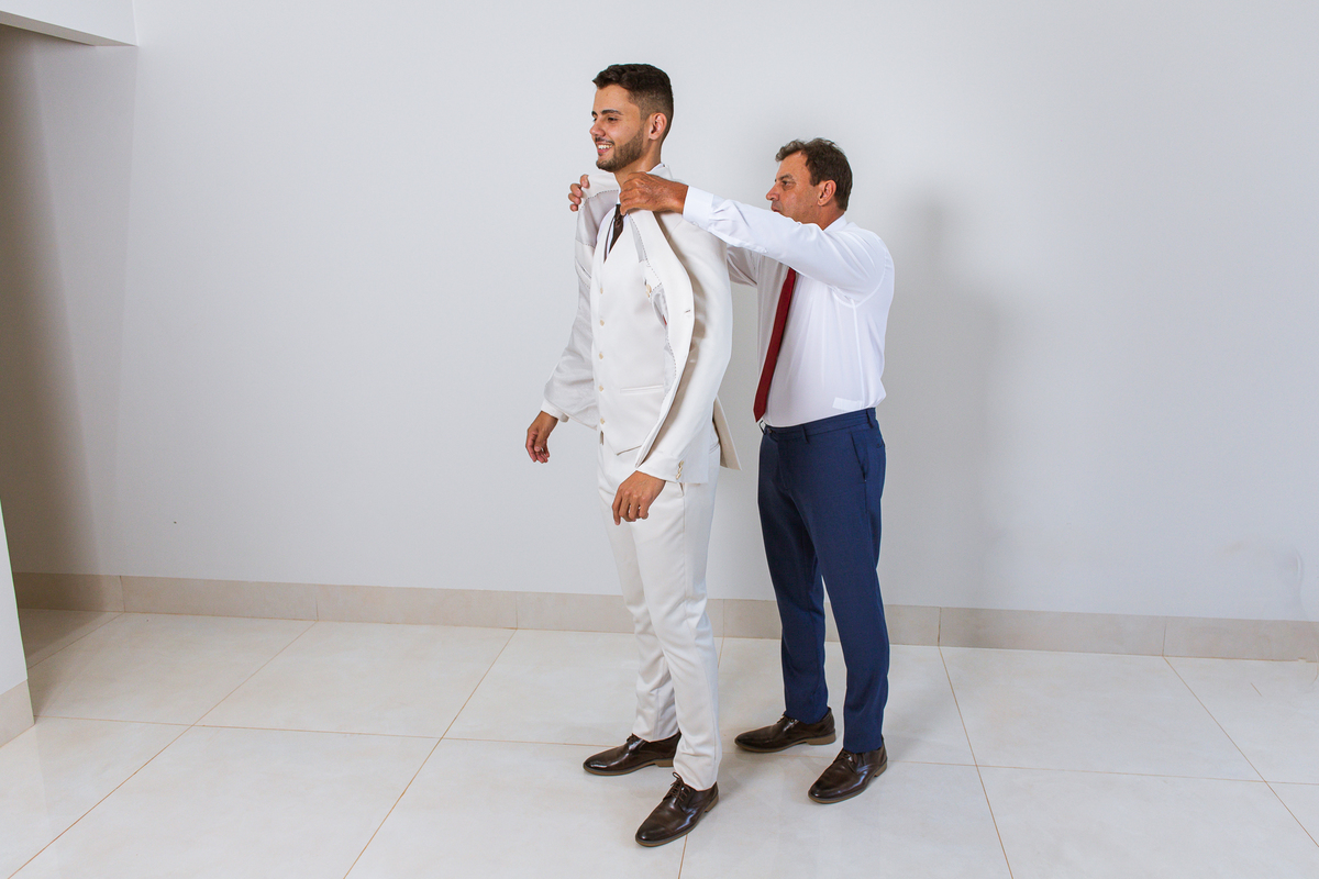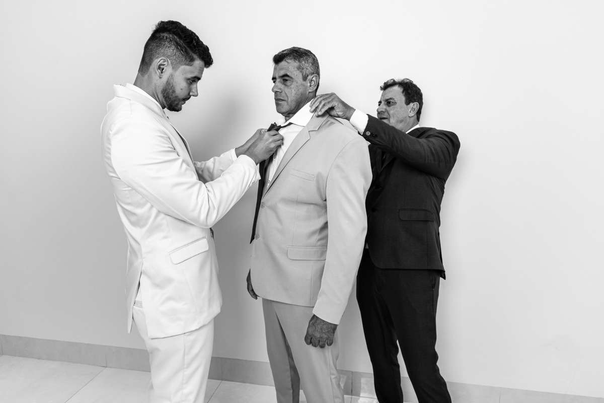 Nathan começou a se preparar bem cedo também. Foi ao seu barbeiro de confiança para dar aquele charme no visual e depois foi para casa com seu pai e seu sogro para colocarem seus respectivos ternos. Do salão, foram direto para lá. Ele contou com a ajuda do pai e também ajudou seu sogro a se vestir, colocando o blazer. Juntamos os três e fizemos as fotografias do making of. Logo Nathan estava pronto e aguardando o momento de ir para o local do casamento. Enquanto isso, Rosiane finalizava a produção. Fizemos o brinde dela com a mãe e sogra, e logo estava na hora de se vestir. O vestido foi ajustado e ficou impecável em seu corpo.