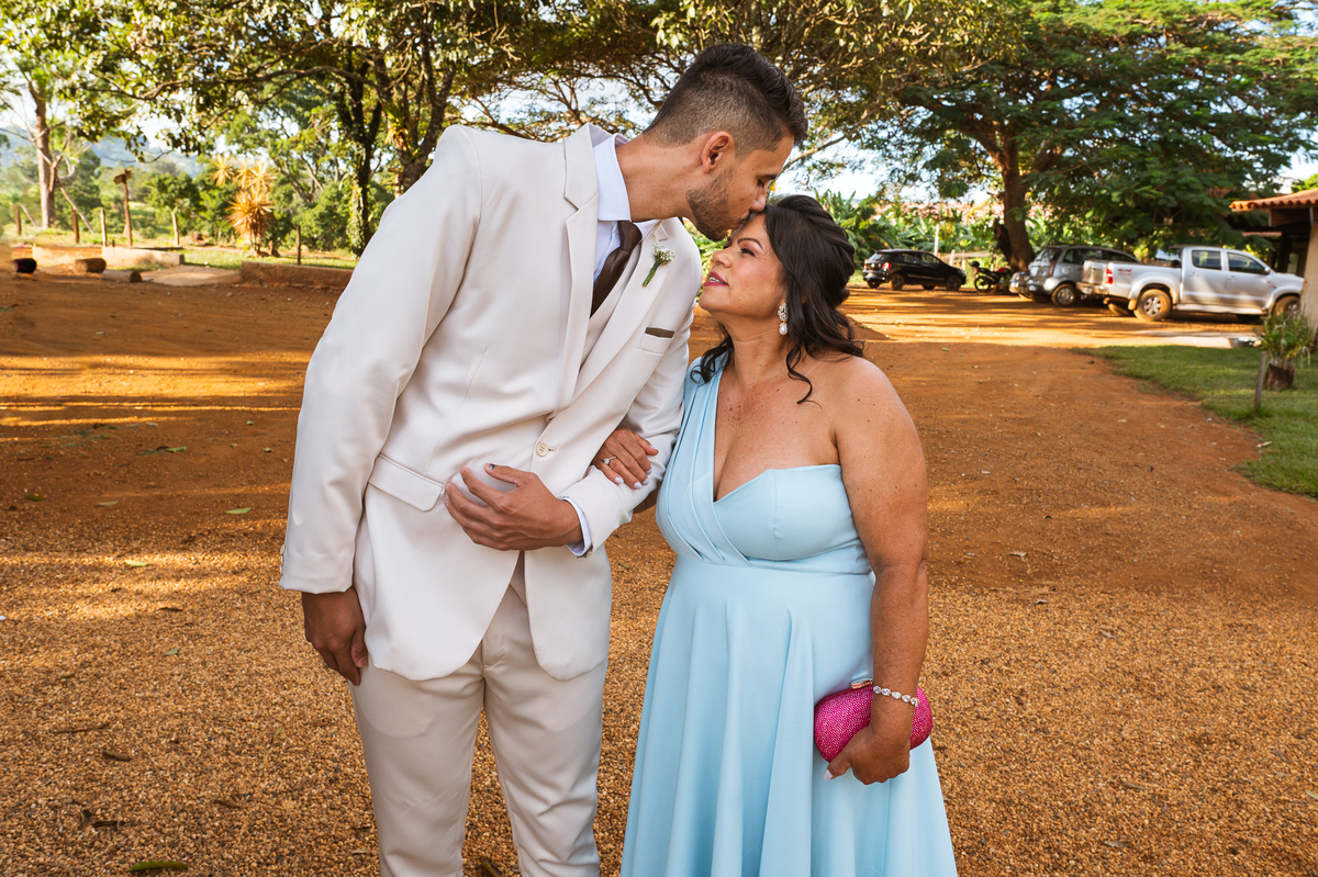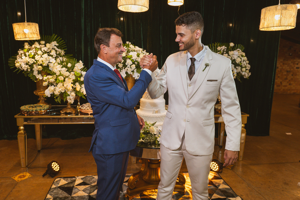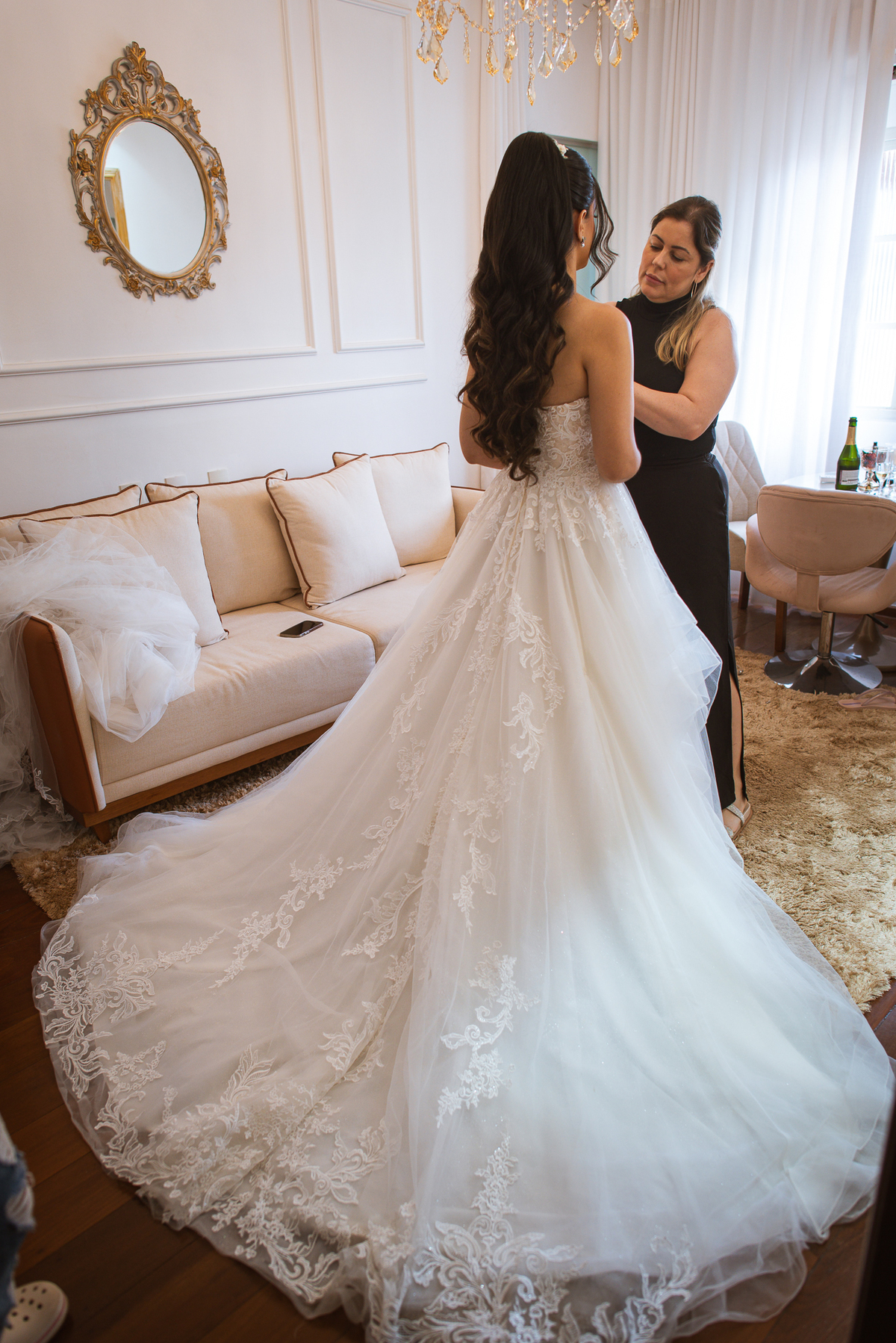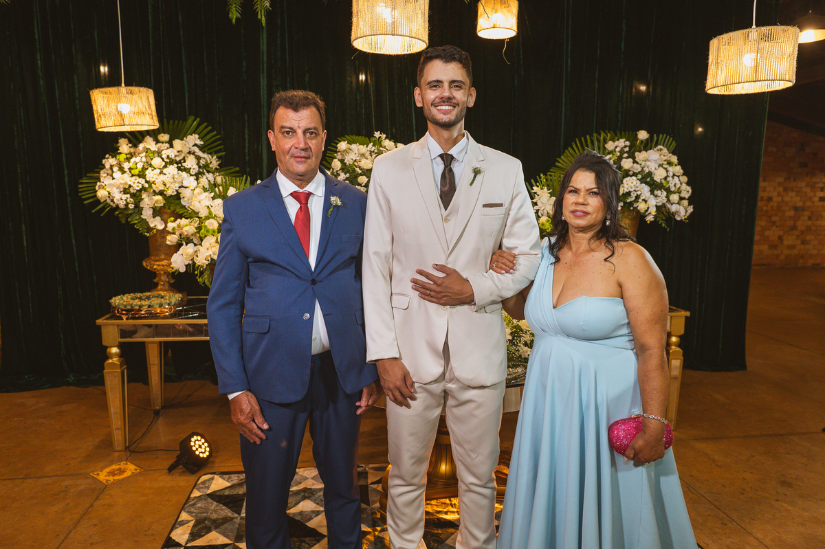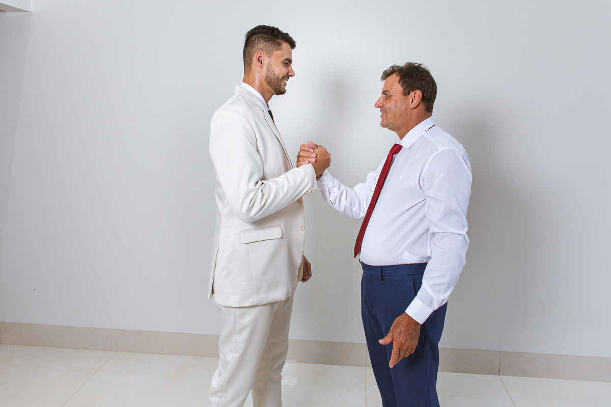Nathan começou a se preparar bem cedo também. Foi ao seu barbeiro de confiança para dar aquele charme no visual e depois foi para casa com seu pai e seu sogro para colocarem seus respectivos ternos. Do salão, foram direto para lá. Ele contou com a ajuda do pai e também ajudou seu sogro a se vestir, colocando o blazer. Juntamos os três e fizemos as fotografias do making of. Logo Nathan estava pronto e aguardando o momento de ir para o local do casamento. Enquanto isso, Rosiane finalizava a produção. Fizemos o brinde dela com a mãe e sogra, e logo estava na hora de se vestir. O vestido foi ajustado e ficou impecável em seu corpo.