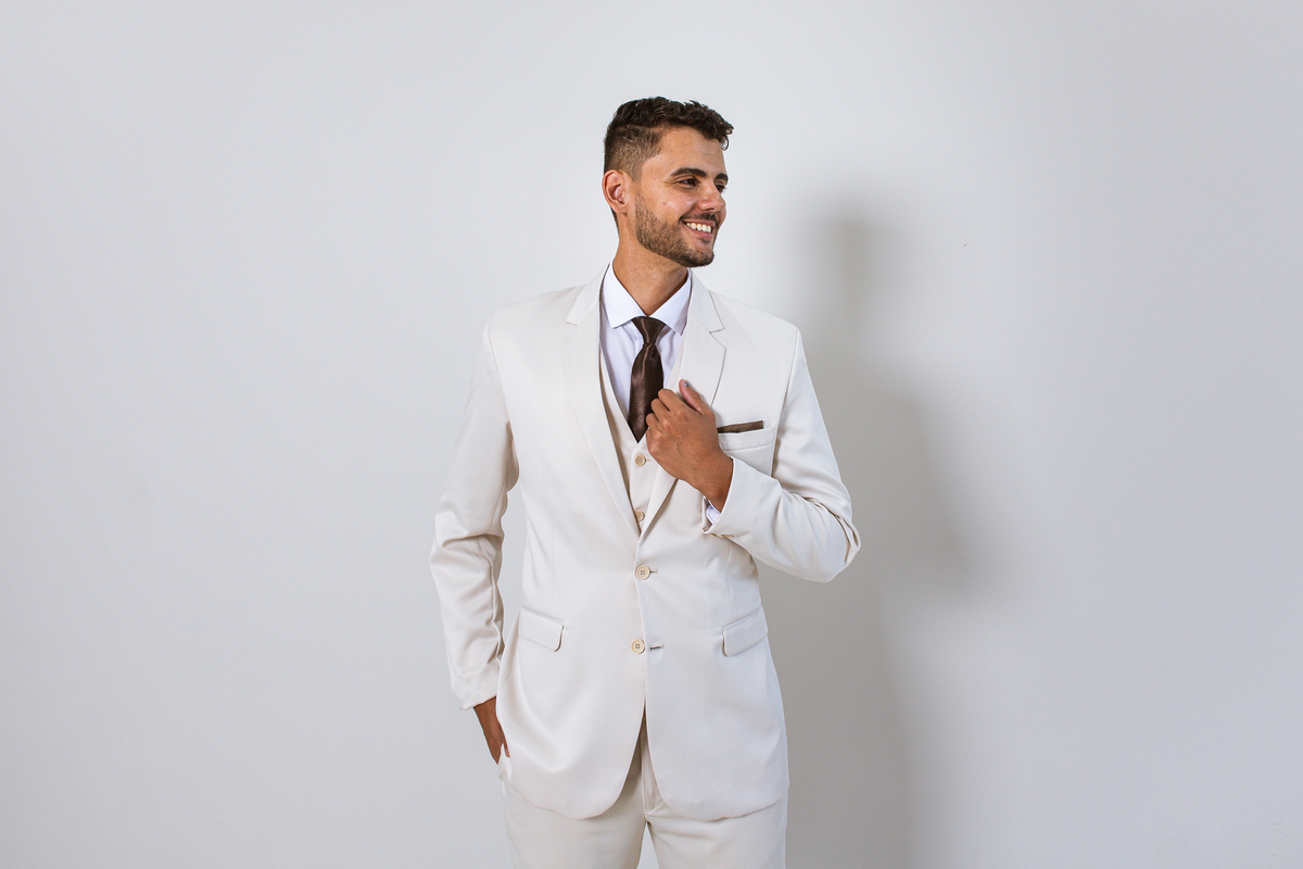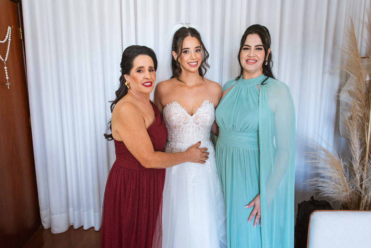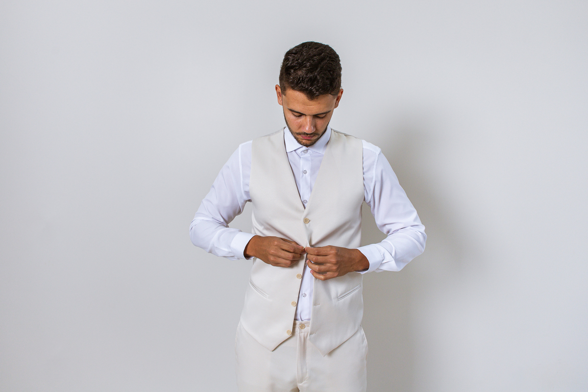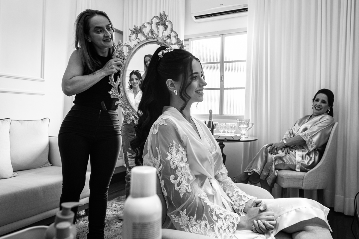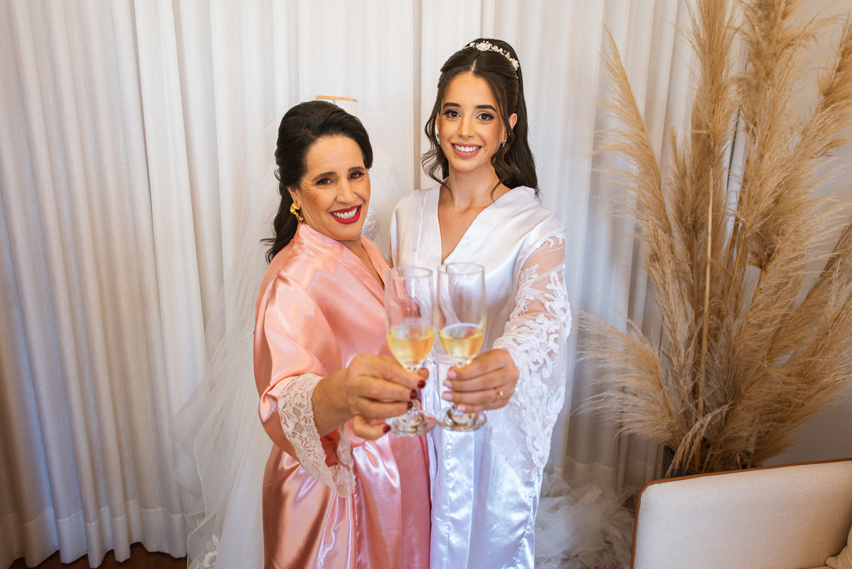 Nathan começou a se preparar bem cedo também. Foi ao seu barbeiro de confiança para dar aquele charme no visual e depois foi para casa com seu pai e seu sogro para colocarem seus respectivos ternos. Do salão, foram direto para lá. Ele contou com a ajuda do pai e também ajudou seu sogro a se vestir, colocando o blazer. Juntamos os três e fizemos as fotografias do making of. Logo Nathan estava pronto e aguardando o momento de ir para o local do casamento. Enquanto isso, Rosiane finalizava a produção. Fizemos o brinde dela com a mãe e sogra, e logo estava na hora de se vestir. O vestido foi ajustado e ficou impecável em seu corpo.