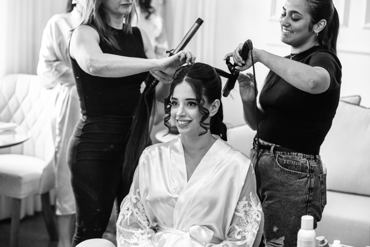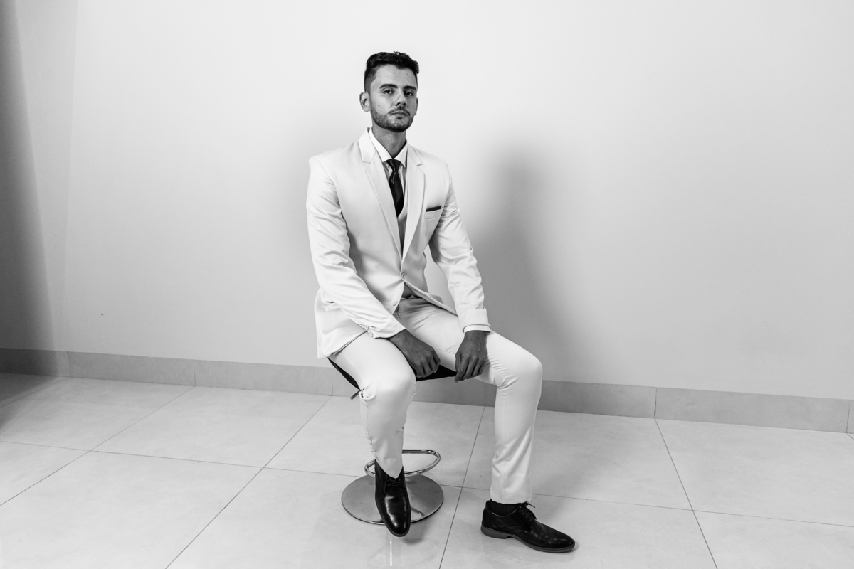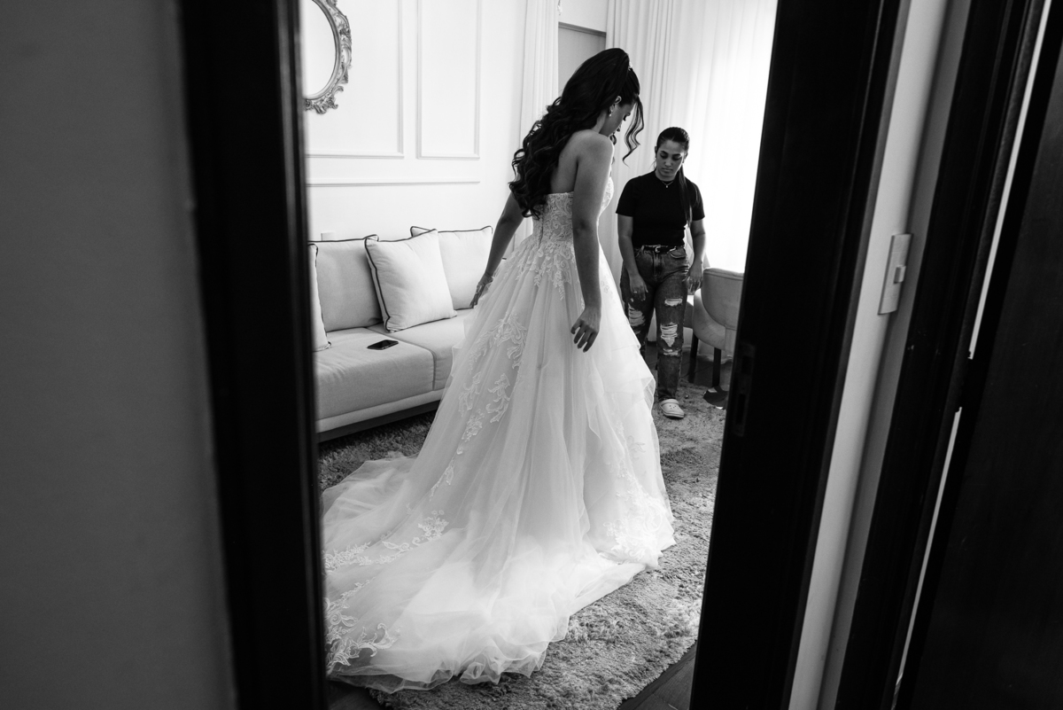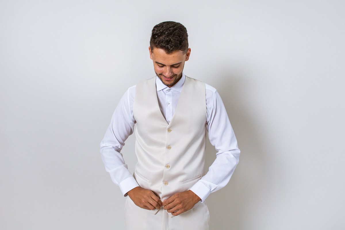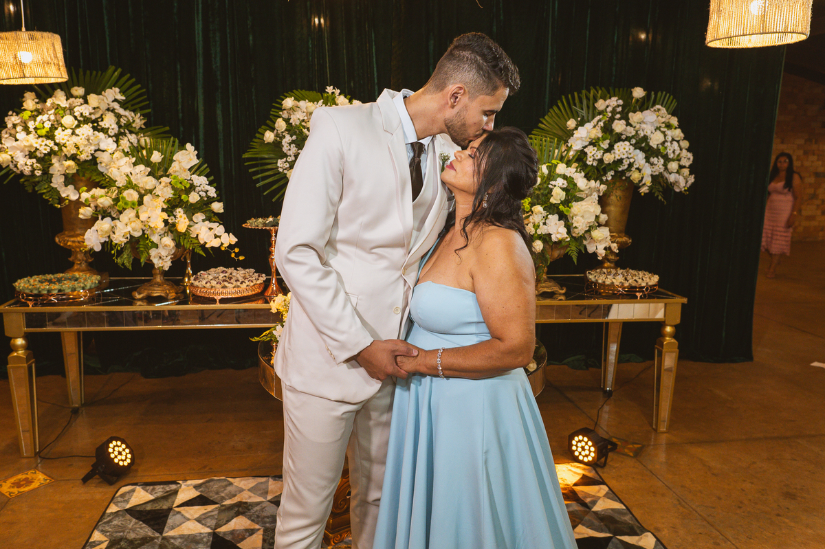 Nathan começou a se preparar bem cedo também. Foi ao seu barbeiro de confiança para dar aquele charme no visual e depois foi para casa com seu pai e seu sogro para colocarem seus respectivos ternos. Do salão, foram direto para lá. Ele contou com a ajuda do pai e também ajudou seu sogro a se vestir, colocando o blazer. Juntamos os três e fizemos as fotografias do making of. Logo Nathan estava pronto e aguardando o momento de ir para o local do casamento. Enquanto isso, Rosiane finalizava a produção. Fizemos o brinde dela com a mãe e sogra, e logo estava na hora de se vestir. O vestido foi ajustado e ficou impecável em seu corpo.