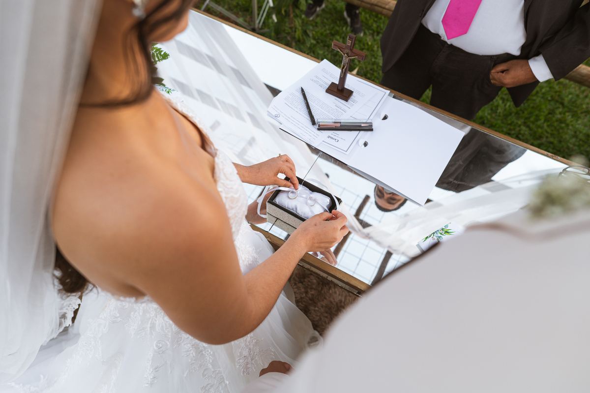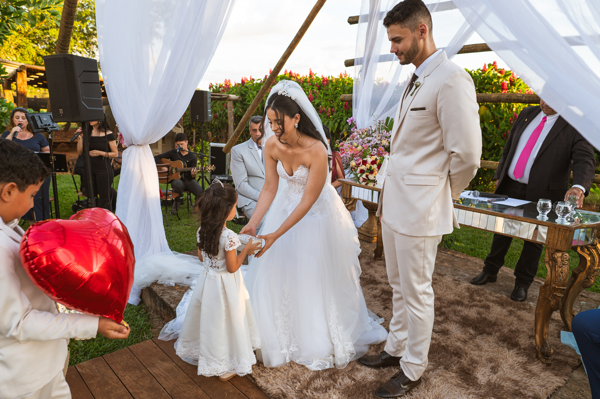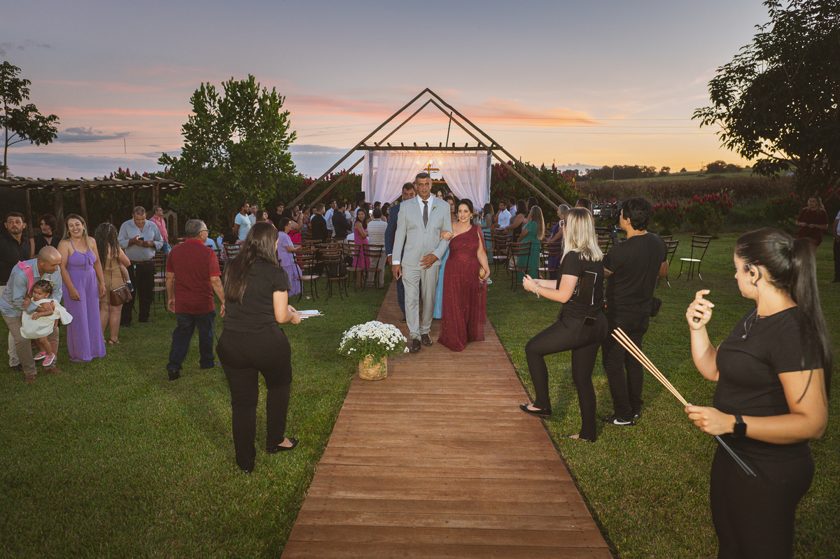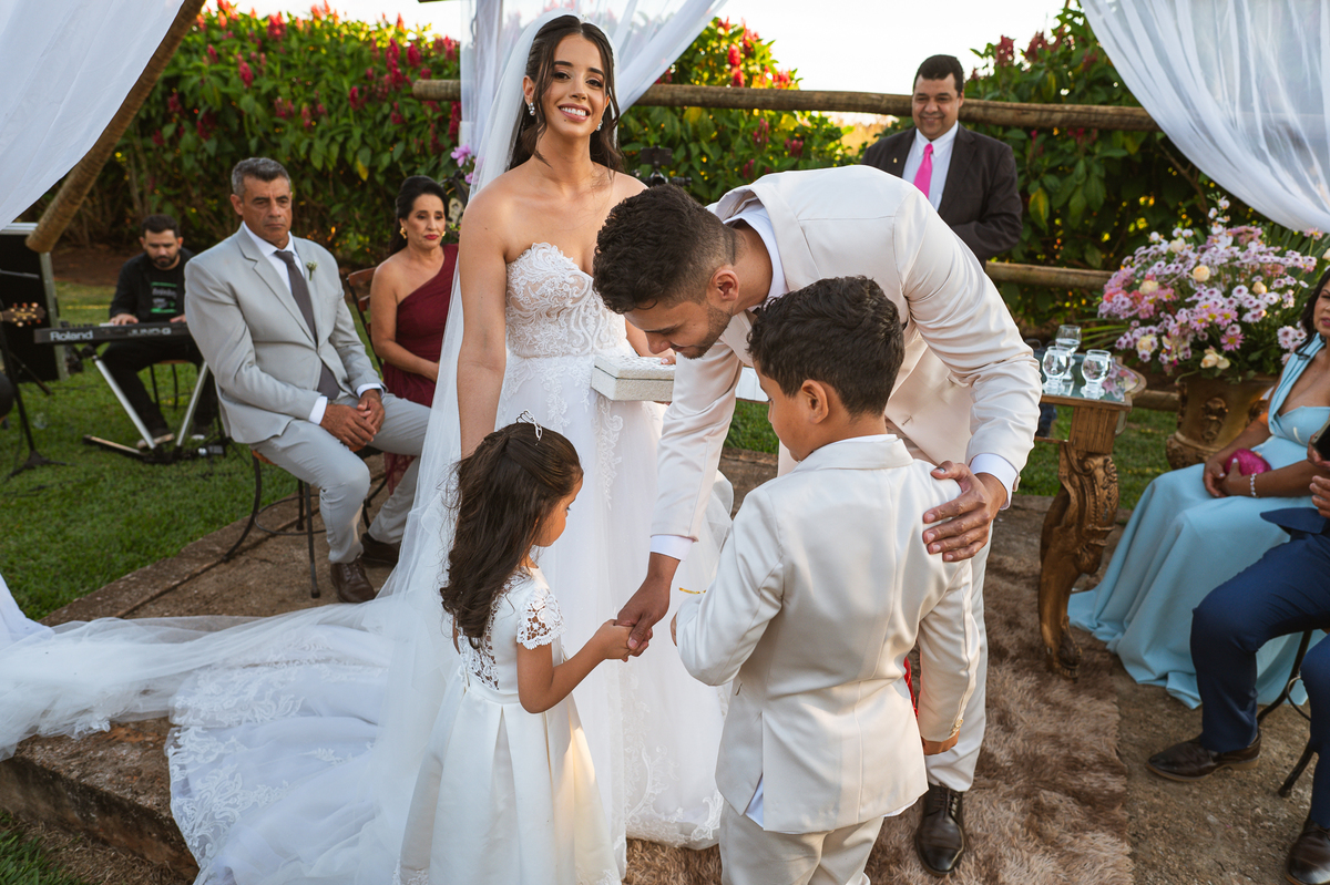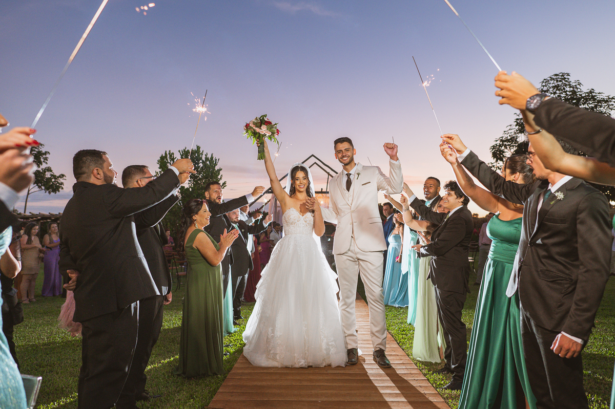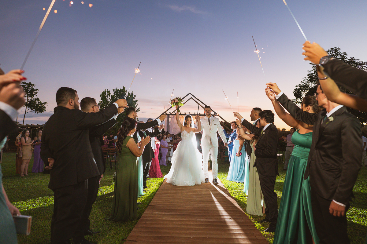 O celebrante convidou as alianças para serem recebidas, através dos pajens que as trouxeram com todo carinho. Abraçaram seus titios e entregaram com segurança nas mãos deles. Os noivos trocaram suas alianças e selaram aquele momento com um beijo em cada uma delas. Por fim, eles fizeram suas orações e receberam a bênção sobre seu casamento, seus futuros filhos e sobre toda sua família. A celebração foi encerrada e fizemos nossas fotos protocolares. O sol ia se pondo vagarosamente ao fundo, deixando um céu de cores inexplicáveis. Terminamos as fotos e era hora da saída dos noivos. Os padrinhos formaram uma grande fila e com seus Sparkles acesos aguardavam os noivos que logo vieram e fecharam aquele momento com um beijo de cinema, sob fortes aplausos.