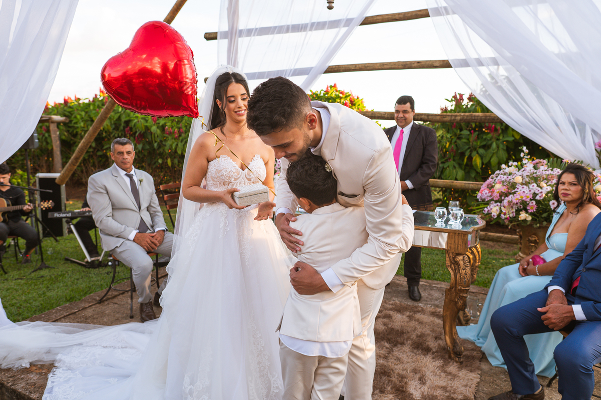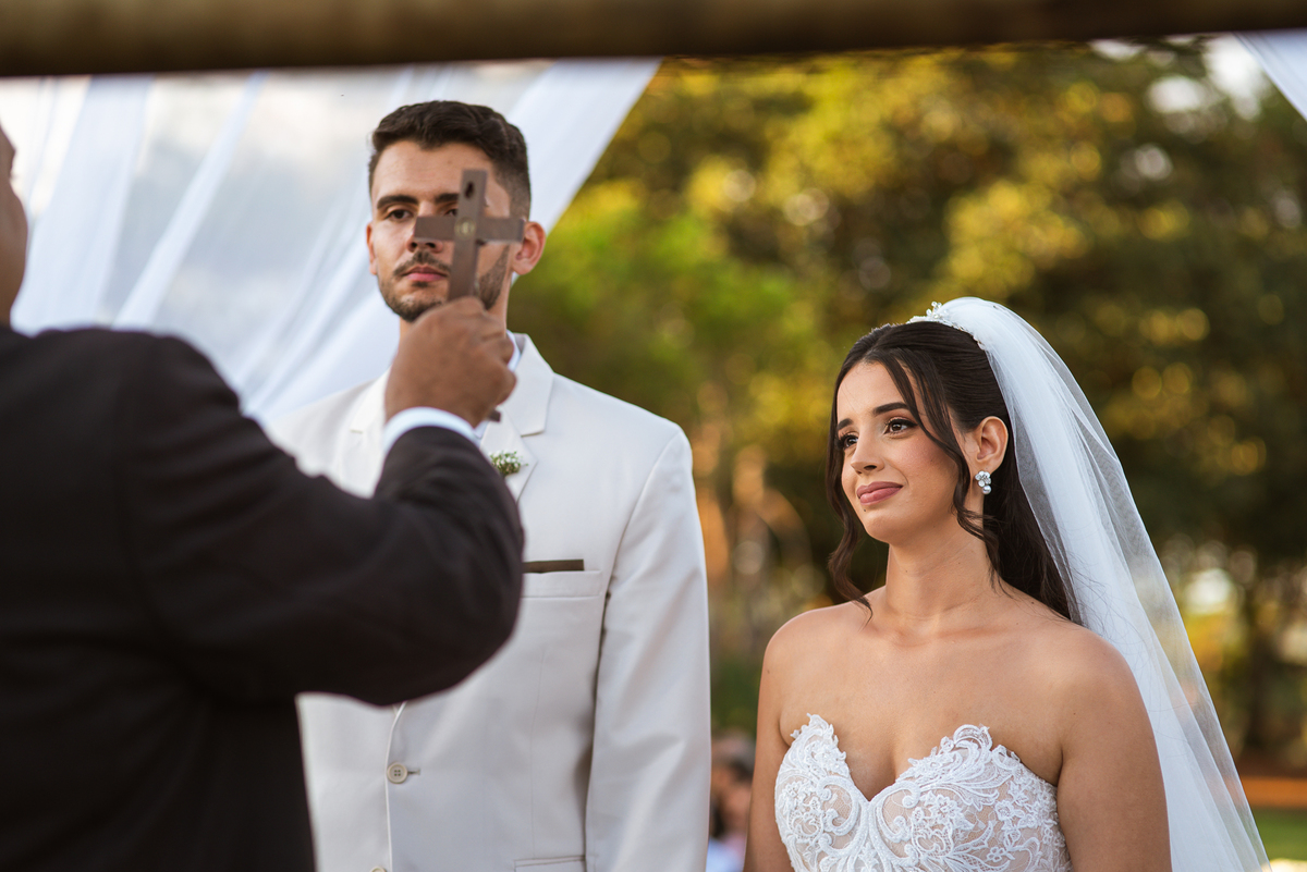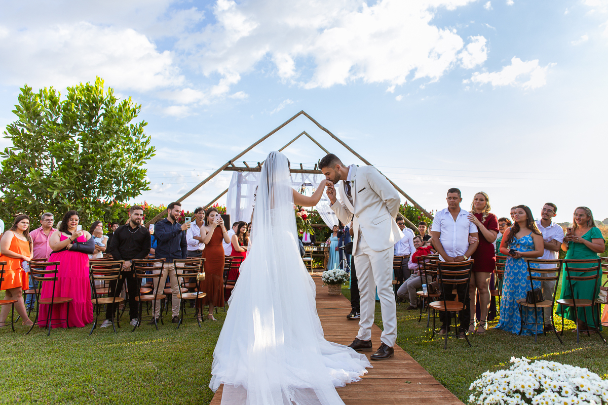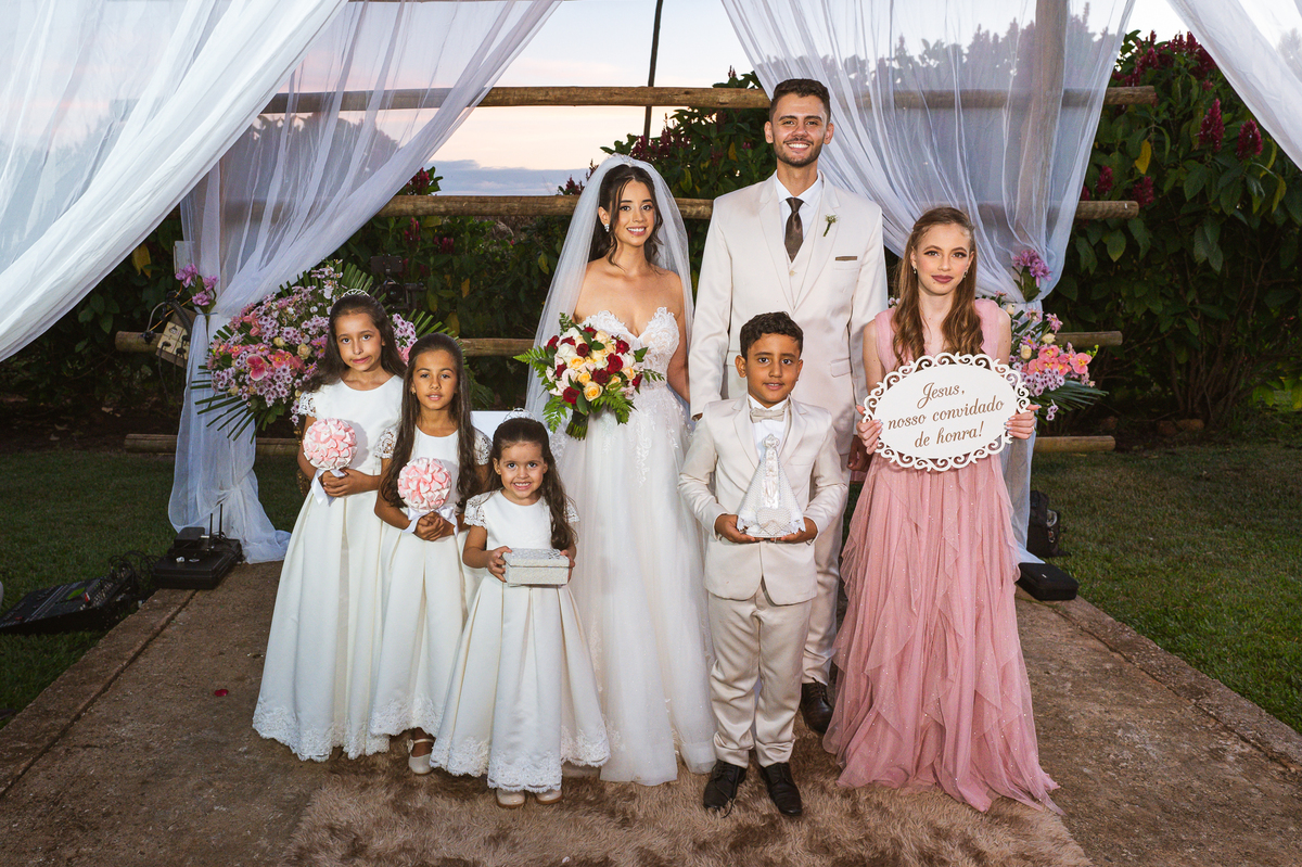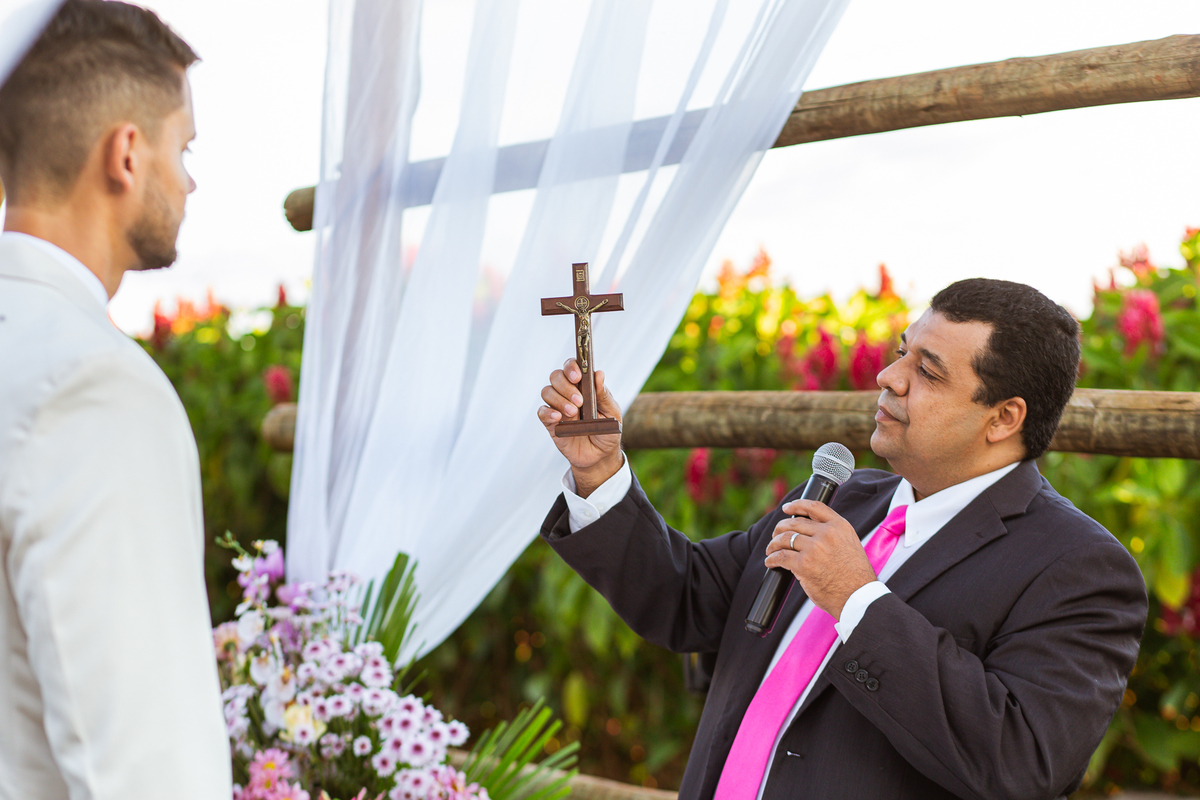 O celebrante convidou as alianças para serem recebidas, através dos pajens que as trouxeram com todo carinho. Abraçaram seus titios e entregaram com segurança nas mãos deles. Os noivos trocaram suas alianças e selaram aquele momento com um beijo em cada uma delas. Por fim, eles fizeram suas orações e receberam a bênção sobre seu casamento, seus futuros filhos e sobre toda sua família. A celebração foi encerrada e fizemos nossas fotos protocolares. O sol ia se pondo vagarosamente ao fundo, deixando um céu de cores inexplicáveis. Terminamos as fotos e era hora da saída dos noivos. Os padrinhos formaram uma grande fila e com seus Sparkles acesos aguardavam os noivos que logo vieram e fecharam aquele momento com um beijo de cinema, sob fortes aplausos.
