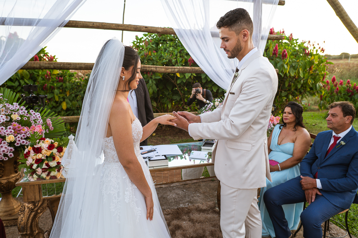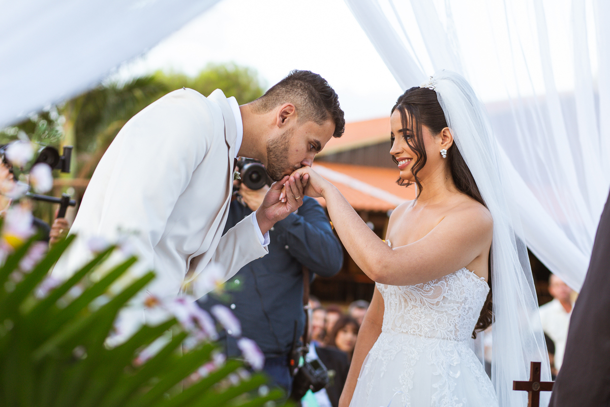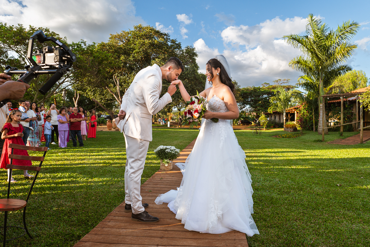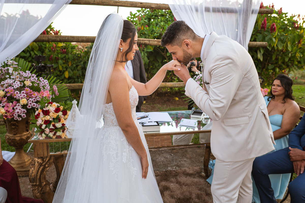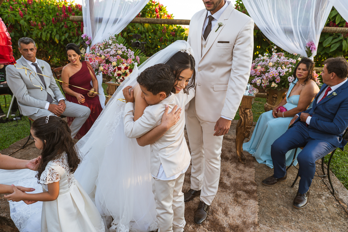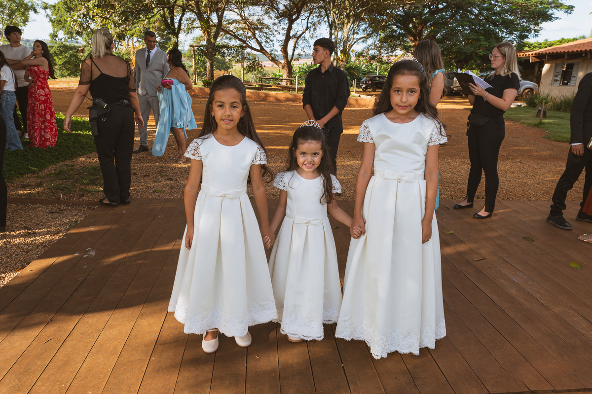 O celebrante convidou as alianças para serem recebidas, através dos pajens que as trouxeram com todo carinho. Abraçaram seus titios e entregaram com segurança nas mãos deles. Os noivos trocaram suas alianças e selaram aquele momento com um beijo em cada uma delas. Por fim, eles fizeram suas orações e receberam a bênção sobre seu casamento, seus futuros filhos e sobre toda sua família. A celebração foi encerrada e fizemos nossas fotos protocolares. O sol ia se pondo vagarosamente ao fundo, deixando um céu de cores inexplicáveis. Terminamos as fotos e era hora da saída dos noivos. Os padrinhos formaram uma grande fila e com seus Sparkles acesos aguardavam os noivos que logo vieram e fecharam aquele momento com um beijo de cinema, sob fortes aplausos.