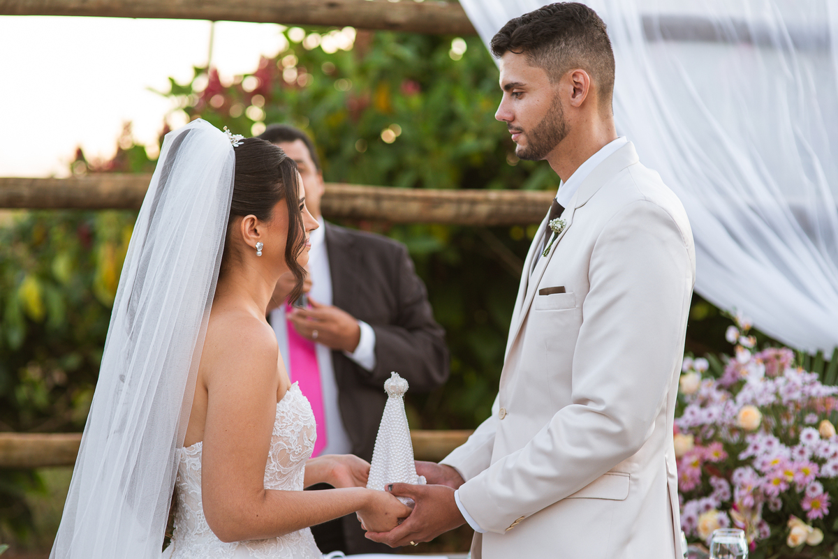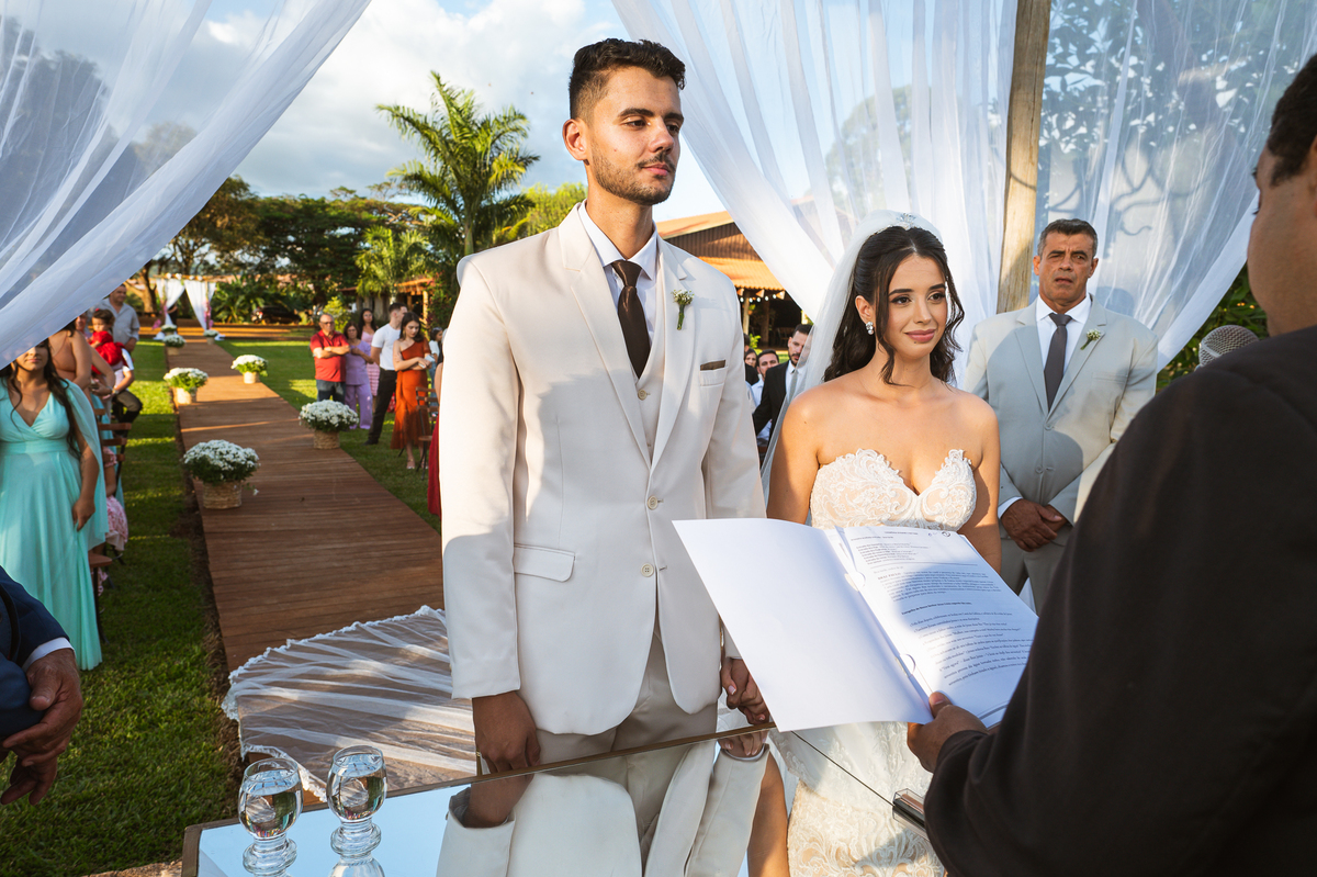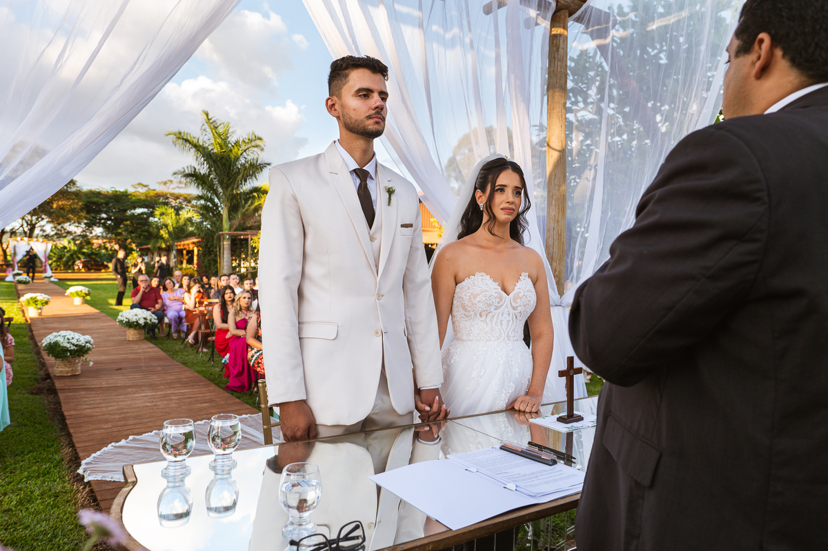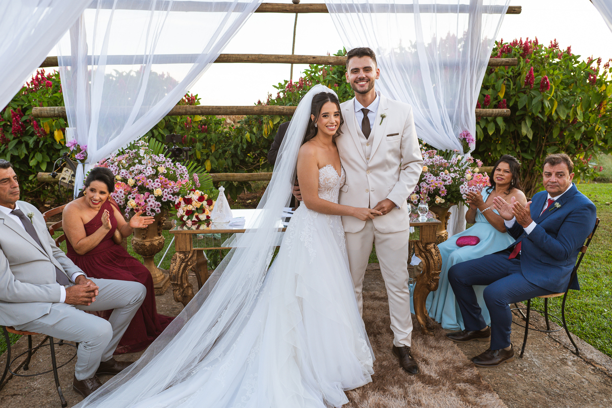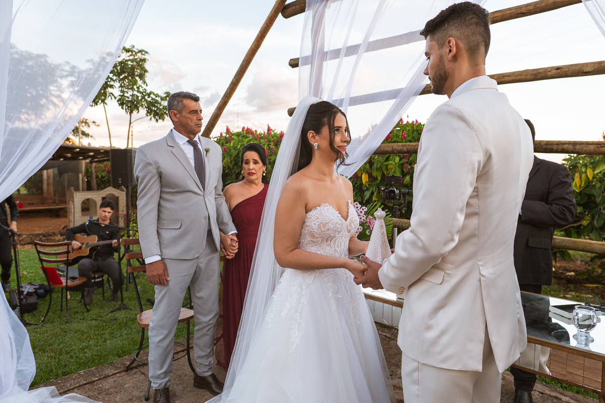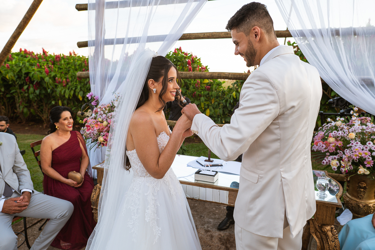 O celebrante convidou as alianças para serem recebidas, através dos pajens que as trouxeram com todo carinho. Abraçaram seus titios e entregaram com segurança nas mãos deles. Os noivos trocaram suas alianças e selaram aquele momento com um beijo em cada uma delas. Por fim, eles fizeram suas orações e receberam a bênção sobre seu casamento, seus futuros filhos e sobre toda sua família. A celebração foi encerrada e fizemos nossas fotos protocolares. O sol ia se pondo vagarosamente ao fundo, deixando um céu de cores inexplicáveis. Terminamos as fotos e era hora da saída dos noivos. Os padrinhos formaram uma grande fila e com seus Sparkles acesos aguardavam os noivos que logo vieram e fecharam aquele momento com um beijo de cinema, sob fortes aplausos.