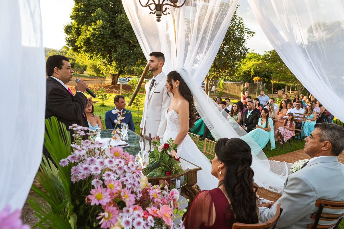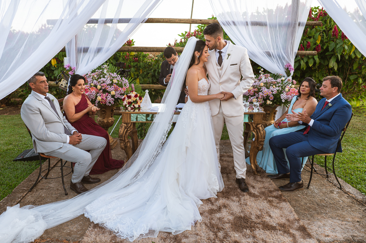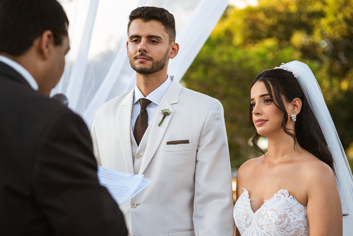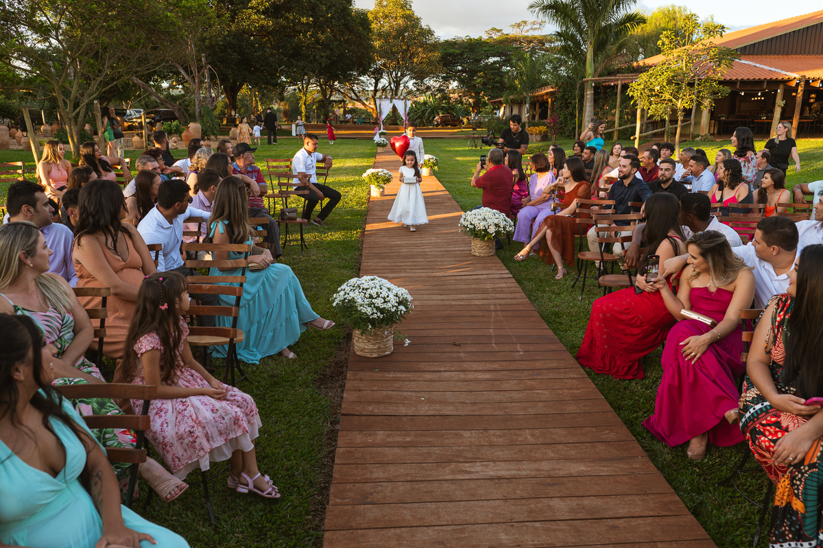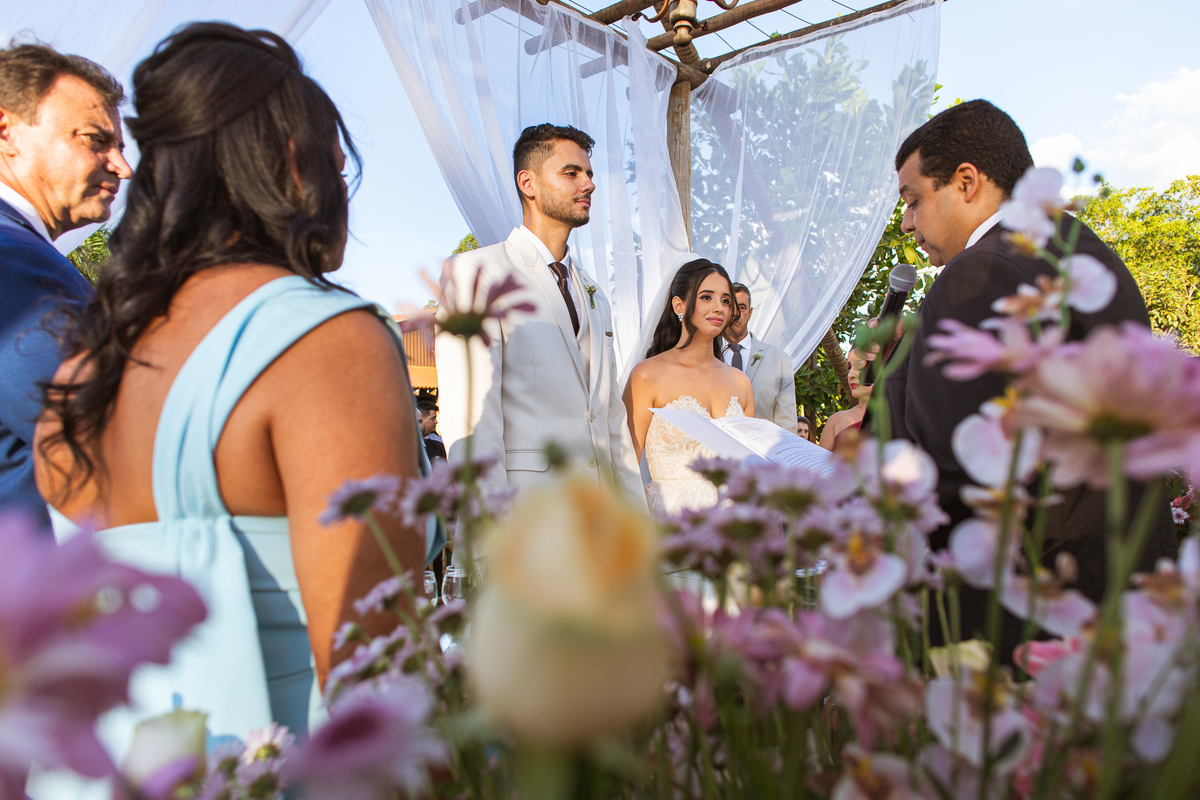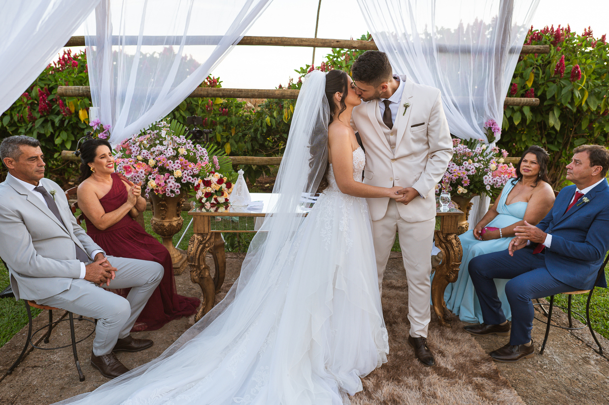 O celebrante convidou as alianças para serem recebidas, através dos pajens que as trouxeram com todo carinho. Abraçaram seus titios e entregaram com segurança nas mãos deles. Os noivos trocaram suas alianças e selaram aquele momento com um beijo em cada uma delas. Por fim, eles fizeram suas orações e receberam a bênção sobre seu casamento, seus futuros filhos e sobre toda sua família. A celebração foi encerrada e fizemos nossas fotos protocolares. O sol ia se pondo vagarosamente ao fundo, deixando um céu de cores inexplicáveis. Terminamos as fotos e era hora da saída dos noivos. Os padrinhos formaram uma grande fila e com seus Sparkles acesos aguardavam os noivos que logo vieram e fecharam aquele momento com um beijo de cinema, sob fortes aplausos.