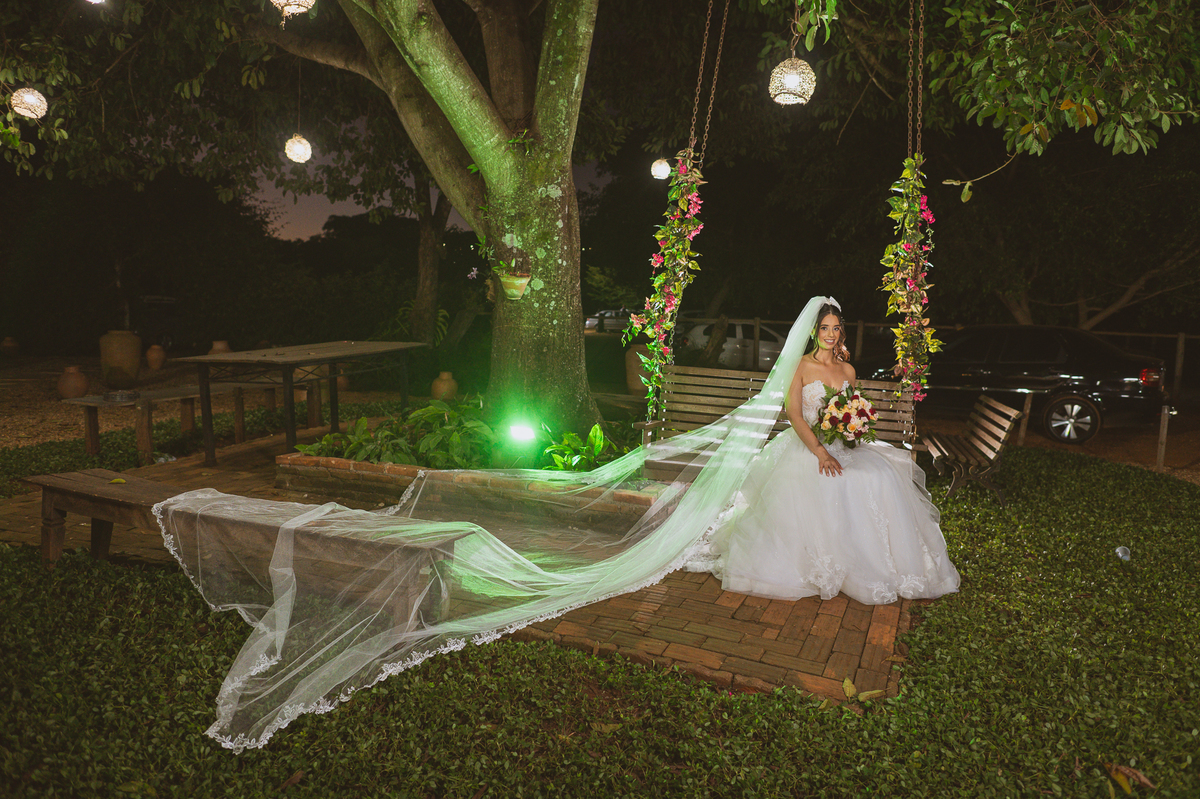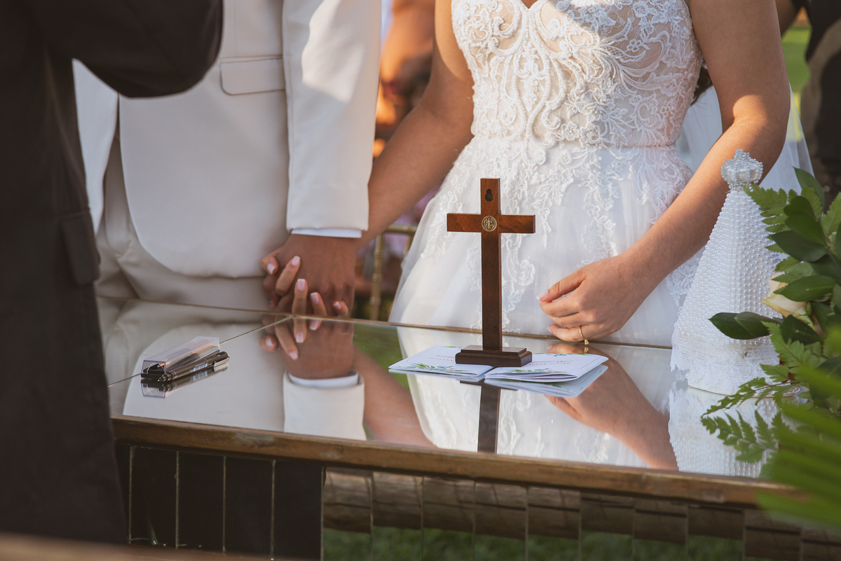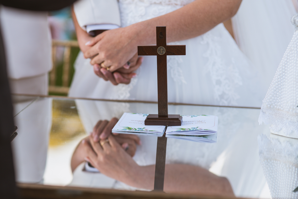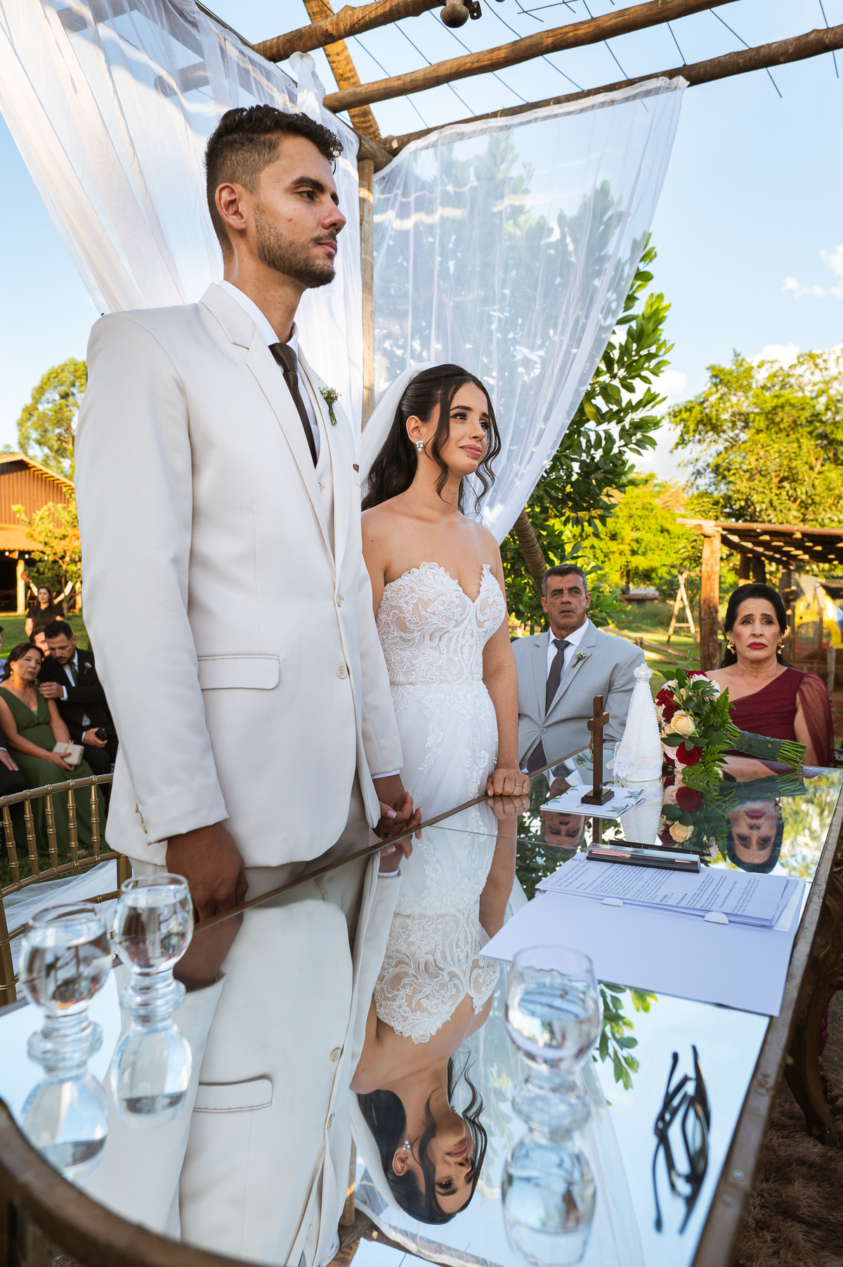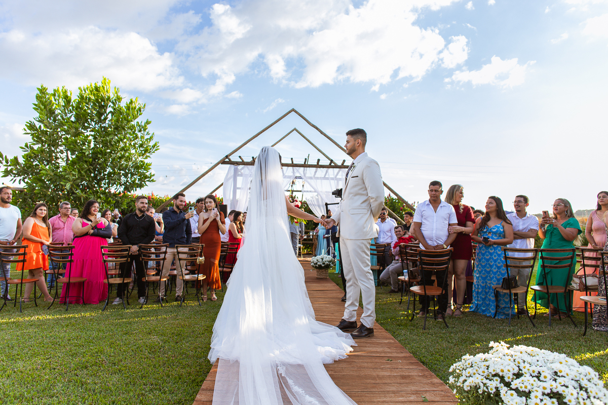 O celebrante convidou as alianças para serem recebidas, através dos pajens que as trouxeram com todo carinho. Abraçaram seus titios e entregaram com segurança nas mãos deles. Os noivos trocaram suas alianças e selaram aquele momento com um beijo em cada uma delas. Por fim, eles fizeram suas orações e receberam a bênção sobre seu casamento, seus futuros filhos e sobre toda sua família. A celebração foi encerrada e fizemos nossas fotos protocolares. O sol ia se pondo vagarosamente ao fundo, deixando um céu de cores inexplicáveis. Terminamos as fotos e era hora da saída dos noivos. Os padrinhos formaram uma grande fila e com seus Sparkles acesos aguardavam os noivos que logo vieram e fecharam aquele momento com um beijo de cinema, sob fortes aplausos.