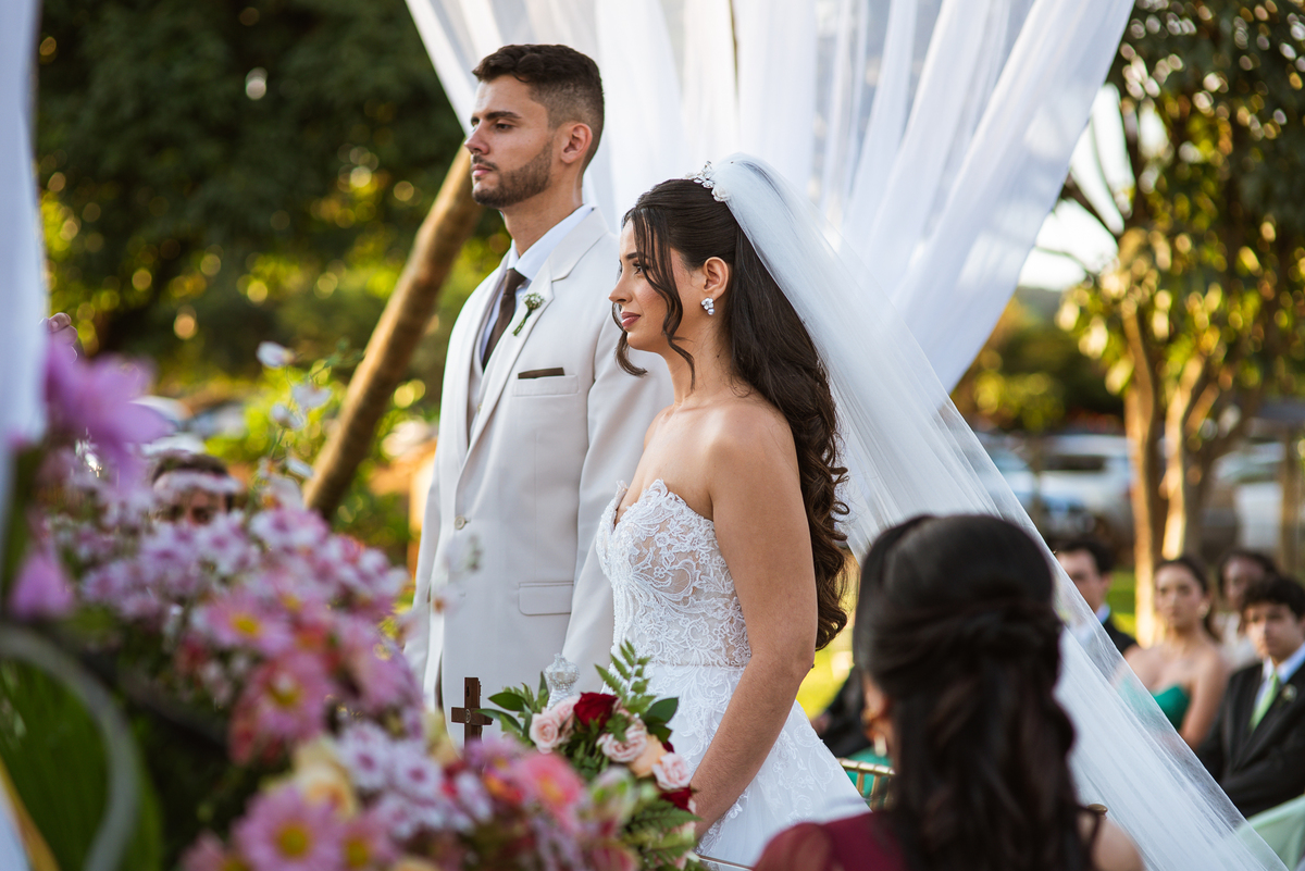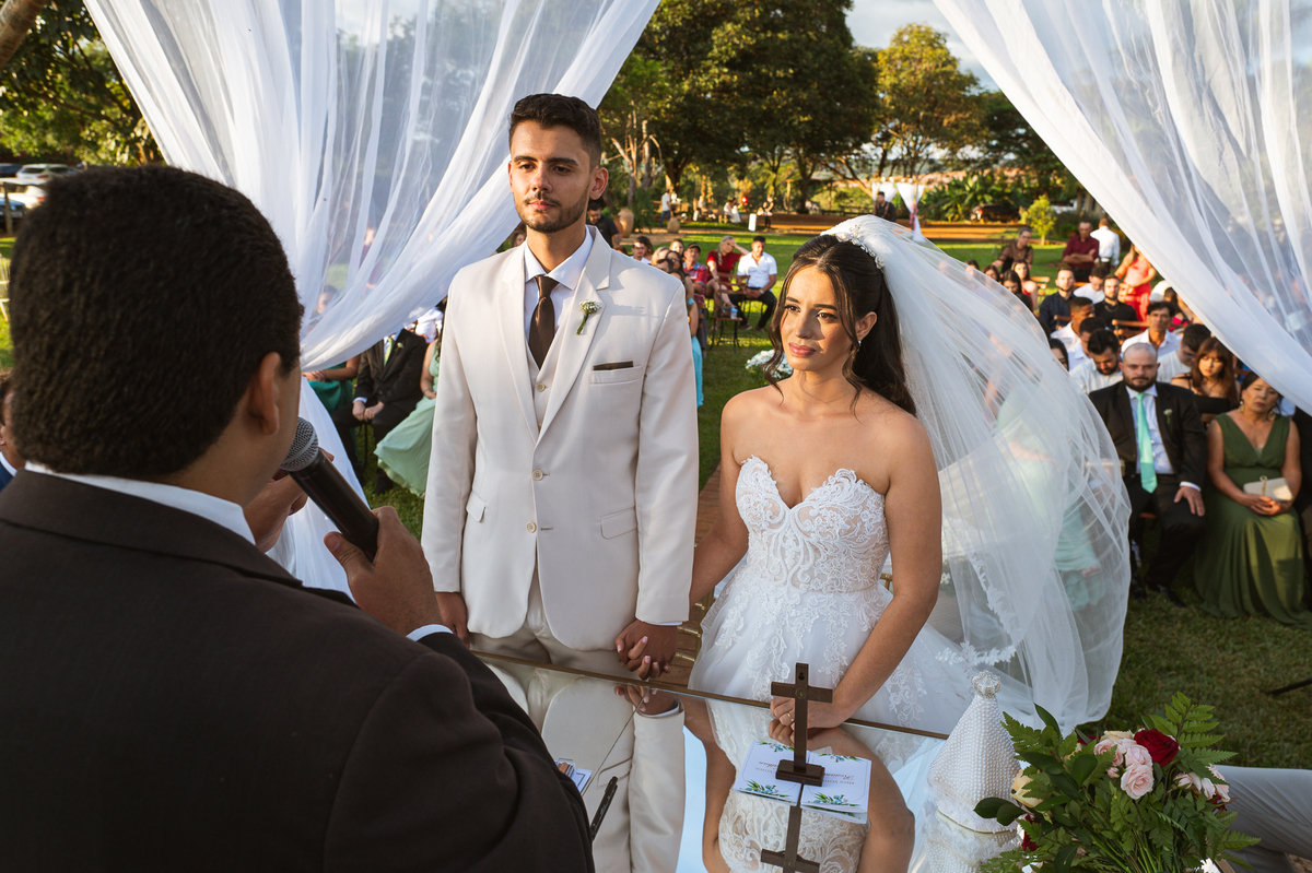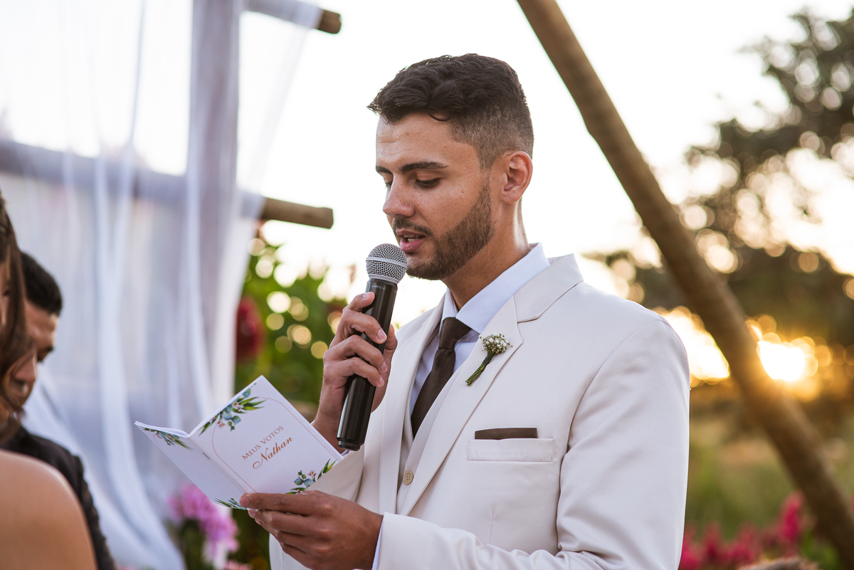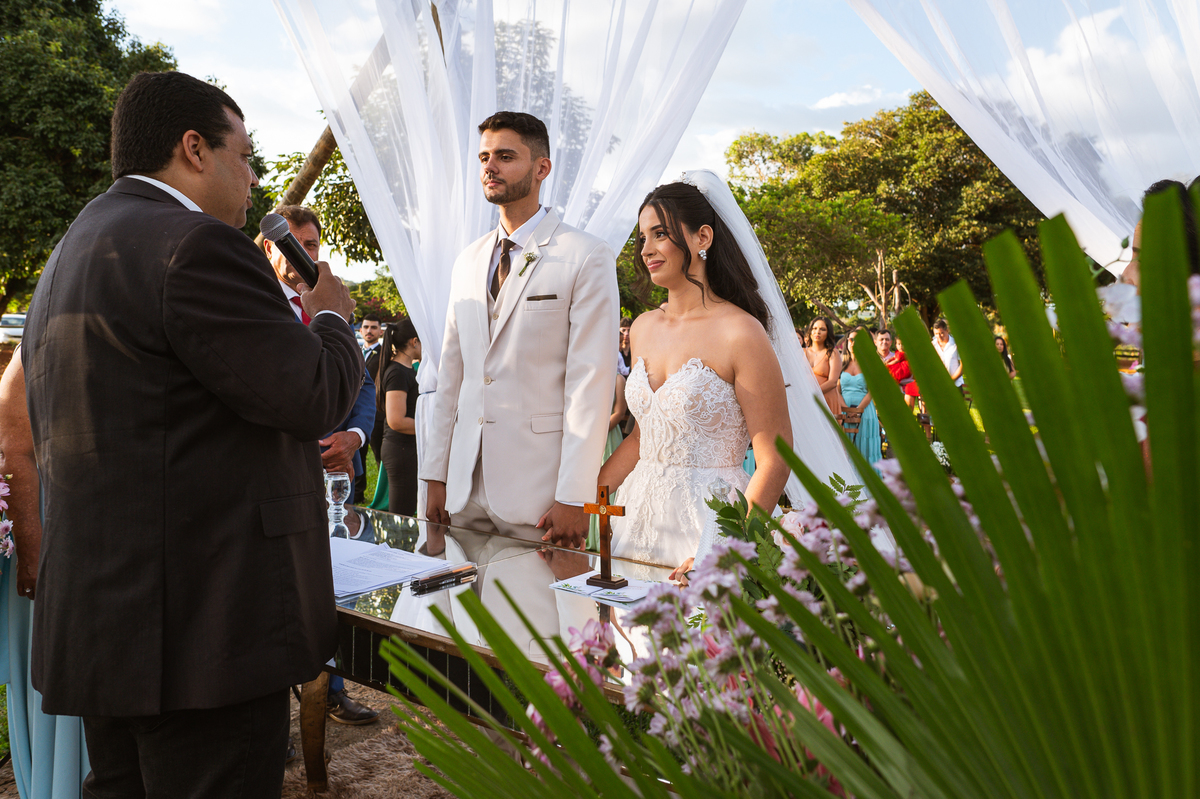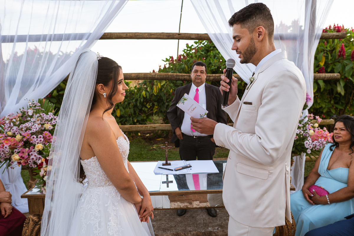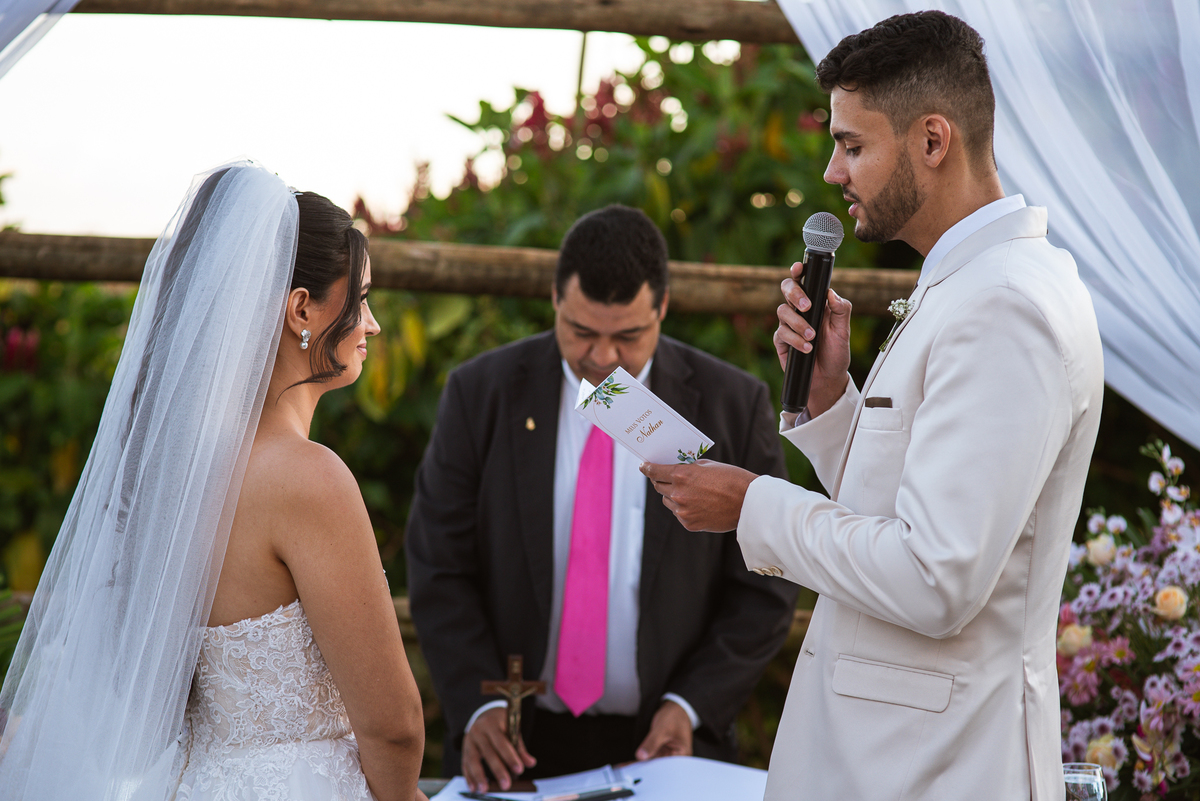 Agora, os dois estavam frente a frente, como noivos pela última vez. Os olhares se cruzaram e o sorriso veio de imediato. Nathan tentava conciliar a ansiedade com as instruções que recebeu para se posicionar. Ele beijou a mão de sua noiva, logo depois beijou também sua testa em forma de respeito. Foram segundos intermináveis. Parecia que o tempo havia parado. Depois, caminharam juntos rumo ao altar para receber a bênção. O celebrante Braz Paulo os recebeu carinhosamente e ministrou uma palavra inesquecível para os noivos e os presentes. Ele os convidou a fazer a troca de votos um para o outro e a emoção foi completa. Rosiane se declarou, gastou todos os adjetivos para enaltecer seu amado noivo. Nathan também fez bonito, e trouxe votos maravilhosos que emocionaram até mesmo seus pais.