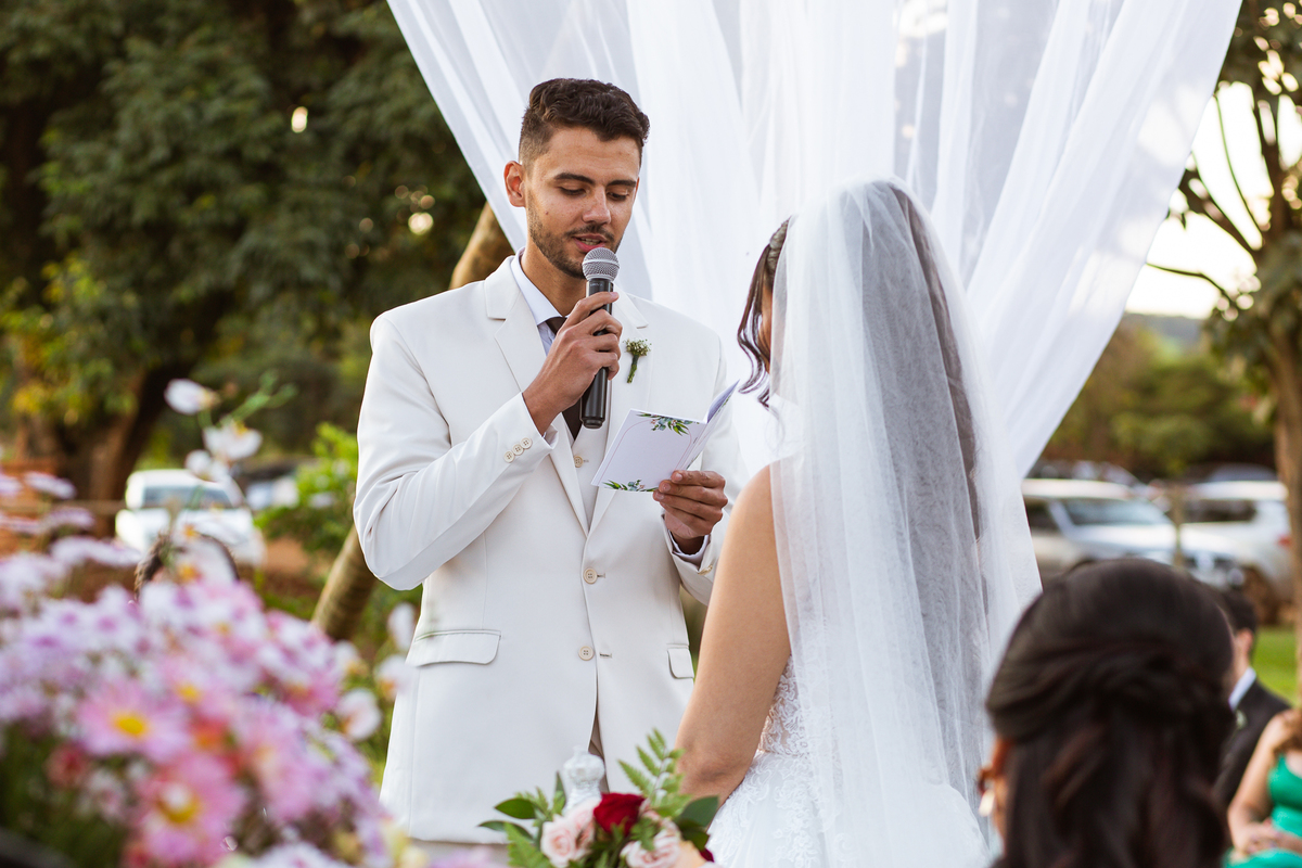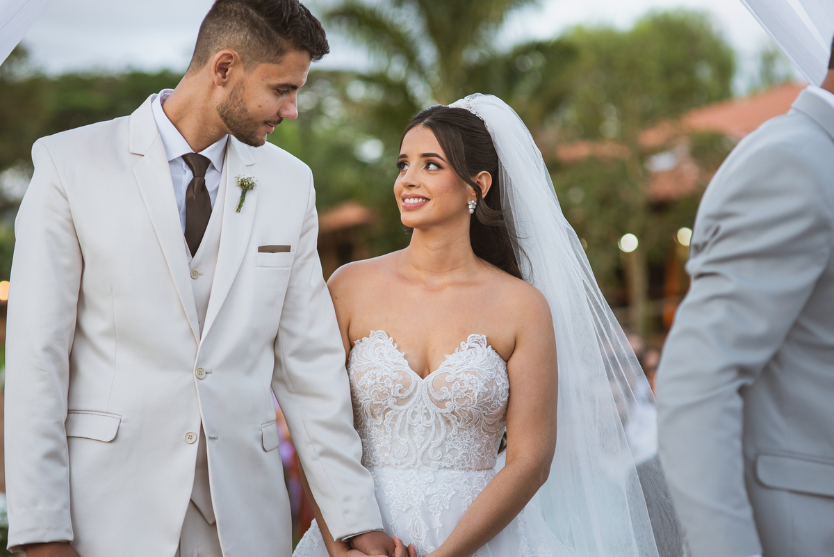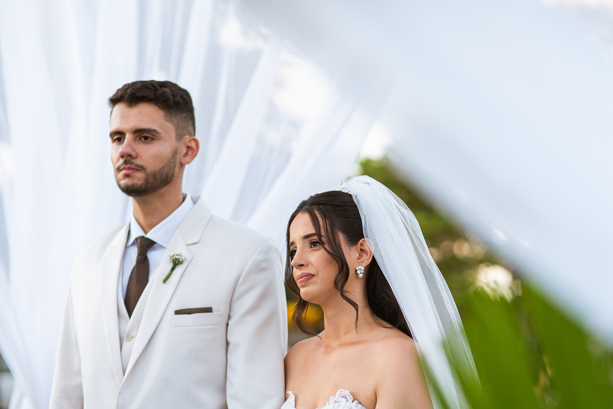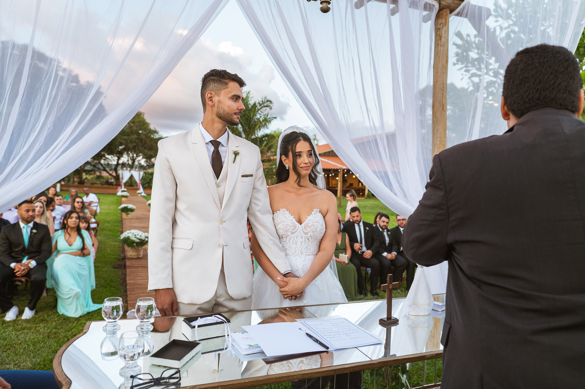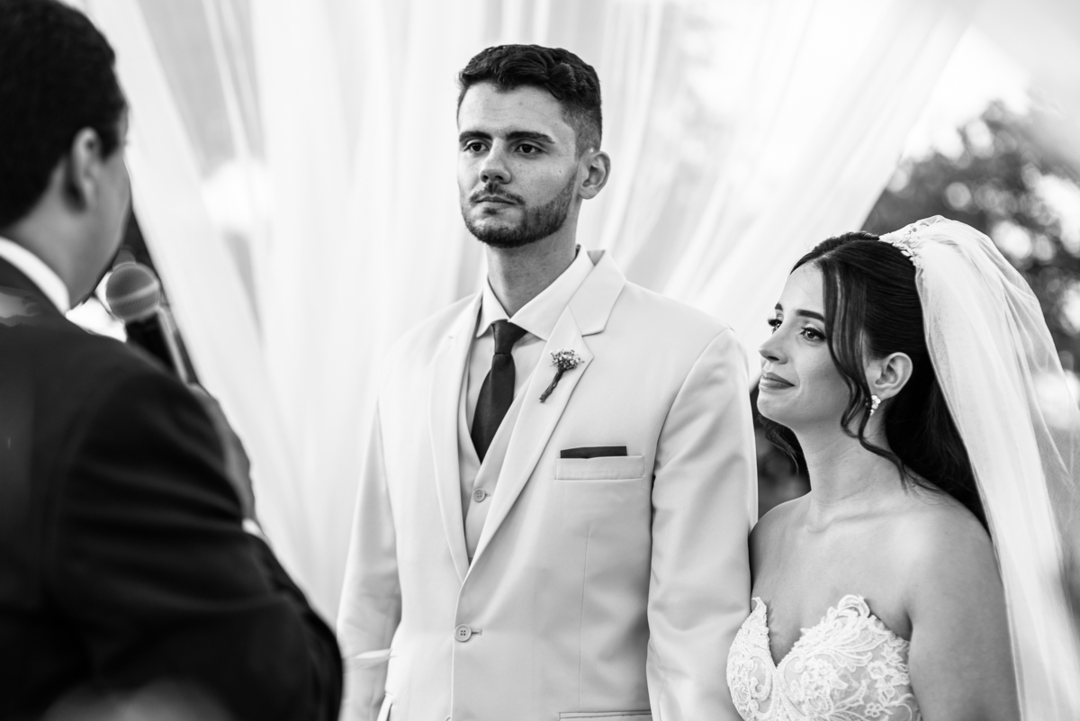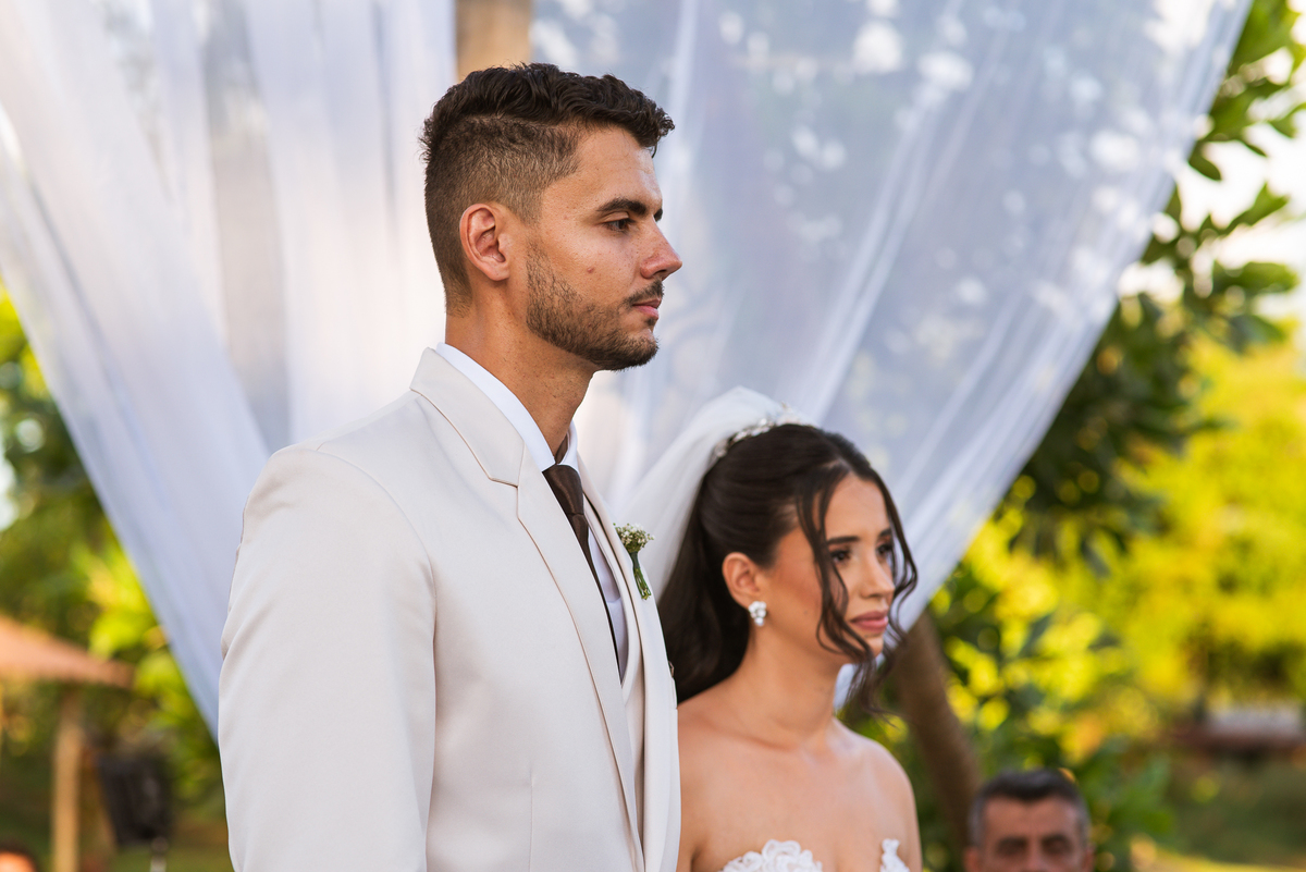 Agora, os dois estavam frente a frente, como noivos pela última vez. Os olhares se cruzaram e o sorriso veio de imediato. Nathan tentava conciliar a ansiedade com as instruções que recebeu para se posicionar. Ele beijou a mão de sua noiva, logo depois beijou também sua testa em forma de respeito. Foram segundos intermináveis. Parecia que o tempo havia parado. Depois, caminharam juntos rumo ao altar para receber a bênção. O celebrante Braz Paulo os recebeu carinhosamente e ministrou uma palavra inesquecível para os noivos e os presentes. Ele os convidou a fazer a troca de votos um para o outro e a emoção foi completa. Rosiane se declarou, gastou todos os adjetivos para enaltecer seu amado noivo. Nathan também fez bonito, e trouxe votos maravilhosos que emocionaram até mesmo seus pais.