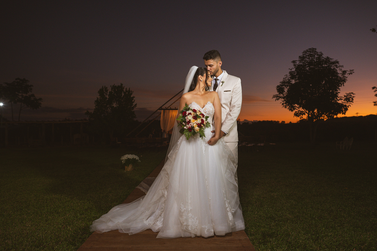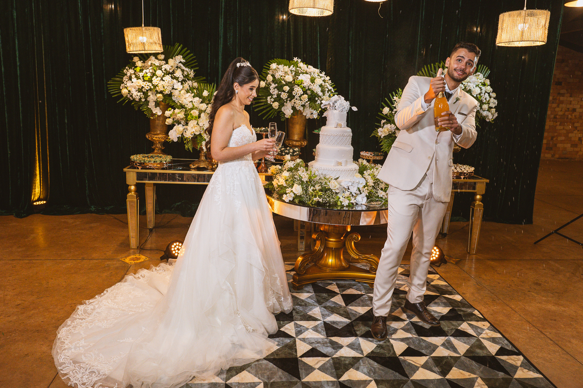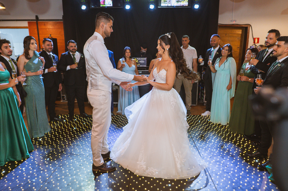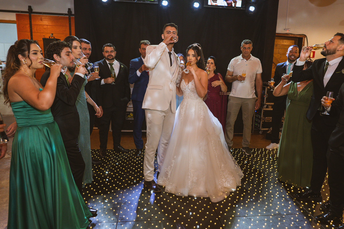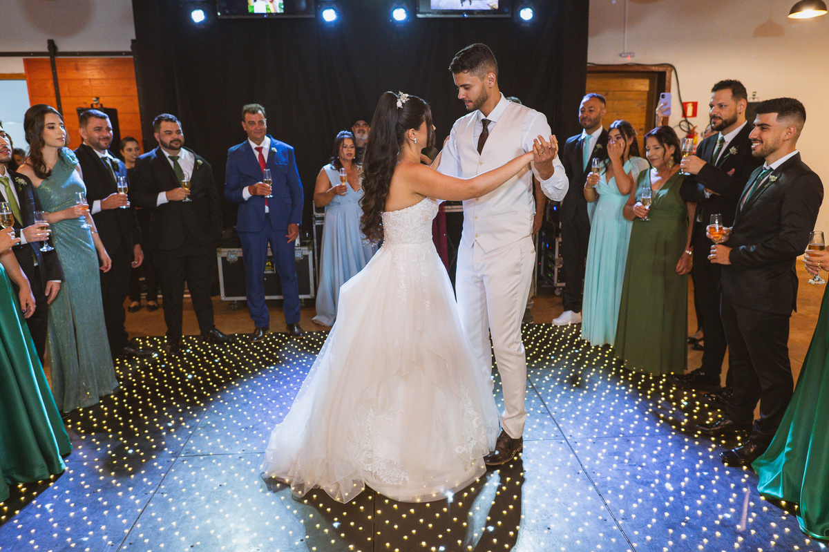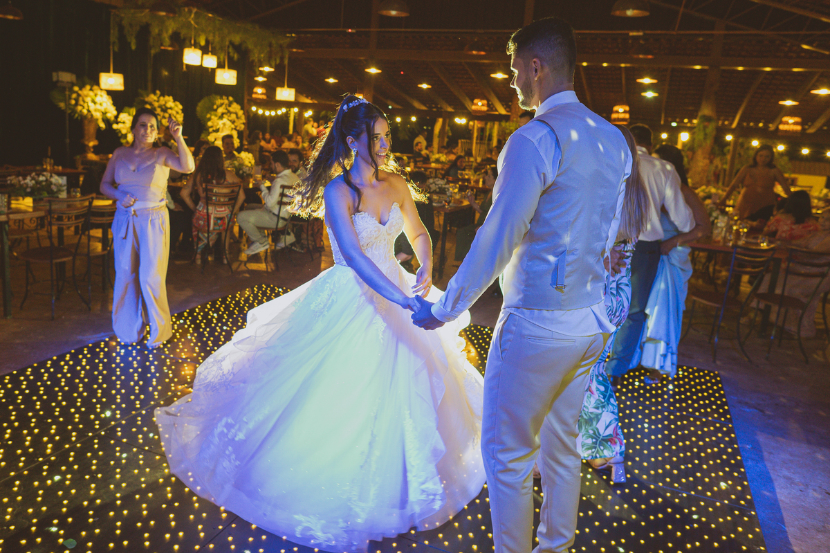 No intervalo, fizemos nosso tradicional mini ensaio dos noivos, aproveitando aquele pôr-do-sol incrível ao fundo. As luzes do altar também ajudaram a compor a cena final. Depois do ensaio, os noivos foram anunciados para entrar na pista de dança. Com muita festa, eles foram recebidos pelos convidados e pelos padrinhos, que já os aguardavam na pista de dança. Eles fizeram um brinde com todos os padrinhos e logo depois fizeram a sua primeira dança de casados. E foi um show à parte! Rodopios, levantamento de noiva, beijo e tudo que vocês imaginarem eles prepararam. Fizemos também o corte do bolo e o brinde em frente a mesa. Quando o espumante estourou, adivinhem quem foi o sortudo a levar uma rolhada na testa? Sim, eu. Mas por muita sorte, a rolha saiu fraca e praticamente brindou com a minha cabeça.