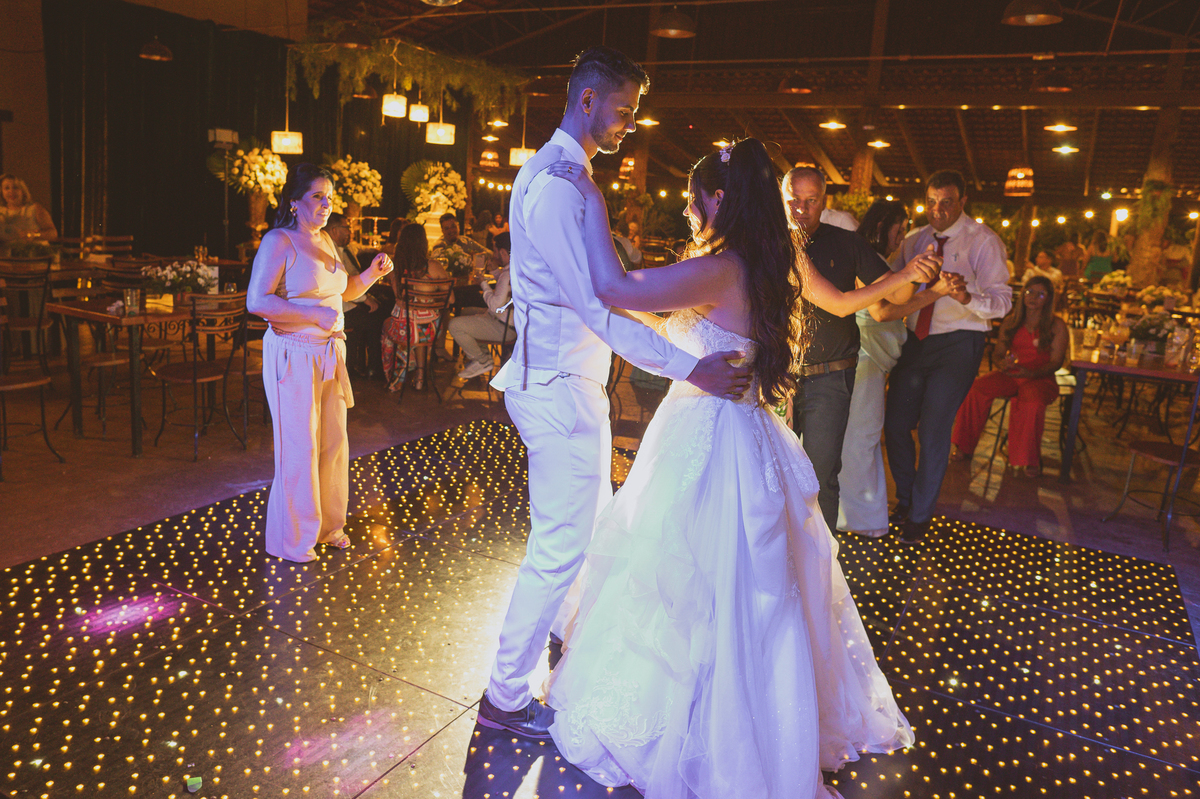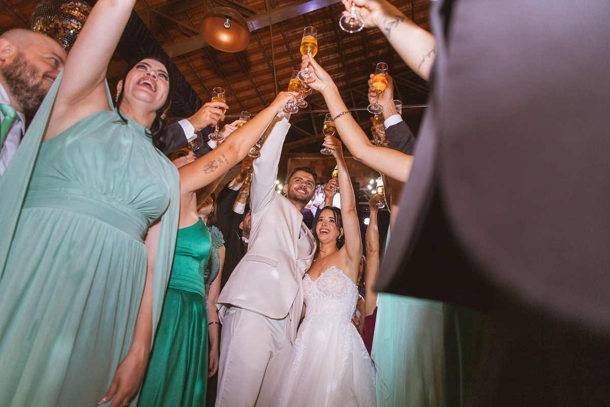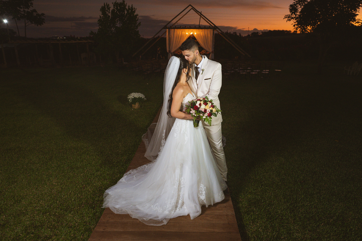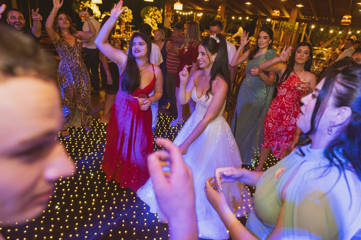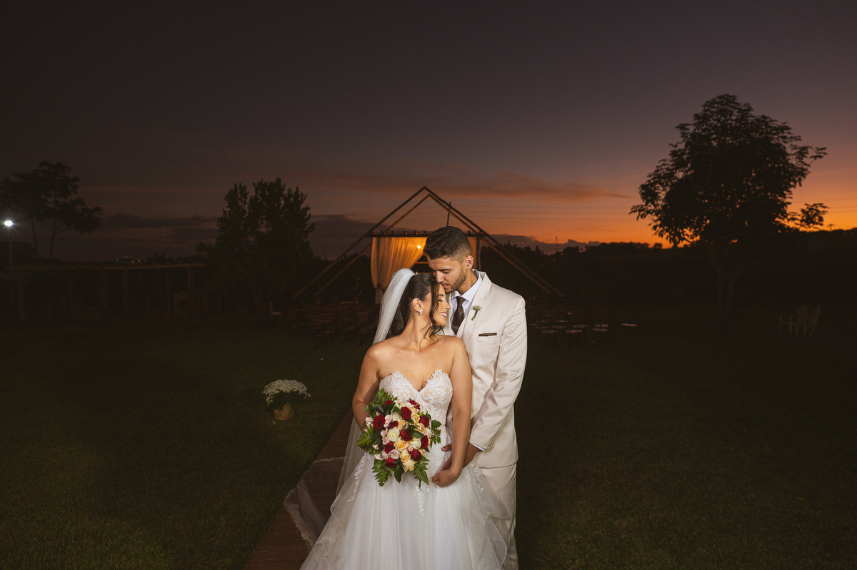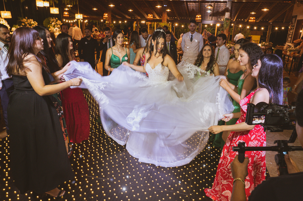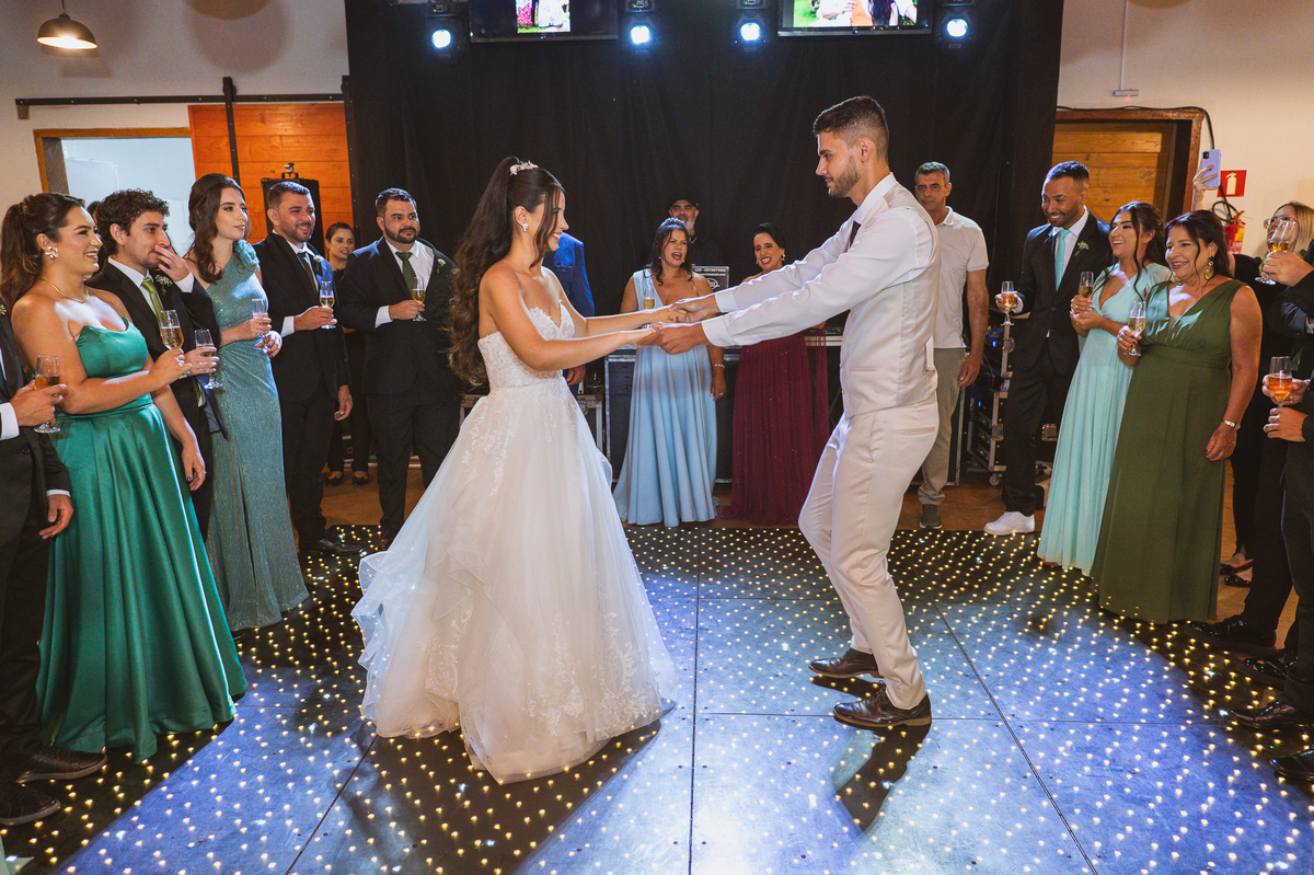 No intervalo, fizemos nosso tradicional mini ensaio dos noivos, aproveitando aquele pôr-do-sol incrível ao fundo. As luzes do altar também ajudaram a compor a cena final. Depois do ensaio, os noivos foram anunciados para entrar na pista de dança. Com muita festa, eles foram recebidos pelos convidados e pelos padrinhos, que já os aguardavam na pista de dança. Eles fizeram um brinde com todos os padrinhos e logo depois fizeram a sua primeira dança de casados. E foi um show à parte! Rodopios, levantamento de noiva, beijo e tudo que vocês imaginarem eles prepararam. Fizemos também o corte do bolo e o brinde em frente a mesa. Quando o espumante estourou, adivinhem quem foi o sortudo a levar uma rolhada na testa? Sim, eu. Mas por muita sorte, a rolha saiu fraca e praticamente brindou com a minha cabeça.
