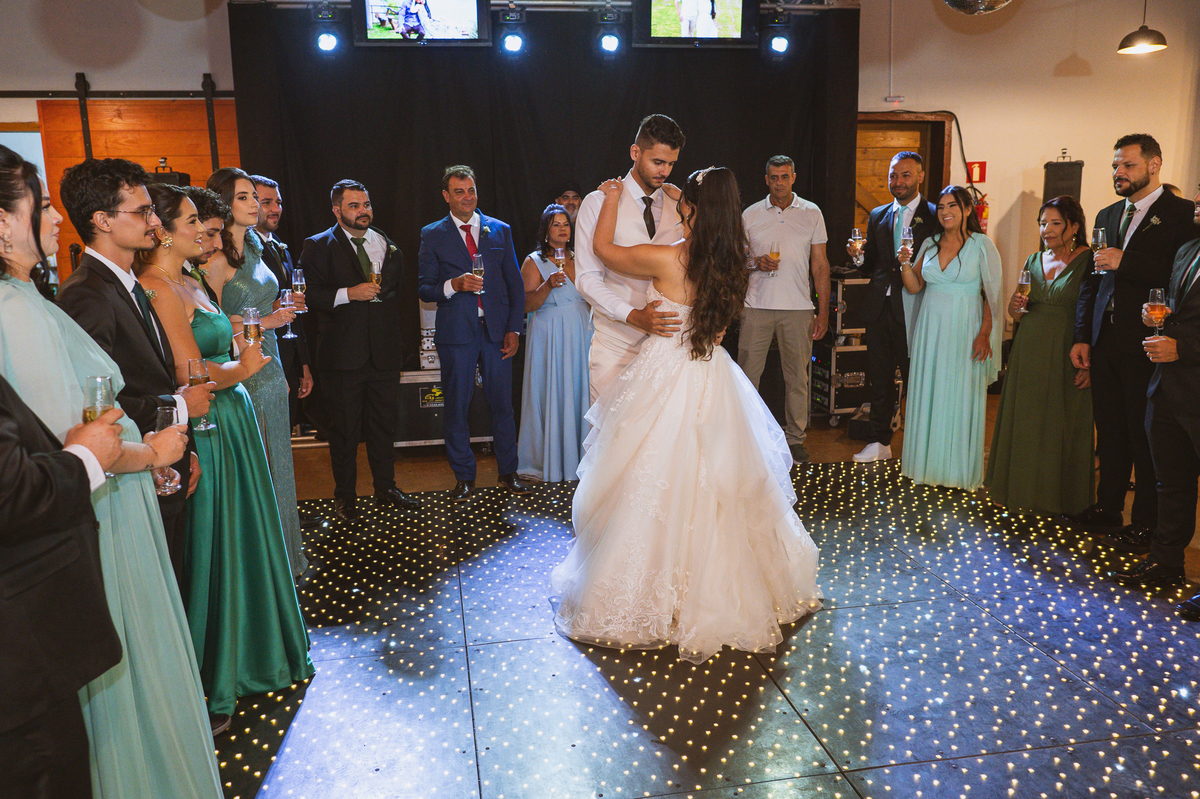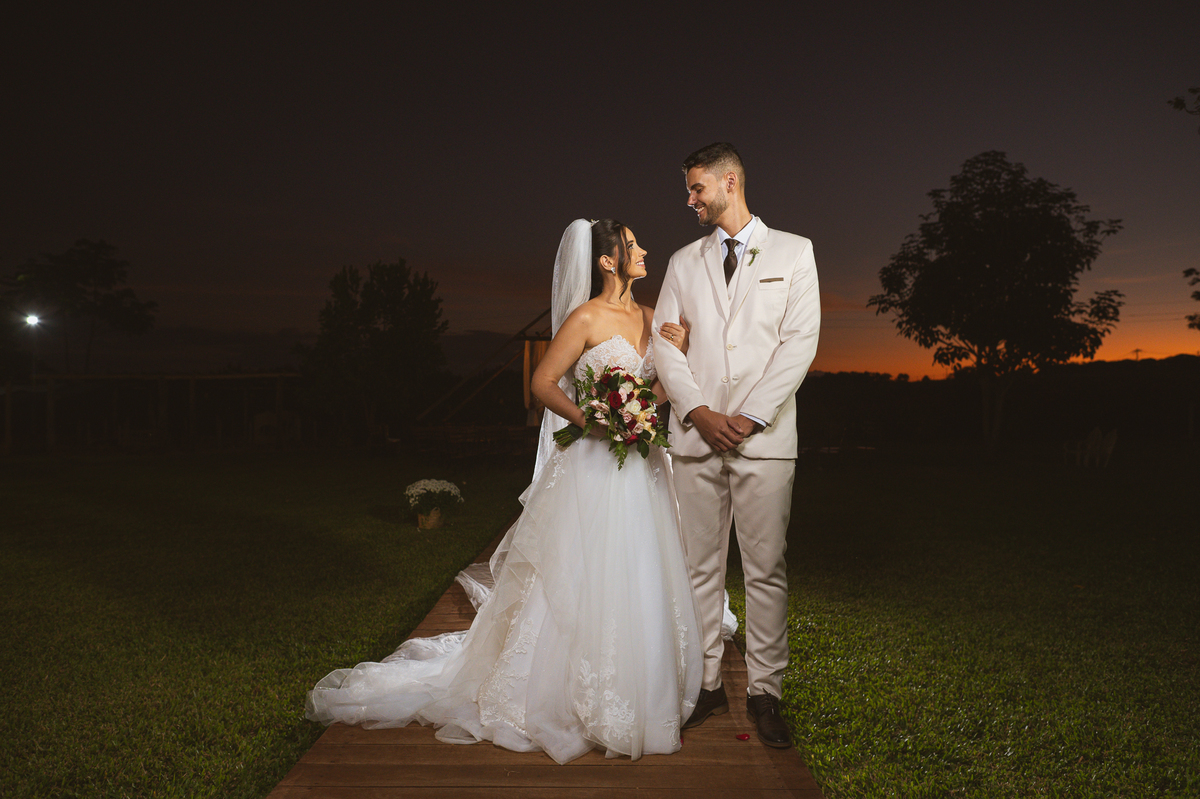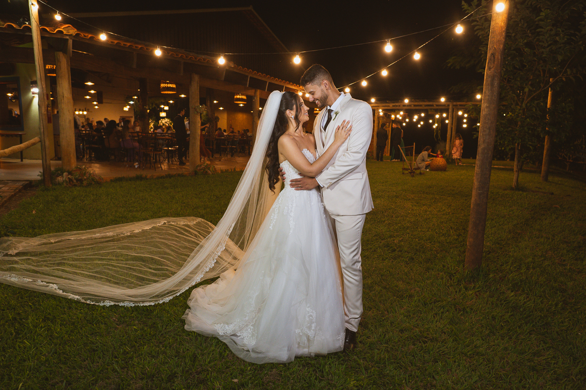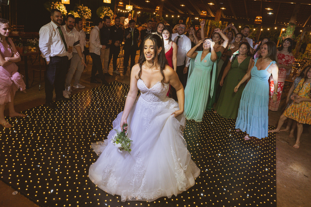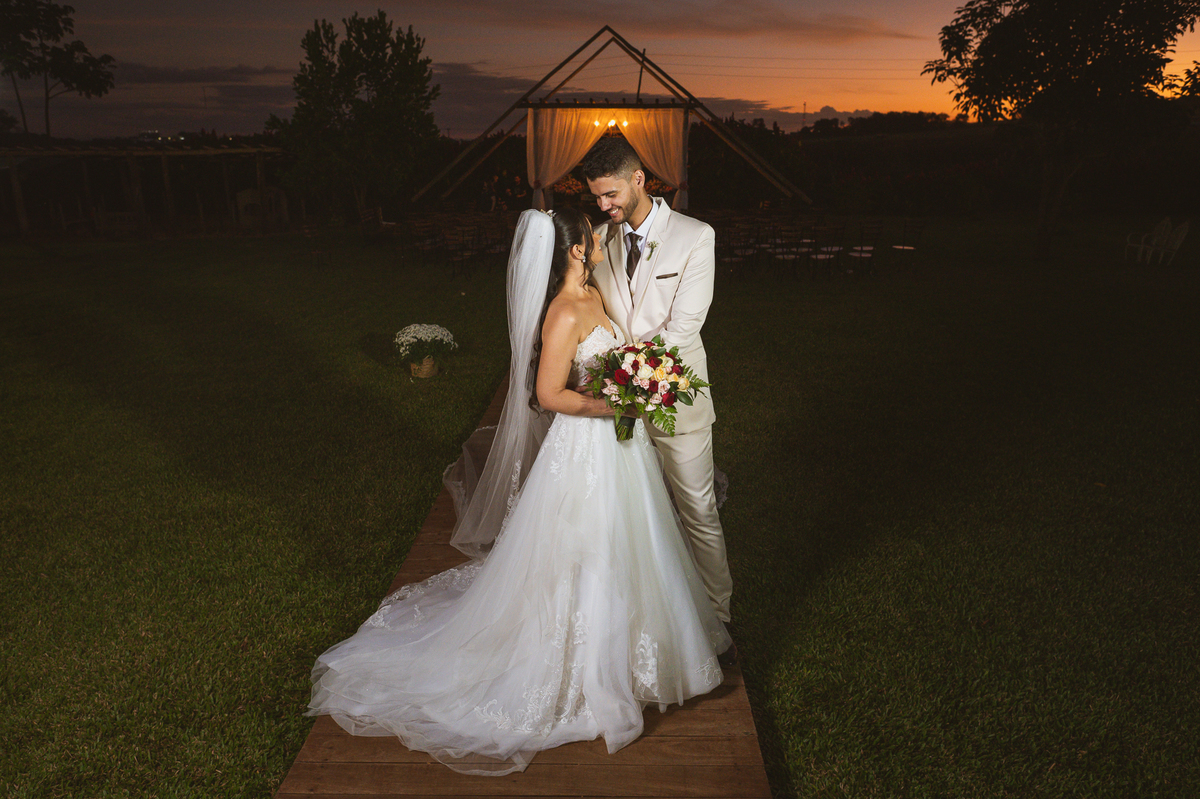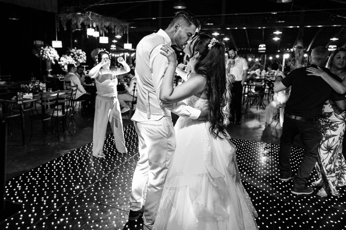 No intervalo, fizemos nosso tradicional mini ensaio dos noivos, aproveitando aquele pôr-do-sol incrível ao fundo. As luzes do altar também ajudaram a compor a cena final. Depois do ensaio, os noivos foram anunciados para entrar na pista de dança. Com muita festa, eles foram recebidos pelos convidados e pelos padrinhos, que já os aguardavam na pista de dança. Eles fizeram um brinde com todos os padrinhos e logo depois fizeram a sua primeira dança de casados. E foi um show à parte! Rodopios, levantamento de noiva, beijo e tudo que vocês imaginarem eles prepararam. Fizemos também o corte do bolo e o brinde em frente a mesa. Quando o espumante estourou, adivinhem quem foi o sortudo a levar uma rolhada na testa? Sim, eu. Mas por muita sorte, a rolha saiu fraca e praticamente brindou com a minha cabeça.