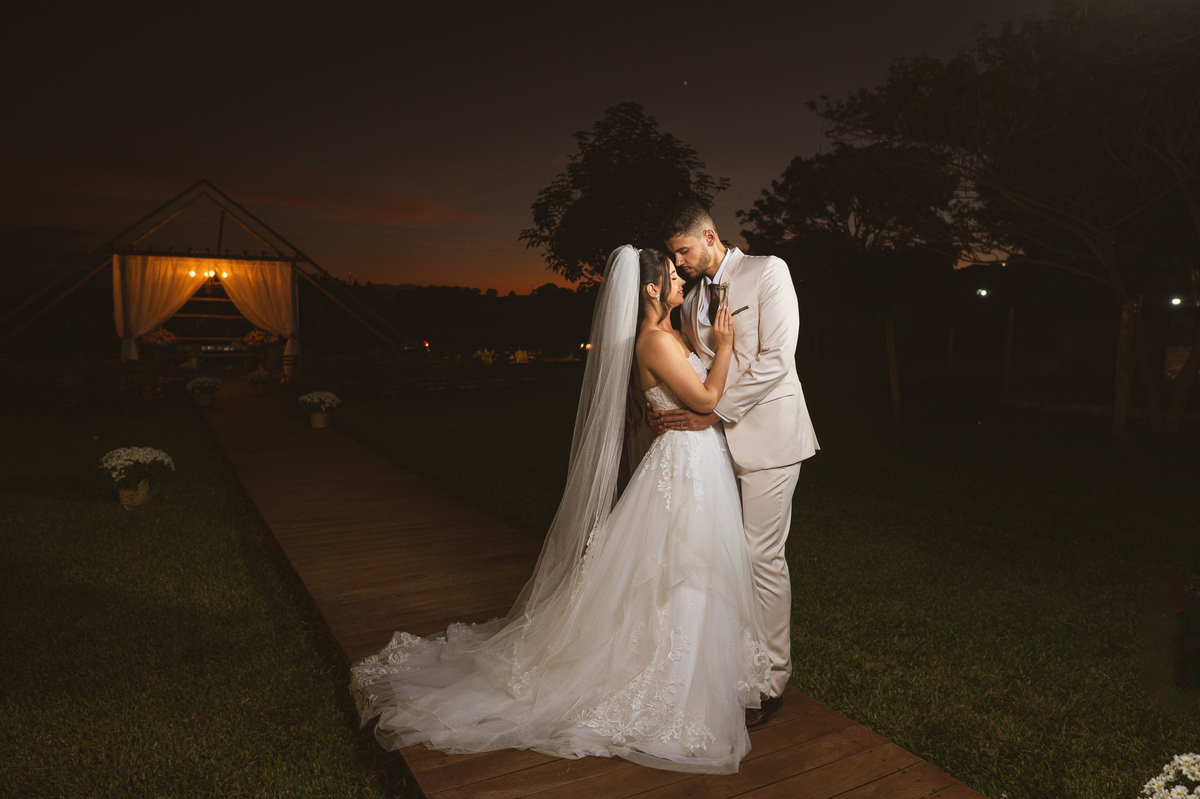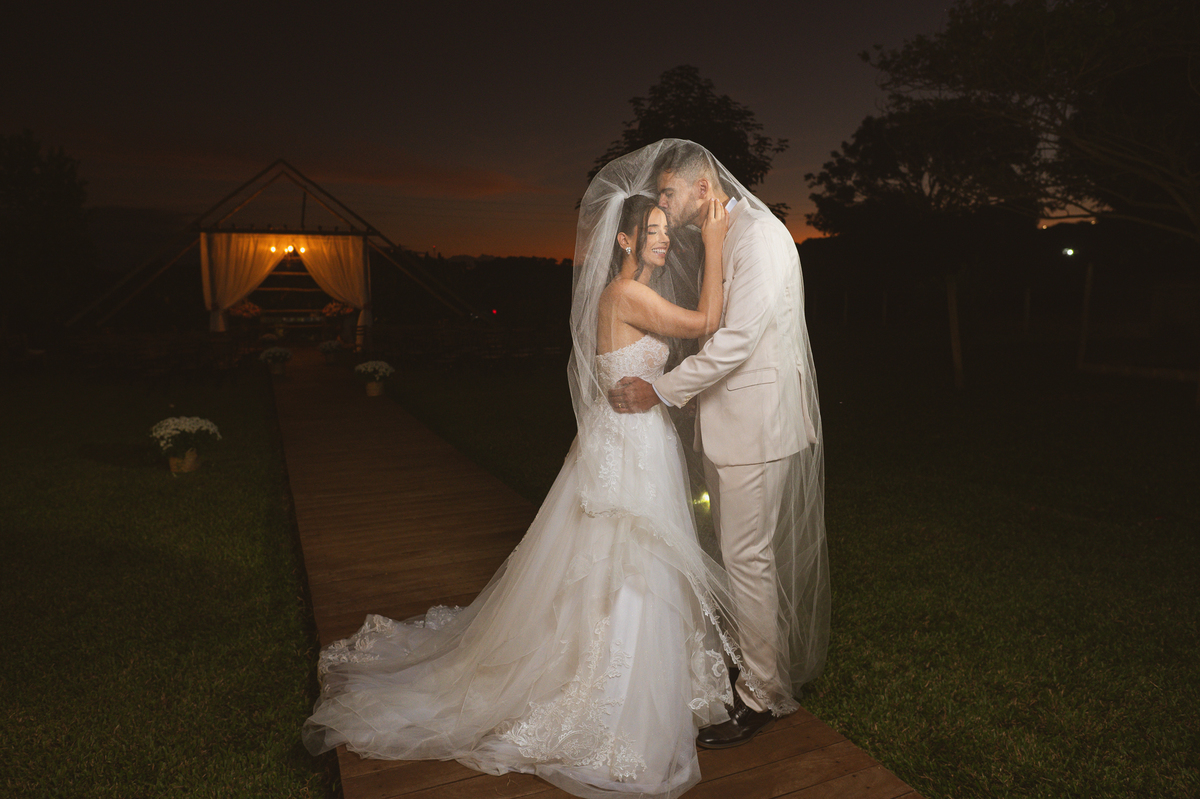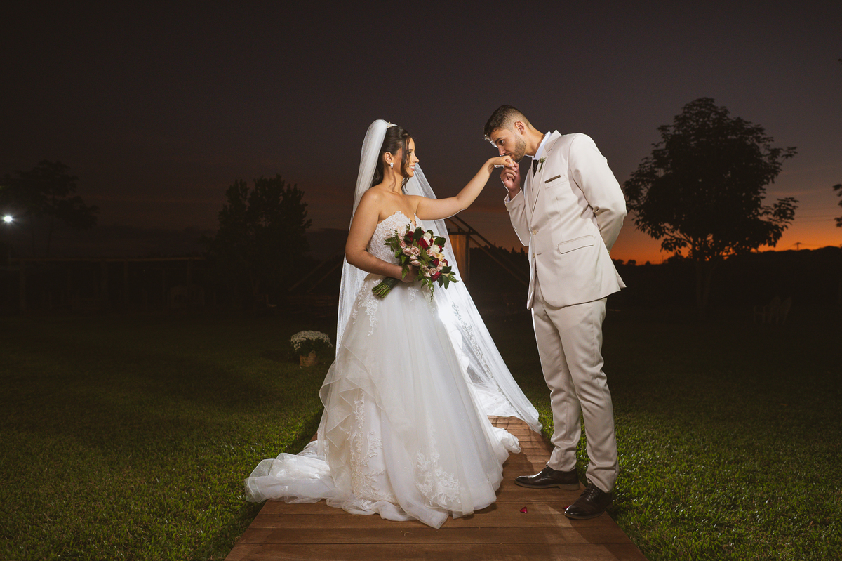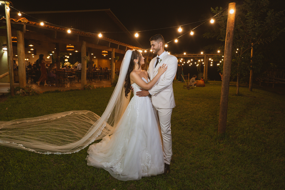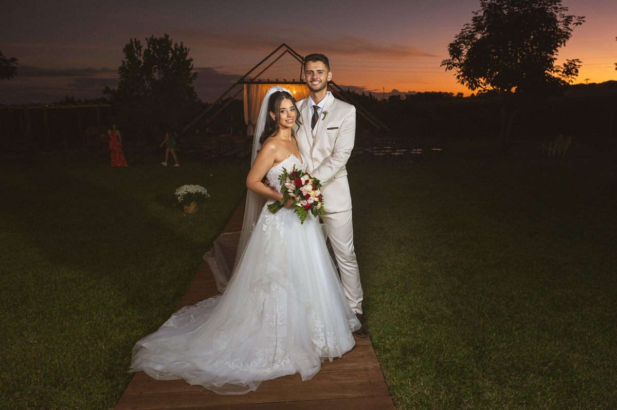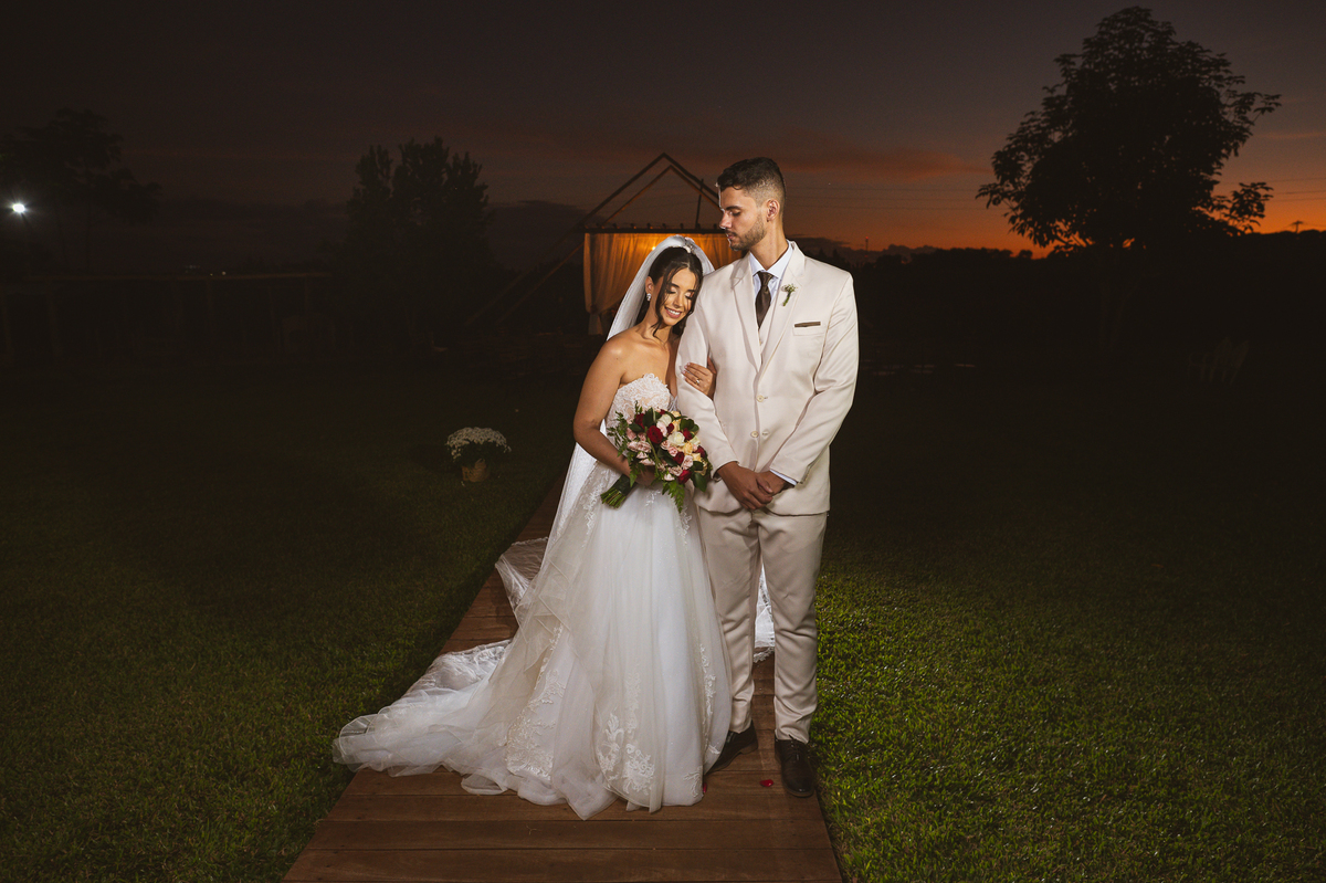 No intervalo, fizemos nosso tradicional mini ensaio dos noivos, aproveitando aquele pôr-do-sol incrível ao fundo. As luzes do altar também ajudaram a compor a cena final. Depois do ensaio, os noivos foram anunciados para entrar na pista de dança. Com muita festa, eles foram recebidos pelos convidados e pelos padrinhos, que já os aguardavam na pista de dança. Eles fizeram um brinde com todos os padrinhos e logo depois fizeram a sua primeira dança de casados. E foi um show à parte! Rodopios, levantamento de noiva, beijo e tudo que vocês imaginarem eles prepararam. Fizemos também o corte do bolo e o brinde em frente a mesa. Quando o espumante estourou, adivinhem quem foi o sortudo a levar uma rolhada na testa? Sim, eu. Mas por muita sorte, a rolha saiu fraca e praticamente brindou com a minha cabeça.