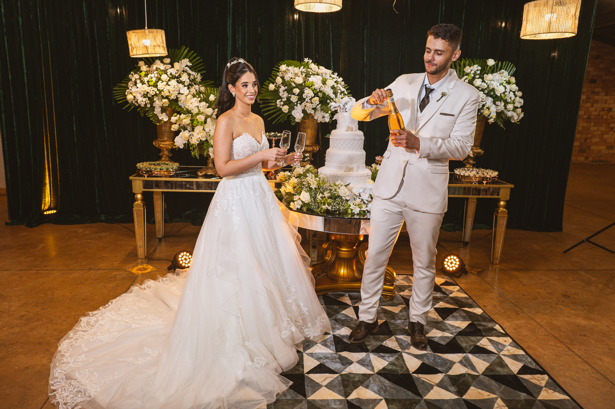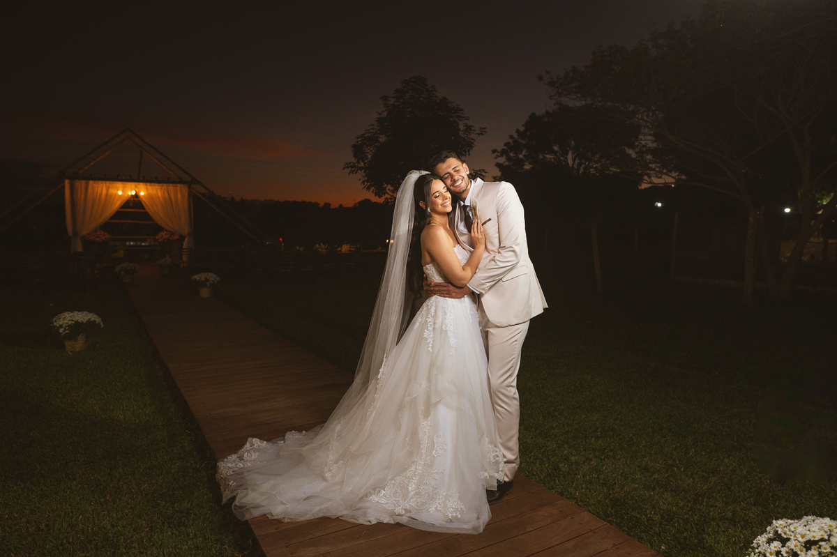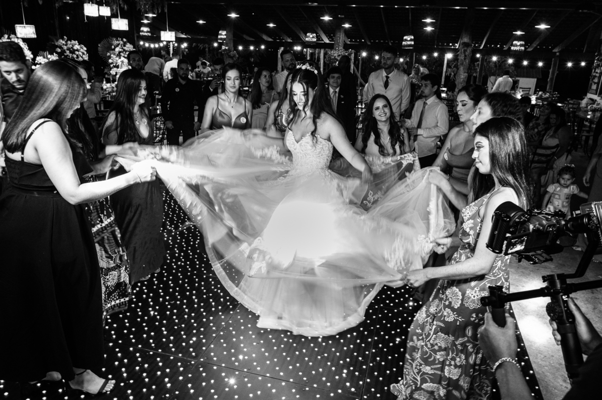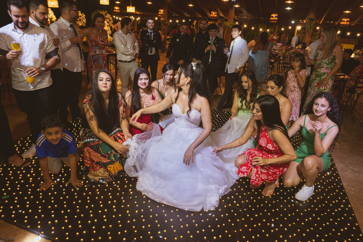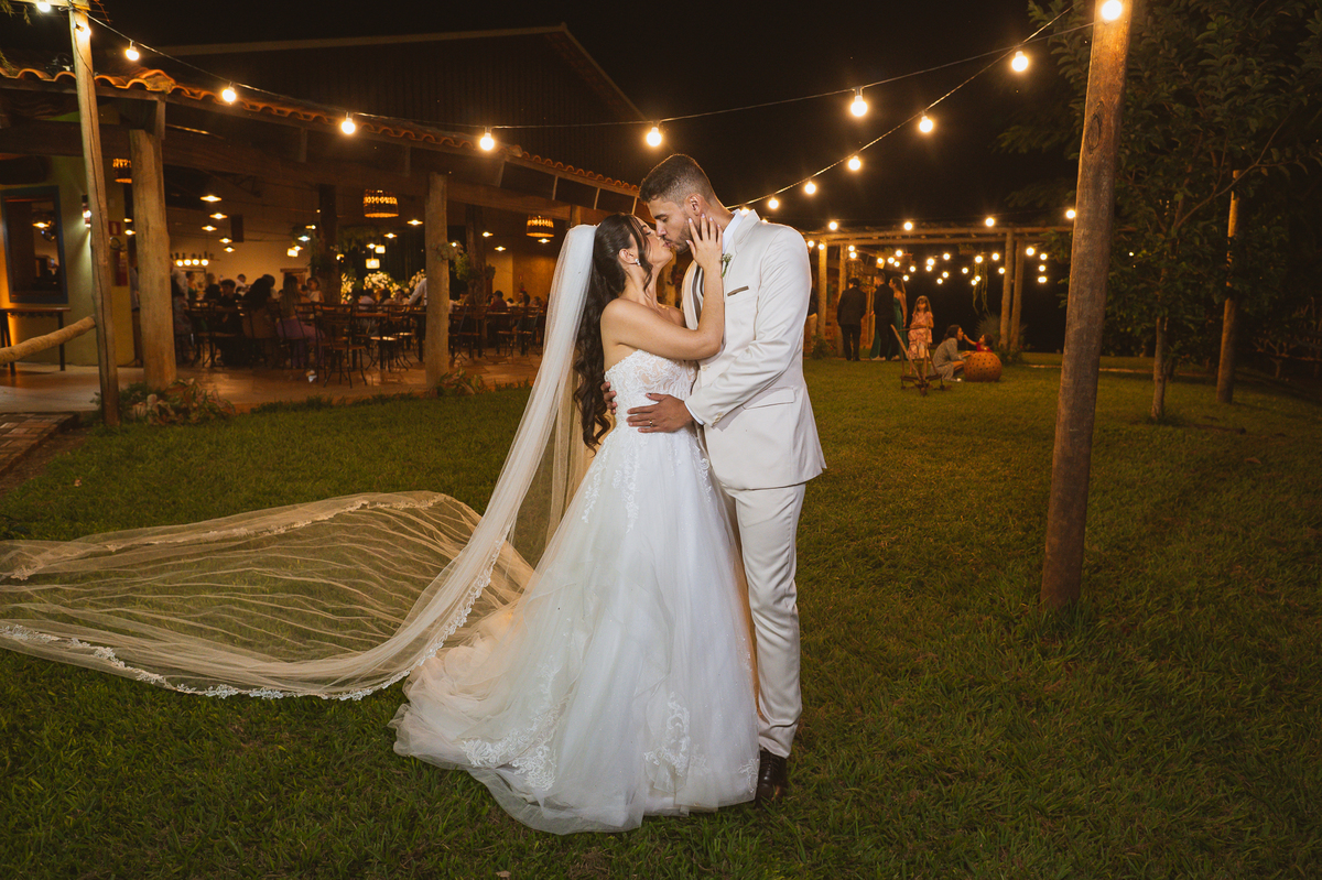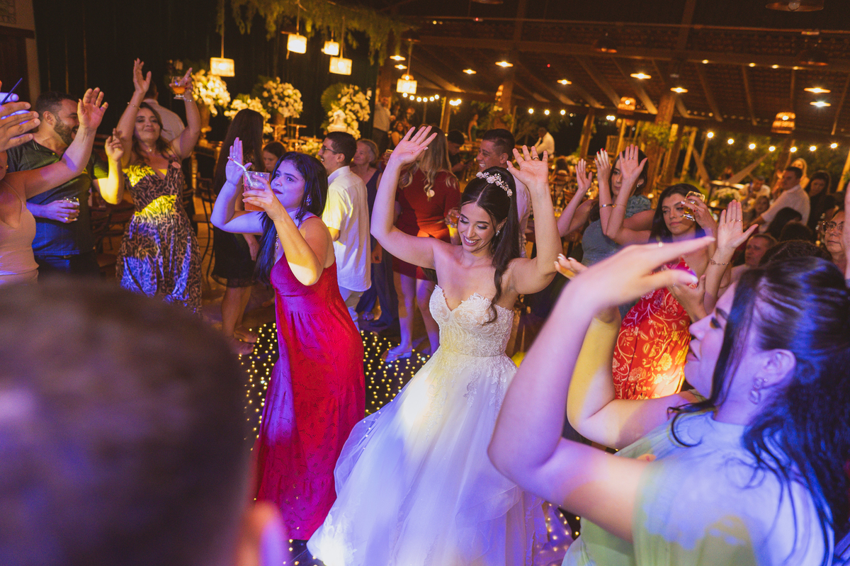 No intervalo, fizemos nosso tradicional mini ensaio dos noivos, aproveitando aquele pôr-do-sol incrível ao fundo. As luzes do altar também ajudaram a compor a cena final. Depois do ensaio, os noivos foram anunciados para entrar na pista de dança. Com muita festa, eles foram recebidos pelos convidados e pelos padrinhos, que já os aguardavam na pista de dança. Eles fizeram um brinde com todos os padrinhos e logo depois fizeram a sua primeira dança de casados. E foi um show à parte! Rodopios, levantamento de noiva, beijo e tudo que vocês imaginarem eles prepararam. Fizemos também o corte do bolo e o brinde em frente a mesa. Quando o espumante estourou, adivinhem quem foi o sortudo a levar uma rolhada na testa? Sim, eu. Mas por muita sorte, a rolha saiu fraca e praticamente brindou com a minha cabeça.