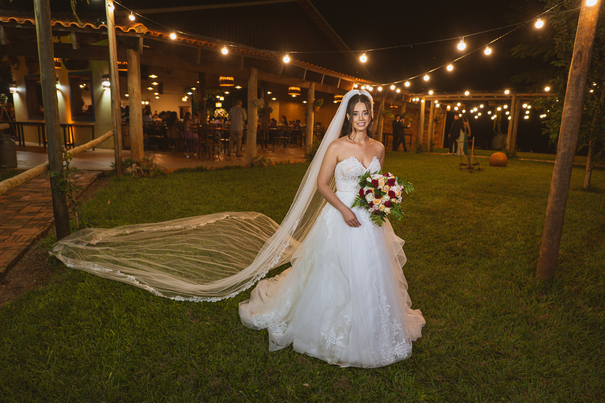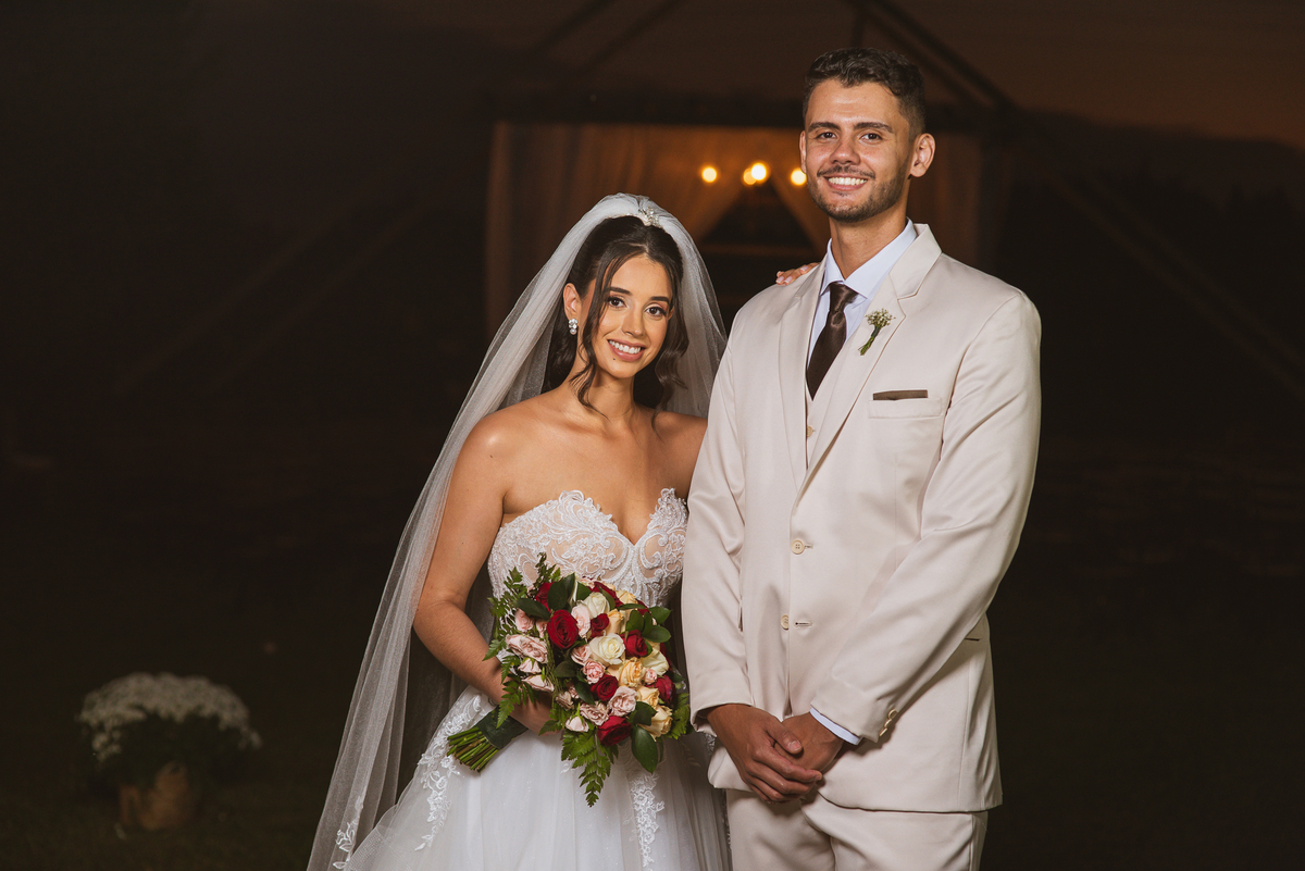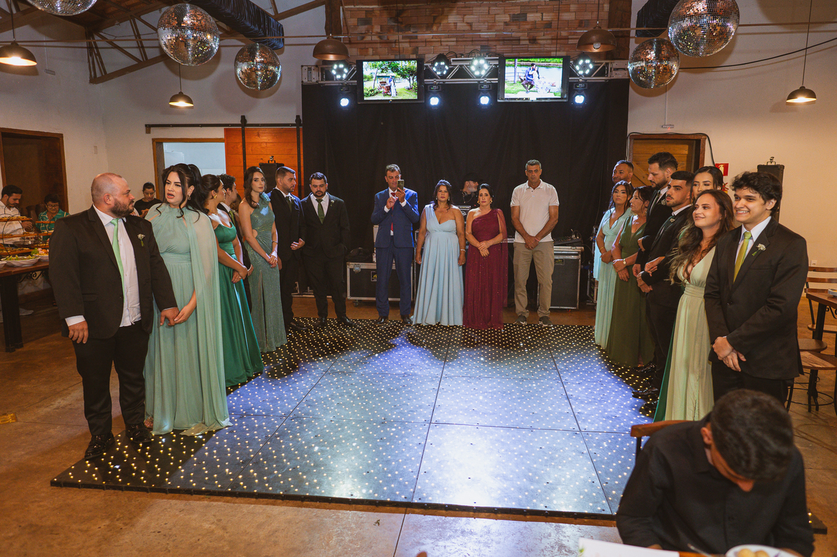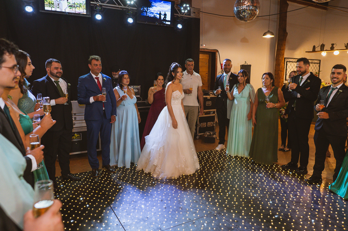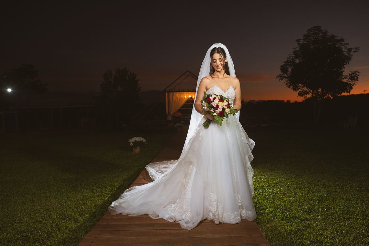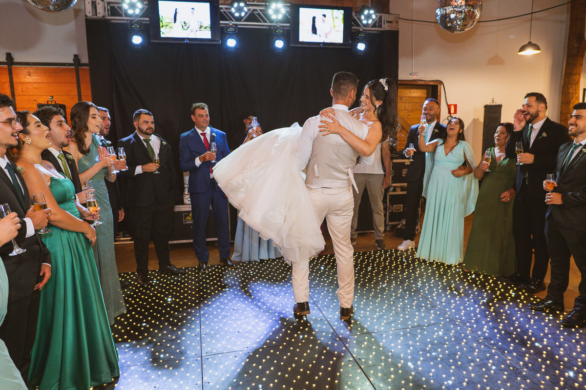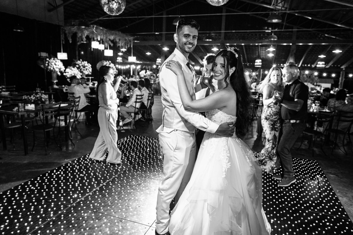 No intervalo, fizemos nosso tradicional mini ensaio dos noivos, aproveitando aquele pôr-do-sol incrível ao fundo. As luzes do altar também ajudaram a compor a cena final. Depois do ensaio, os noivos foram anunciados para entrar na pista de dança. Com muita festa, eles foram recebidos pelos convidados e pelos padrinhos, que já os aguardavam na pista de dança. Eles fizeram um brinde com todos os padrinhos e logo depois fizeram a sua primeira dança de casados. E foi um show à parte! Rodopios, levantamento de noiva, beijo e tudo que vocês imaginarem eles prepararam. Fizemos também o corte do bolo e o brinde em frente a mesa. Quando o espumante estourou, adivinhem quem foi o sortudo a levar uma rolhada na testa? Sim, eu. Mas por muita sorte, a rolha saiu fraca e praticamente brindou com a minha cabeça.