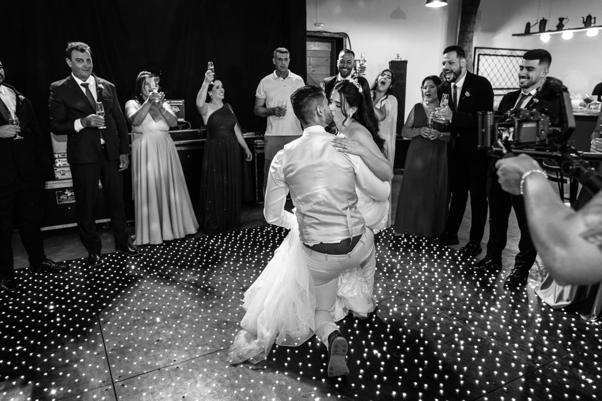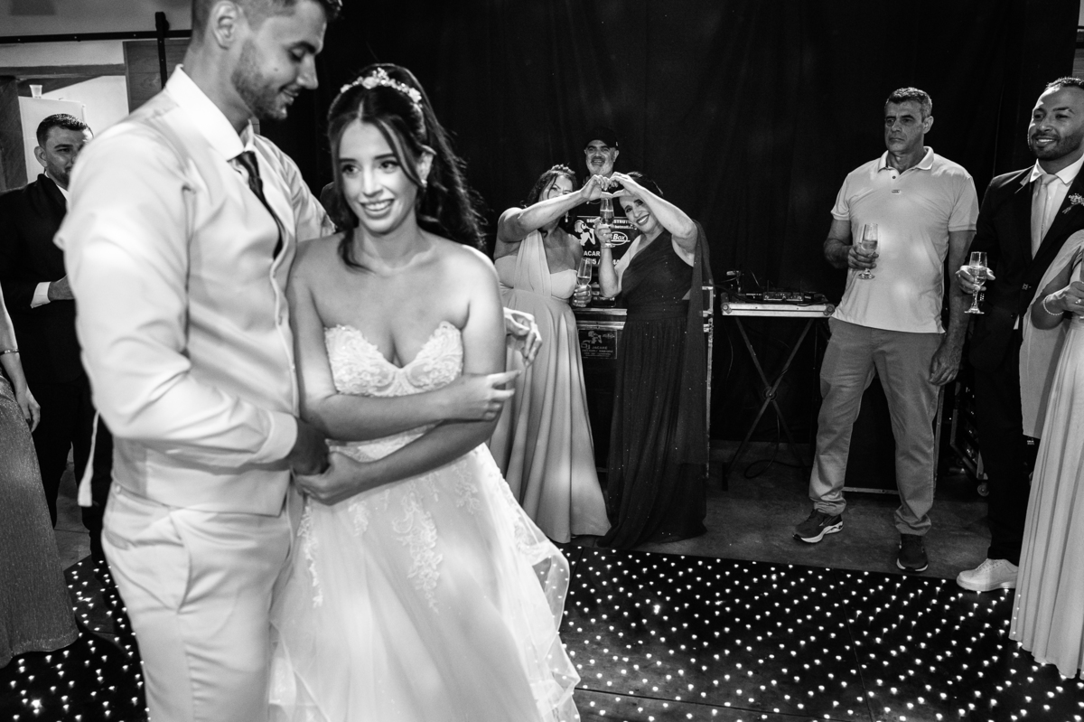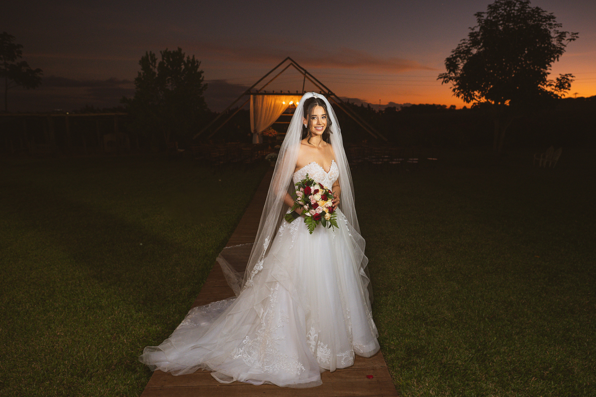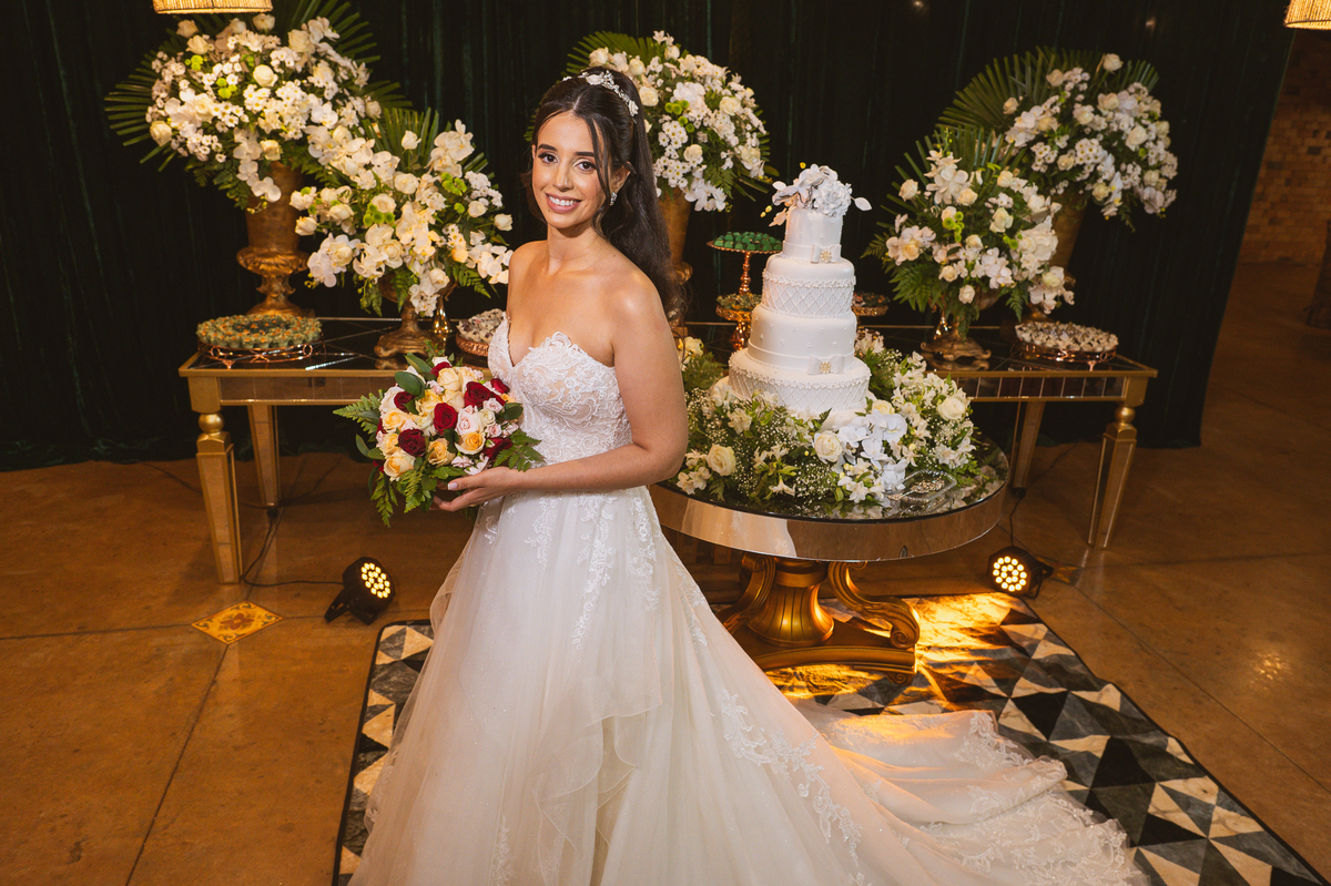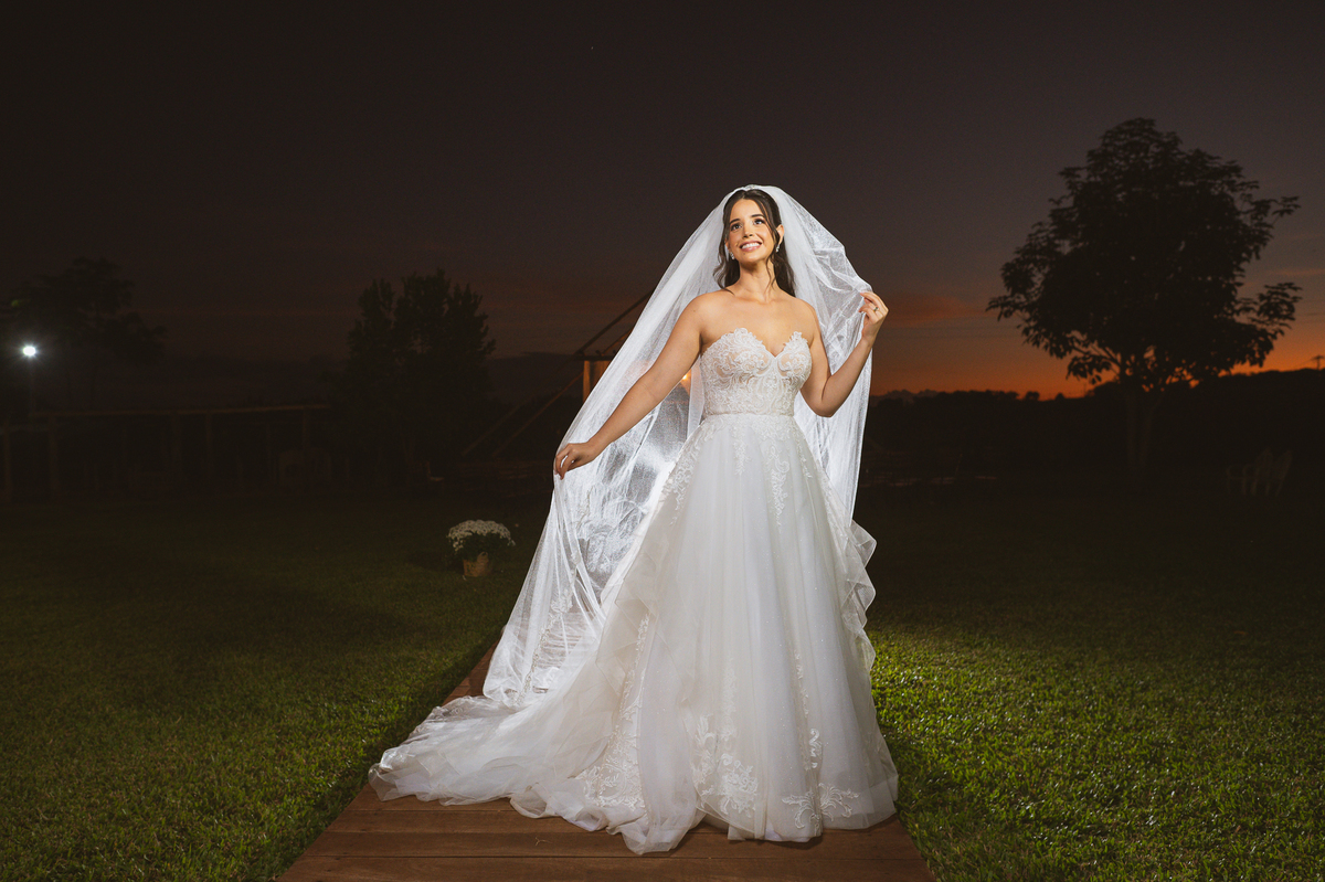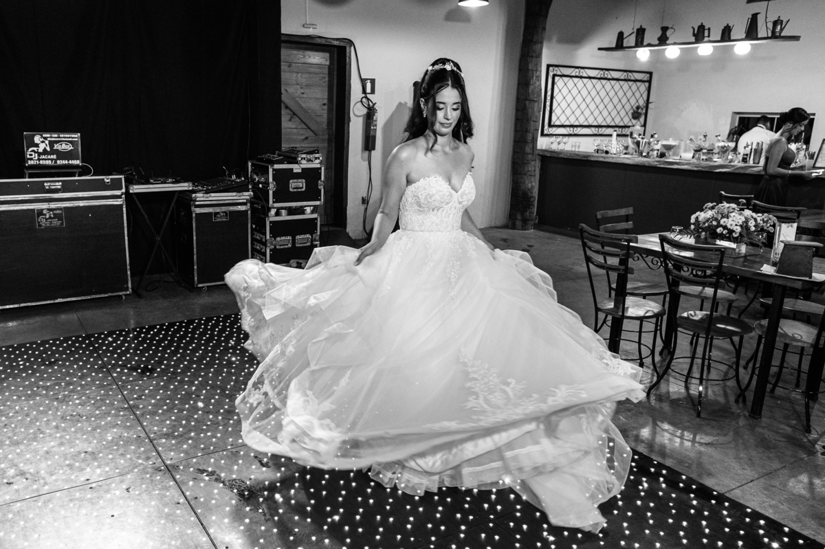 No intervalo, fizemos nosso tradicional mini ensaio dos noivos, aproveitando aquele pôr-do-sol incrível ao fundo. As luzes do altar também ajudaram a compor a cena final. Depois do ensaio, os noivos foram anunciados para entrar na pista de dança. Com muita festa, eles foram recebidos pelos convidados e pelos padrinhos, que já os aguardavam na pista de dança. Eles fizeram um brinde com todos os padrinhos e logo depois fizeram a sua primeira dança de casados. E foi um show à parte! Rodopios, levantamento de noiva, beijo e tudo que vocês imaginarem eles prepararam. Fizemos também o corte do bolo e o brinde em frente a mesa. Quando o espumante estourou, adivinhem quem foi o sortudo a levar uma rolhada na testa? Sim, eu. Mas por muita sorte, a rolha saiu fraca e praticamente brindou com a minha cabeça.
