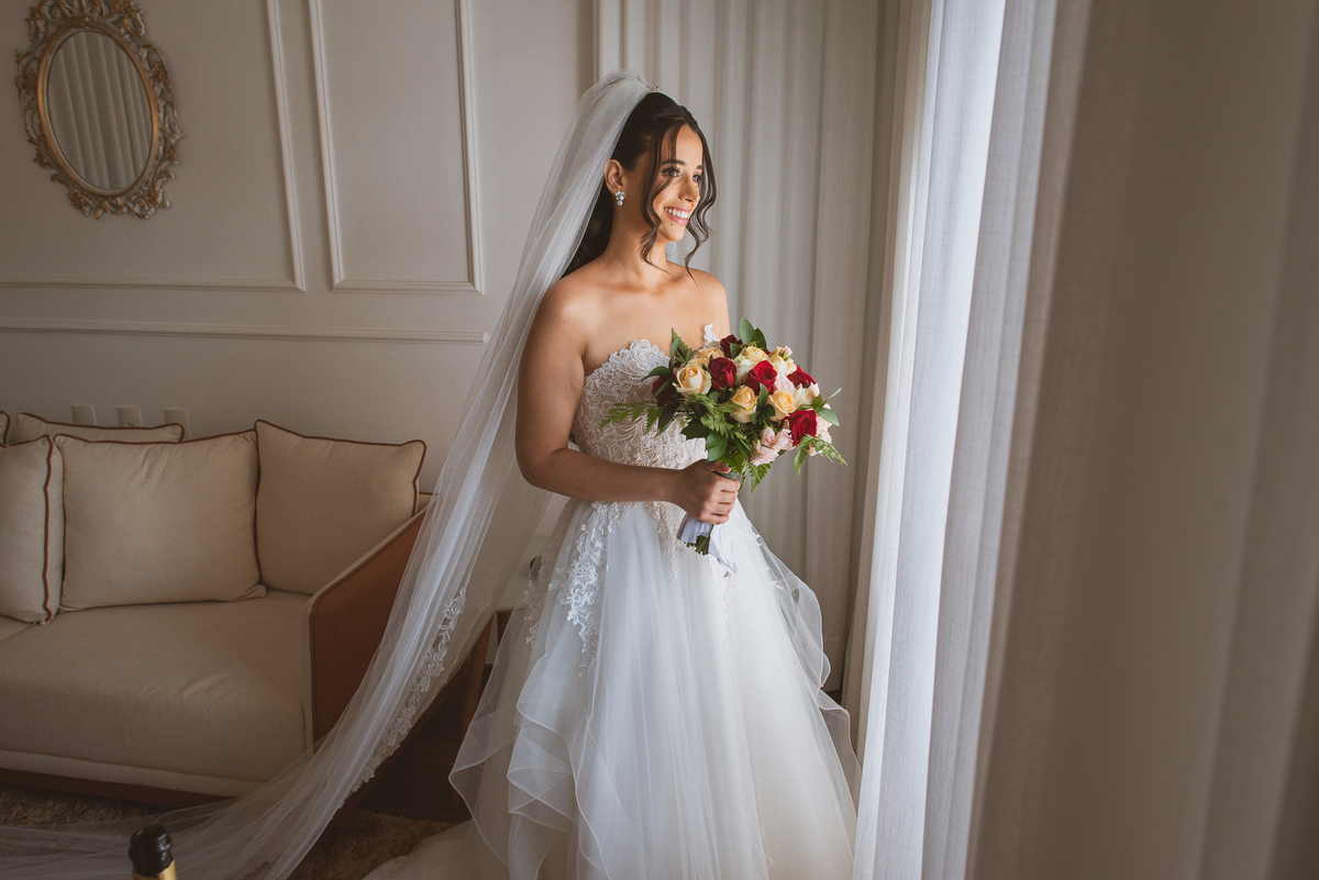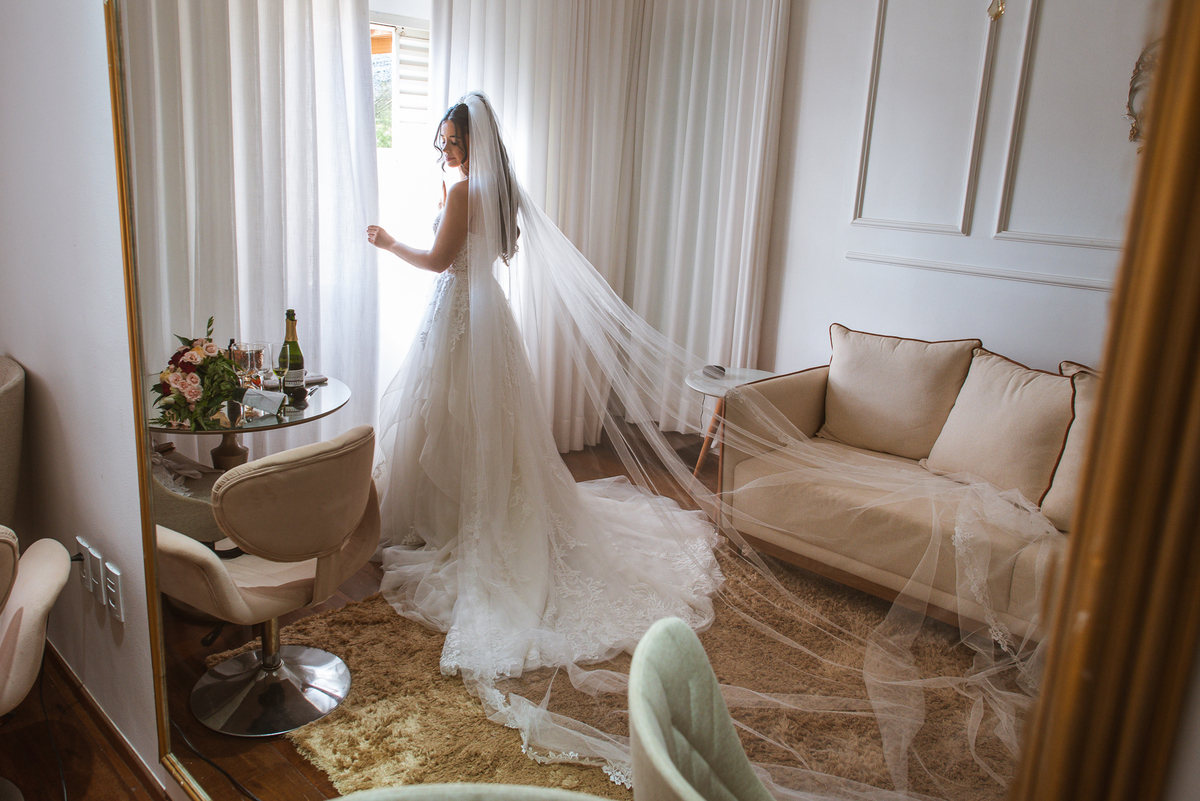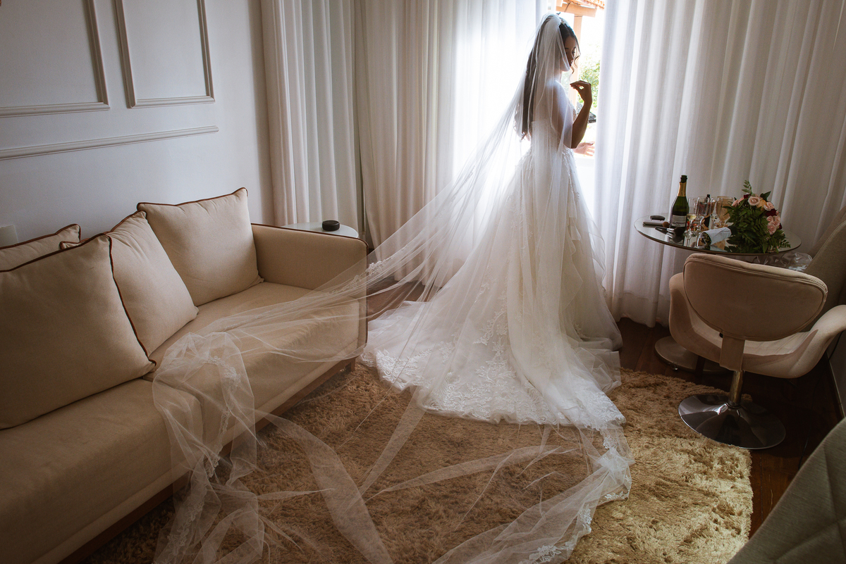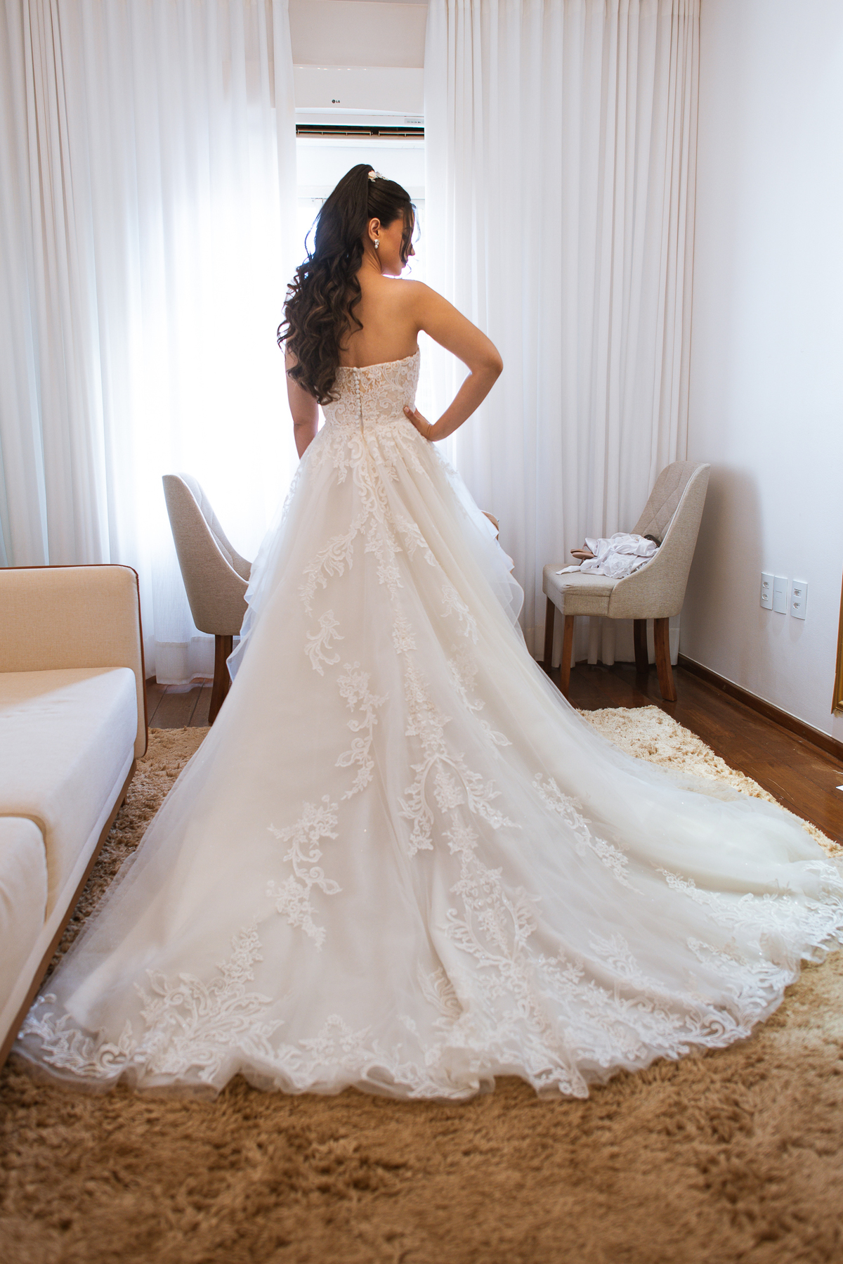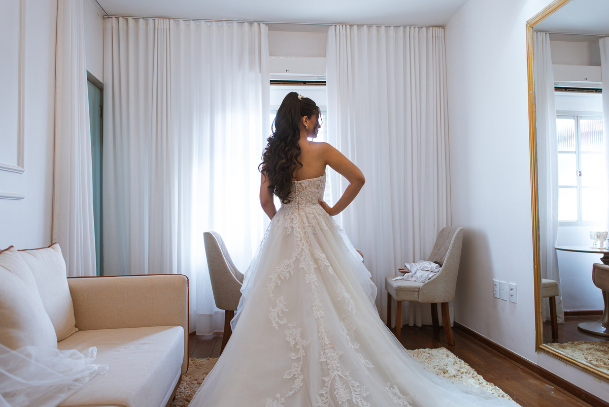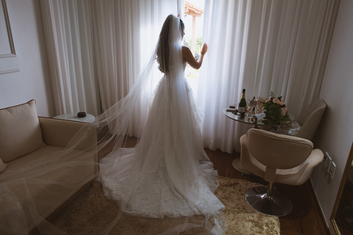 Quando eu abri a porta e avistei ela pronta, realmente foi de suspirar. O vestido ficou maravilhoso, e o penteado escolhido por ela era um semi preso muito bonito, que valorizou o vestido e também o seu cabelo longo. A equipe do salão caprichou em tudo. A make levíssima, o penteado muito bem feito, os acessórios colocados e pronto. A noiva ficou pronta bem antes do horário combinado. A parte boa é que tivemos bons minutos para fotografarmos. Aproveitamos a luz da janela que entrava suavemente por meio da cortina e encostava no rosto da noiva e brilhava reluzindo toda sua felicidade. Finalizadas as fotos, partimos para o Sítio Casa de Família.