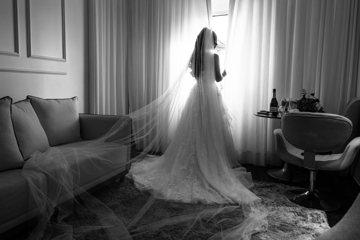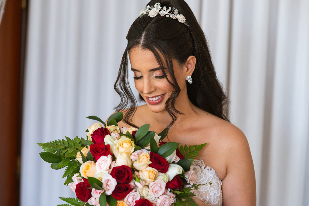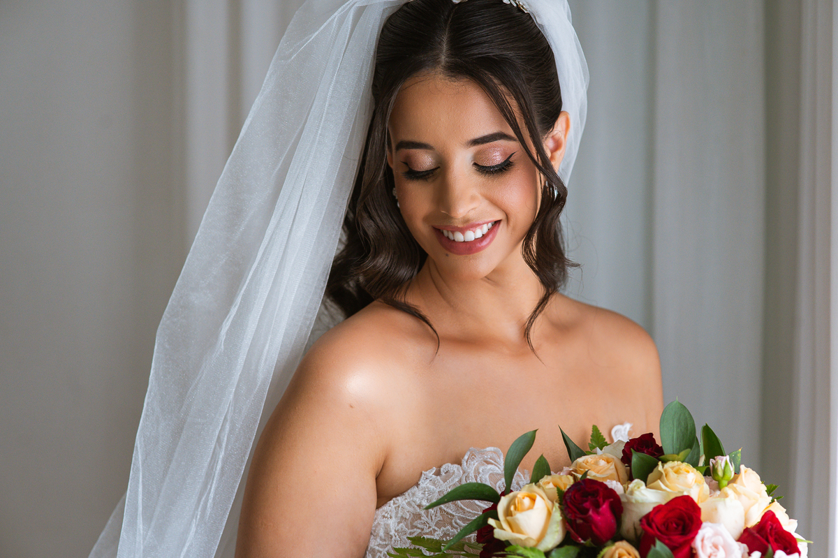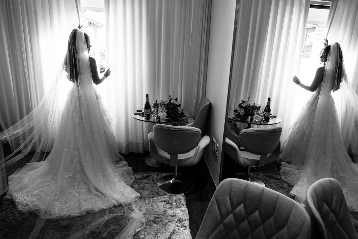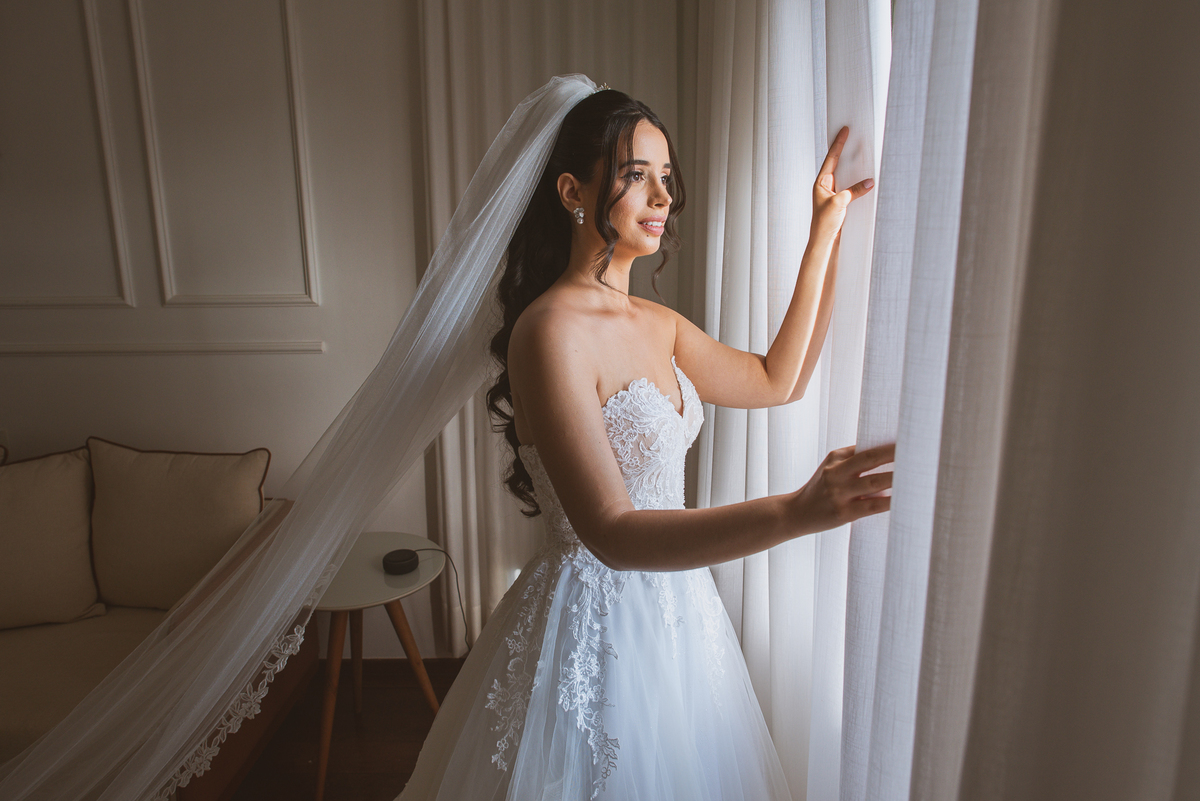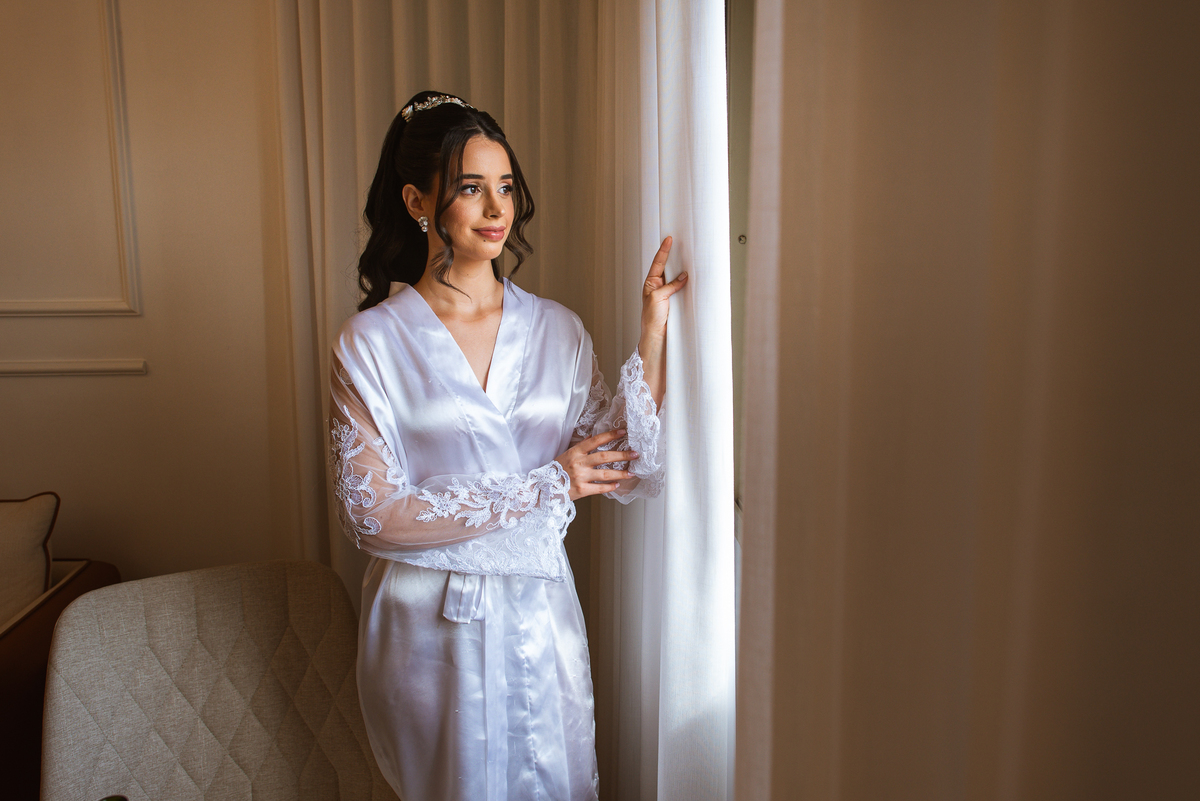 Quando eu abri a porta e avistei ela pronta, realmente foi de suspirar. O vestido ficou maravilhoso, e o penteado escolhido por ela era um semi preso muito bonito, que valorizou o vestido e também o seu cabelo longo. A equipe do salão caprichou em tudo. A make levíssima, o penteado muito bem feito, os acessórios colocados e pronto. A noiva ficou pronta bem antes do horário combinado. A parte boa é que tivemos bons minutos para fotografarmos. Aproveitamos a luz da janela que entrava suavemente por meio da cortina e encostava no rosto da noiva e brilhava reluzindo toda sua felicidade. Finalizadas as fotos, partimos para o Sítio Casa de Família.