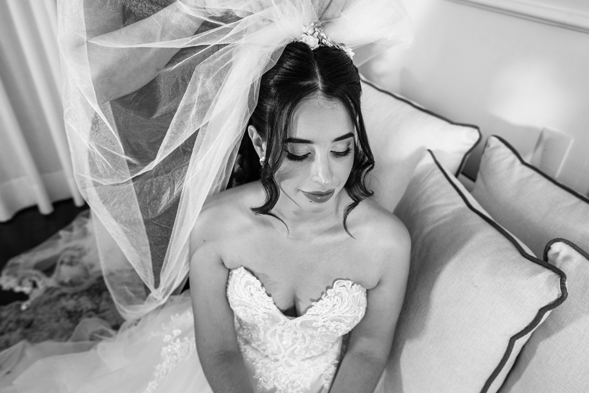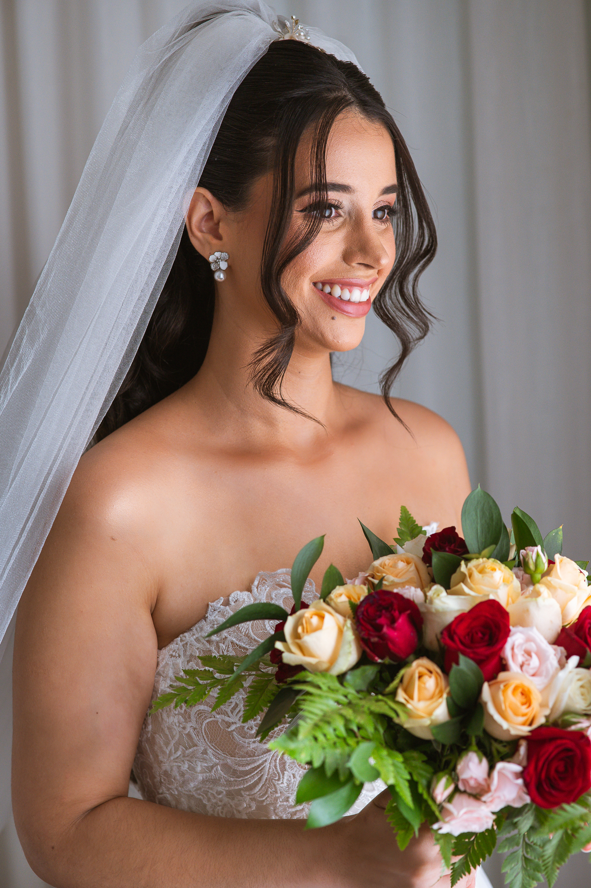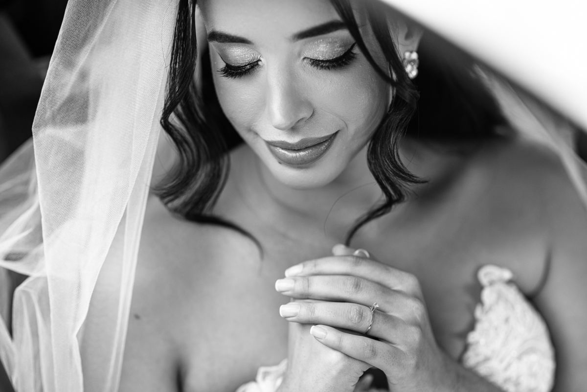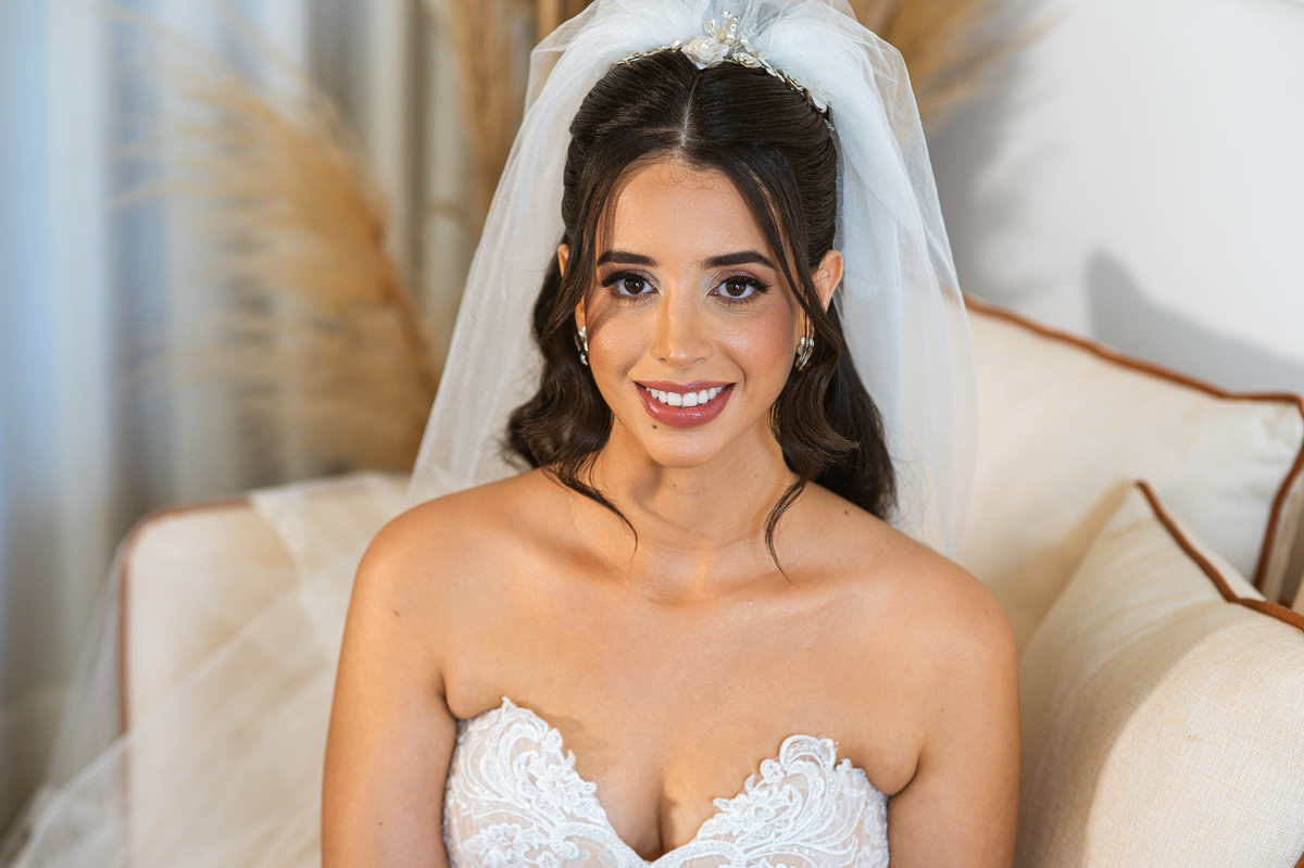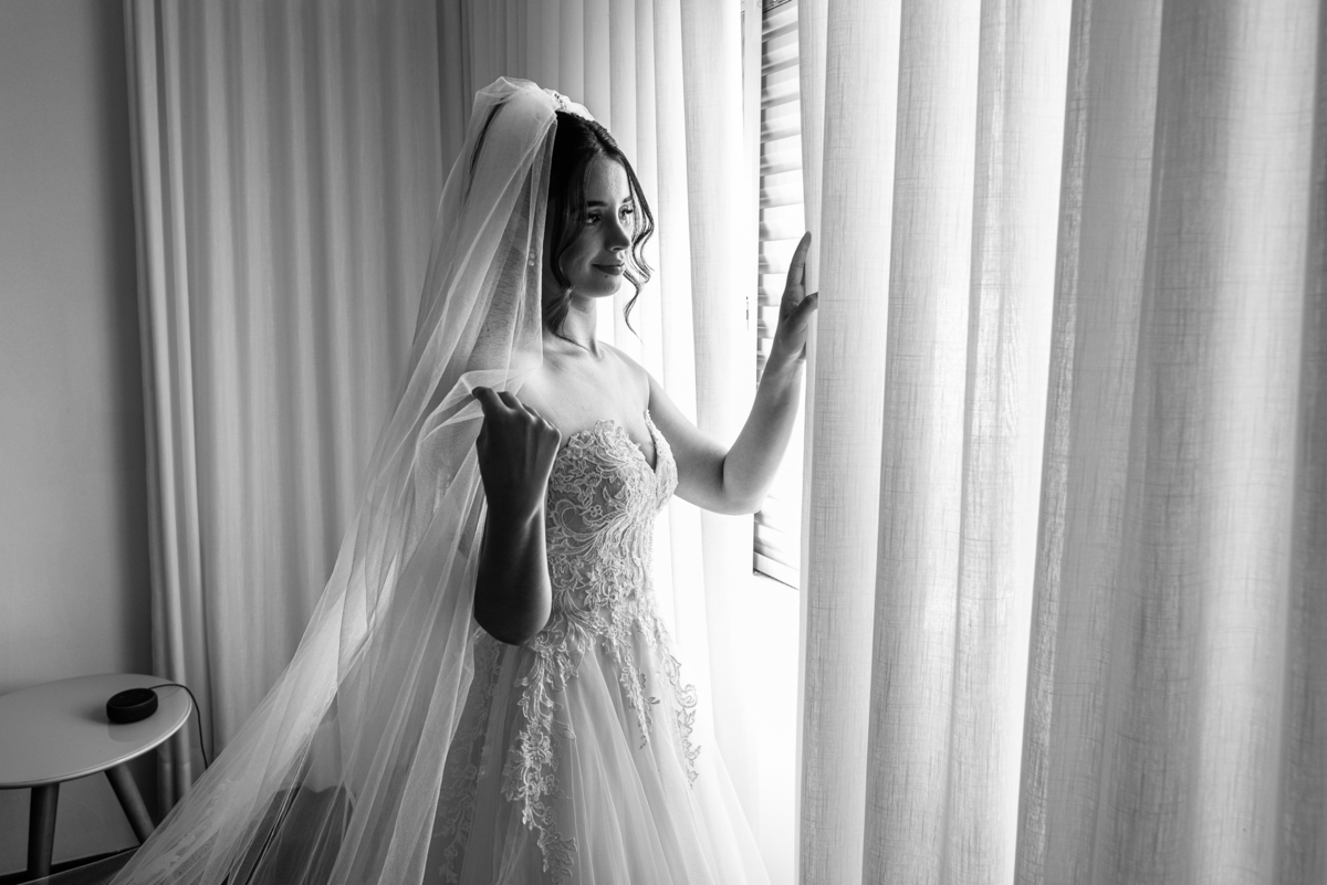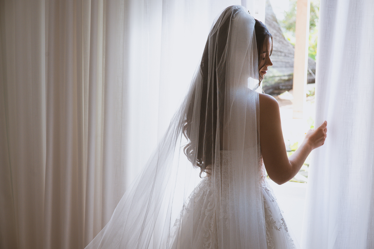 Quando eu abri a porta e avistei ela pronta, realmente foi de suspirar. O vestido ficou maravilhoso, e o penteado escolhido por ela era um semi preso muito bonito, que valorizou o vestido e também o seu cabelo longo. A equipe do salão caprichou em tudo. A make levíssima, o penteado muito bem feito, os acessórios colocados e pronto. A noiva ficou pronta bem antes do horário combinado. A parte boa é que tivemos bons minutos para fotografarmos. Aproveitamos a luz da janela que entrava suavemente por meio da cortina e encostava no rosto da noiva e brilhava reluzindo toda sua felicidade. Finalizadas as fotos, partimos para o Sítio Casa de Família.