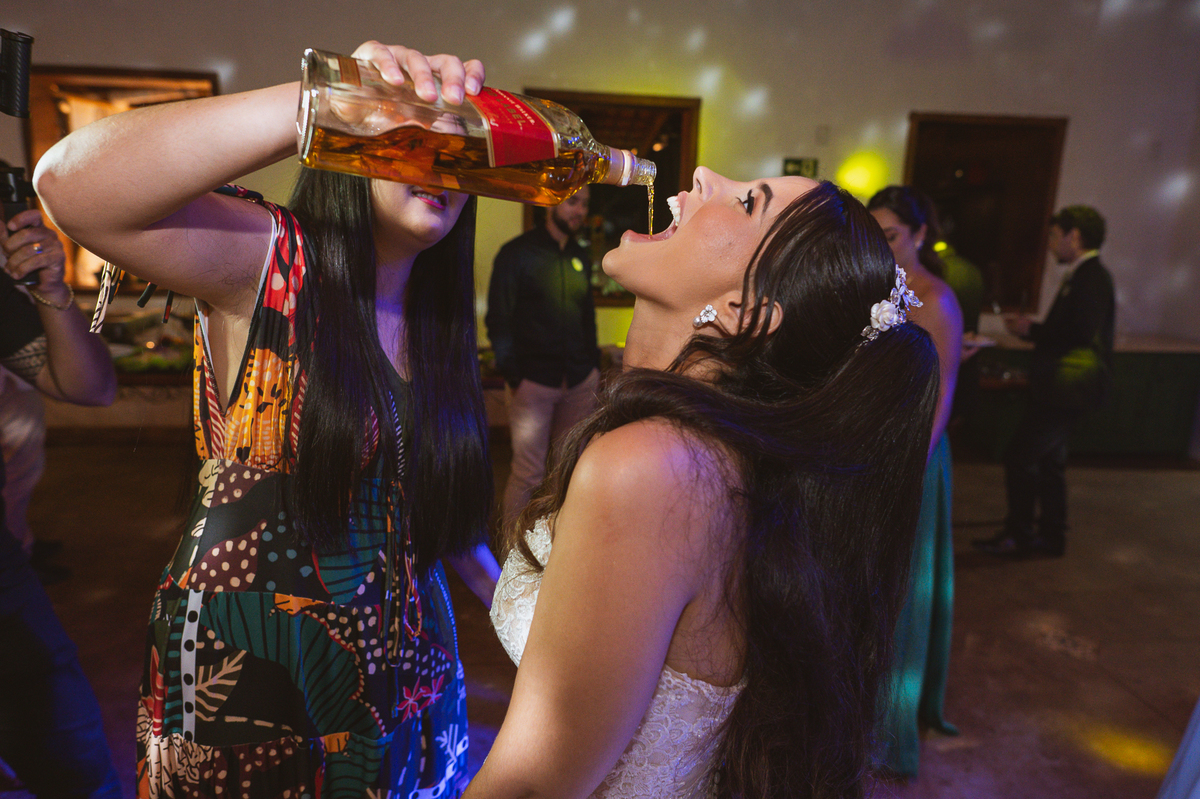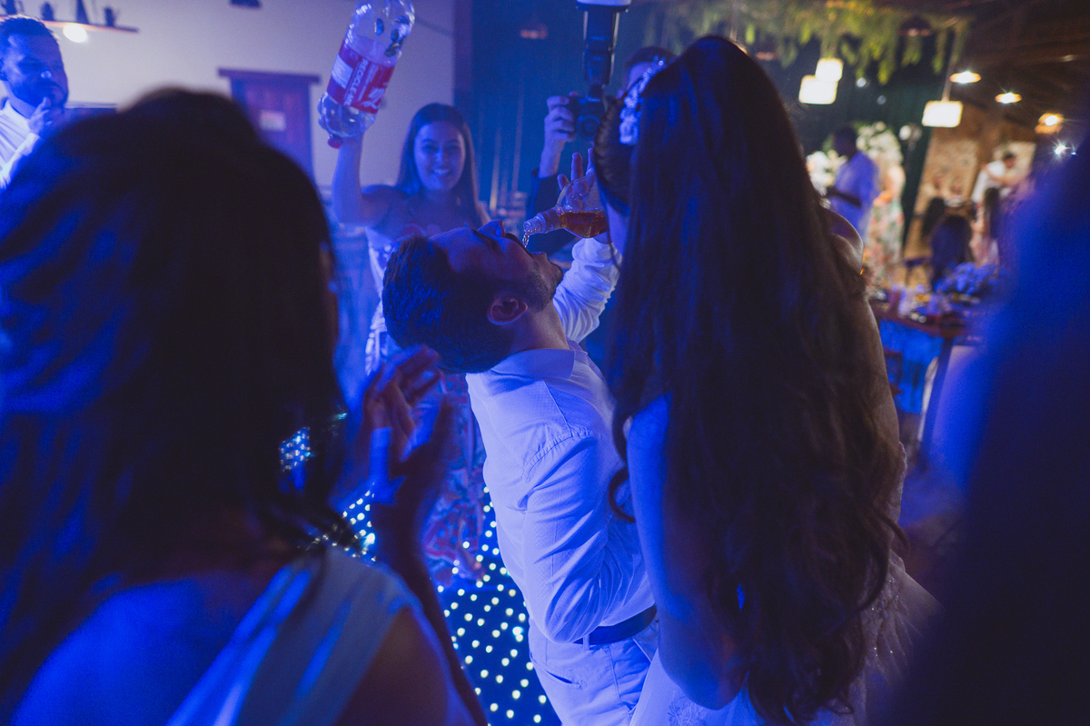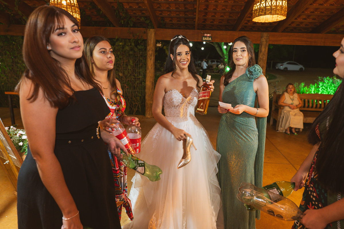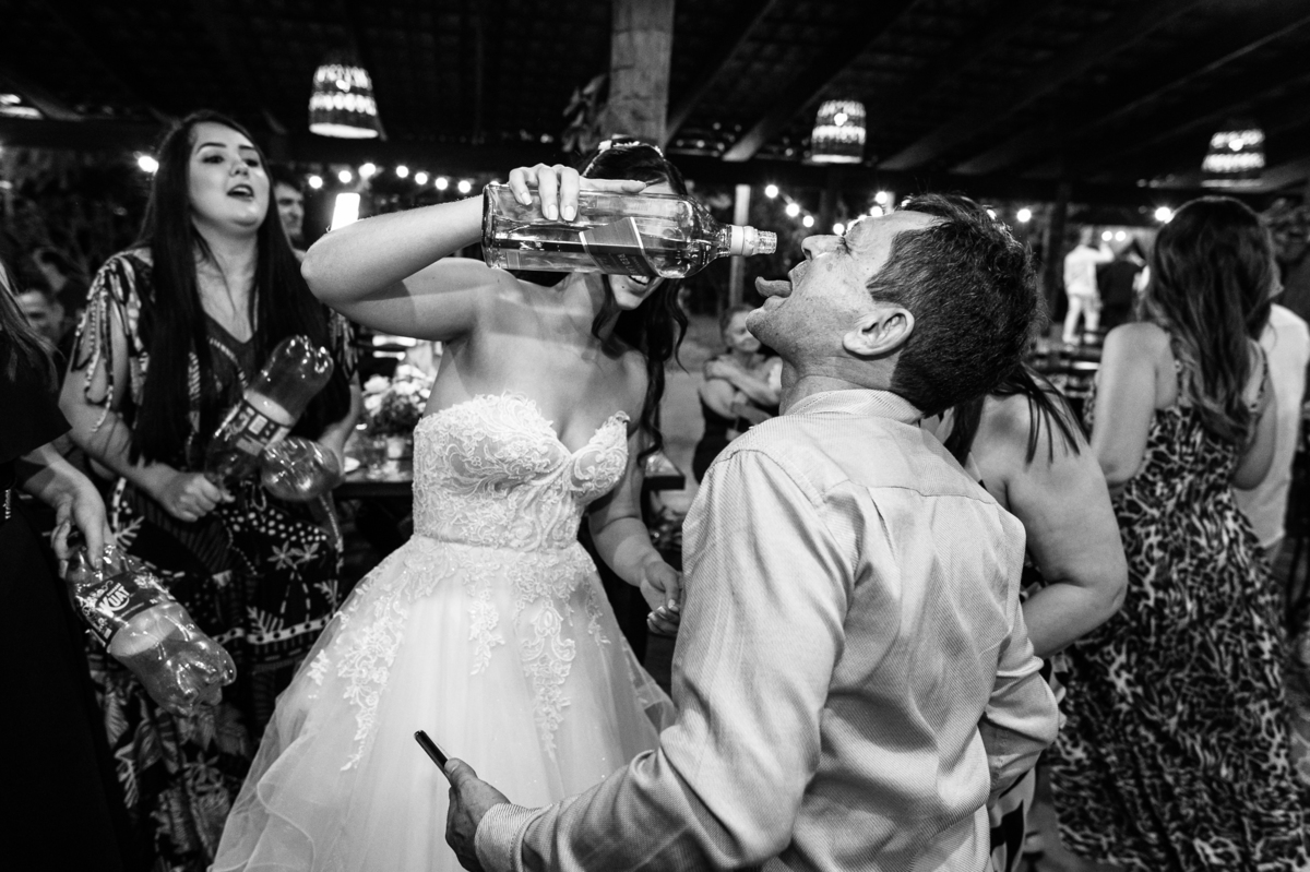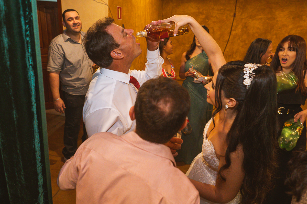 Depois, Nathan seguiu para o corte da gravata junto com seus padrinhos super animados. Rosiane foi levada quase que de supetão para também passar o sapatinho da noiva. Depois desse momento de diversão, eles foram animados pelo DJ Jacaré que colocou todo mundo pra dançar. E teve garrafa de whisky na boca de muitos convidados! A noiva percorreu a pista e ia desafiando seus amigos para uma dose sem medida. Nathan e Rosiane curtiram muito a festa. Dançaram com seus padrinhos, juntos na pista e também por todo local. A noiva jogou o seu buquê e algumas horas depois nós encerramos os trabalhos, com sentimento de dever mais do que cumprido.