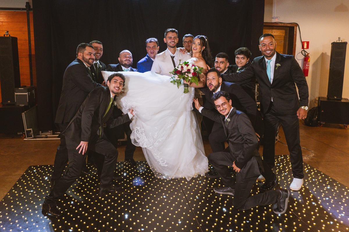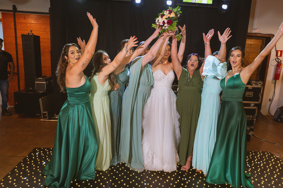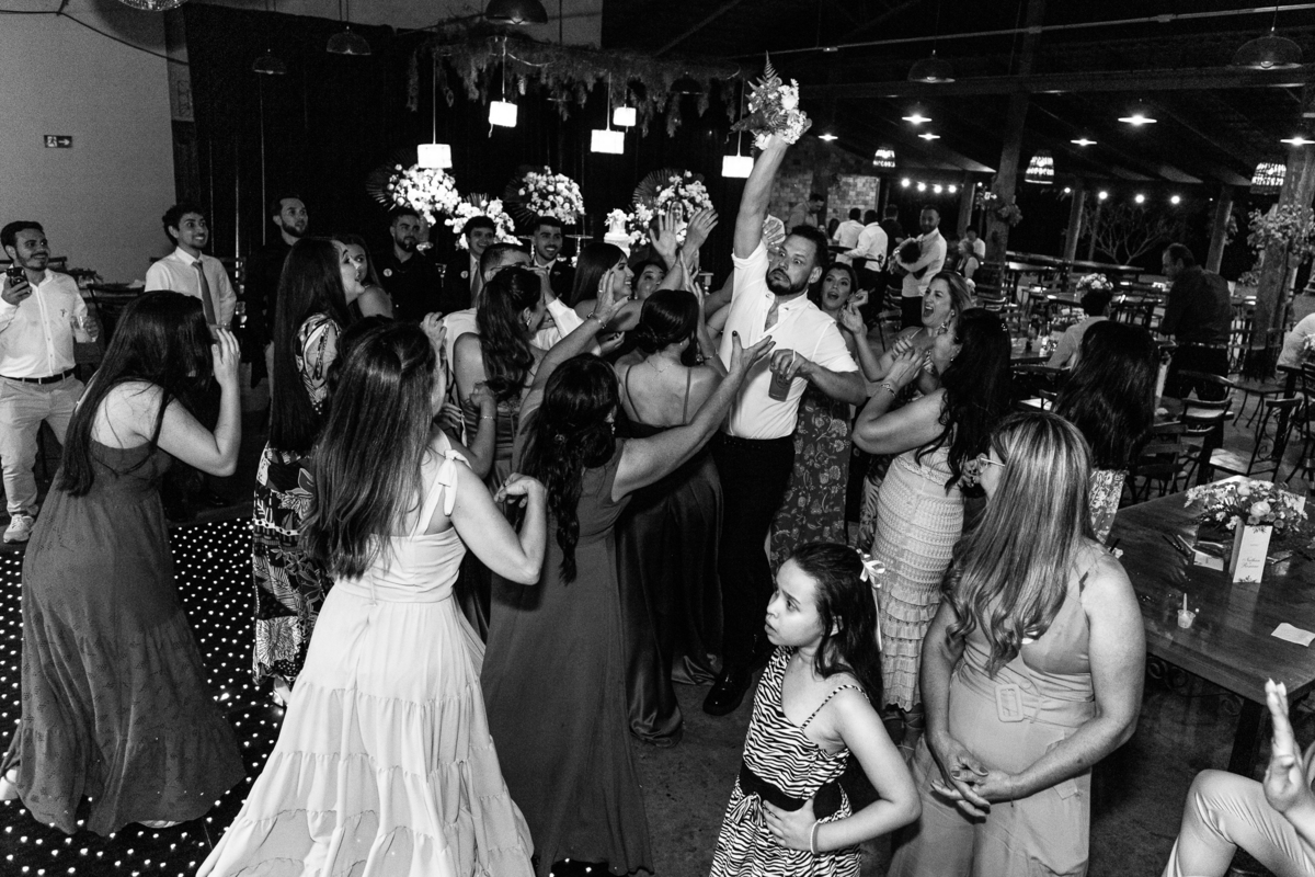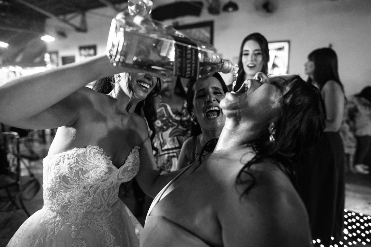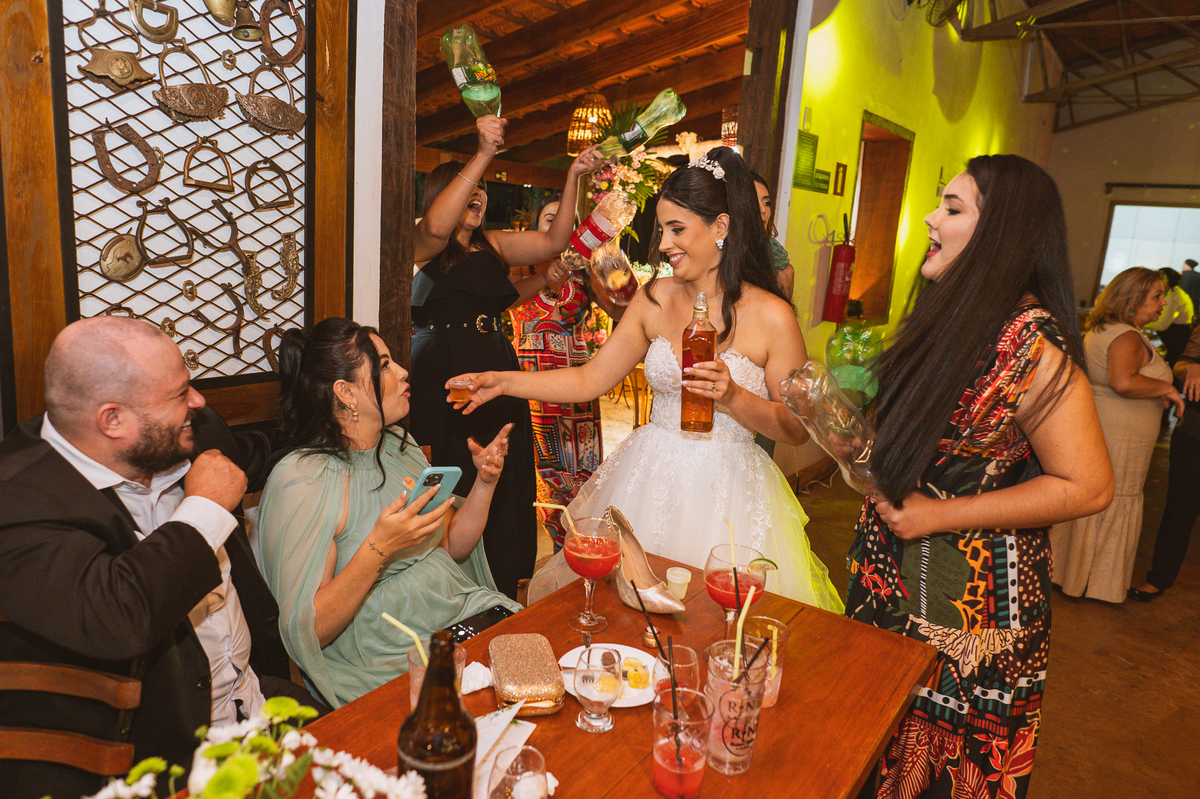 Depois, Nathan seguiu para o corte da gravata junto com seus padrinhos super animados. Rosiane foi levada quase que de supetão para também passar o sapatinho da noiva. Depois desse momento de diversão, eles foram animados pelo DJ Jacaré que colocou todo mundo pra dançar. E teve garrafa de whisky na boca de muitos convidados! A noiva percorreu a pista e ia desafiando seus amigos para uma dose sem medida. Nathan e Rosiane curtiram muito a festa. Dançaram com seus padrinhos, juntos na pista e também por todo local. A noiva jogou o seu buquê e algumas horas depois nós encerramos os trabalhos, com sentimento de dever mais do que cumprido.