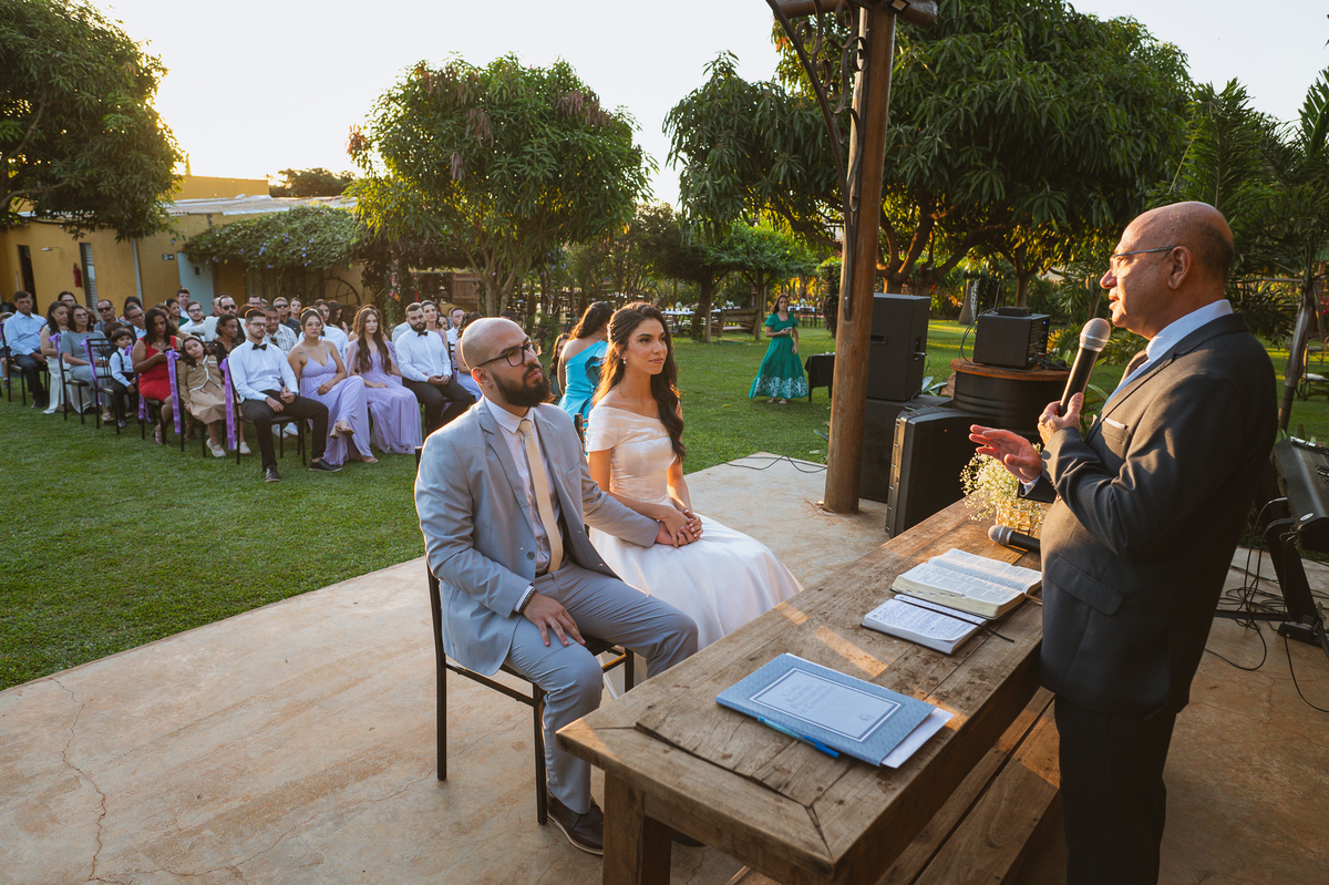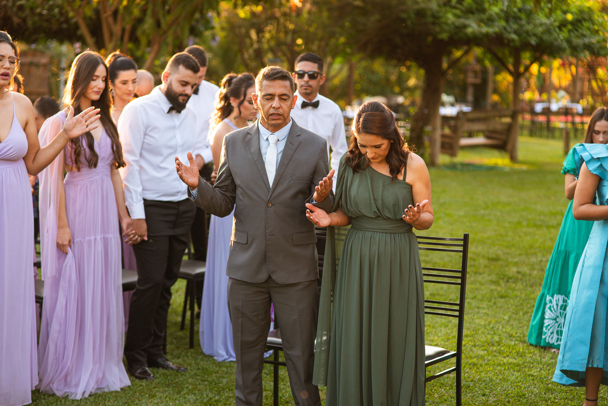 A música escolhida por ela começou a tocar e a porta foi aberta, revelando uma noiva esplêndida e muito sorridente. Ela caminhou vagarosamente, apoiada pelos seus pais que a acompanhavam de braços dados. Caio desceu do altar e caminhou rumo ao seu encontro final. Ele abraçou seu sogro e sua sogra, despedindo-se deles. Recebeu a mão de sua noiva diretamente do pai dela. Enfim, eles estavam frente a frente. Posicionaram-se um olhando nos olhos do outro e com um beijo da fronte da noiva, eles selaram aquele momento mais do que especial. Agora, os dois estavam caminhando juntos, rumo à bênção de Deus sobre sua aliança. Quem os recebeu foi o Pastor Adair dos Reis, pai do noivo. Ele teve o privilégio de celebrar inúmeros casamentos em que eu fotografei. Incluindo do seu outro filho e agora, o mais novo. Caio e Maria Eduarda iniciaram a celebração agradecendo à Deus, entoando um lindo cântico de agradecimento e todos juntos cantaram louvando ao Senhor juntamente com eles.