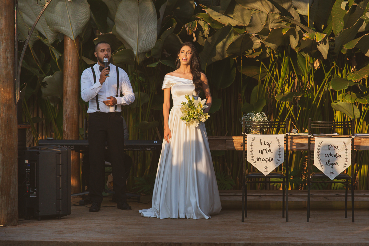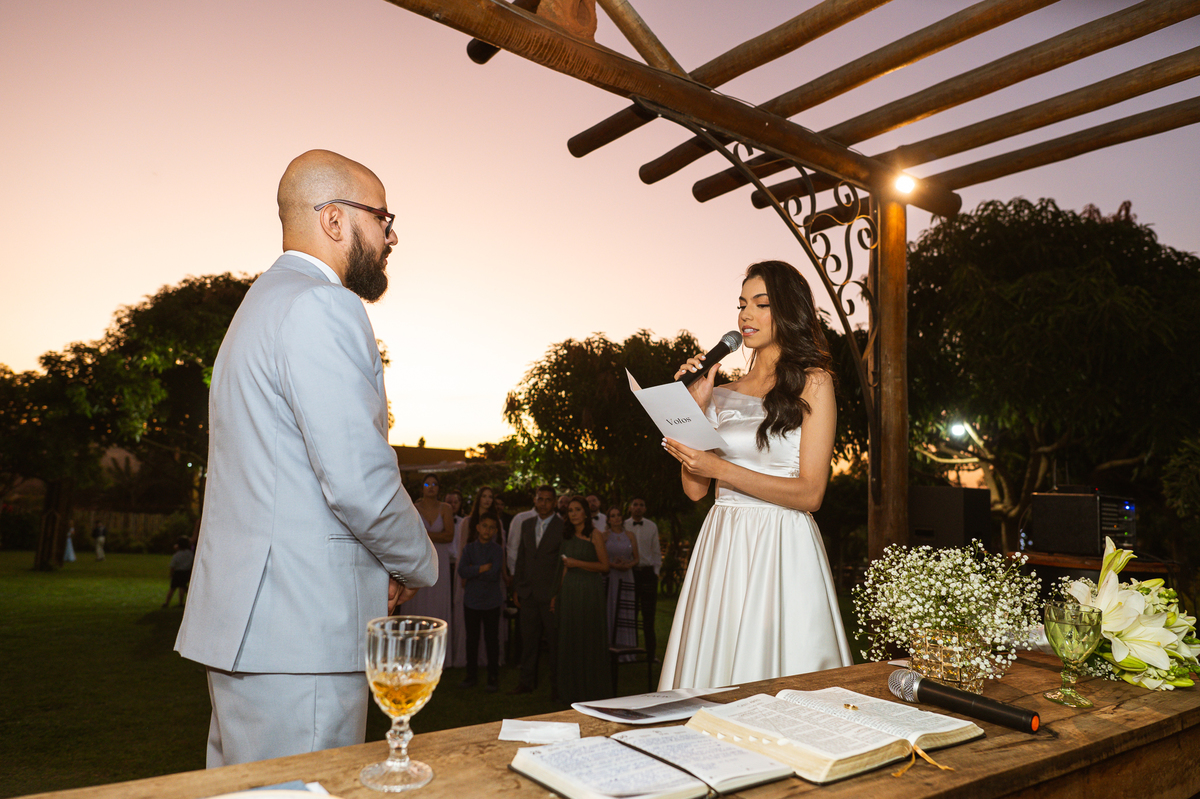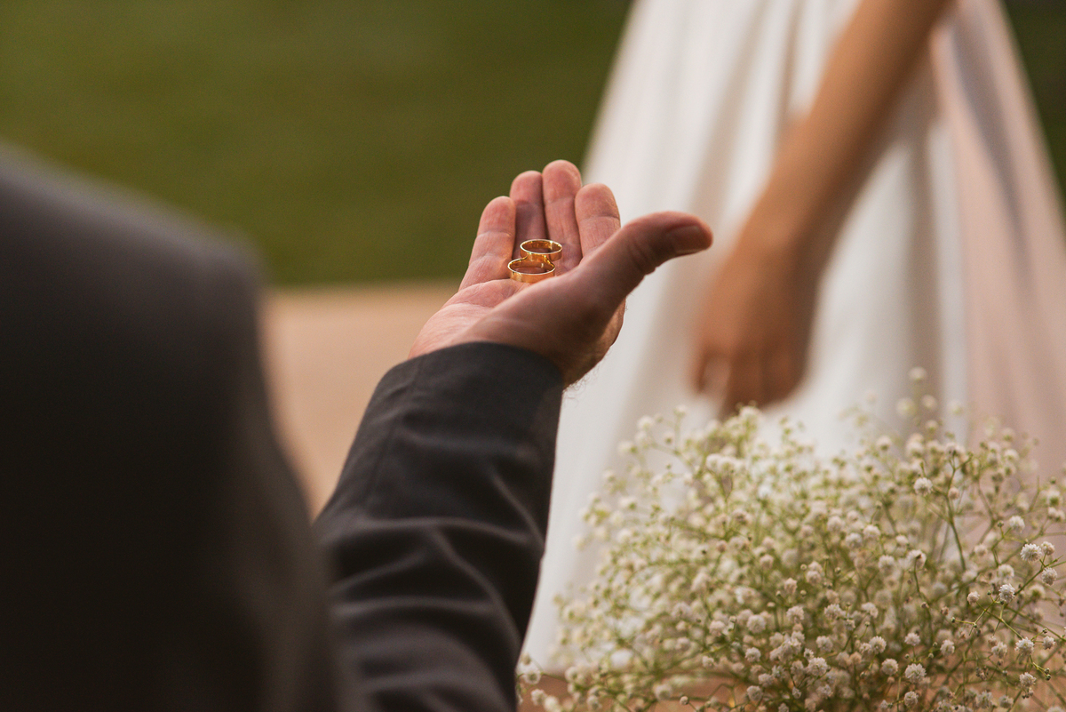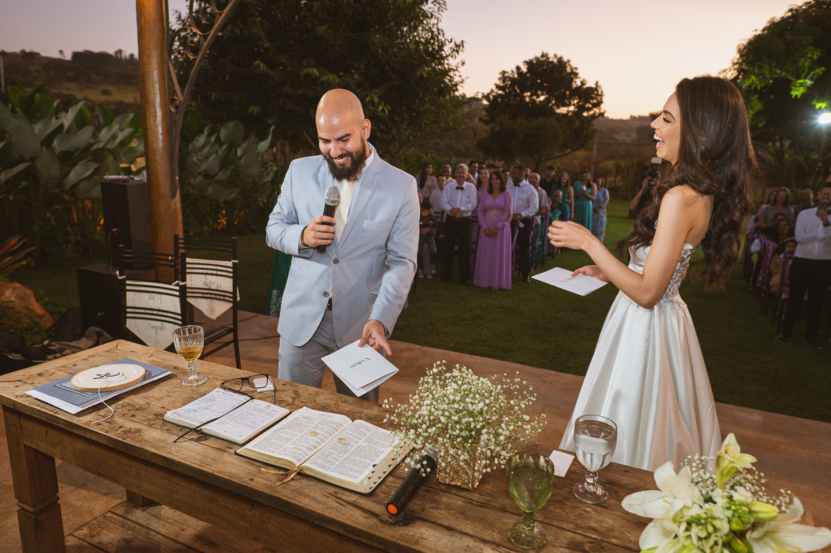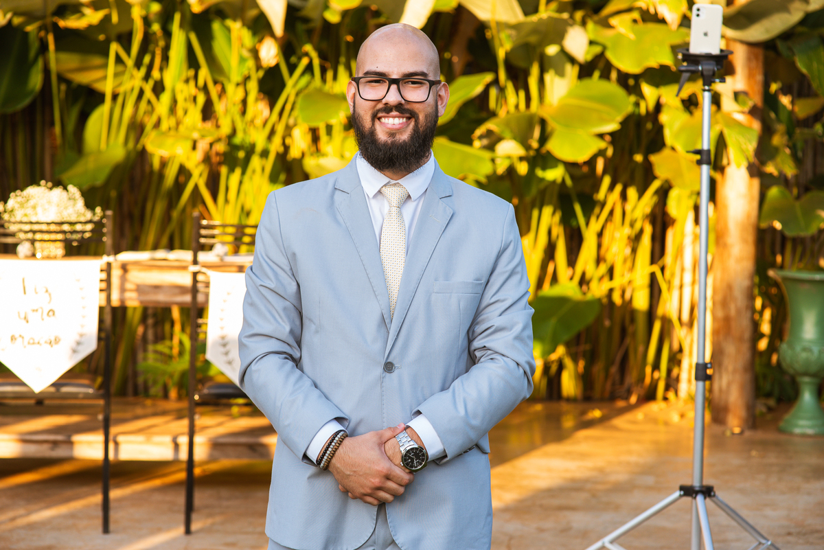 Celebrar o casamento dos dois filhos é uma honra imensa, não é? A palavra foi maravilhosa e muito tocante. Adair fez questão de dissertar acerca de alguns pontos que ele achou importante destacar aos dois. Foi tão edificante que nem vimos o tempo passar. E já era hora da entrada das alianças. Quem trouxe elas foi o Matteo, que fez uma entrada carregando as alianças de forma muito competente. Ao chegar perto dos noivos, ele entregou o porta alianças ao noivo que o chamou para que fizessem uma foto descontraída. E ele fez! Após ungir as alianças, os noivos fizeram seus votos. E meus amigos, que votos! Não teve quem não se emocionou com as palavras de Caio. Ele que sempre foi muito risonho e descontraído, não resistiu e ao meio de suas palavras, sua voz falhou e ele teve que enxugar as lágrimas. Ele contou sobre como ele se sentia incentivado pela sua noiva e sobre como ele se sentia especial.