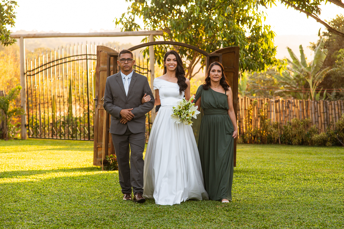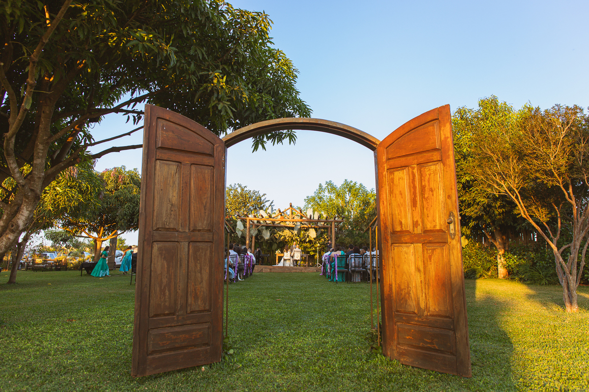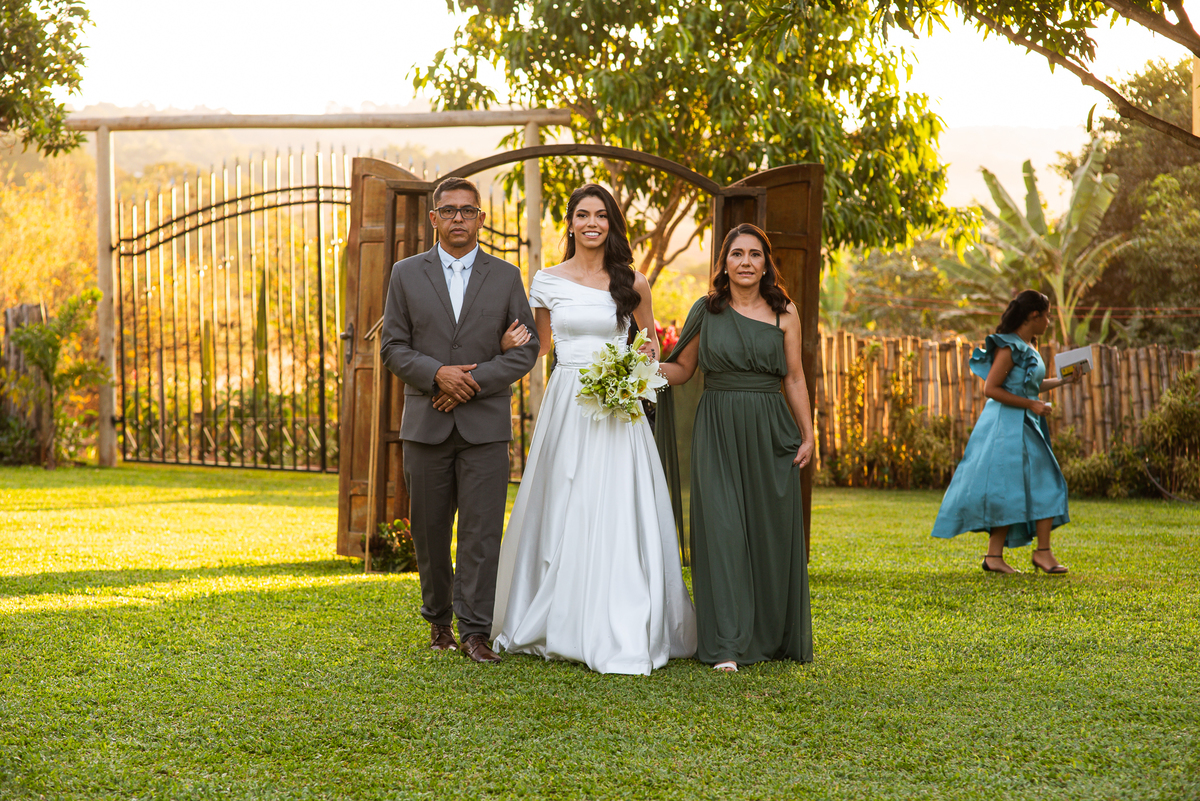 Enfim, os músicos se posicionaram e a cerimônia teve seu início. Os padrinhos todos vestidos com gravata borboleta entraram desfilando suas respectivas belezas. O noivo, de braços dados com sua mãe e seu pai, caminhou rumo ao altar todo sorridente e feliz. Deu até um tchauzinho para os convidados, típico dele. Ao despedir-se de sua mãe, ela não segurou as lágrimas e se emocionou intensamente. imagino todas as lembranças e momentos vividos que passaram pela sua cabeça naquele instante como um filme. Enfim, era chegada a hora mais aguardada. O portal foi fechado e o carro com a noiva parou por detrás dele. Ela desceu, segurou nas mãos de seus pais e se posicionou atrás da porta. A emoção tomou conta de todos. Apenas um portal os separava de se verem como noivos pela primeira vez.