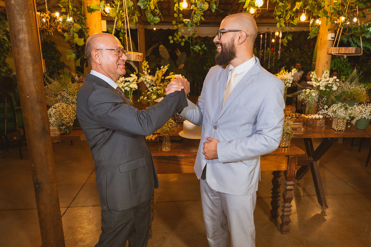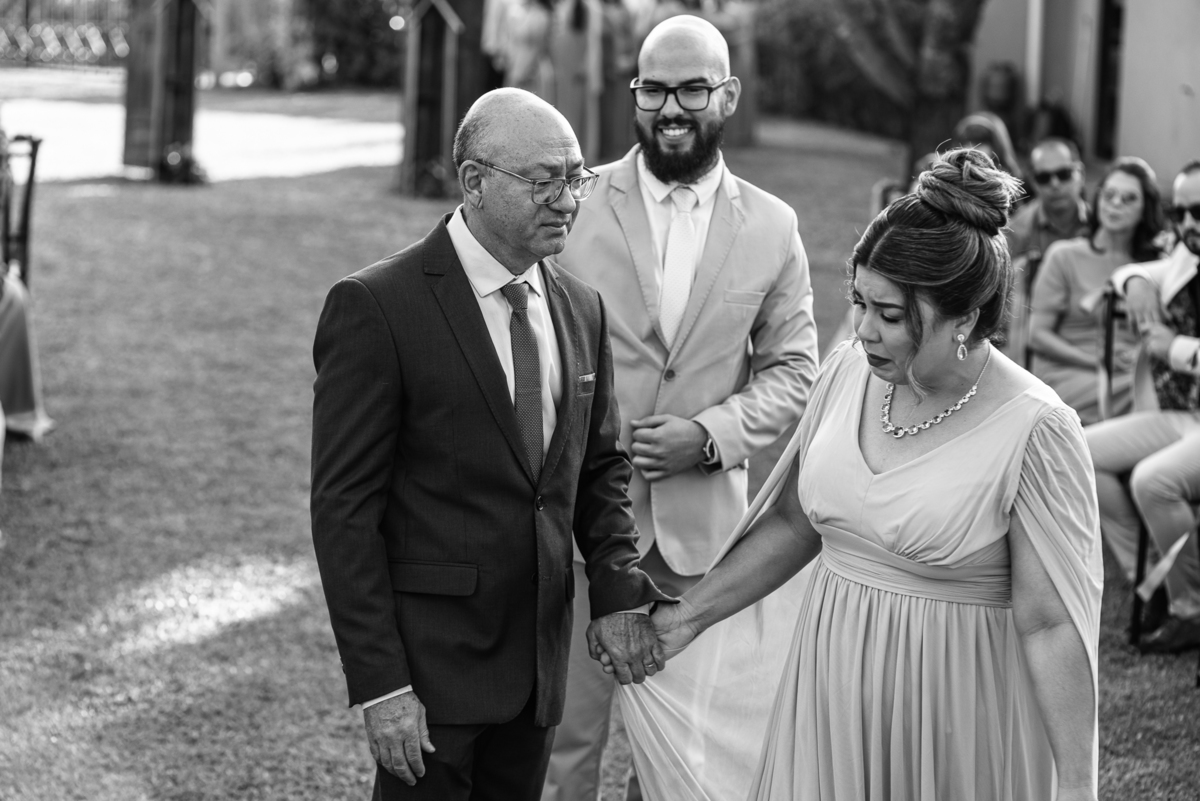 O altar estava maravilhoso, numa tarde gostosa de domingo. O sol aquecia os convidados ao passo que o vento fresco vinha como uma brisa leve para refrescar. A decoração feita pelos noivinhos contava também com fotos dos dois por alguns cantinhos. Dependuradas pelos espaços, elas balançavam no ritmo dos ventos. A organização preparou todos os padrinhos e os alinhou no local combinado. A noiva já estava no carro e aproveitamos para fazer algumas fotos dela com seu pai. Ele, que também não escondia a felicidade em ver sua filha tão linda, fez questão de elogiá-la dizendo como ela estava maravilhosa. Era sorriso pra todo lado!