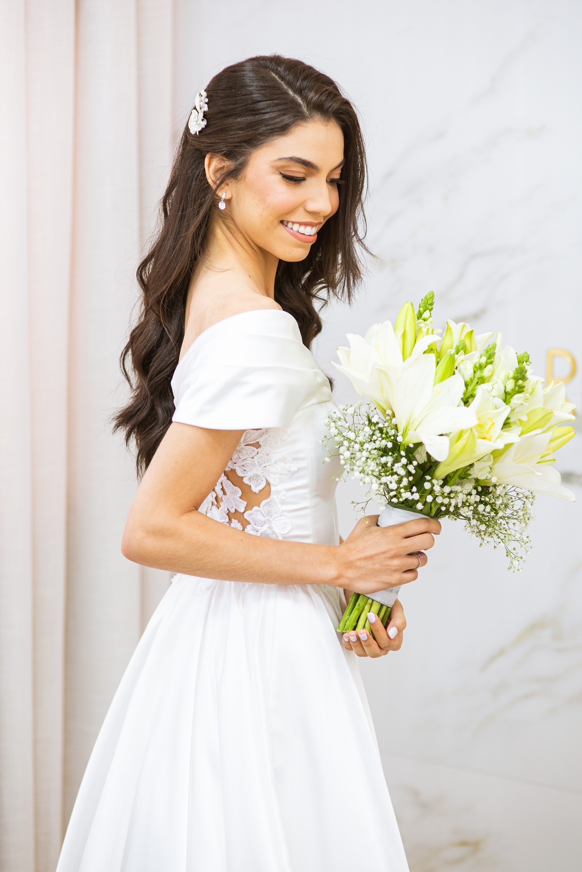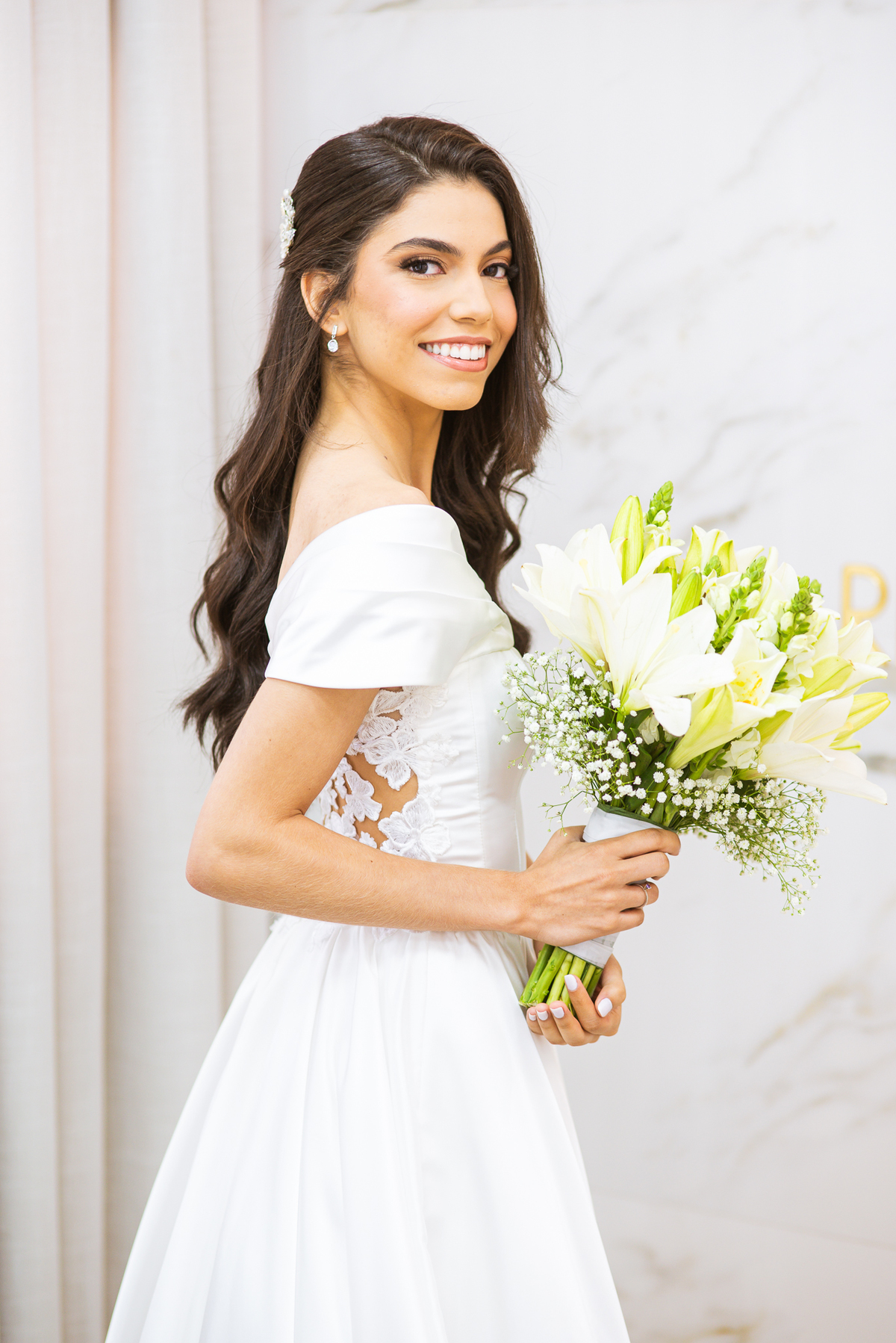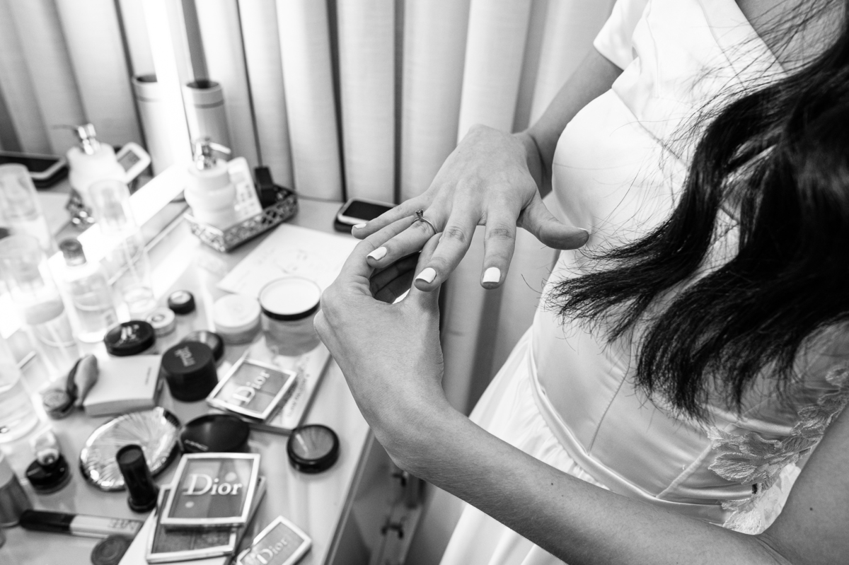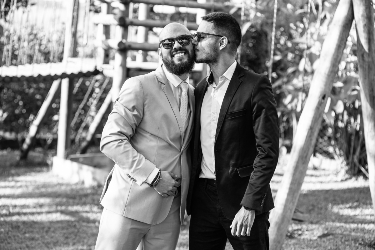 As duas estavam super tranquilas. Todo o stress que envolve a semana do casamento havia acabado no dia anterior. Detalhe: Eles escolheram o domingo para realizar sua celebração. Achei muito diferente e legal. Enquanto a produção acontecia, Caio Moisés também se arrumava em sua casa, junto de seu irmão e do seu pai. Ambos o ajudaram a colocar suas vestimentas e dar os toques finais ao seu traje. Com muita felicidade e também aquele sentimento de despedida, eles realizaram todas as fotografias juntos. Do lado de lá a produção estava a todo vapor. Maria estava praticamente pronta. Os pequenos retoques foram sendo efetuados e já já era a hora de colocar o vestido.