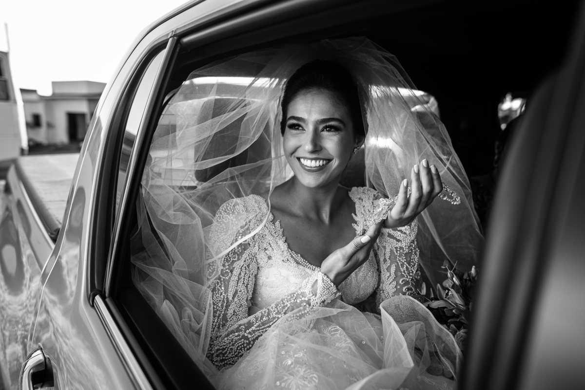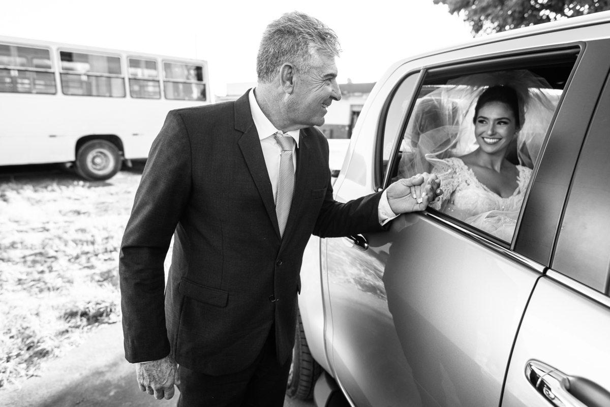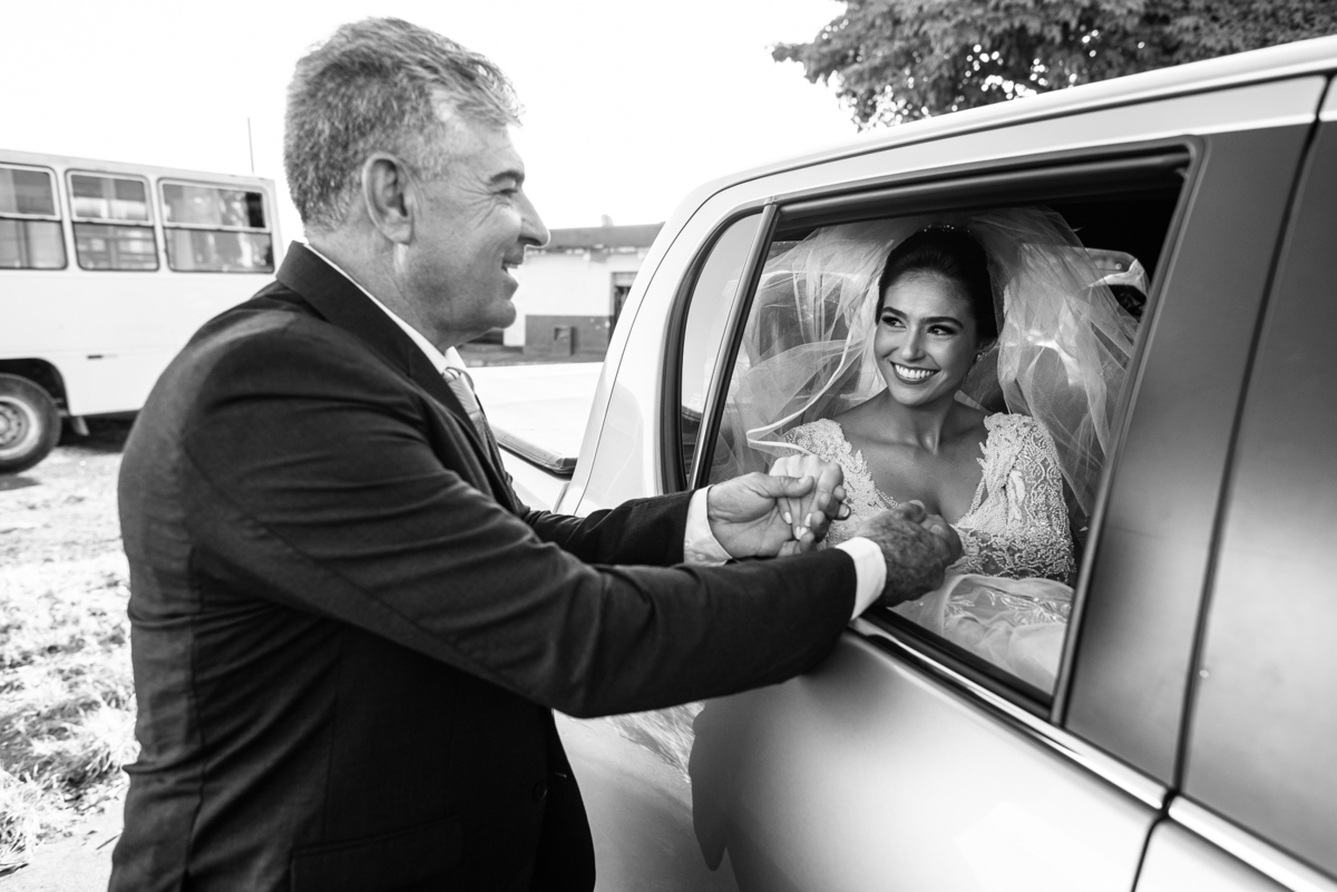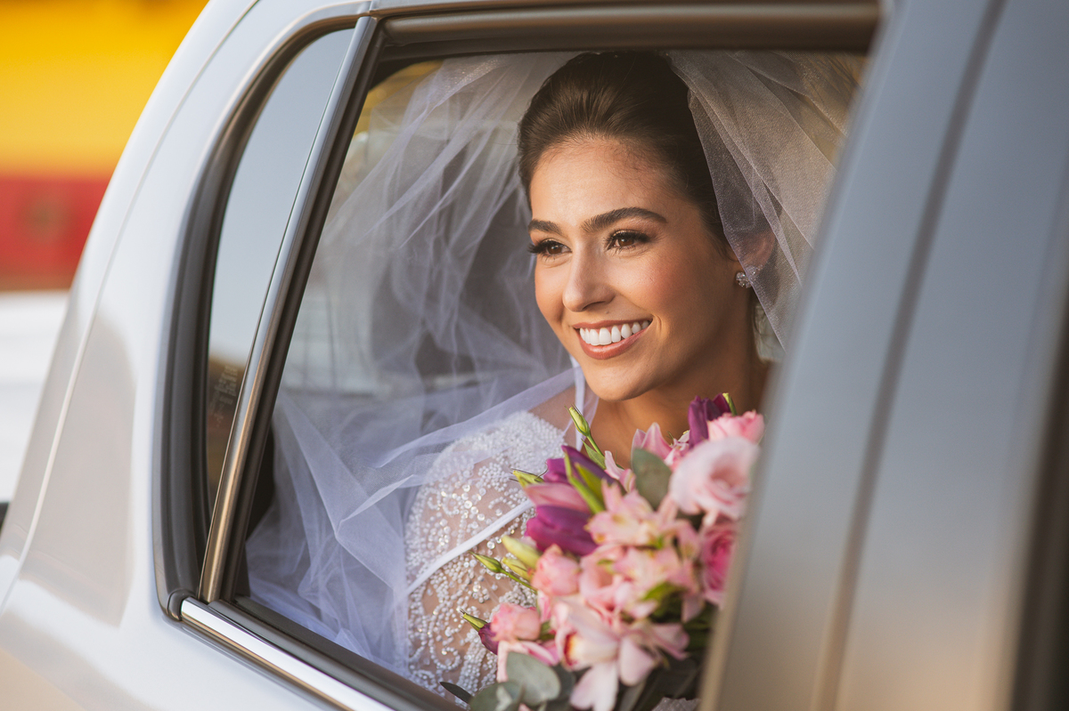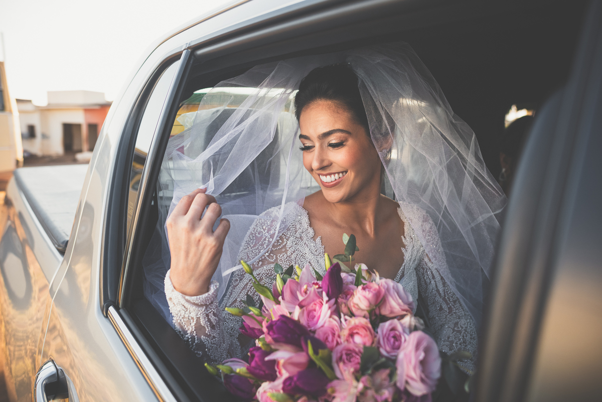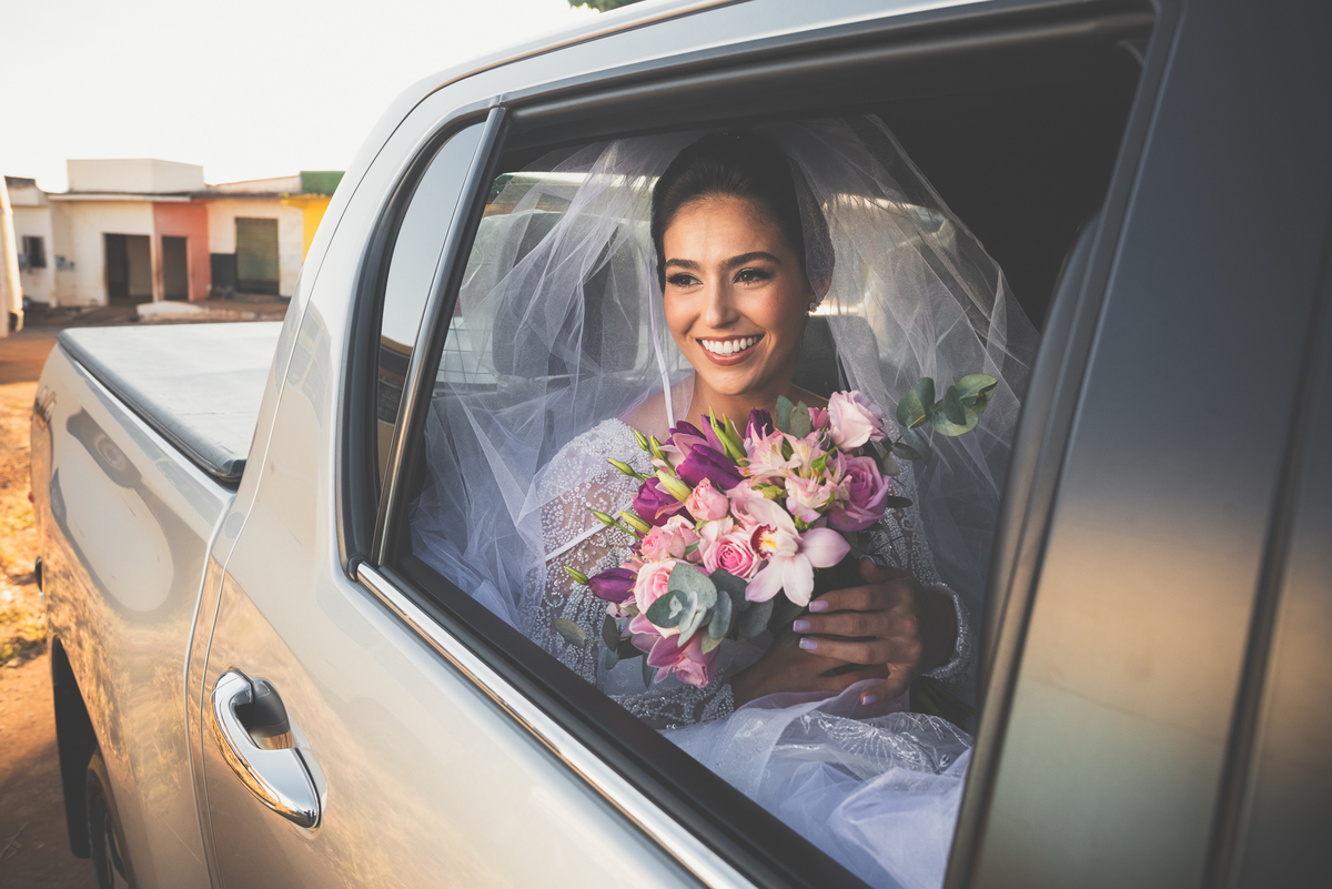 Fizemos algumas fotos com os pais e também alguns retratos da noiva sozinha. Ela estava espetacular. Todos queriam tirar foto, filmar e postar. Com um sorriso muito sincero, Jaqueline fez todas as fotografias que desejava no salão. Antes de sairmos, ainda tivemos outra grata surpresa. As amigas da noiva também enviaram um buquê de flores para ela. Quem entregou o buquê e abraçou a noiva foi sua amiga Jéssica, que indicou nosso trabalho para Jaqueline. Enfim, partimos para a cidade de São Gotardo. Eu estava muito apreensivo. Esse tipo de deslocamento é muito arriscado, quando se faz na hora do casamento. Apesar de estarmos bem adiantado, caso acontecesse algo, seria muito complicado resolver e chegar a tempo. Mas como tenho um Deus maravilhoso, fomos em paz e chegamos com mais de uma hora adiantados. Chegamos na porta da Igreja e nos posicionamos mais à frente, para que nenhum convidado visse a noiva antes. Fizemos várias fotos no carro, com tempo sobrando. É maravilhoso trabalhar com tempo sobrando assim, quase não acontece.