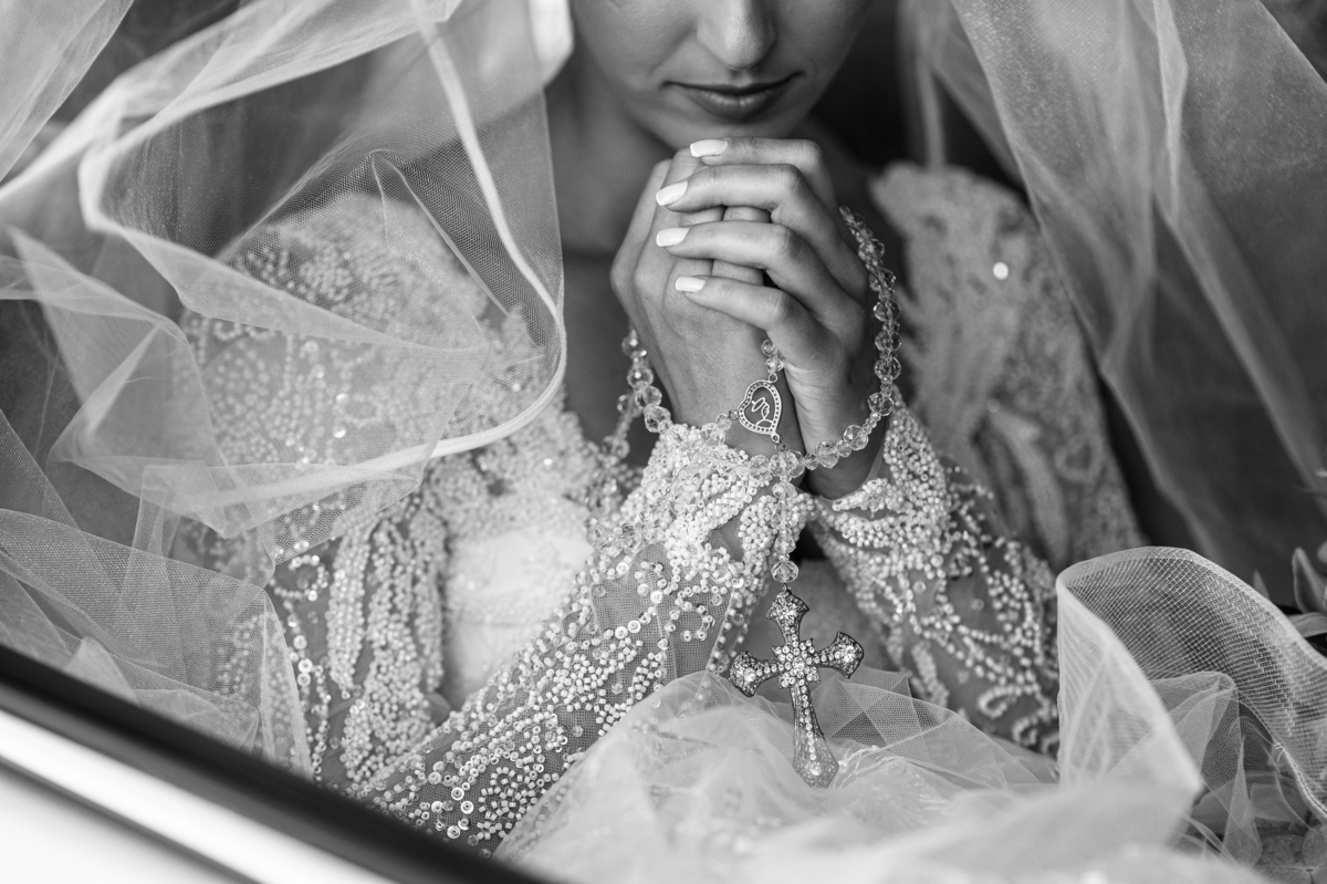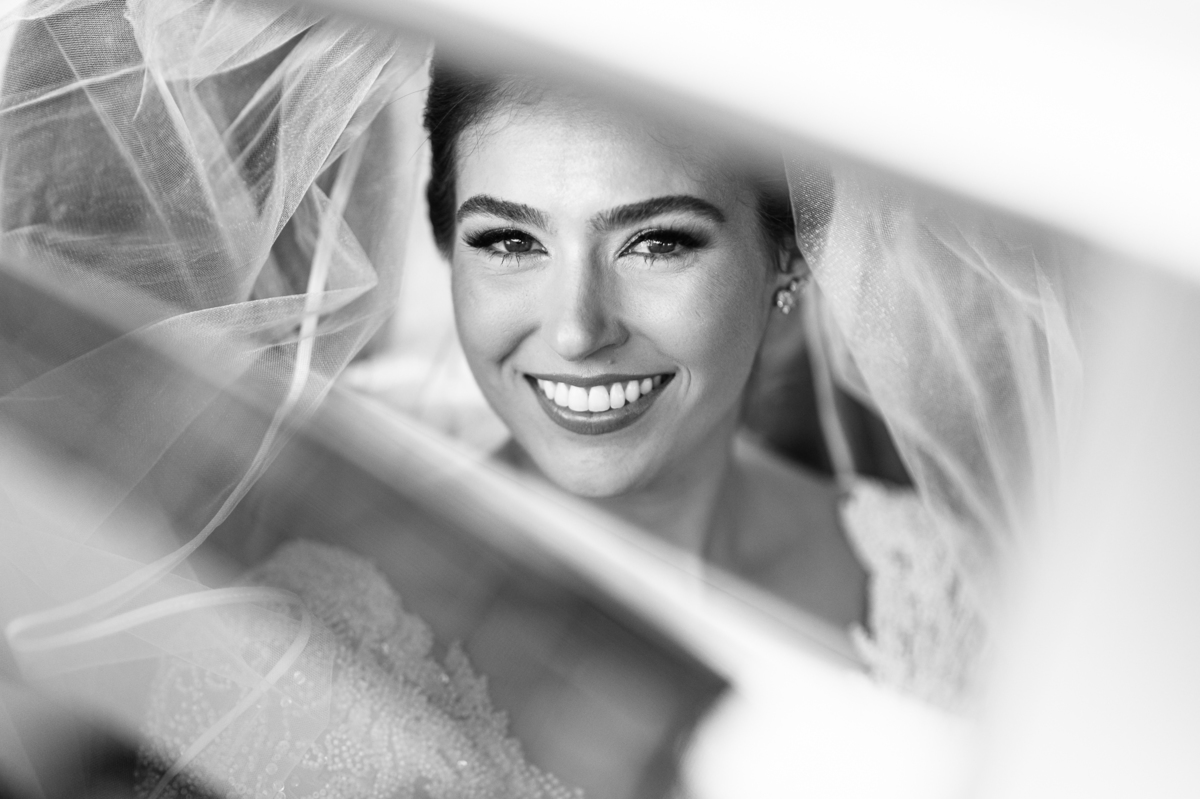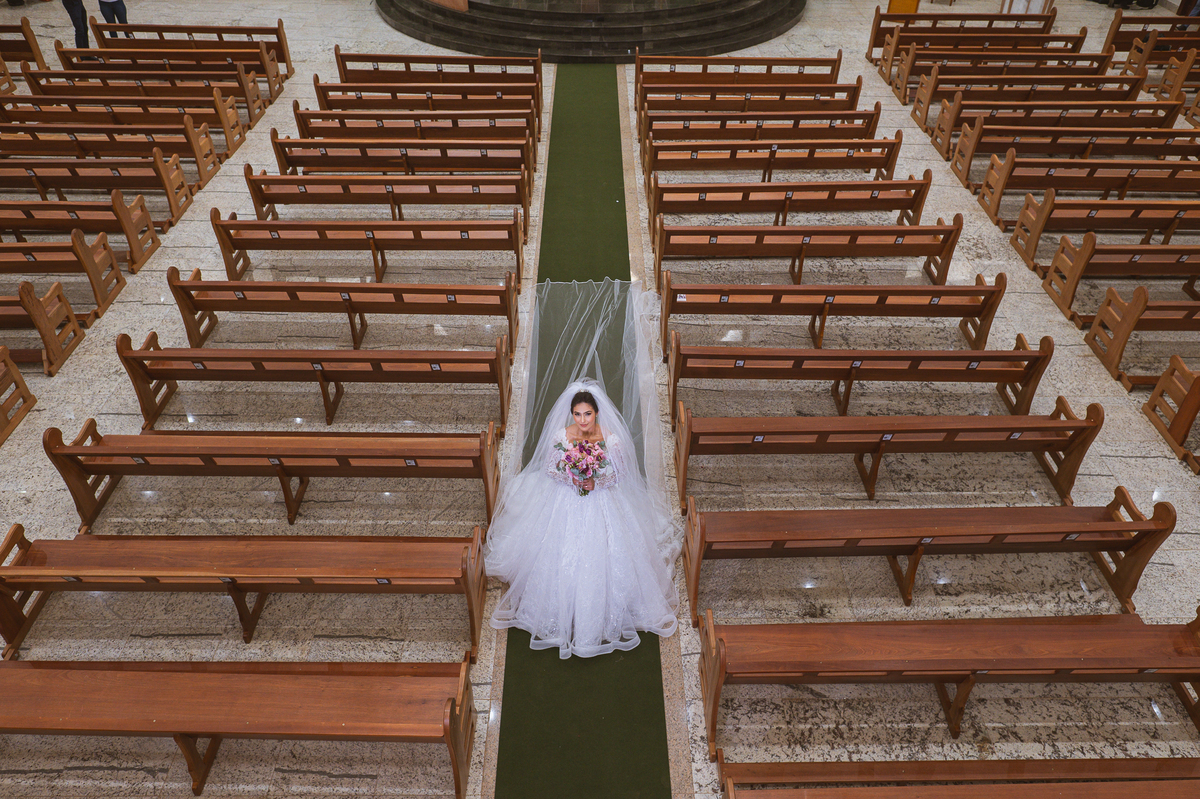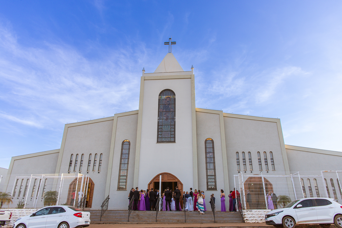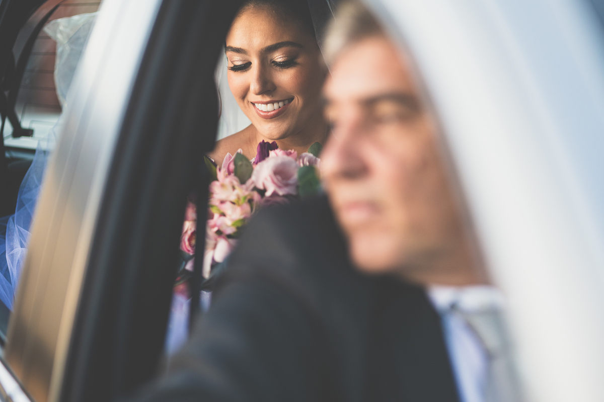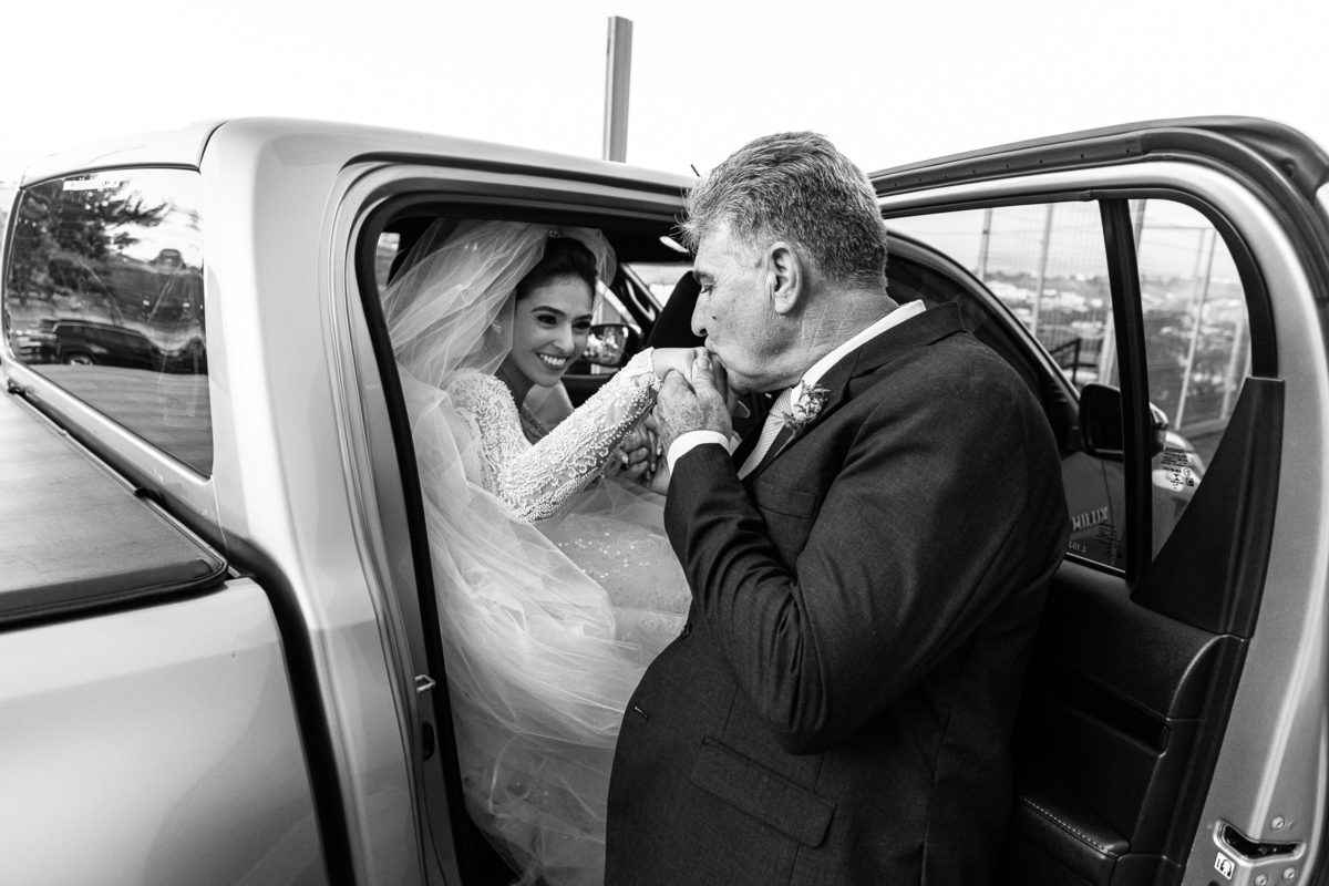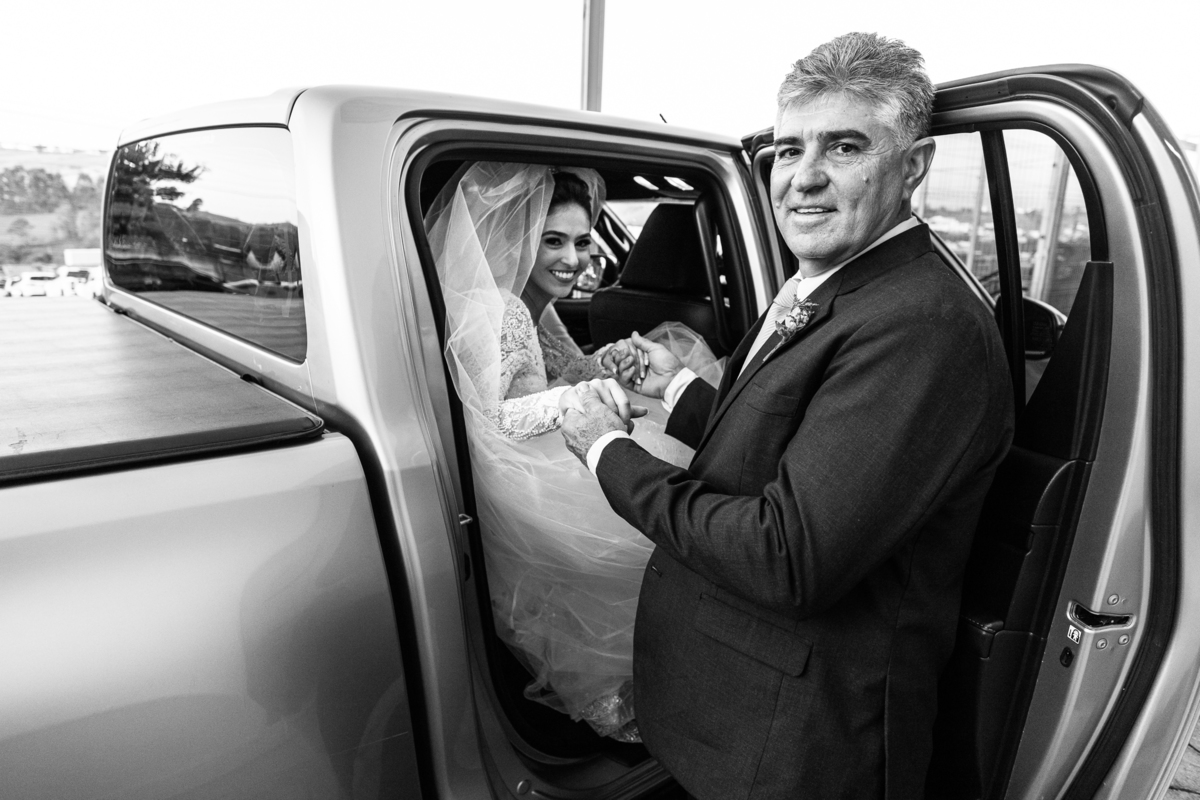 Fizemos algumas fotos com os pais e também alguns retratos da noiva sozinha. Ela estava espetacular. Todos queriam tirar foto, filmar e postar. Com um sorriso muito sincero, Jaqueline fez todas as fotografias que desejava no salão. Antes de sairmos, ainda tivemos outra grata surpresa. As amigas da noiva também enviaram um buquê de flores para ela. Quem entregou o buquê e abraçou a noiva foi sua amiga Jéssica, que indicou nosso trabalho para Jaqueline. Enfim, partimos para a cidade de São Gotardo. Eu estava muito apreensivo. Esse tipo de deslocamento é muito arriscado, quando se faz na hora do casamento. Apesar de estarmos bem adiantado, caso acontecesse algo, seria muito complicado resolver e chegar a tempo. Mas como tenho um Deus maravilhoso, fomos em paz e chegamos com mais de uma hora adiantados. Chegamos na porta da Igreja e nos posicionamos mais à frente, para que nenhum convidado visse a noiva antes. Fizemos várias fotos no carro, com tempo sobrando. É maravilhoso trabalhar com tempo sobrando assim, quase não acontece.