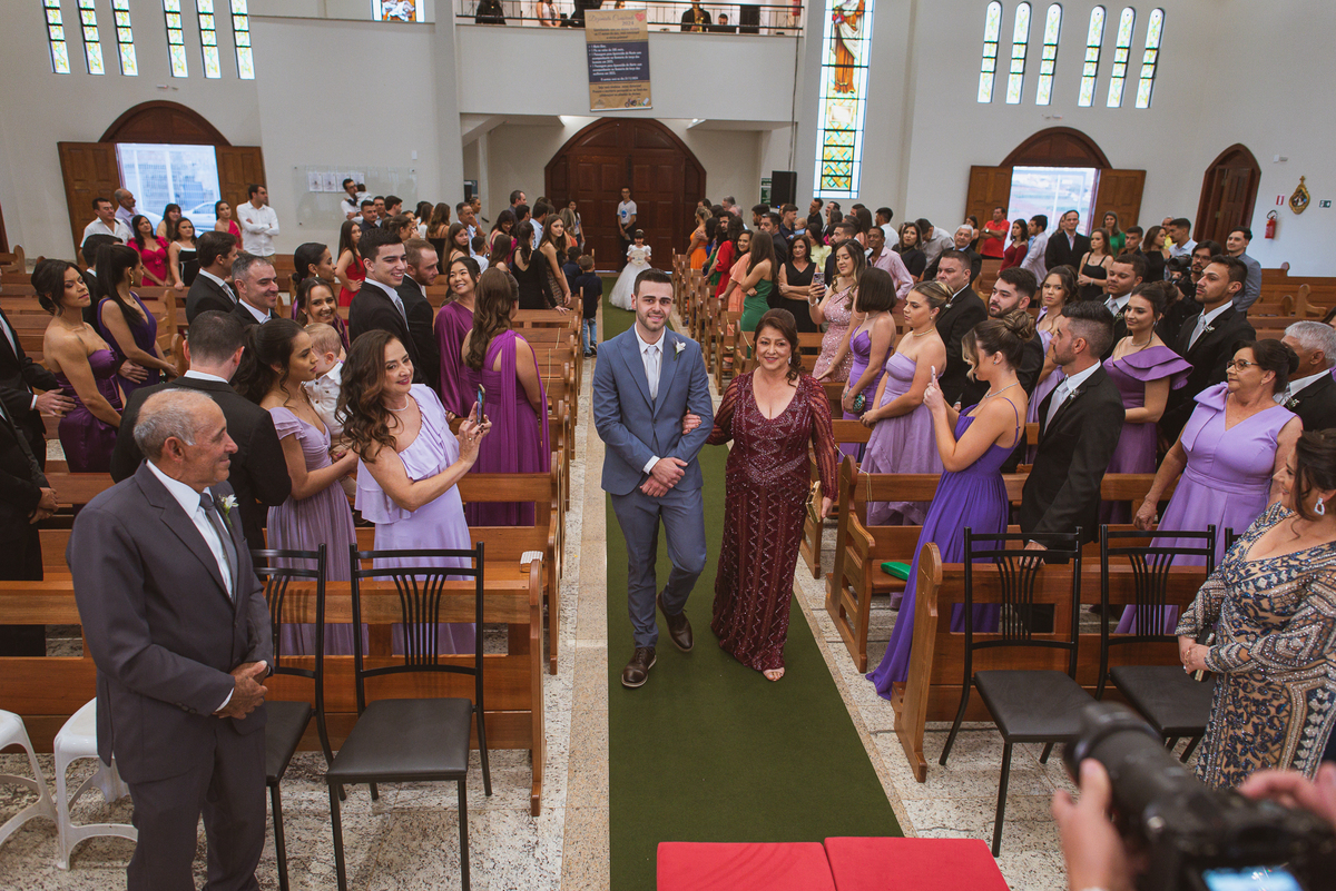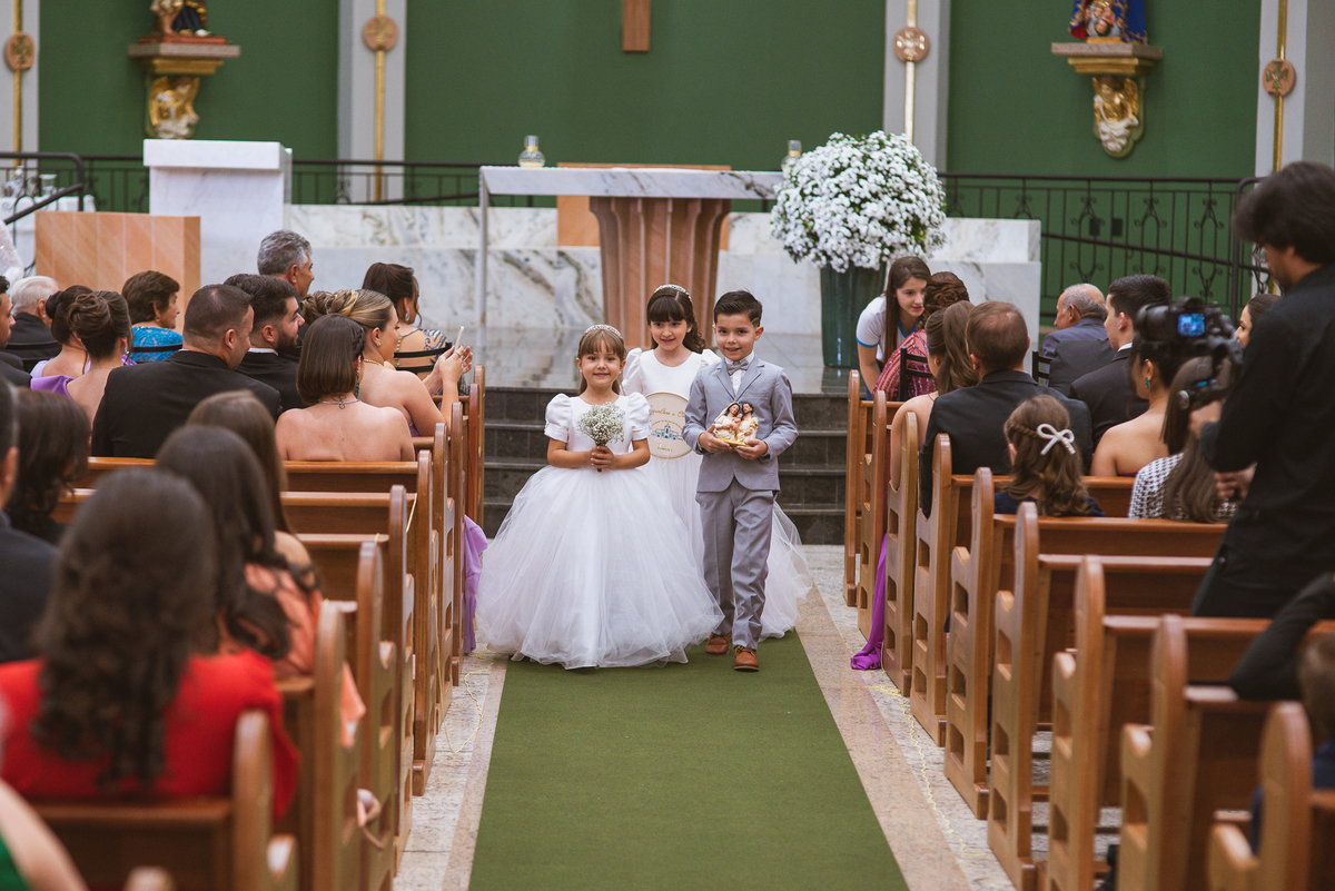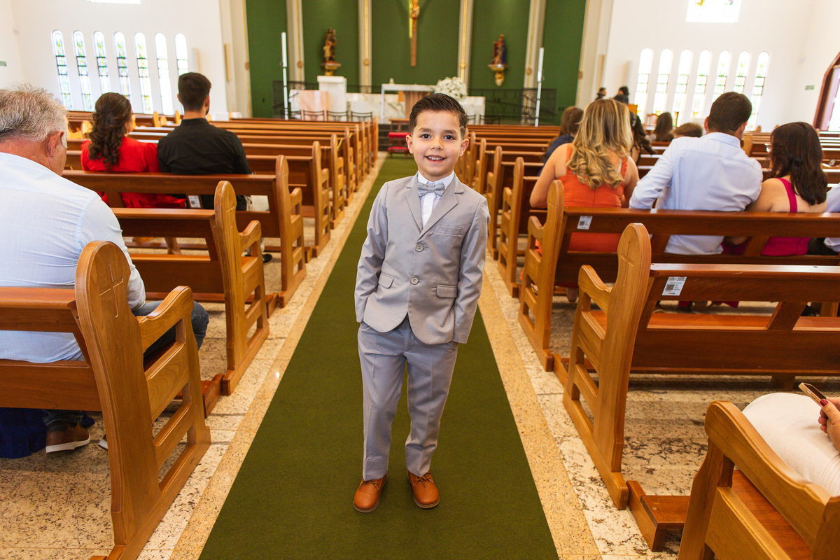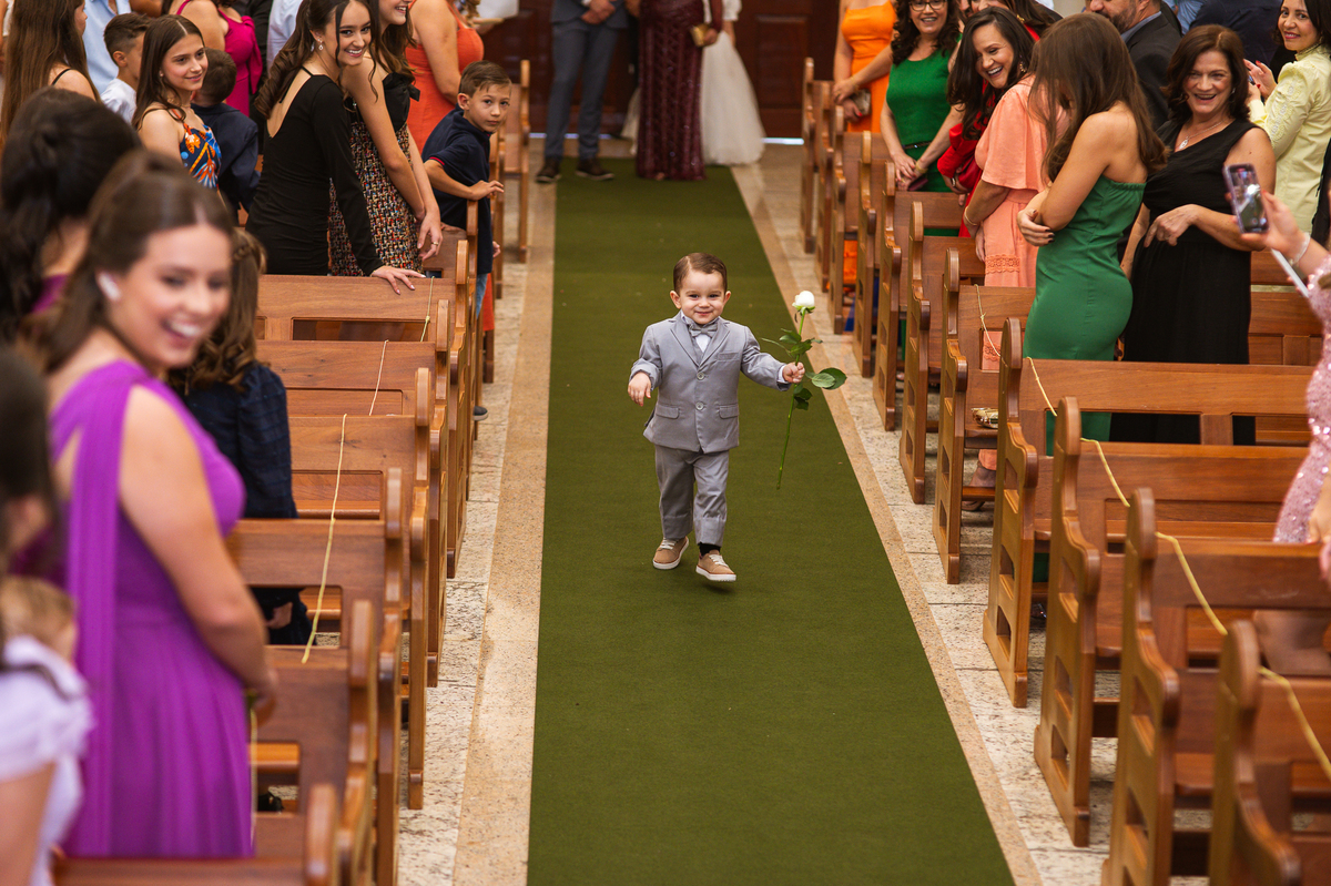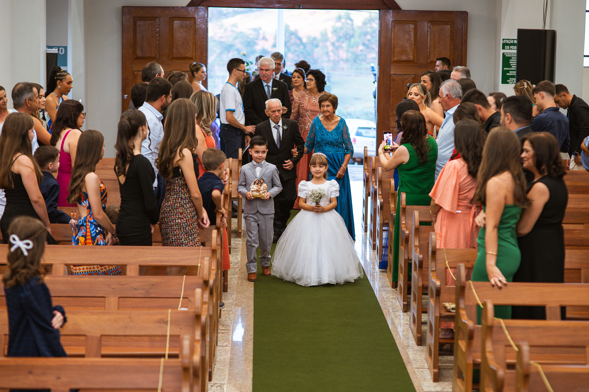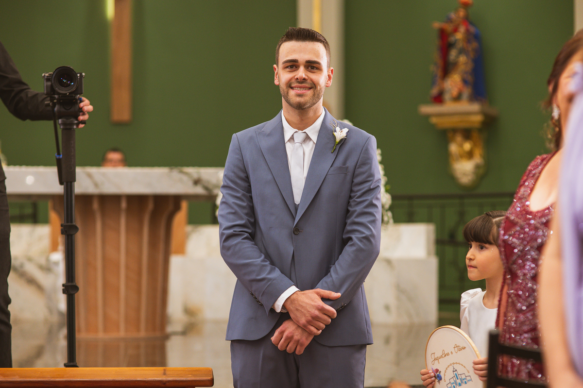 A Igreja é e estava ainda mais bela nesse dia. Os primeiros a entrar foram os pais e avós, logo depois os pajens. E foi uma graça! Todos ficaram muito alegres com o pequenino pajem entrando correndo, com uma rosa na mão. Foi lindo de se ver. Então, era hora da entrada do noivo. Otávio entrou de braços dados com sua mãe. Por onde passou, sorriu e demonstrou toda sua felicidade. Ao fim do corredor, ele despediu-se de sua mãe que o abraçou com todo carinho, fazendo o sinal da Cruz em sua testa como forma de abençoar aquele momento. Os padrinhos entraram e as porta da Igreja se fecharam. São poucos minutos, mas parecem uma verdadeira eternidade pra quem está do lado de cá esperando. Jaqueline se posicionou do lado de fora com seu pai, ele visivelmente emocionado. A noiva respirava fundo, olhava para cima tentando amenizar a ansiedade do momento.