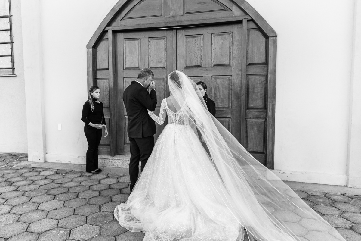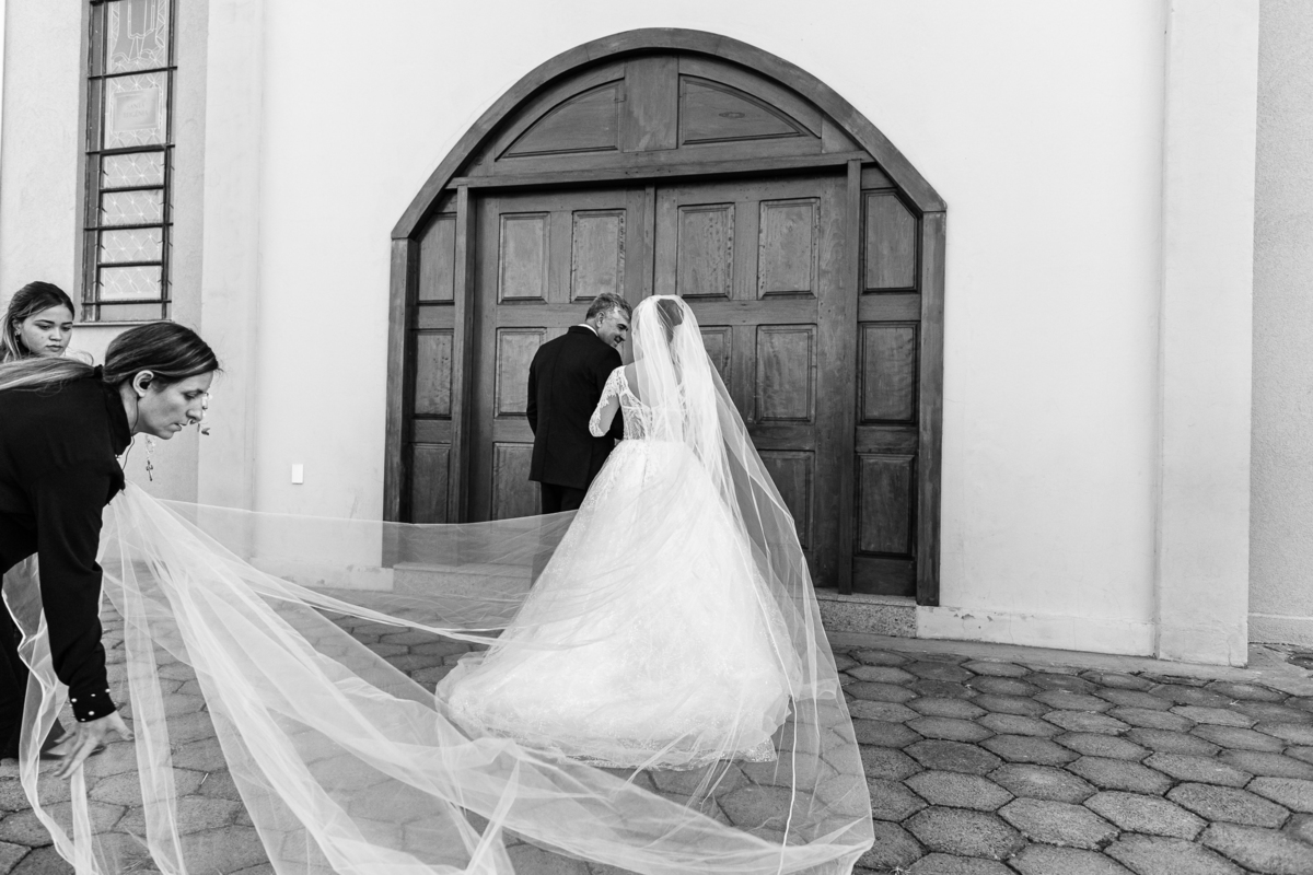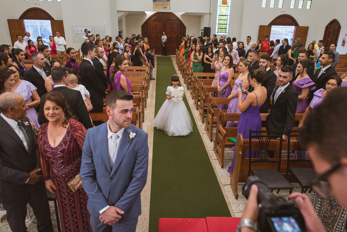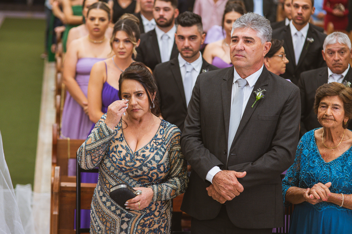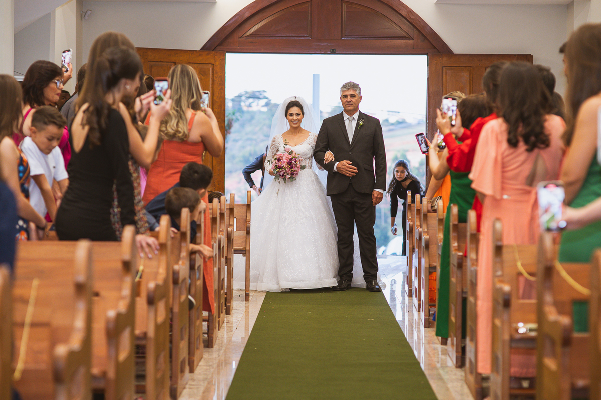 A Igreja é e estava ainda mais bela nesse dia. Os primeiros a entrar foram os pais e avós, logo depois os pajens. E foi uma graça! Todos ficaram muito alegres com o pequenino pajem entrando correndo, com uma rosa na mão. Foi lindo de se ver. Então, era hora da entrada do noivo. Otávio entrou de braços dados com sua mãe. Por onde passou, sorriu e demonstrou toda sua felicidade. Ao fim do corredor, ele despediu-se de sua mãe que o abraçou com todo carinho, fazendo o sinal da Cruz em sua testa como forma de abençoar aquele momento. Os padrinhos entraram e as porta da Igreja se fecharam. São poucos minutos, mas parecem uma verdadeira eternidade pra quem está do lado de cá esperando. Jaqueline se posicionou do lado de fora com seu pai, ele visivelmente emocionado. A noiva respirava fundo, olhava para cima tentando amenizar a ansiedade do momento.