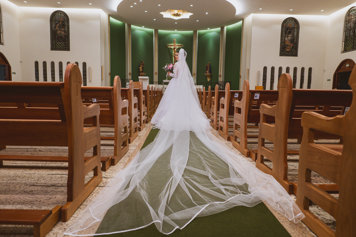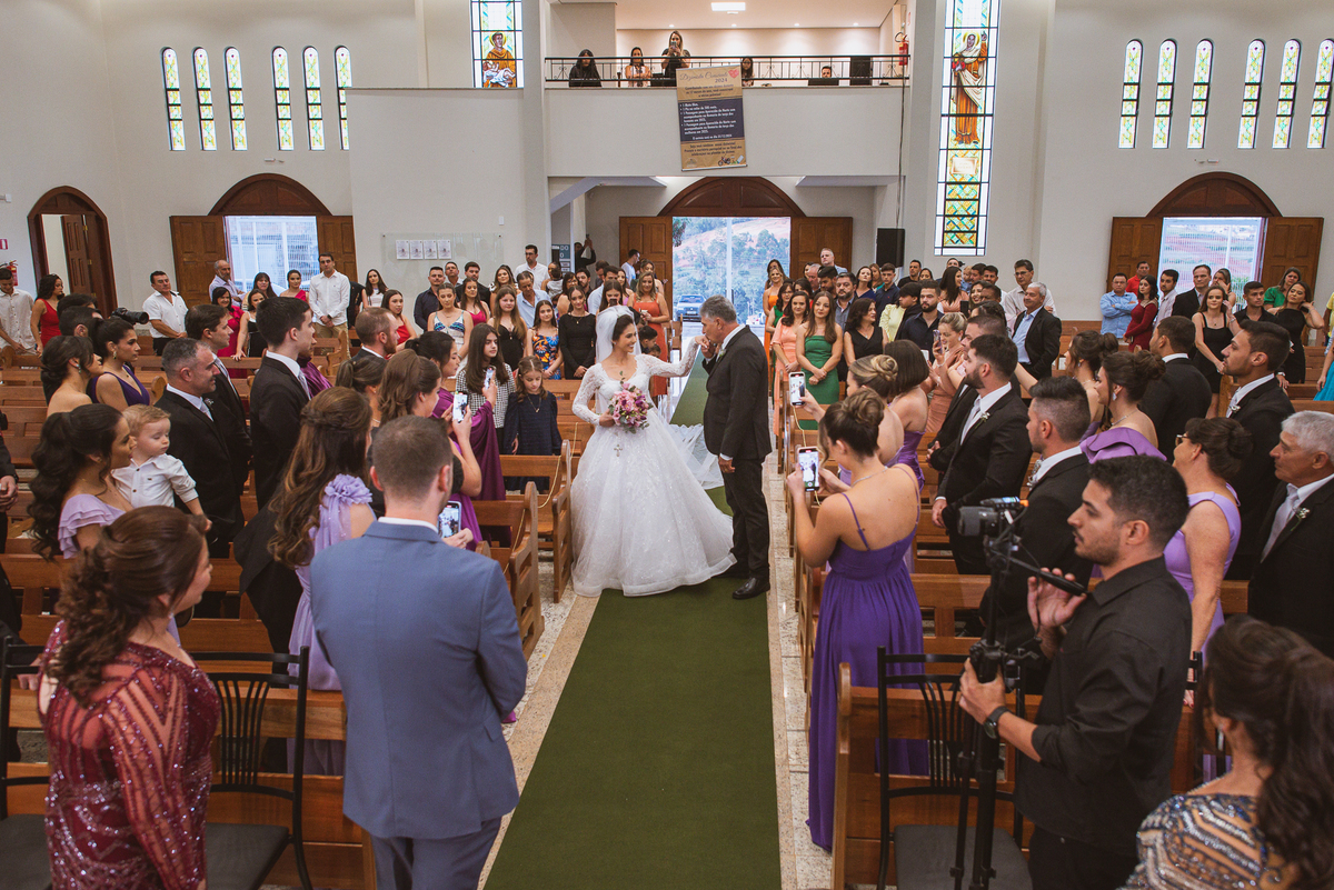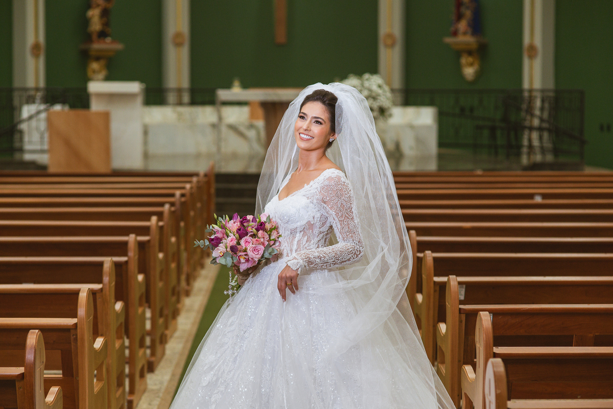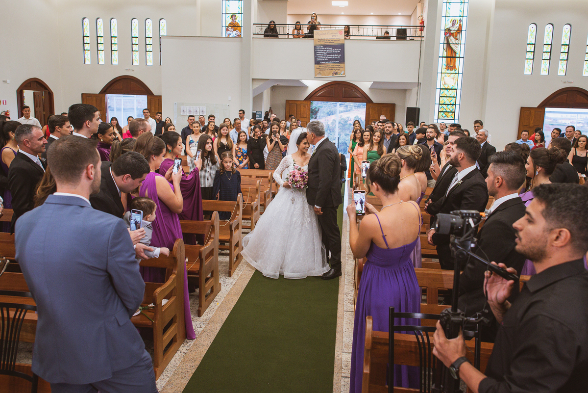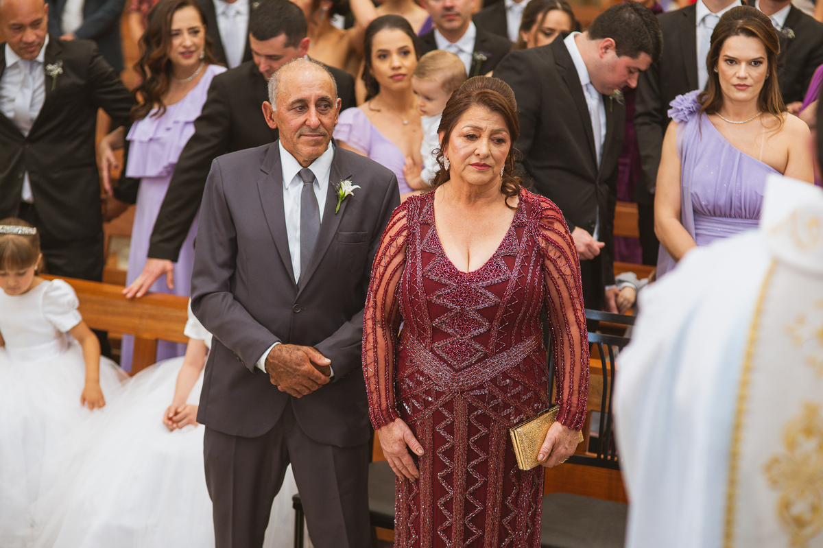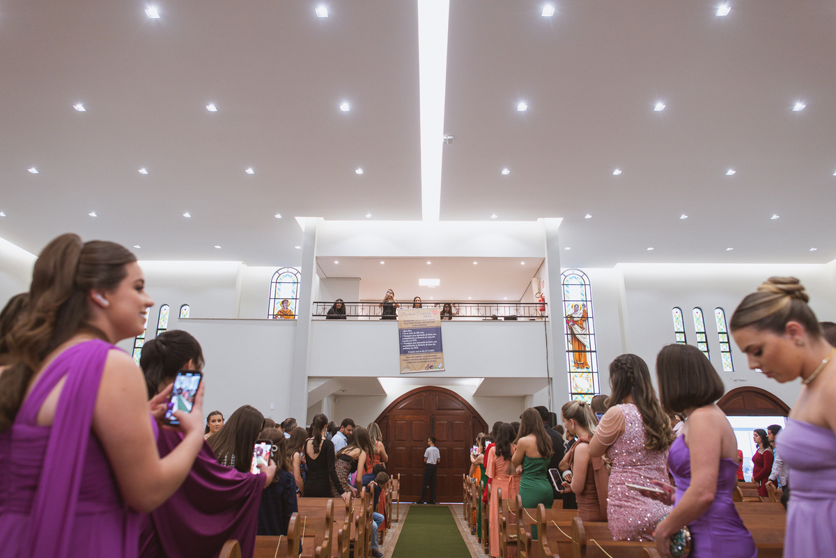 A Igreja é e estava ainda mais bela nesse dia. Os primeiros a entrar foram os pais e avós, logo depois os pajens. E foi uma graça! Todos ficaram muito alegres com o pequenino pajem entrando correndo, com uma rosa na mão. Foi lindo de se ver. Então, era hora da entrada do noivo. Otávio entrou de braços dados com sua mãe. Por onde passou, sorriu e demonstrou toda sua felicidade. Ao fim do corredor, ele despediu-se de sua mãe que o abraçou com todo carinho, fazendo o sinal da Cruz em sua testa como forma de abençoar aquele momento. Os padrinhos entraram e as porta da Igreja se fecharam. São poucos minutos, mas parecem uma verdadeira eternidade pra quem está do lado de cá esperando. Jaqueline se posicionou do lado de fora com seu pai, ele visivelmente emocionado. A noiva respirava fundo, olhava para cima tentando amenizar a ansiedade do momento.