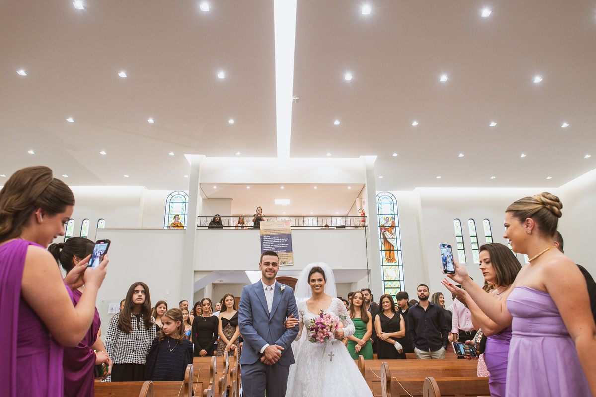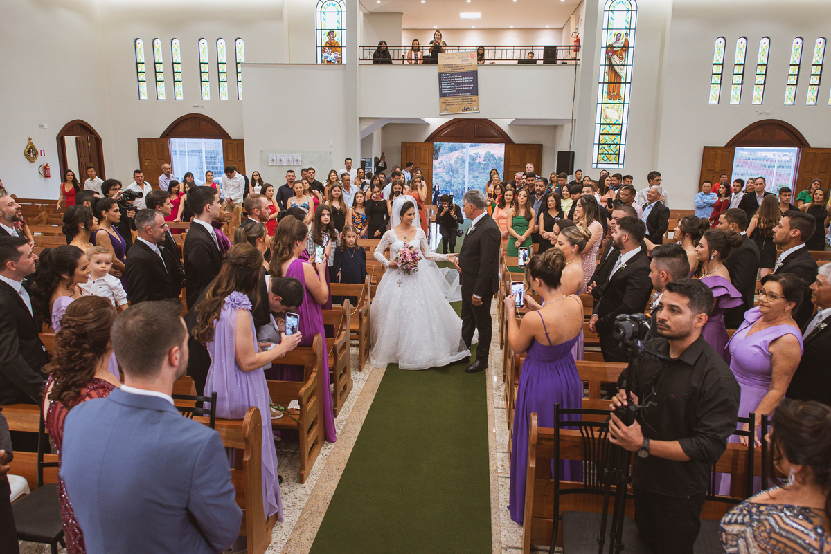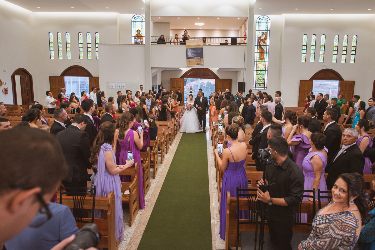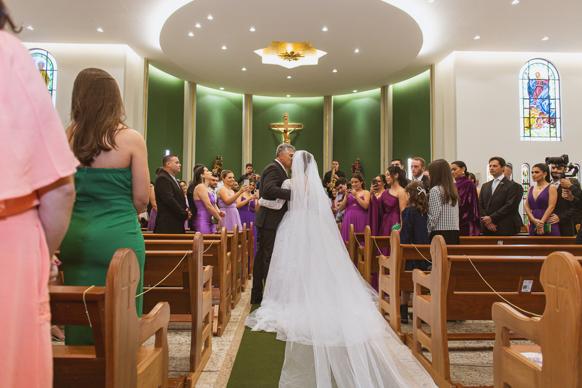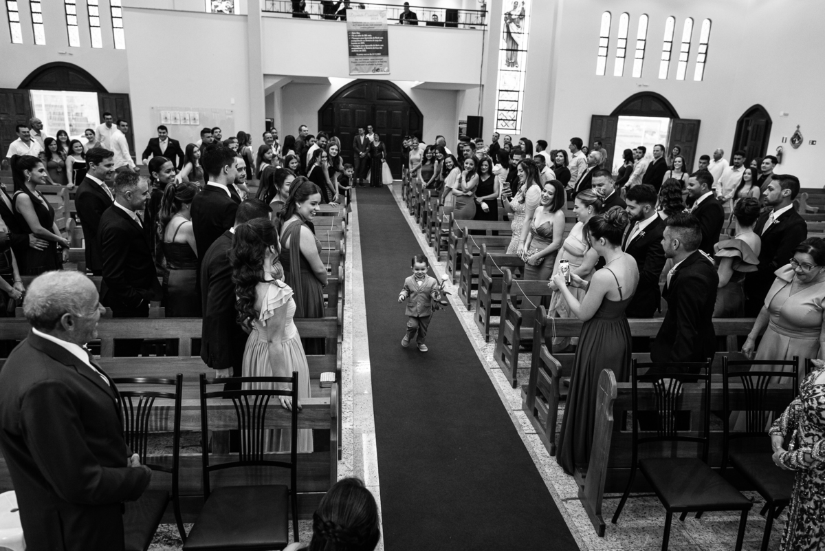 A Igreja é e estava ainda mais bela nesse dia. Os primeiros a entrar foram os pais e avós, logo depois os pajens. E foi uma graça! Todos ficaram muito alegres com o pequenino pajem entrando correndo, com uma rosa na mão. Foi lindo de se ver. Então, era hora da entrada do noivo. Otávio entrou de braços dados com sua mãe. Por onde passou, sorriu e demonstrou toda sua felicidade. Ao fim do corredor, ele despediu-se de sua mãe que o abraçou com todo carinho, fazendo o sinal da Cruz em sua testa como forma de abençoar aquele momento. Os padrinhos entraram e as porta da Igreja se fecharam. São poucos minutos, mas parecem uma verdadeira eternidade pra quem está do lado de cá esperando. Jaqueline se posicionou do lado de fora com seu pai, ele visivelmente emocionado. A noiva respirava fundo, olhava para cima tentando amenizar a ansiedade do momento.