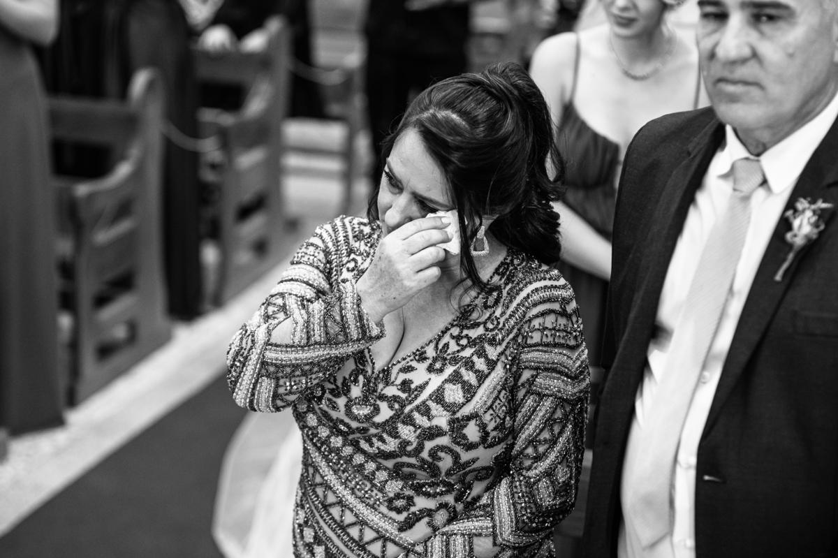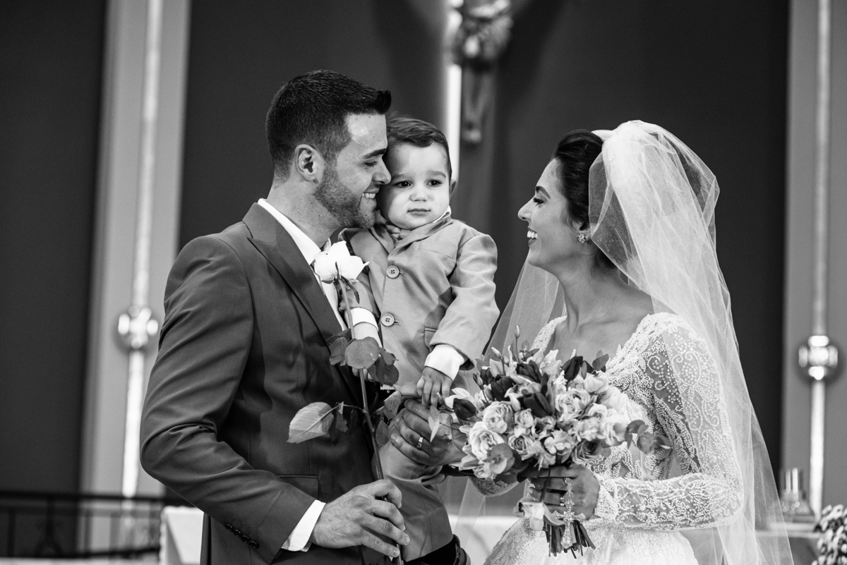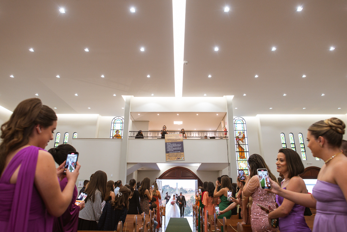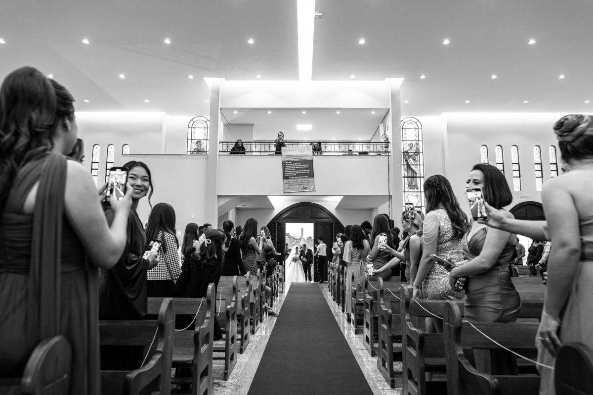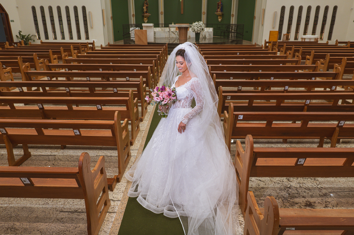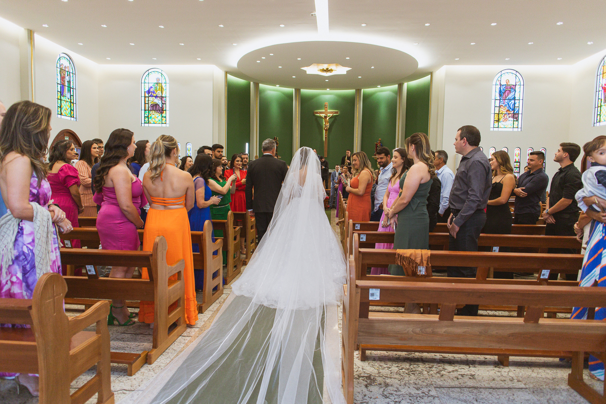 A Igreja é e estava ainda mais bela nesse dia. Os primeiros a entrar foram os pais e avós, logo depois os pajens. E foi uma graça! Todos ficaram muito alegres com o pequenino pajem entrando correndo, com uma rosa na mão. Foi lindo de se ver. Então, era hora da entrada do noivo. Otávio entrou de braços dados com sua mãe. Por onde passou, sorriu e demonstrou toda sua felicidade. Ao fim do corredor, ele despediu-se de sua mãe que o abraçou com todo carinho, fazendo o sinal da Cruz em sua testa como forma de abençoar aquele momento. Os padrinhos entraram e as porta da Igreja se fecharam. São poucos minutos, mas parecem uma verdadeira eternidade pra quem está do lado de cá esperando. Jaqueline se posicionou do lado de fora com seu pai, ele visivelmente emocionado. A noiva respirava fundo, olhava para cima tentando amenizar a ansiedade do momento.