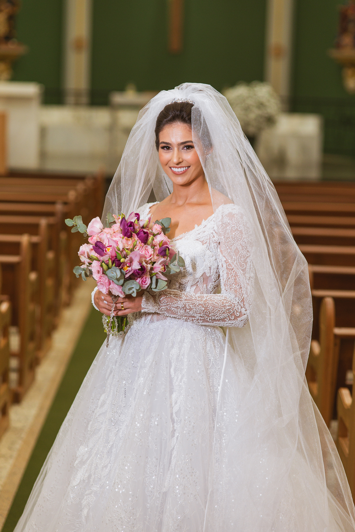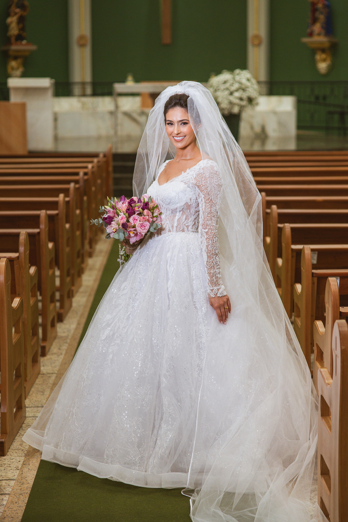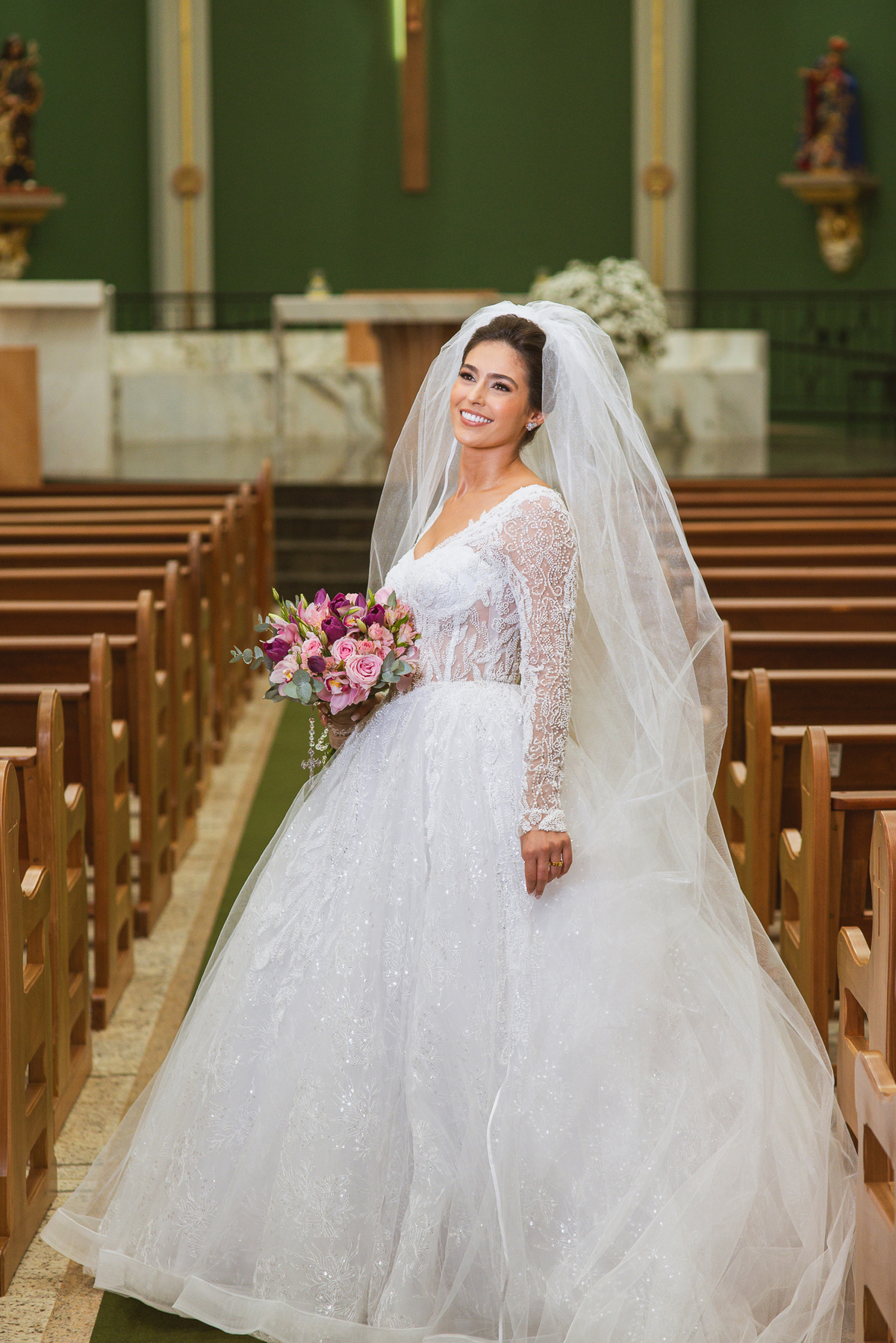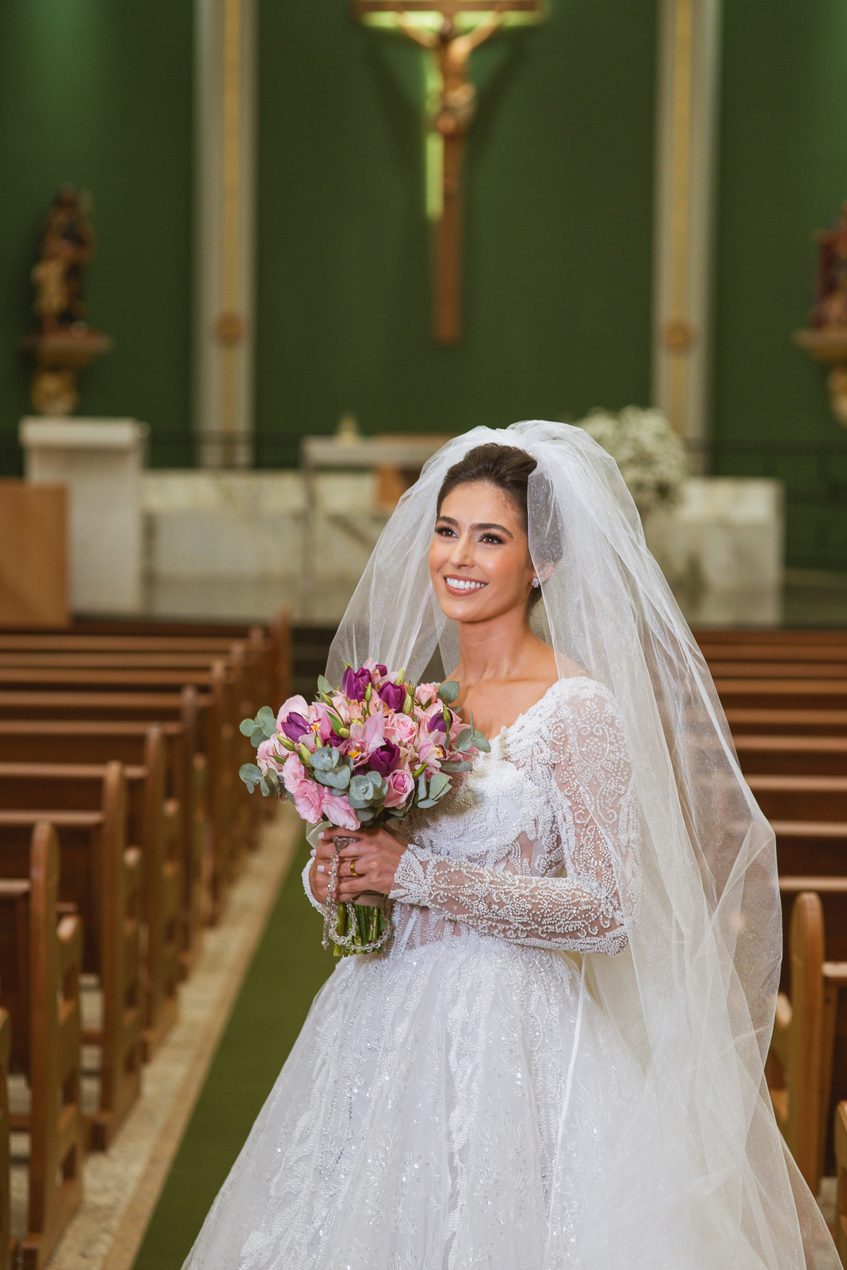 A Igreja é e estava ainda mais bela nesse dia. Os primeiros a entrar foram os pais e avós, logo depois os pajens. E foi uma graça! Todos ficaram muito alegres com o pequenino pajem entrando correndo, com uma rosa na mão. Foi lindo de se ver. Então, era hora da entrada do noivo. Otávio entrou de braços dados com sua mãe. Por onde passou, sorriu e demonstrou toda sua felicidade. Ao fim do corredor, ele despediu-se de sua mãe que o abraçou com todo carinho, fazendo o sinal da Cruz em sua testa como forma de abençoar aquele momento. Os padrinhos entraram e as porta da Igreja se fecharam. São poucos minutos, mas parecem uma verdadeira eternidade pra quem está do lado de cá esperando. Jaqueline se posicionou do lado de fora com seu pai, ele visivelmente emocionado. A noiva respirava fundo, olhava para cima tentando amenizar a ansiedade do momento.