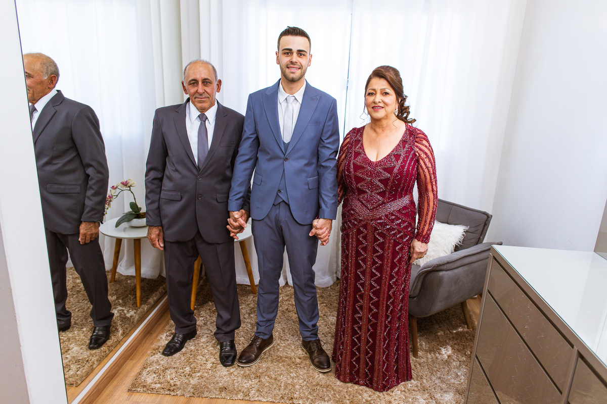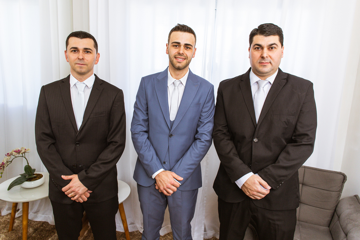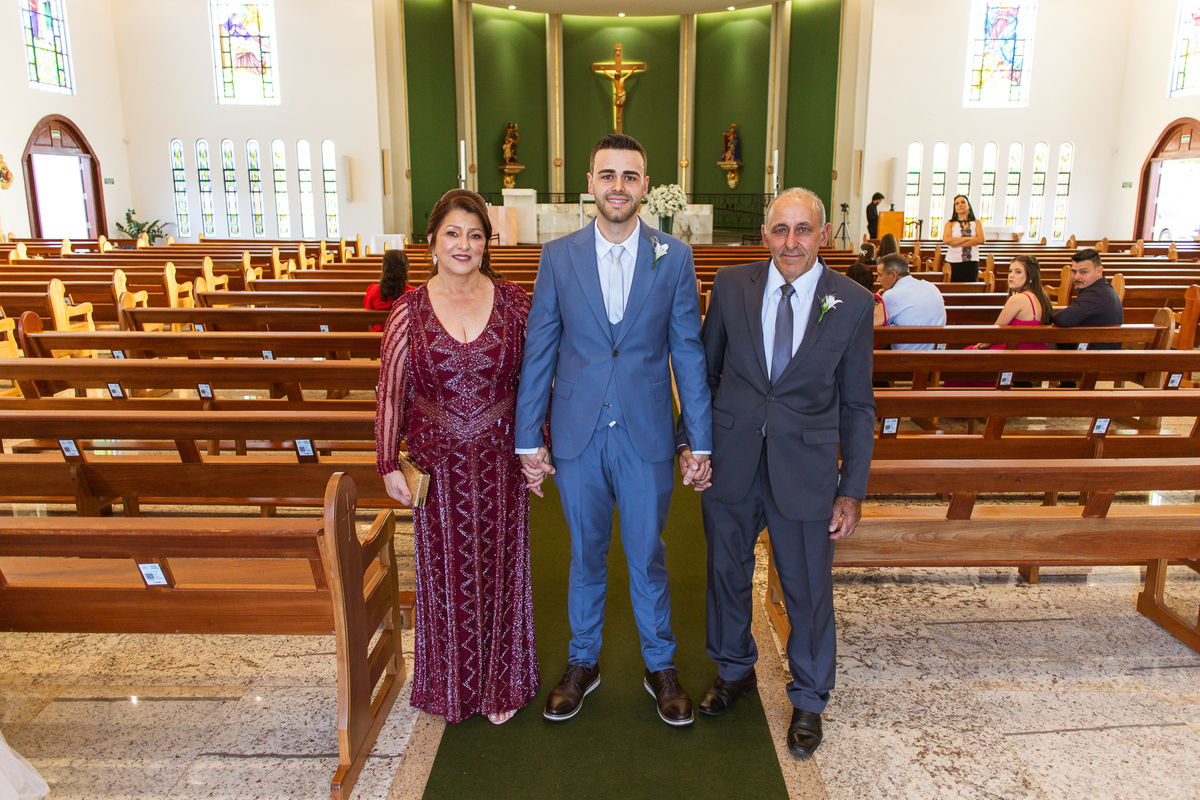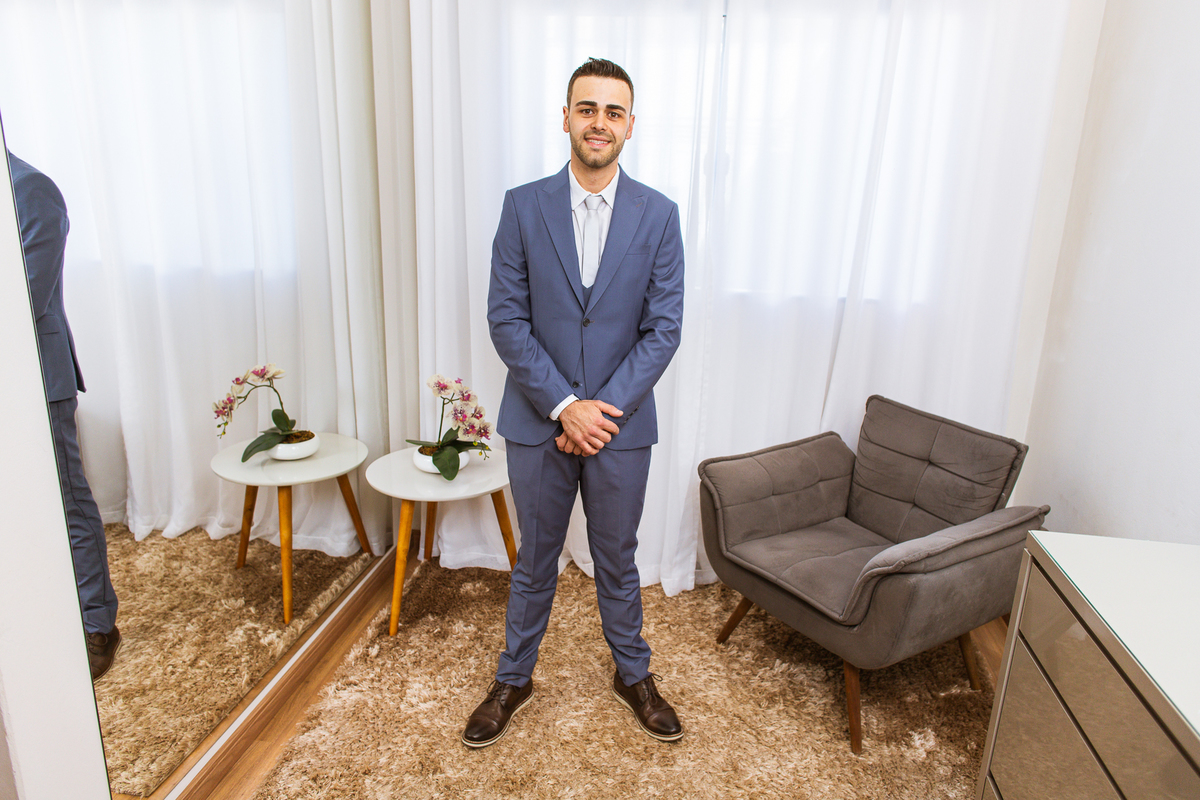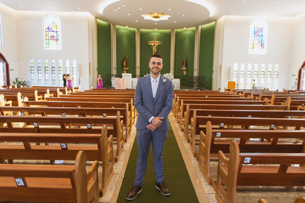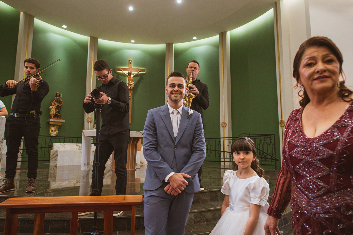 Na cidade de São Gotardo, Otávio também se preparava para o seu grande dia. Ele contou com a ajuda do seus pais e seu irmão para se arrumar. Com um terno azul clássico e muito elegante, ele se vestiu, colocou os sapatos e ajeitou seu penteado como gosta. Fotografou com seus pais, irmão e cunhado. Fez alguns retratos sozinho e rapidamente estava pronto para casar. Ele e o segundo fotógrafo partiram para a Igreja também. Na porta, alguns padrinhos já começavam a chegar. A equipe de cerimonial organizou a fila conforme os padrinhos iam chegando. Os pajens também apareceram, cada um mais fofo que o outro. Os músicos já estavam aguardando só o OK final para iniciar a cerimônia. O padre chegou e se posicionou. Logo a cerimônia começou.