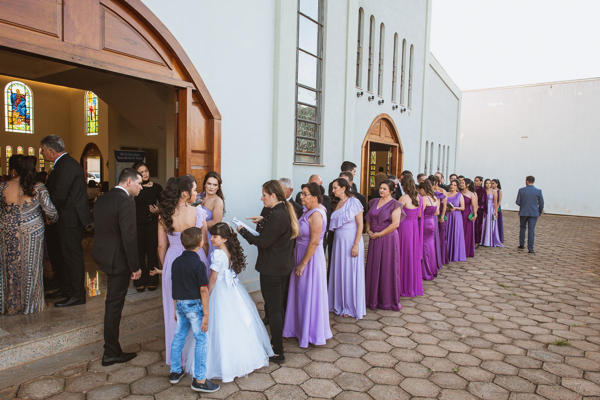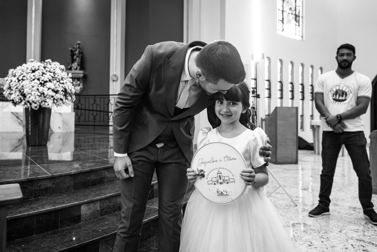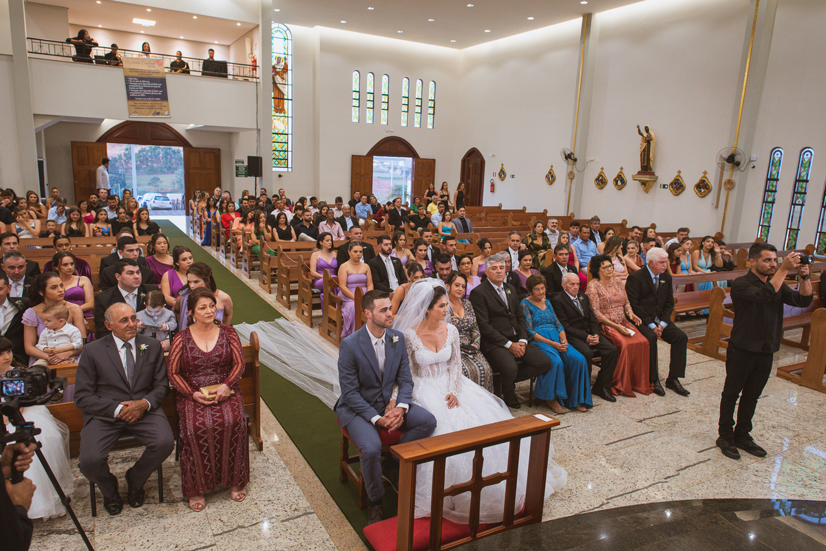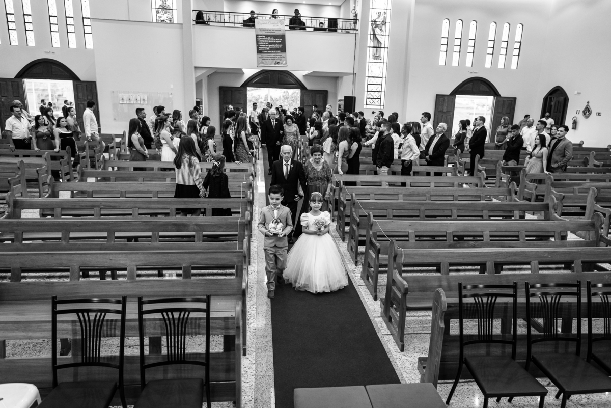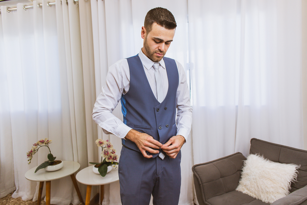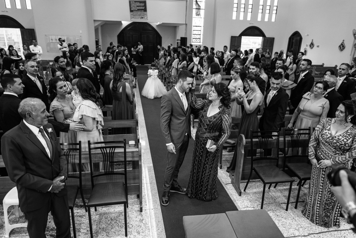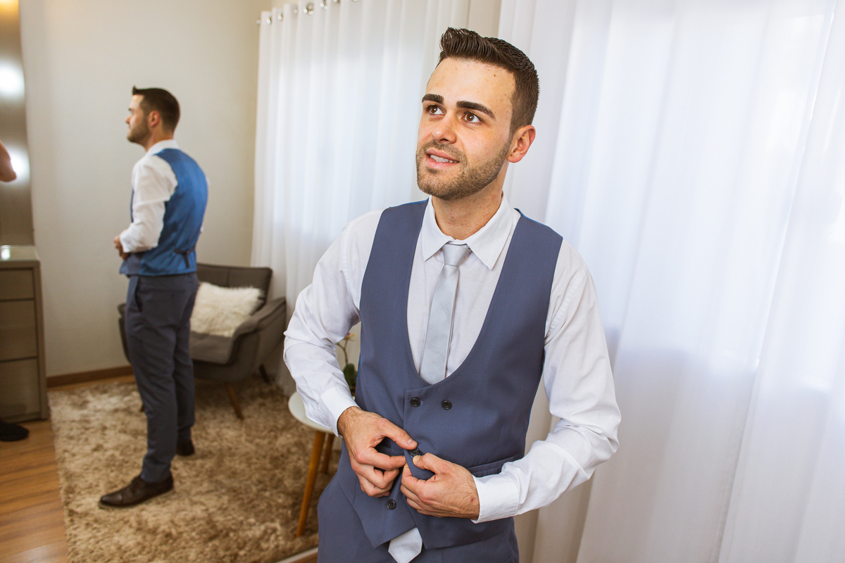 Na cidade de São Gotardo, Otávio também se preparava para o seu grande dia. Ele contou com a ajuda do seus pais e seu irmão para se arrumar. Com um terno azul clássico e muito elegante, ele se vestiu, colocou os sapatos e ajeitou seu penteado como gosta. Fotografou com seus pais, irmão e cunhado. Fez alguns retratos sozinho e rapidamente estava pronto para casar. Ele e o segundo fotógrafo partiram para a Igreja também. Na porta, alguns padrinhos já começavam a chegar. A equipe de cerimonial organizou a fila conforme os padrinhos iam chegando. Os pajens também apareceram, cada um mais fofo que o outro. Os músicos já estavam aguardando só o OK final para iniciar a cerimônia. O padre chegou e se posicionou. Logo a cerimônia começou.