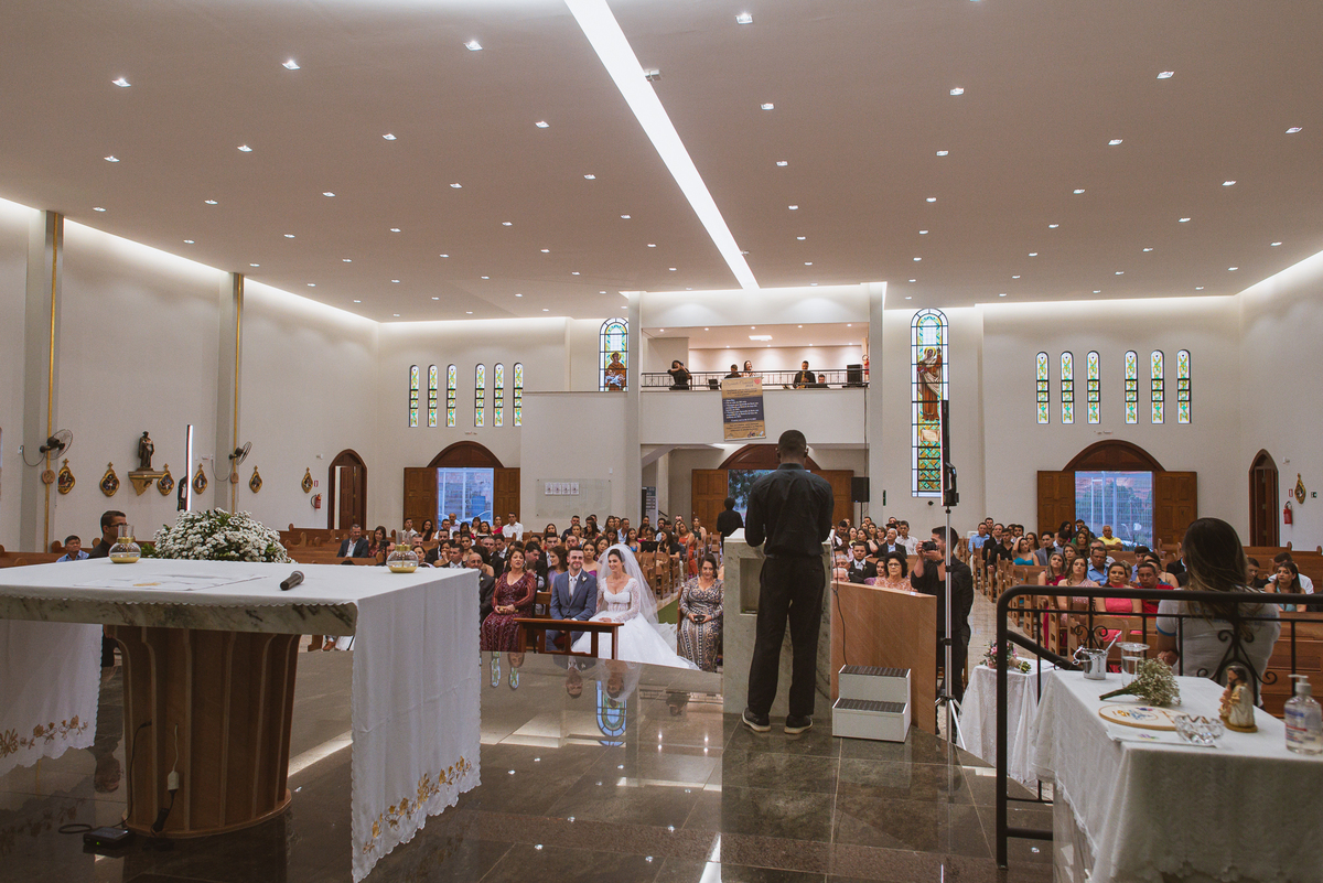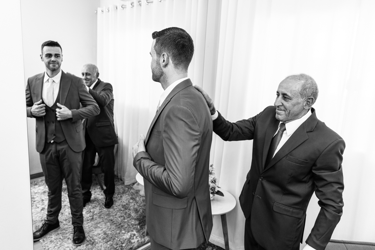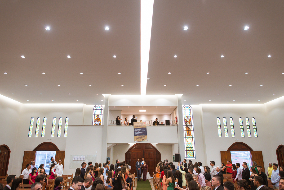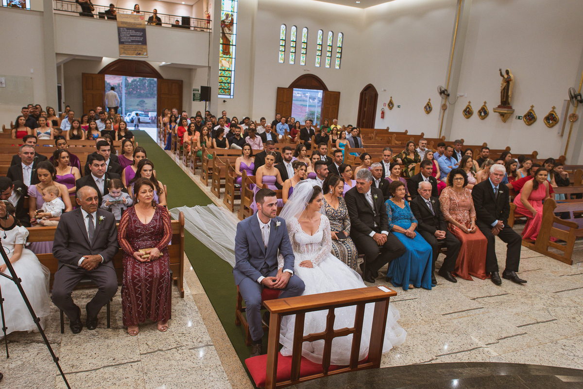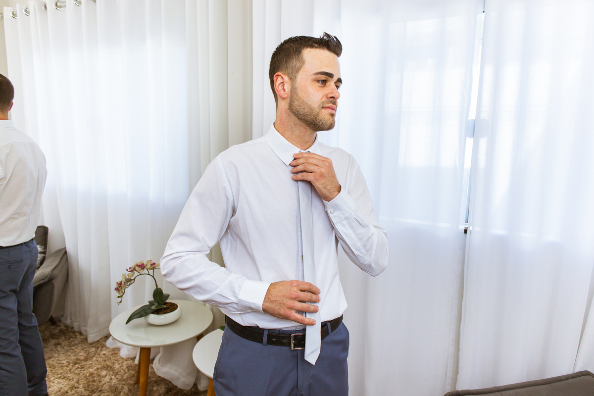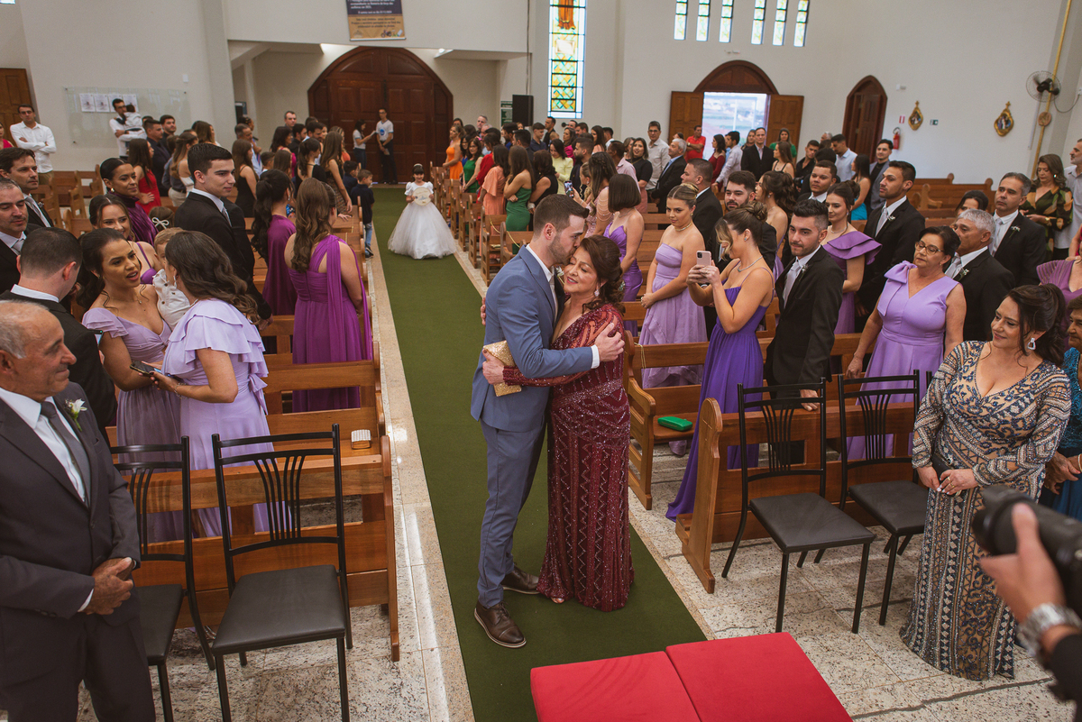 Na cidade de São Gotardo, Otávio também se preparava para o seu grande dia. Ele contou com a ajuda do seus pais e seu irmão para se arrumar. Com um terno azul clássico e muito elegante, ele se vestiu, colocou os sapatos e ajeitou seu penteado como gosta. Fotografou com seus pais, irmão e cunhado. Fez alguns retratos sozinho e rapidamente estava pronto para casar. Ele e o segundo fotógrafo partiram para a Igreja também. Na porta, alguns padrinhos já começavam a chegar. A equipe de cerimonial organizou a fila conforme os padrinhos iam chegando. Os pajens também apareceram, cada um mais fofo que o outro. Os músicos já estavam aguardando só o OK final para iniciar a cerimônia. O padre chegou e se posicionou. Logo a cerimônia começou.