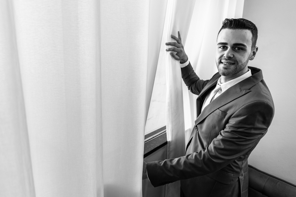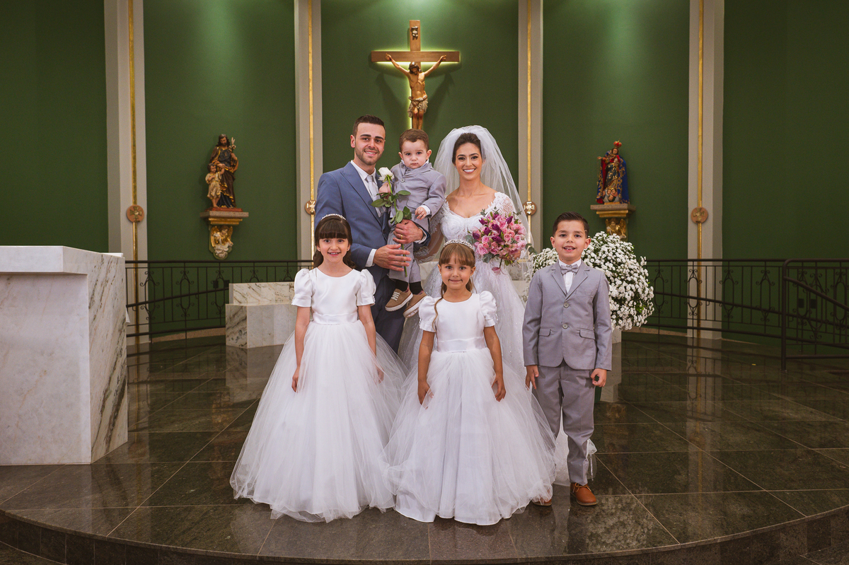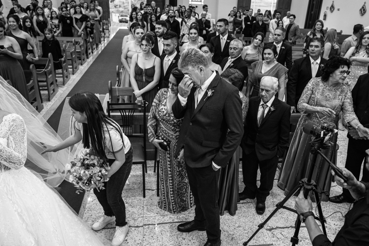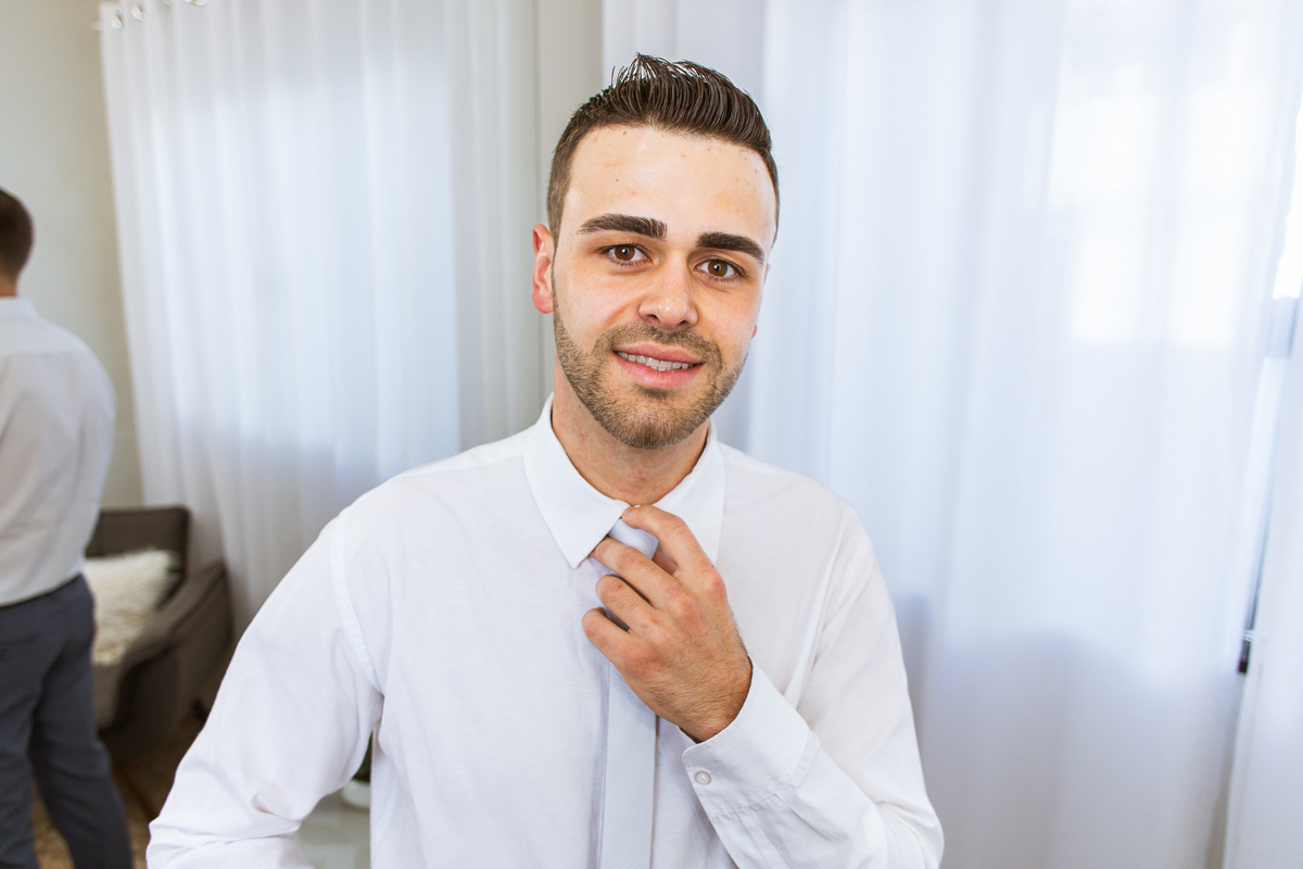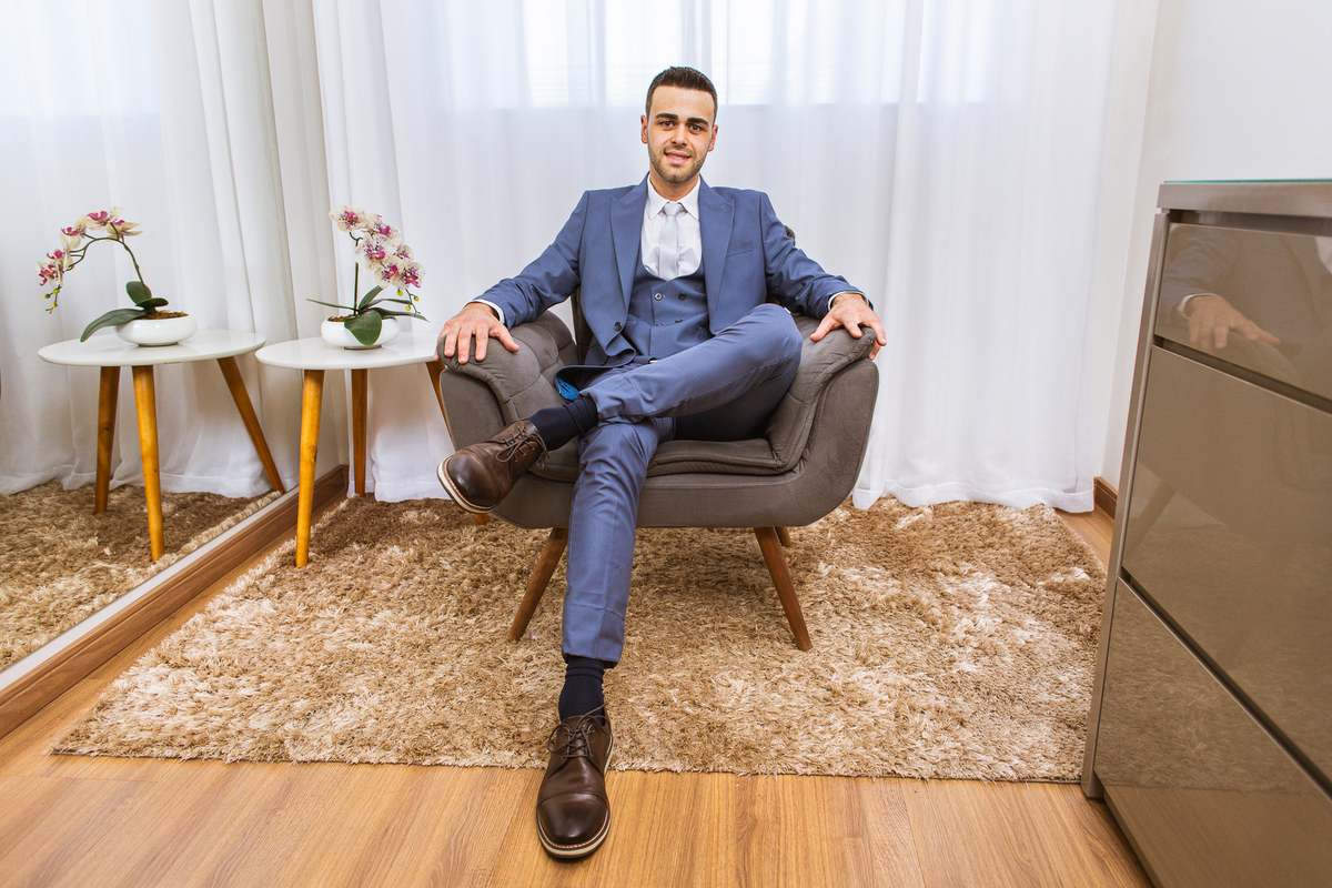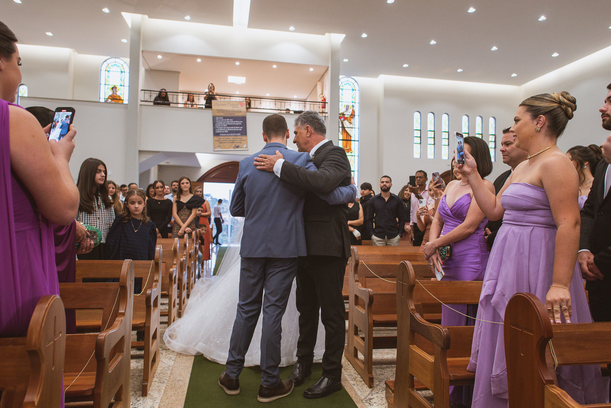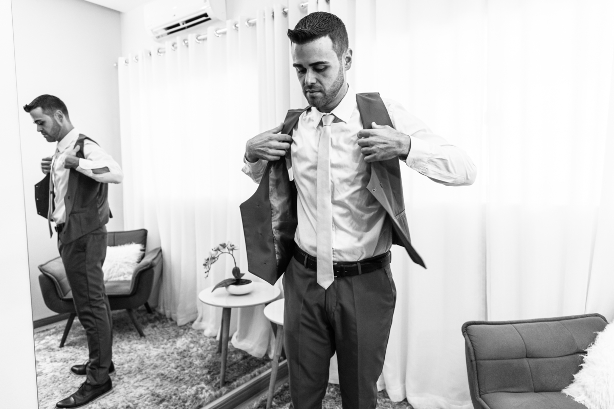 Na cidade de São Gotardo, Otávio também se preparava para o seu grande dia. Ele contou com a ajuda do seus pais e seu irmão para se arrumar. Com um terno azul clássico e muito elegante, ele se vestiu, colocou os sapatos e ajeitou seu penteado como gosta. Fotografou com seus pais, irmão e cunhado. Fez alguns retratos sozinho e rapidamente estava pronto para casar. Ele e o segundo fotógrafo partiram para a Igreja também. Na porta, alguns padrinhos já começavam a chegar. A equipe de cerimonial organizou a fila conforme os padrinhos iam chegando. Os pajens também apareceram, cada um mais fofo que o outro. Os músicos já estavam aguardando só o OK final para iniciar a cerimônia. O padre chegou e se posicionou. Logo a cerimônia começou.